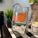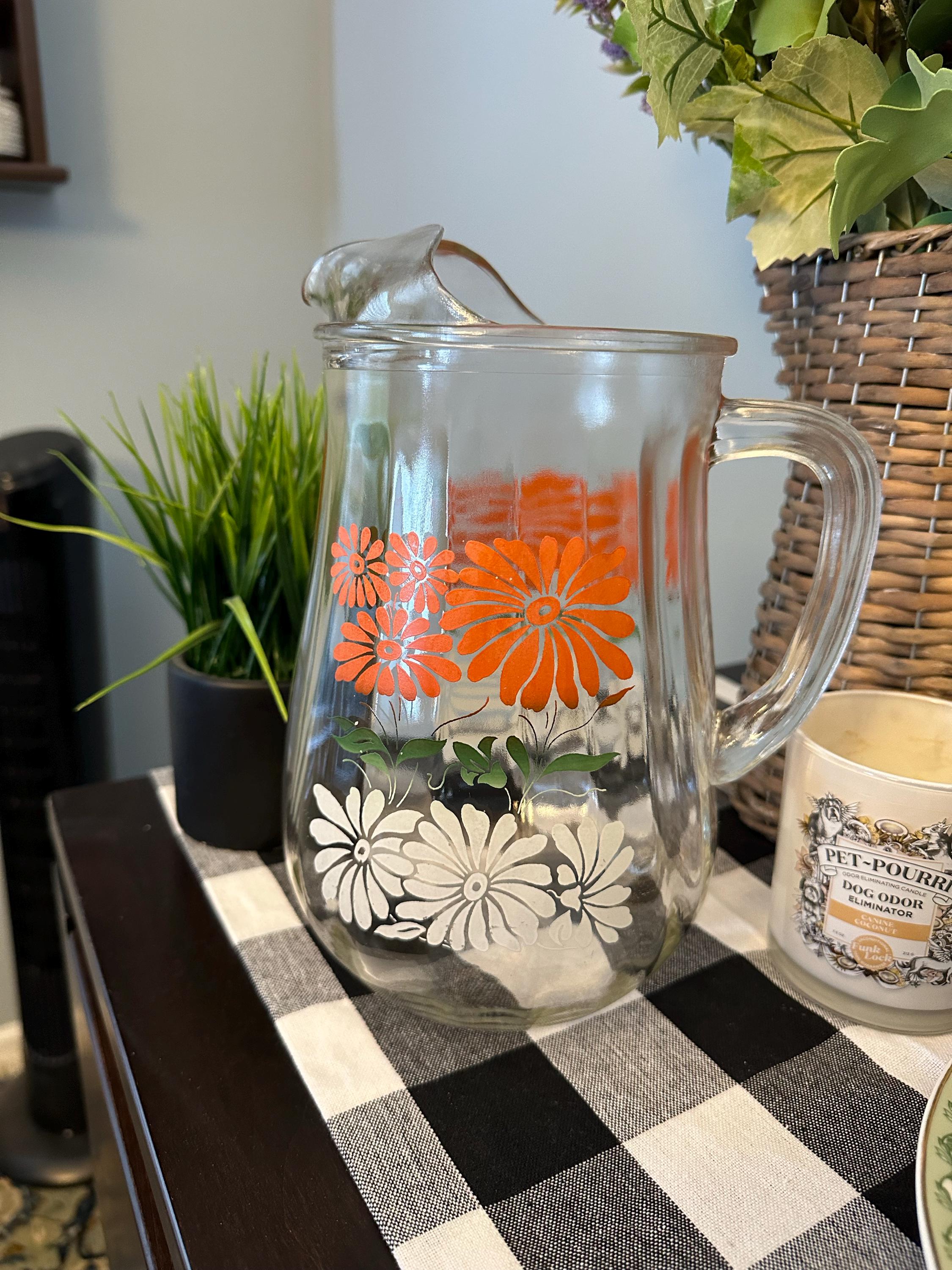 2301043 Vintage Anchor Hocking Clear Paneled 80 oz 8.5" Glass Pitcher with Green, Orange and White Floral Daisies- No Chips or Cracks