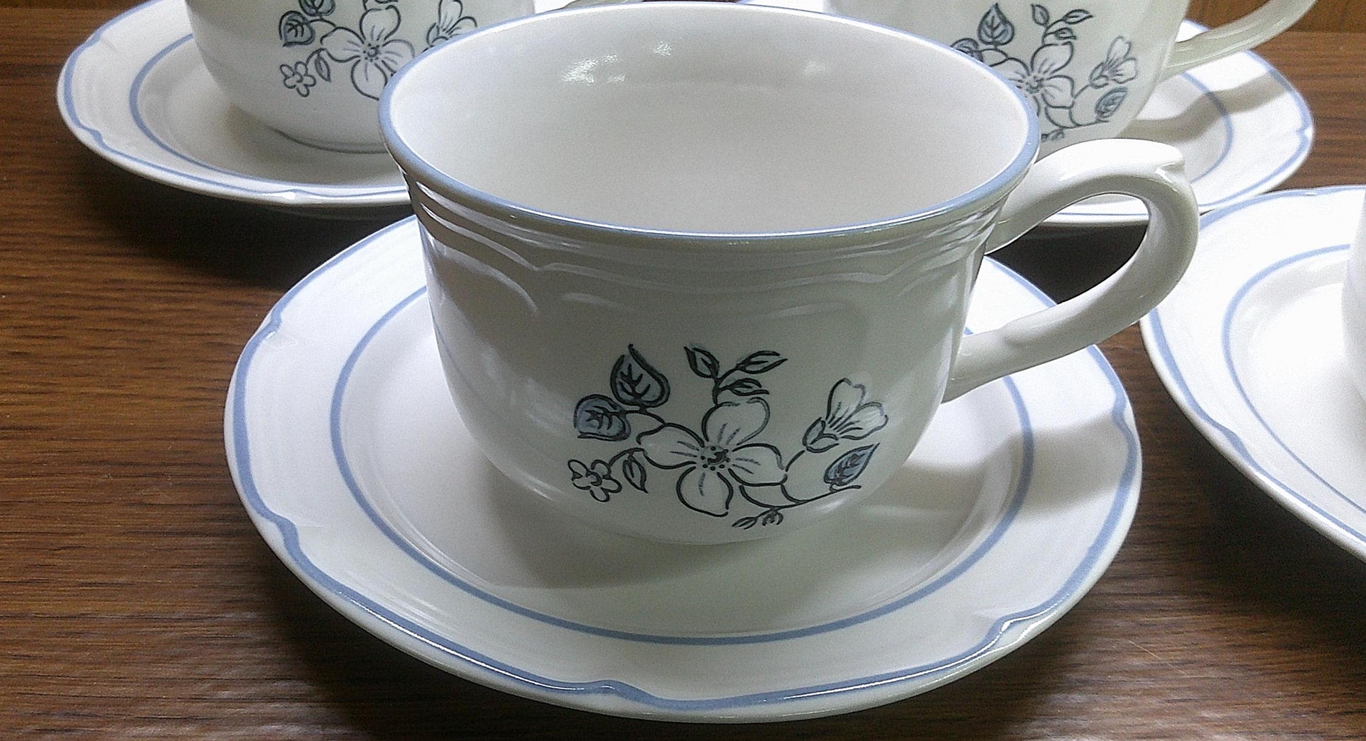2505 Covington Avondale Stoneware 12 pc Set 6 Cups & 6 Saucers w/ Blue & White Dogwood Flowers- Japan- Great Condition