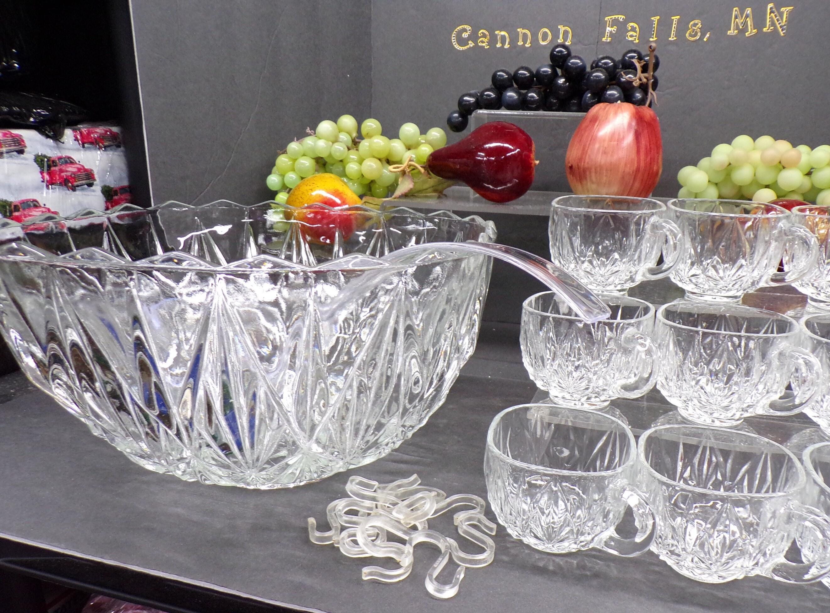 2503 Hazel Atlas Williamsport Square Prism Vintage Punch Set 11" Bowl, 10 Cups, 10 Plastic Hooks & Ladle - Great Condition