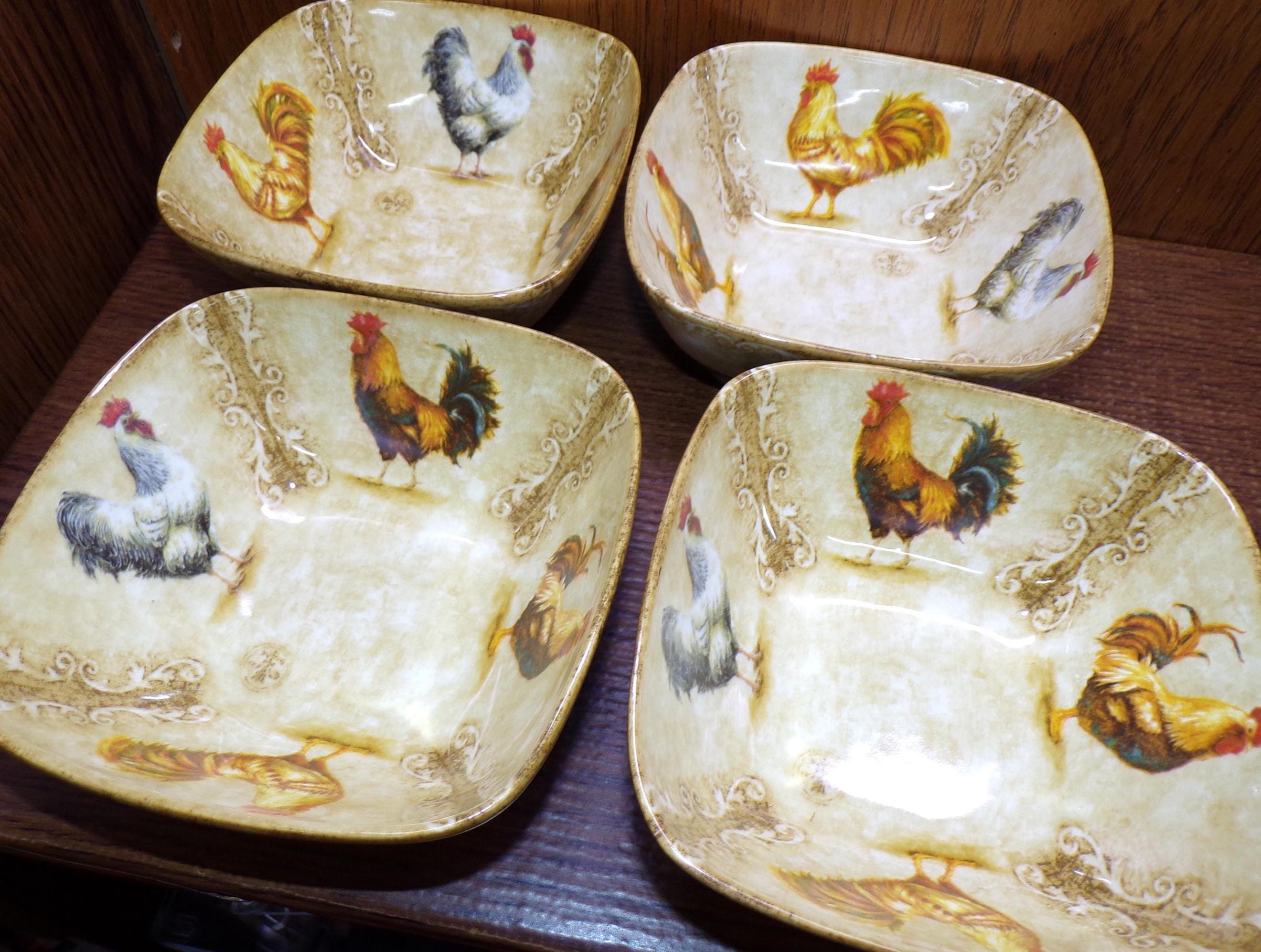 2505 222 Fifth Rustic Rooster Fine Porcelain 6" Square Bowls Set of 4 - Great Condition