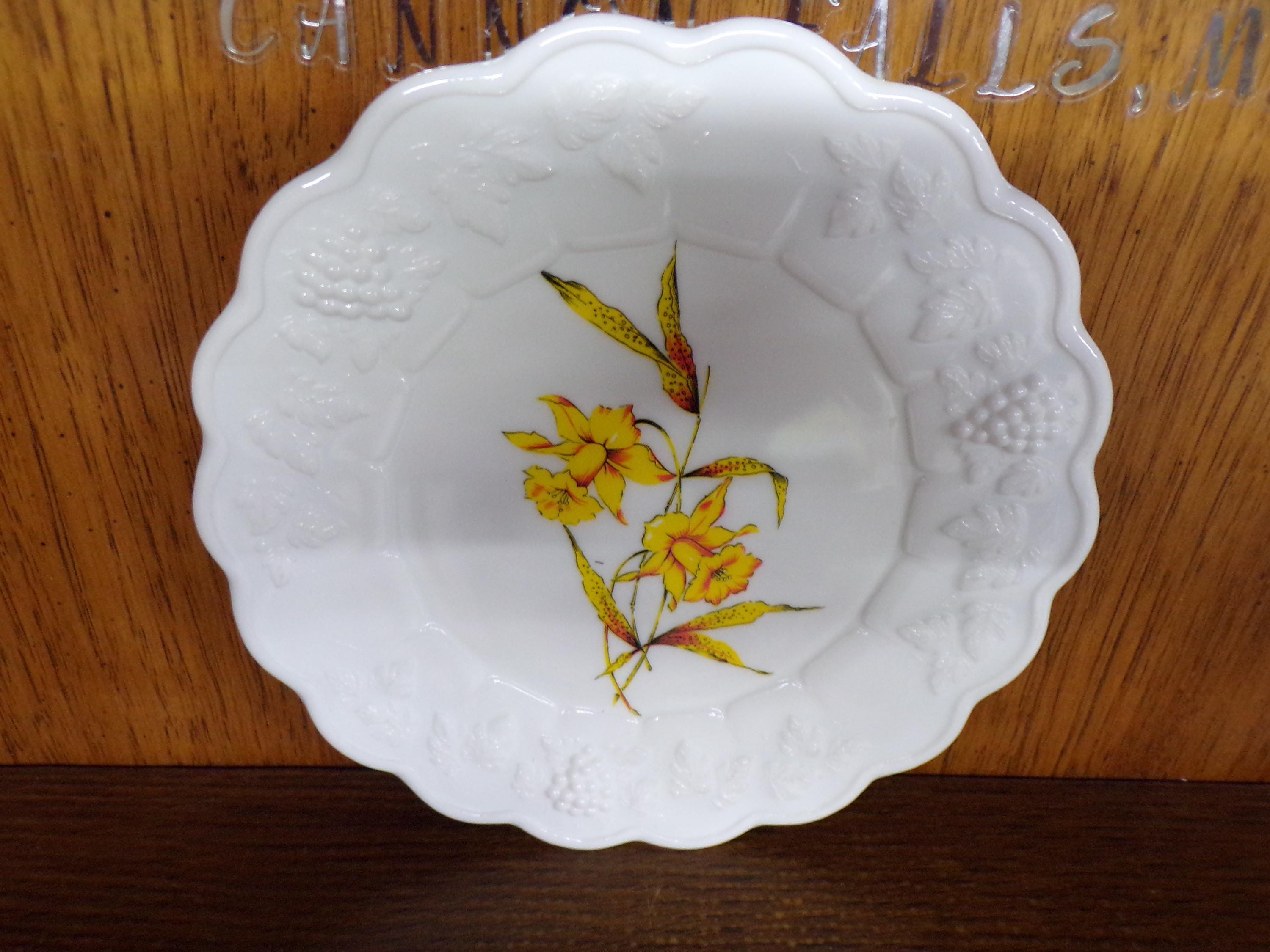 2506 Westmoreland Panel Milk Glass Vintage Yellow Daffodil 8.5" Raised Grape & Leaf Collector Plate - Great Condition
