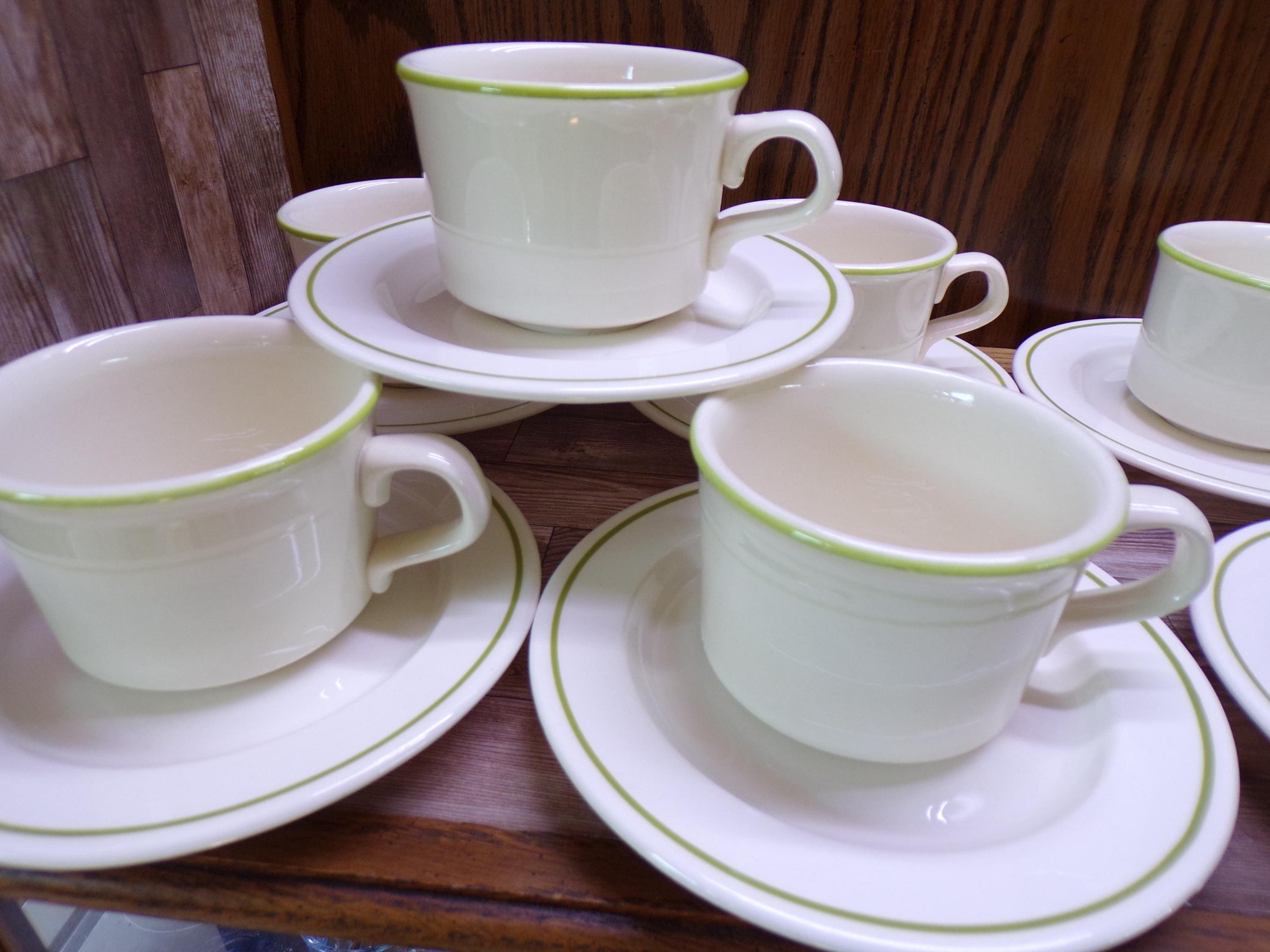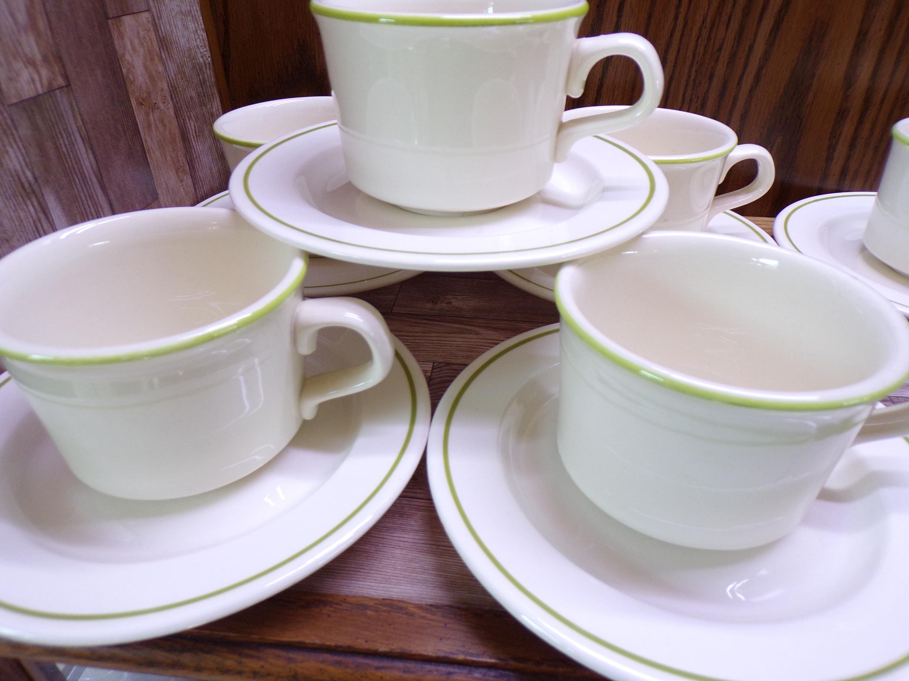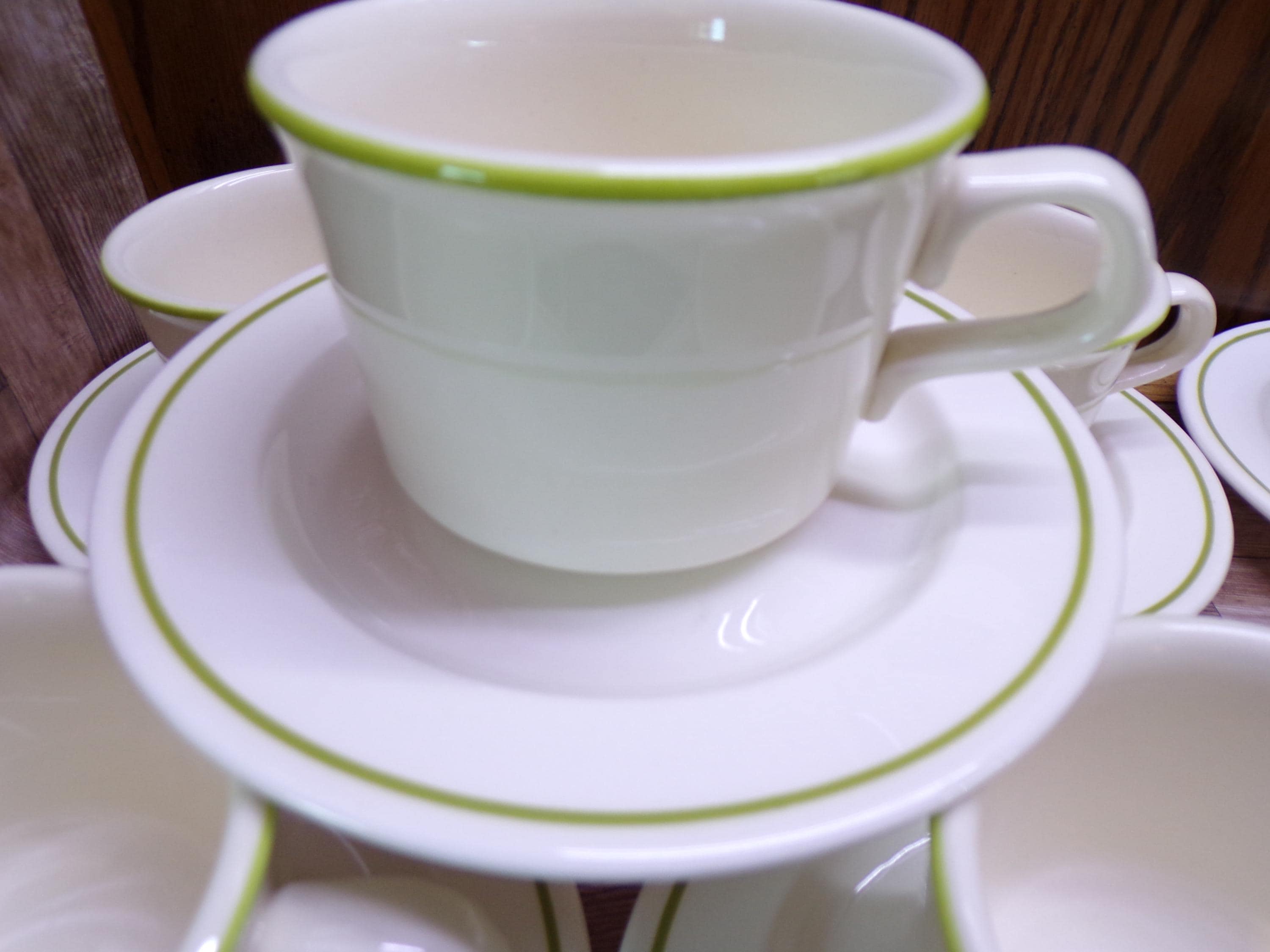 2510 Anchor Hocking Berry Patch Vintage Stoneware Set of 14 pcs - (7) Flat Cups & (7) Saucers Green Band Made in USA - Great Condition