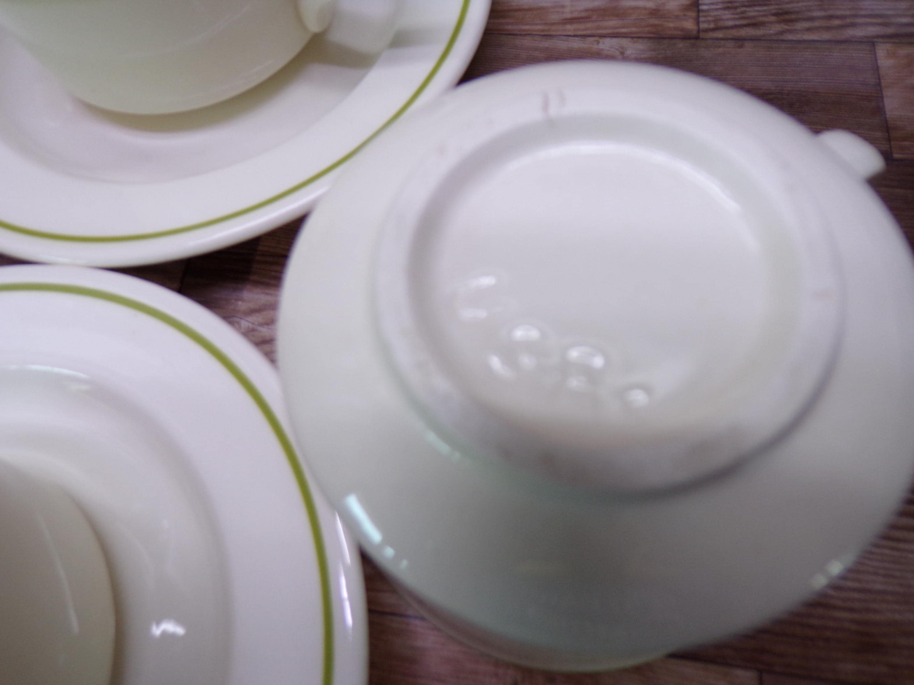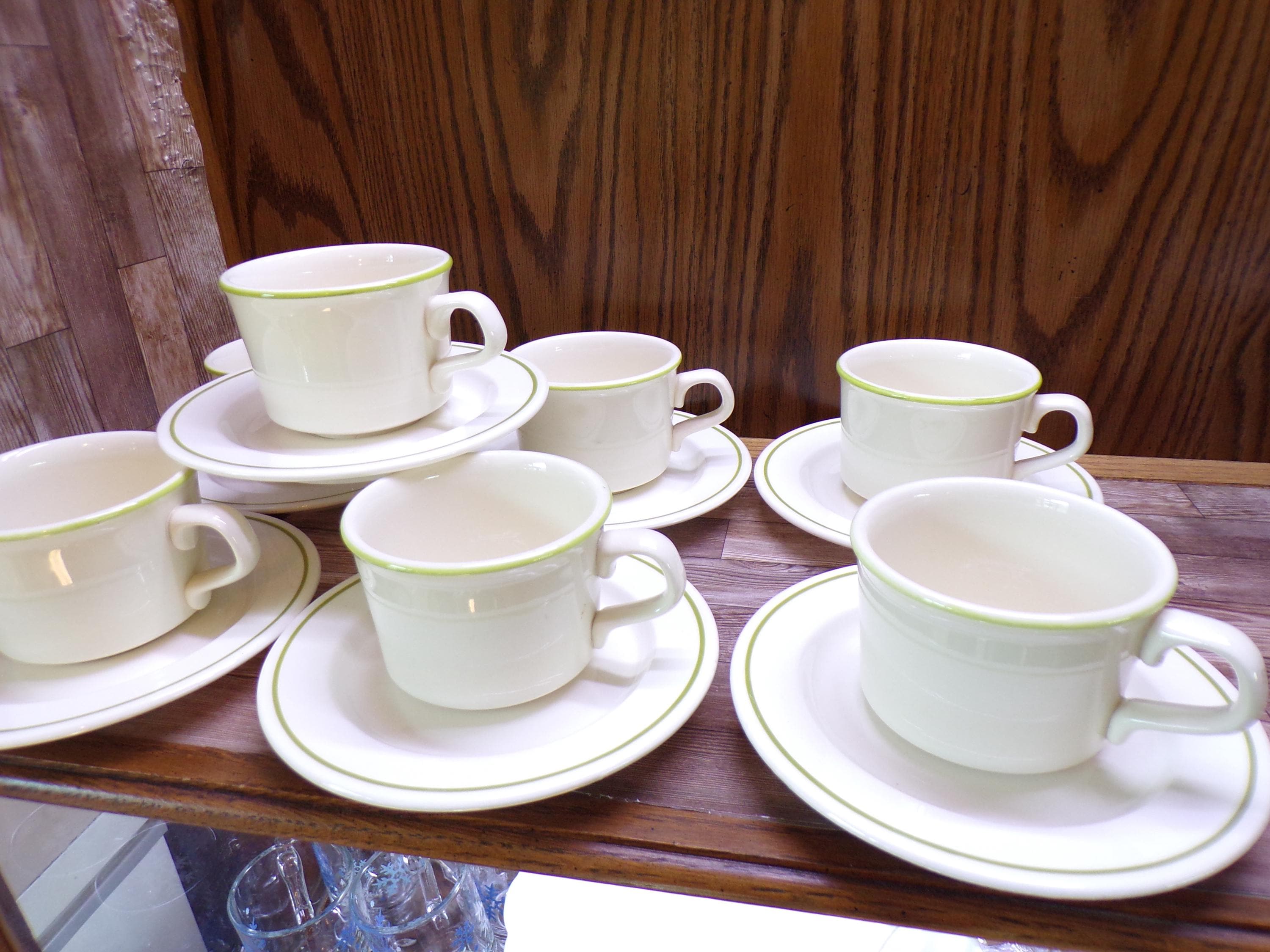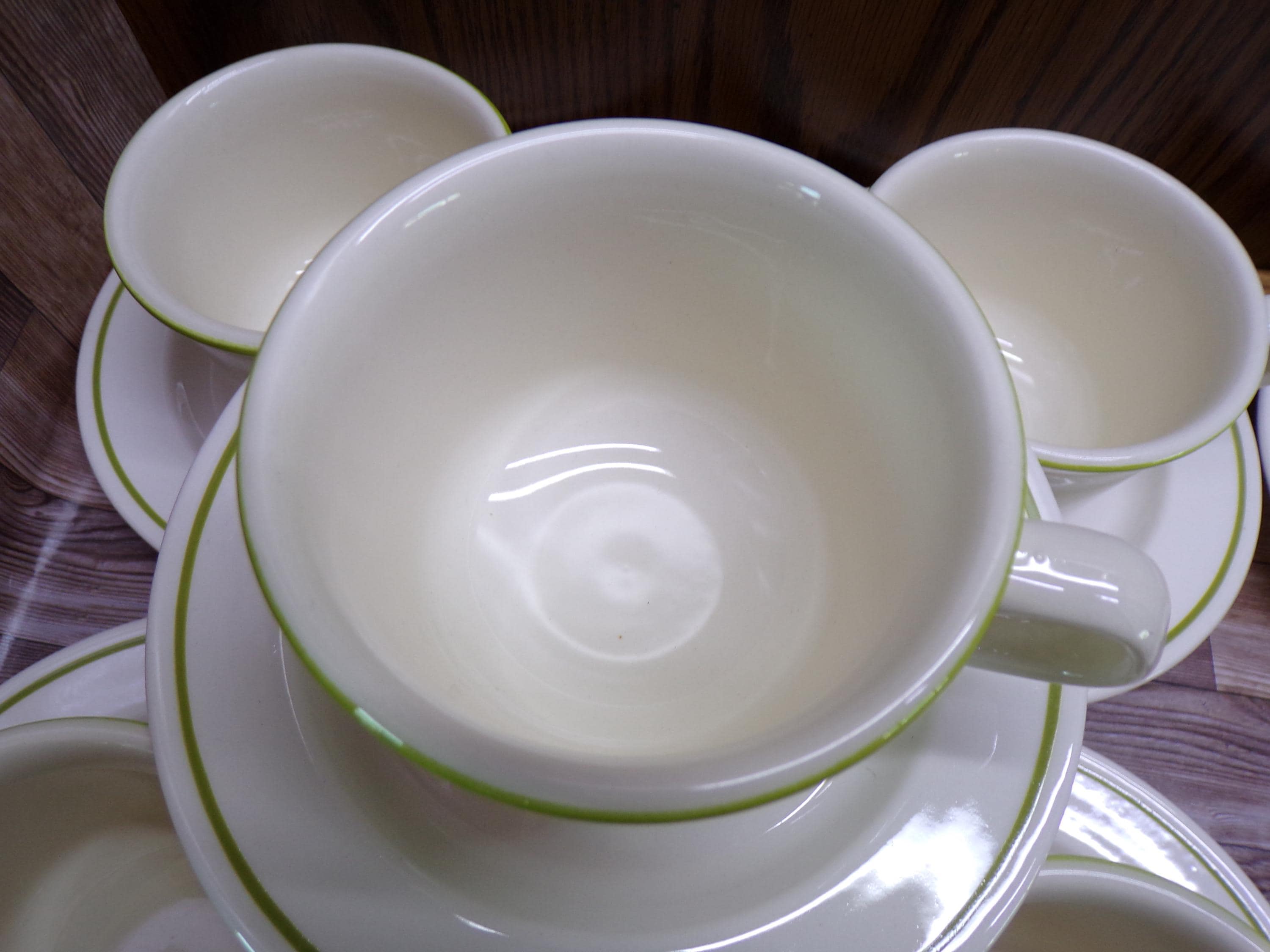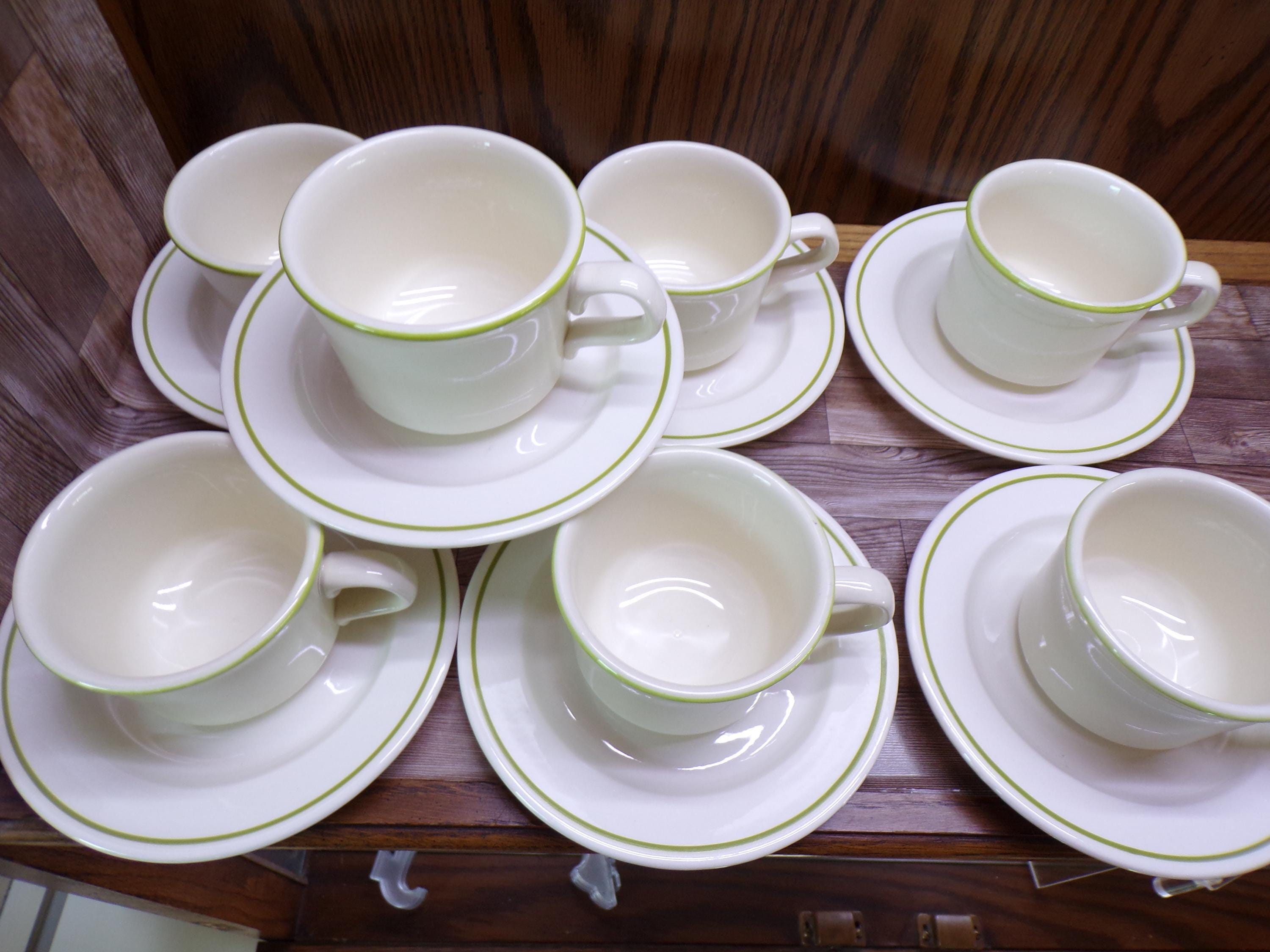 2510 Anchor Hocking Berry Patch Vintage Stoneware Set of 14 pcs - (7) Flat Cups & (7) Saucers Green Band Made in USA - Great Condition