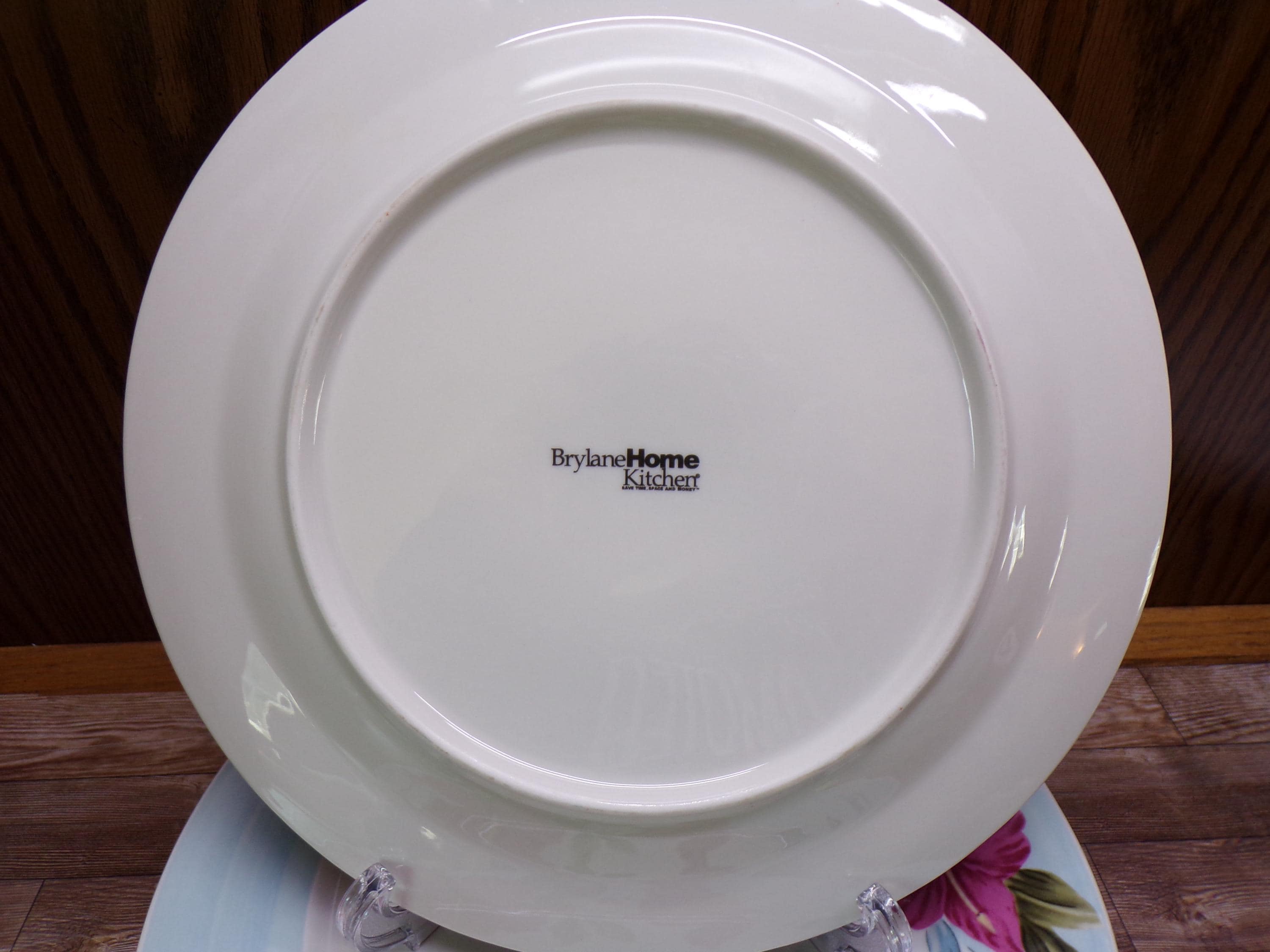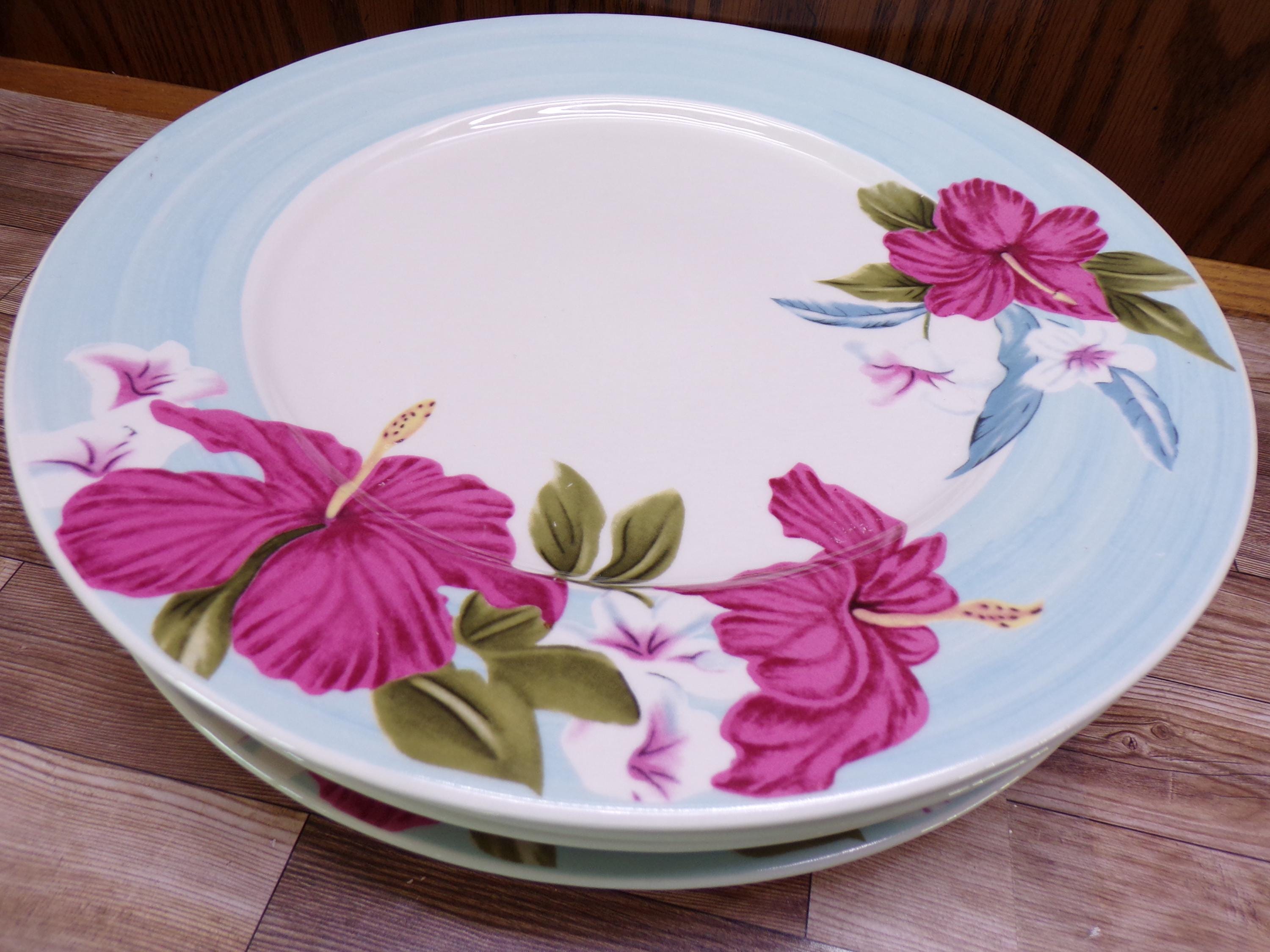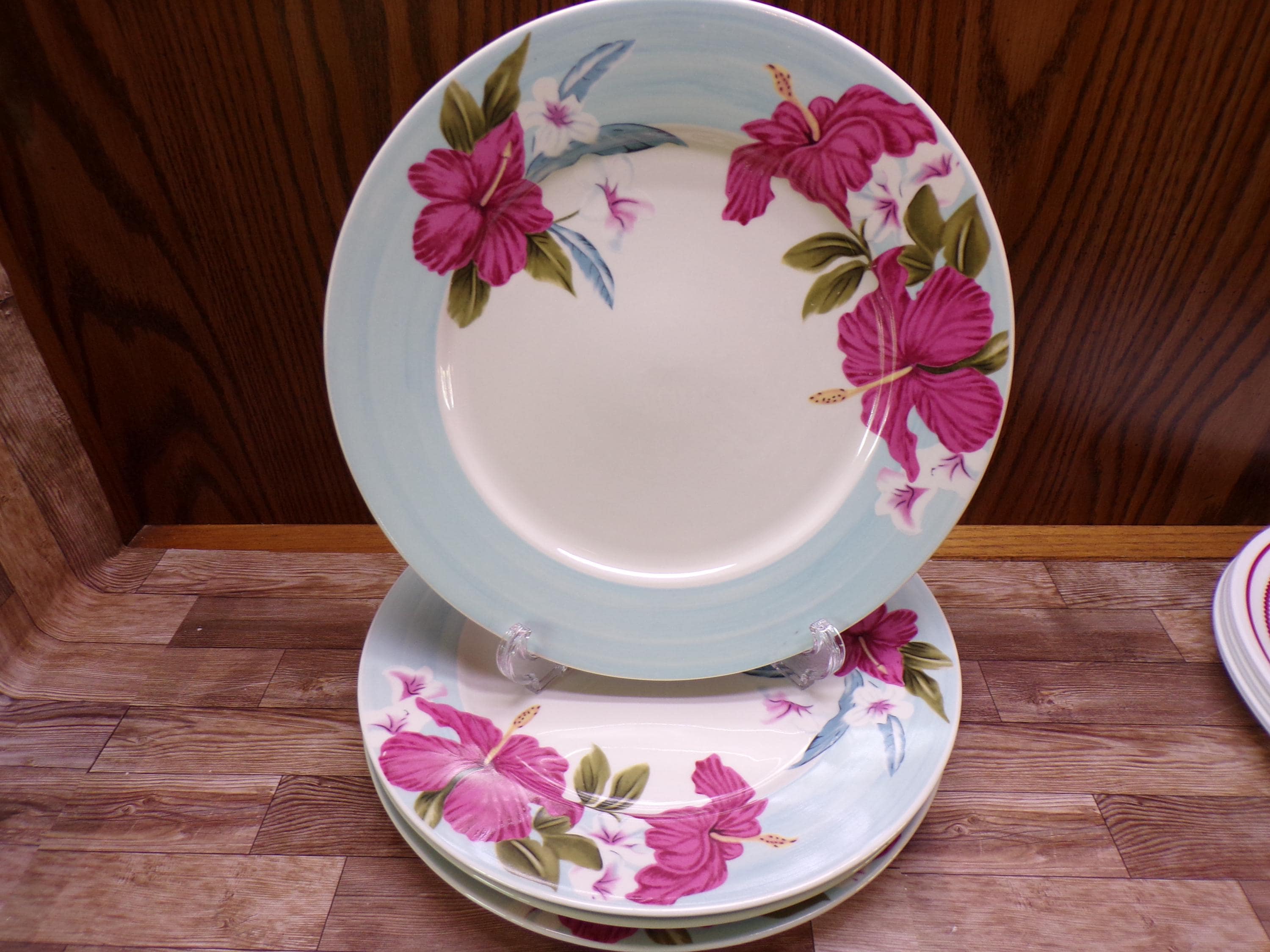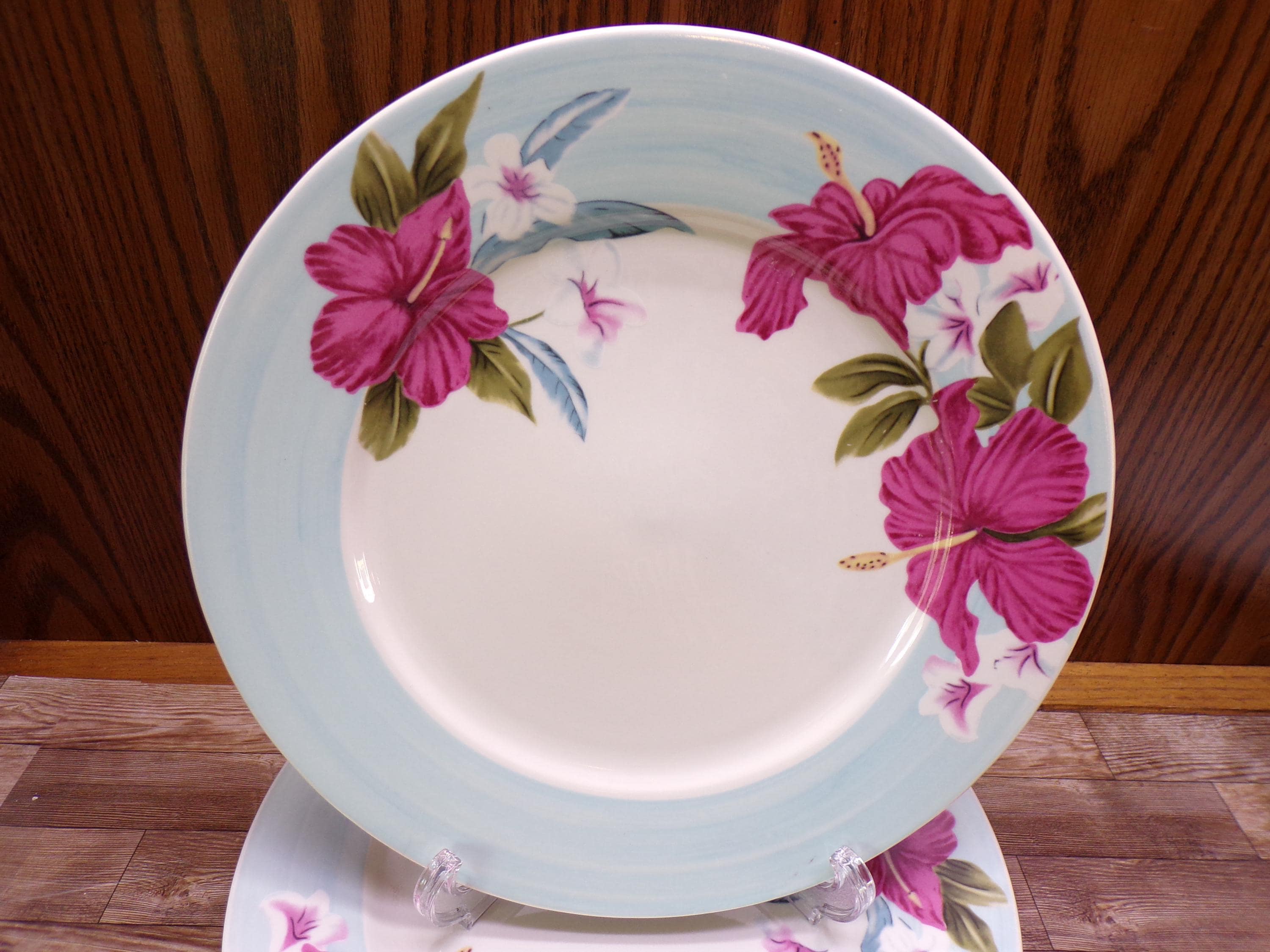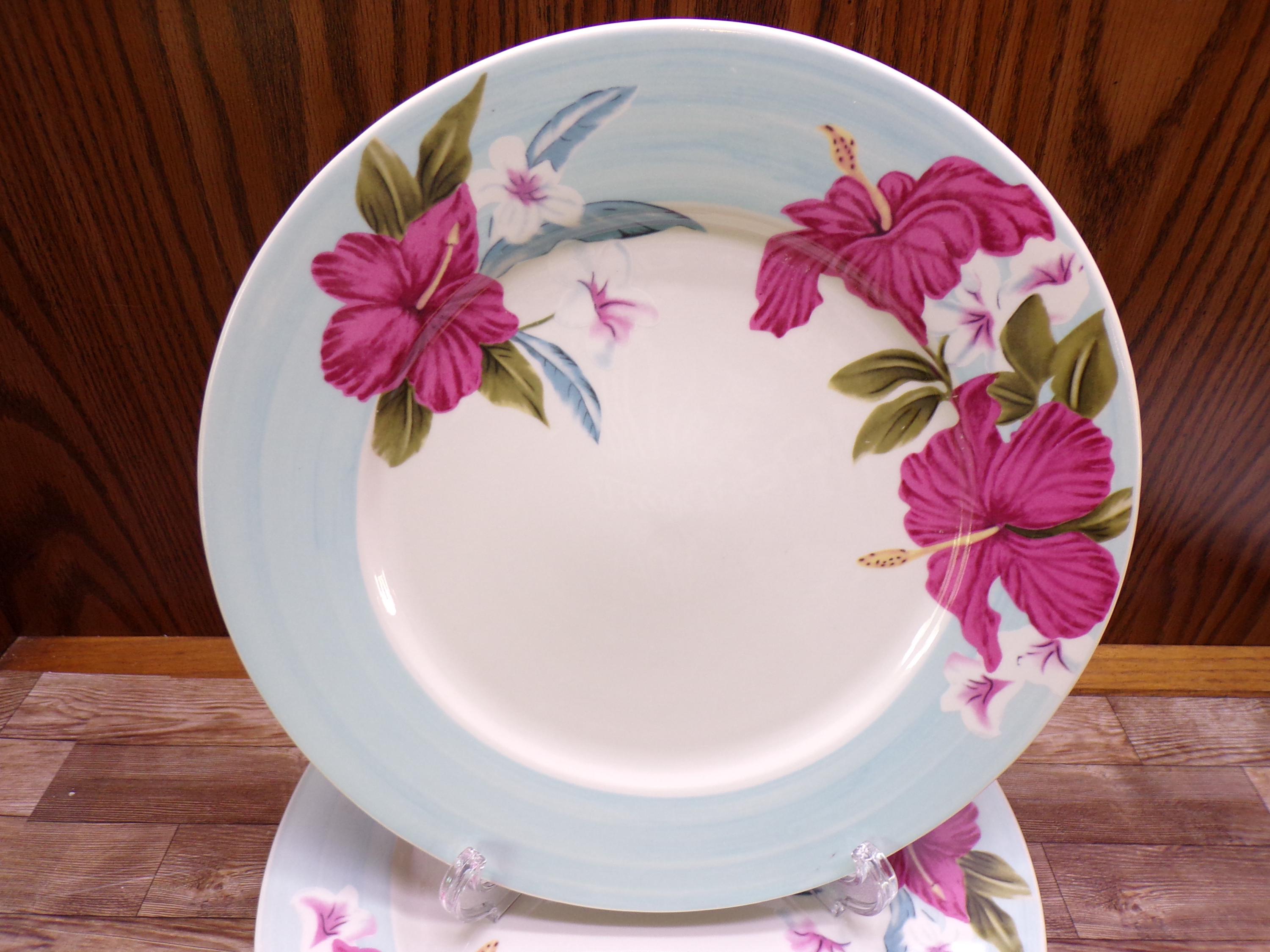 2502 Brylanehome Beautiful Pink Hibiscus with Light Blue Rim 10.5" Stoneware Dinner Plates Set of 4 - Great Condition