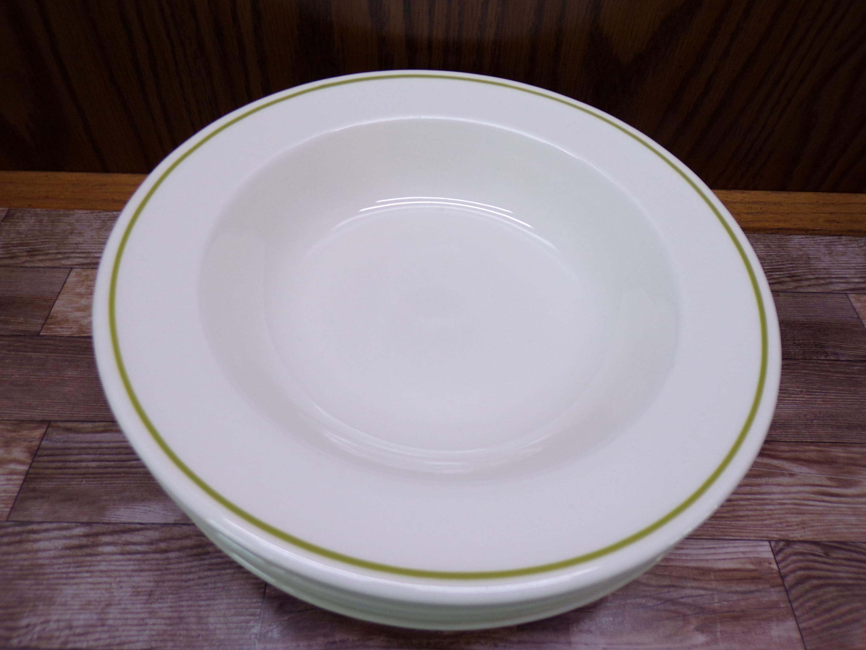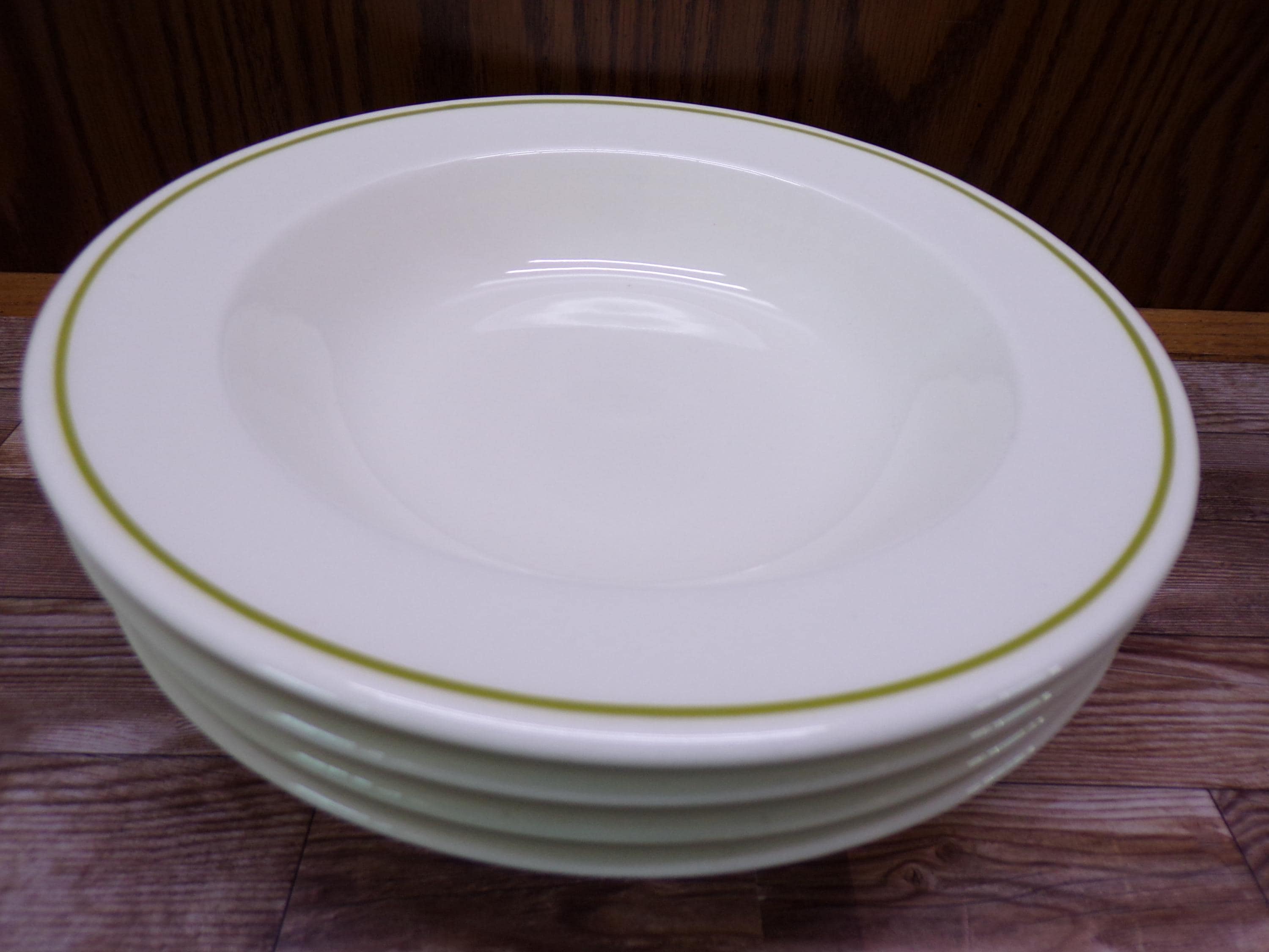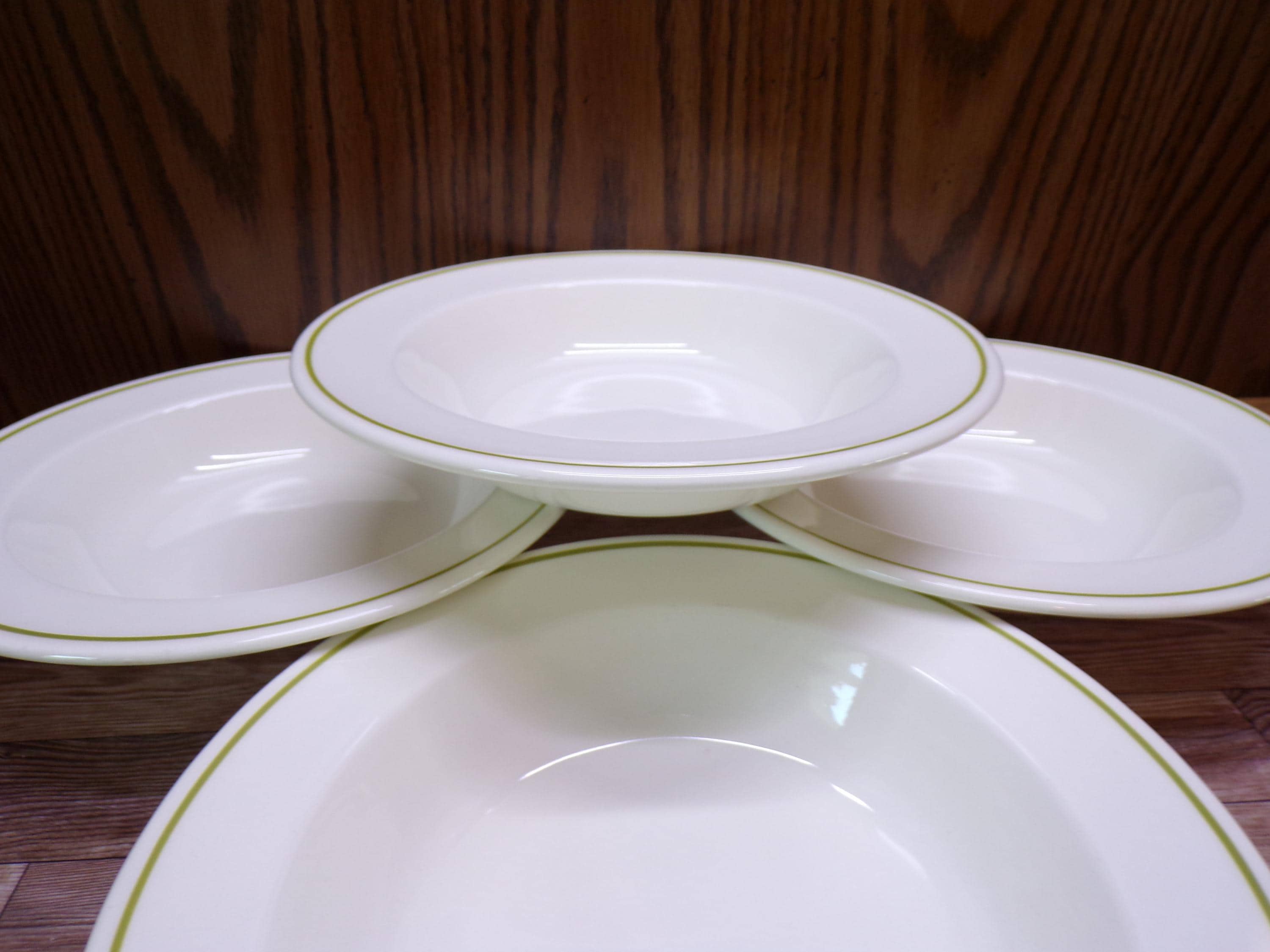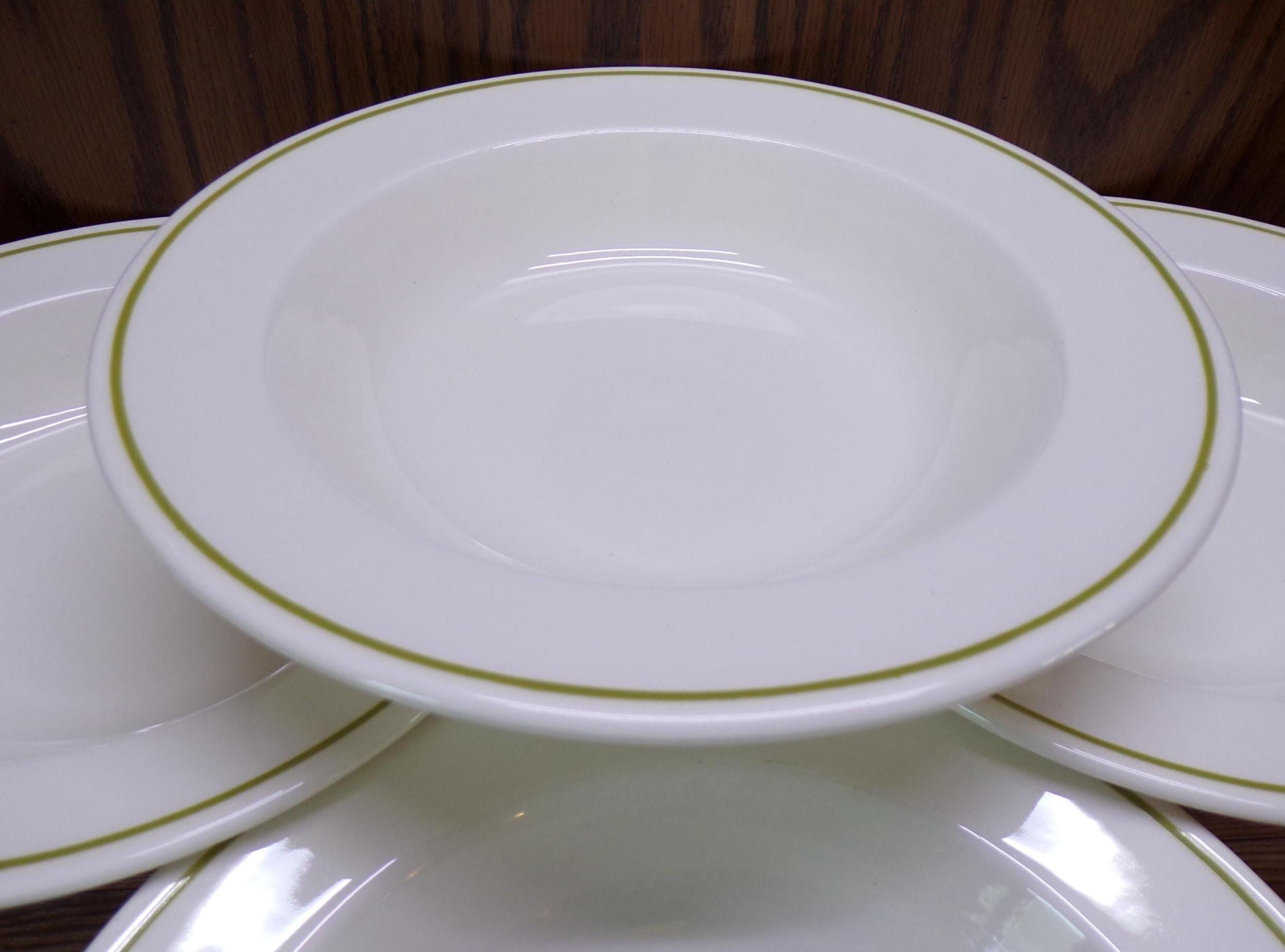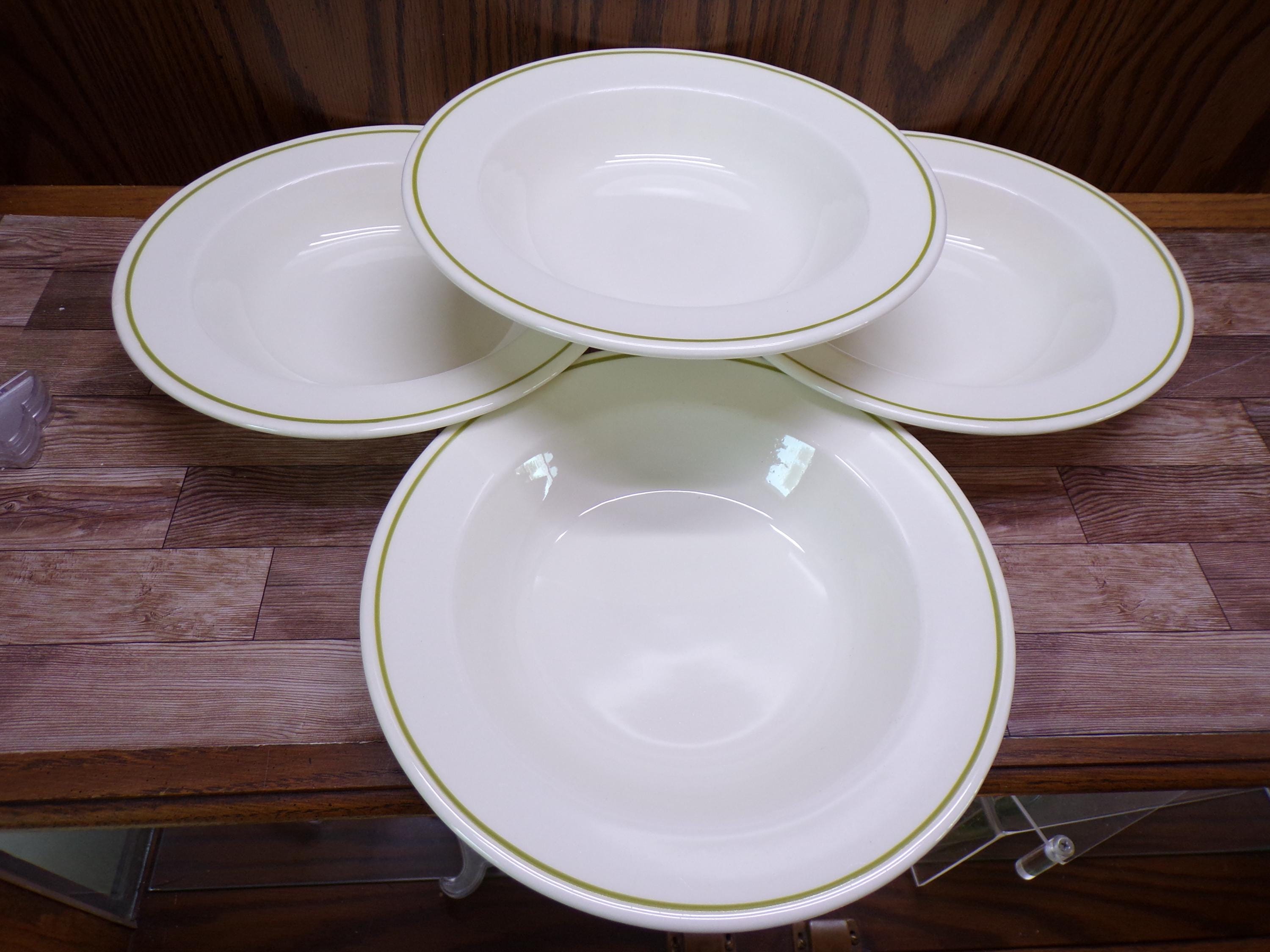 2510 Anchor Hocking Berry Patch Vintage Stoneware 8.25" Flat Rim Bowls Set of 4 Green Band Made in USA - Great Condition