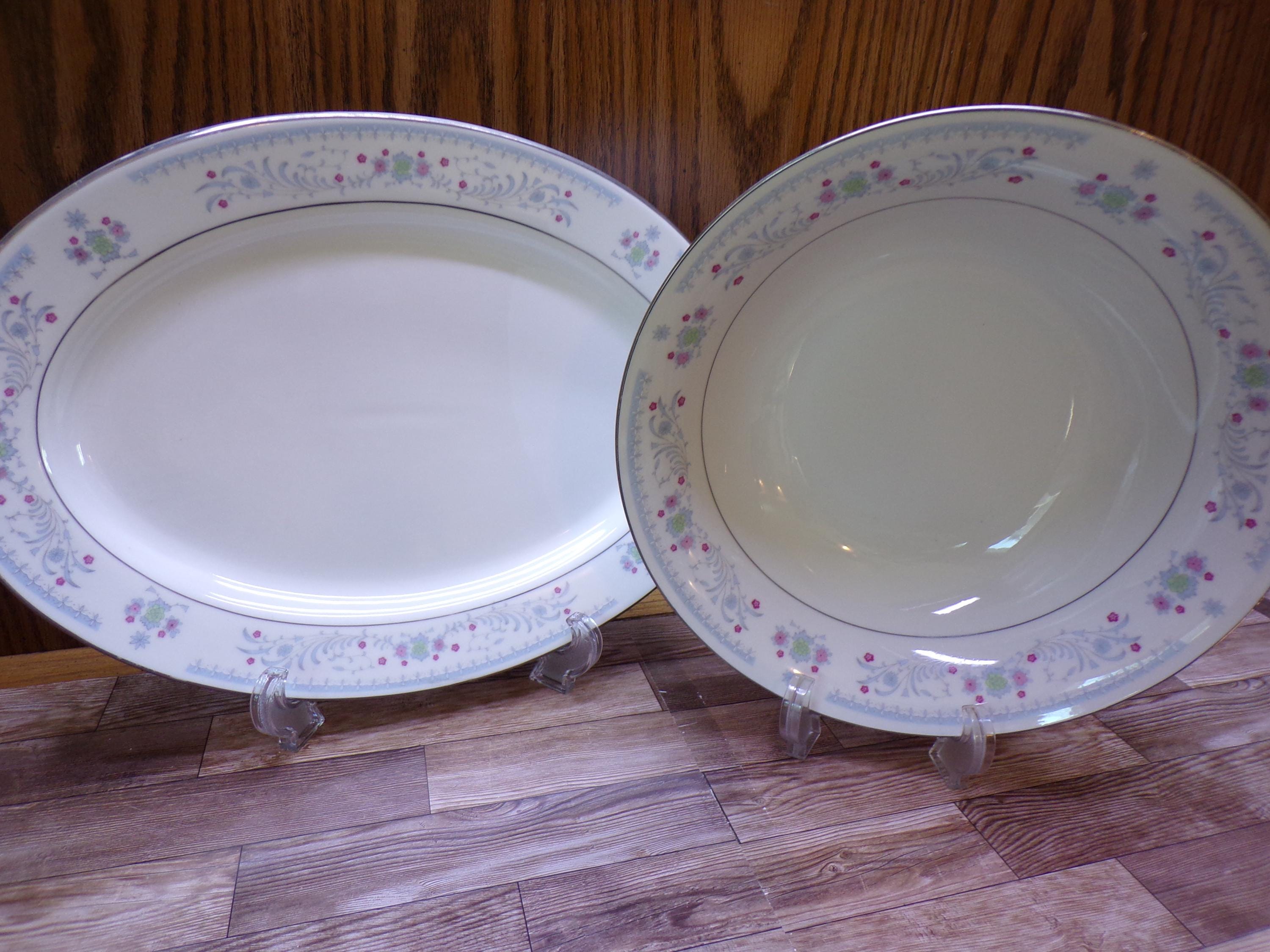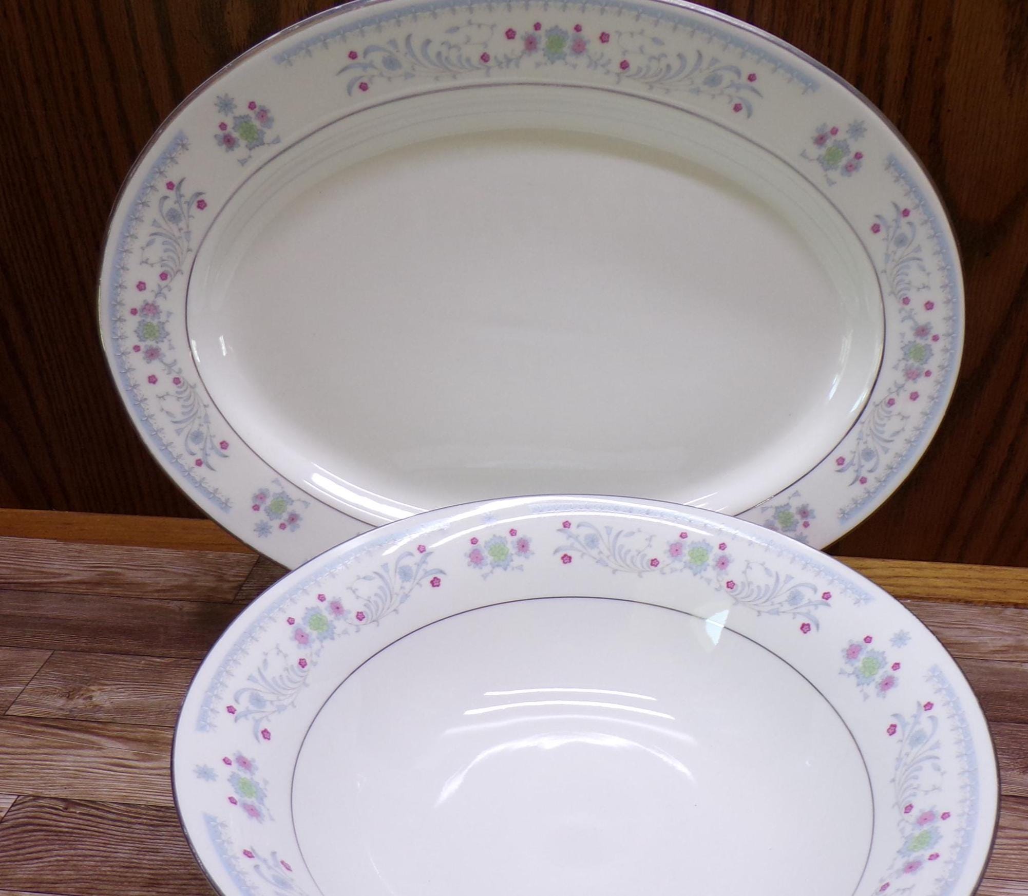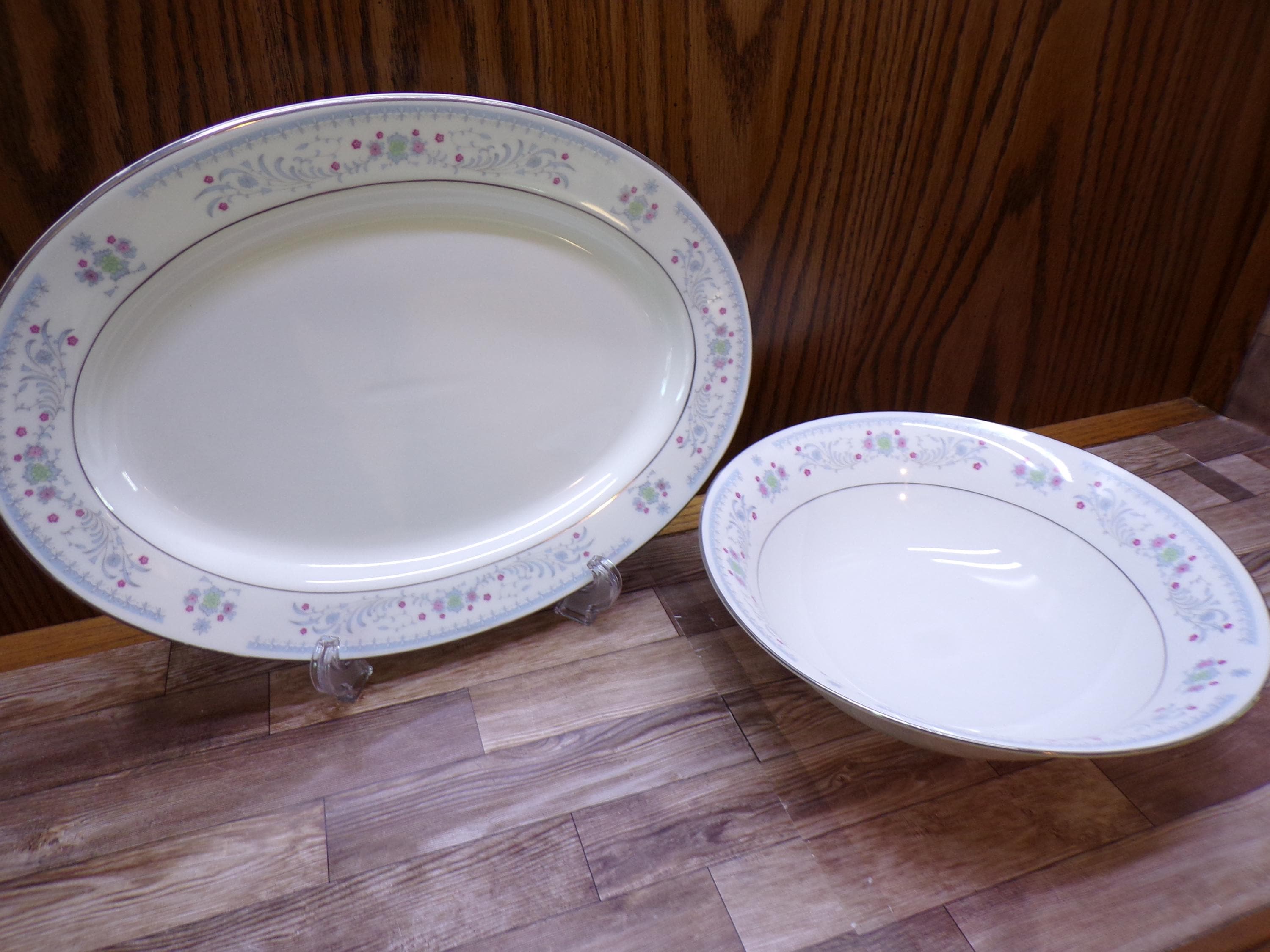 2510 Sango Serenade #8225 Fine China Platinum Rim Floral Pattern 12" x 9" Oval Platter & 9" Round Bowl - Great Condition