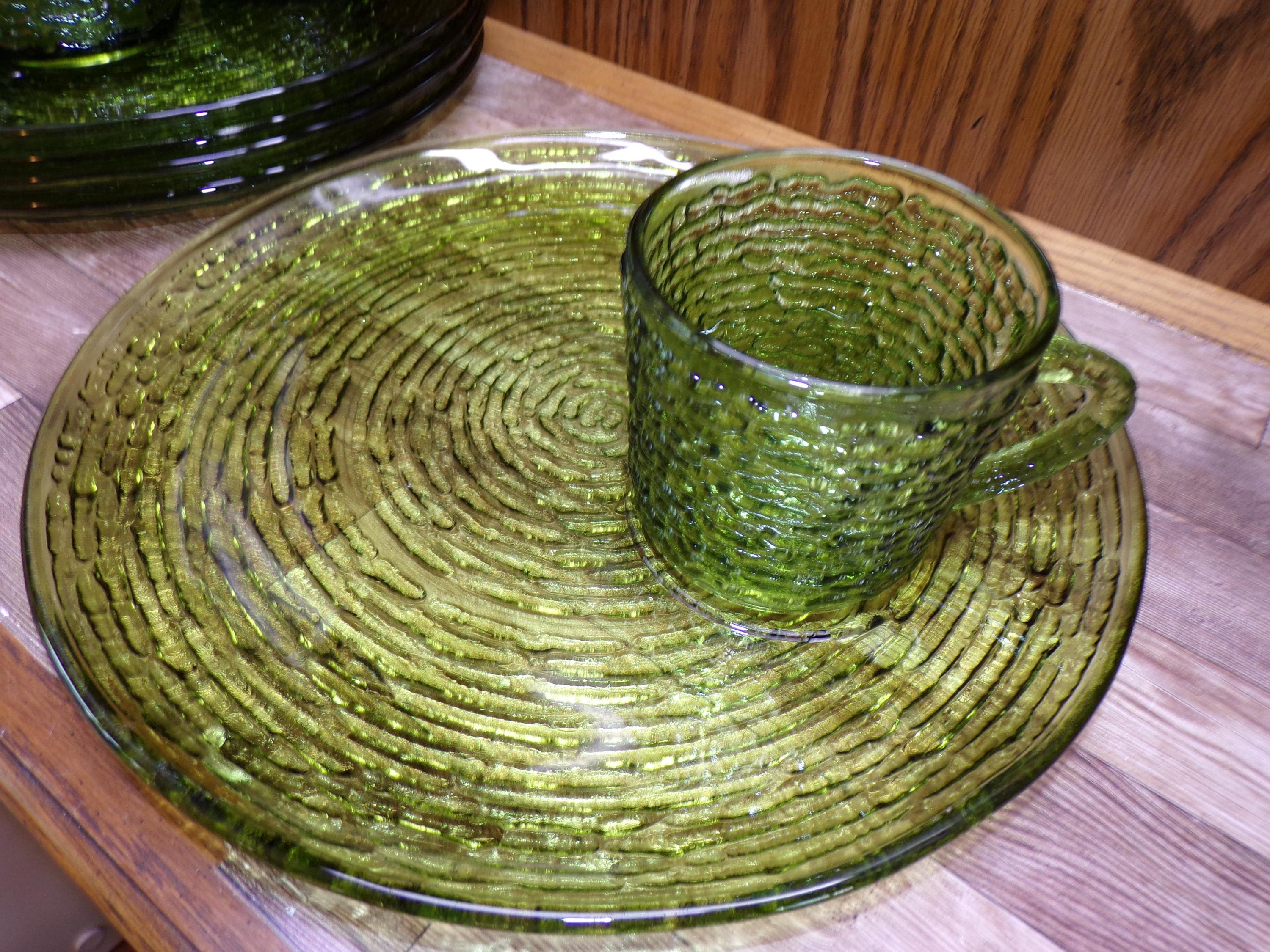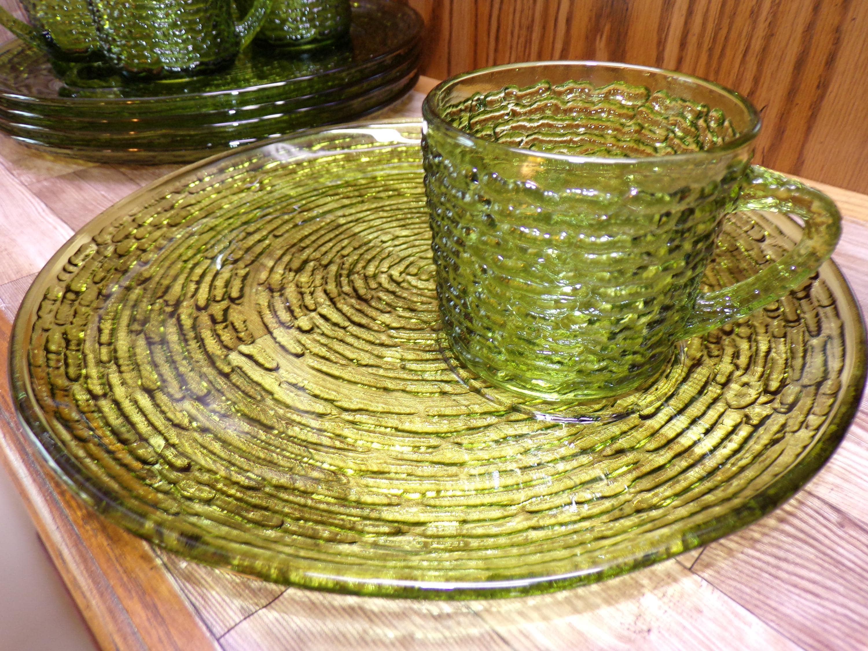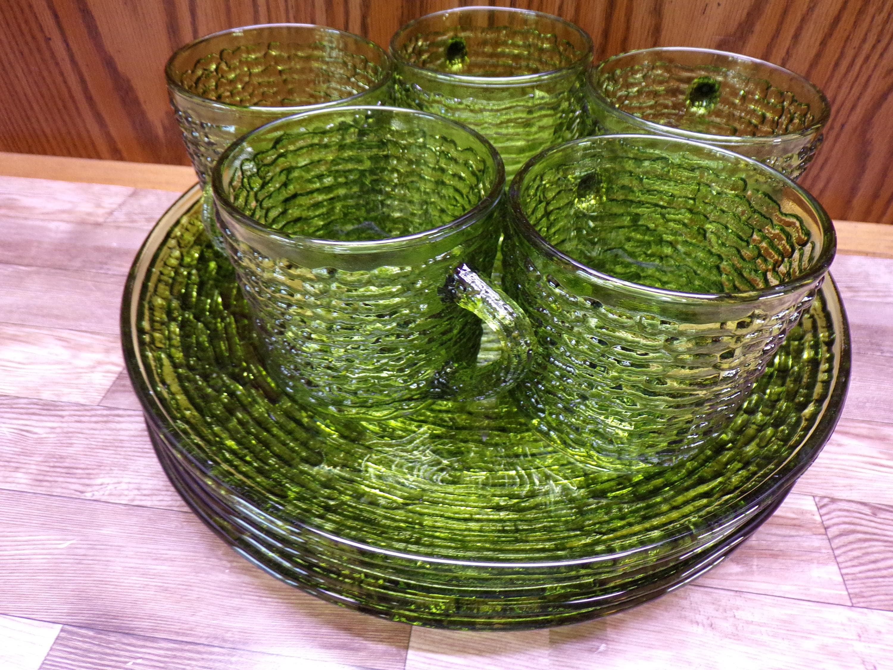 2510 Anchor Hocking Vintage 1960's Avocado Green Soreno 8 pc Snack Set (4) 10" Plates & (4) Matching Cups - Great Condition