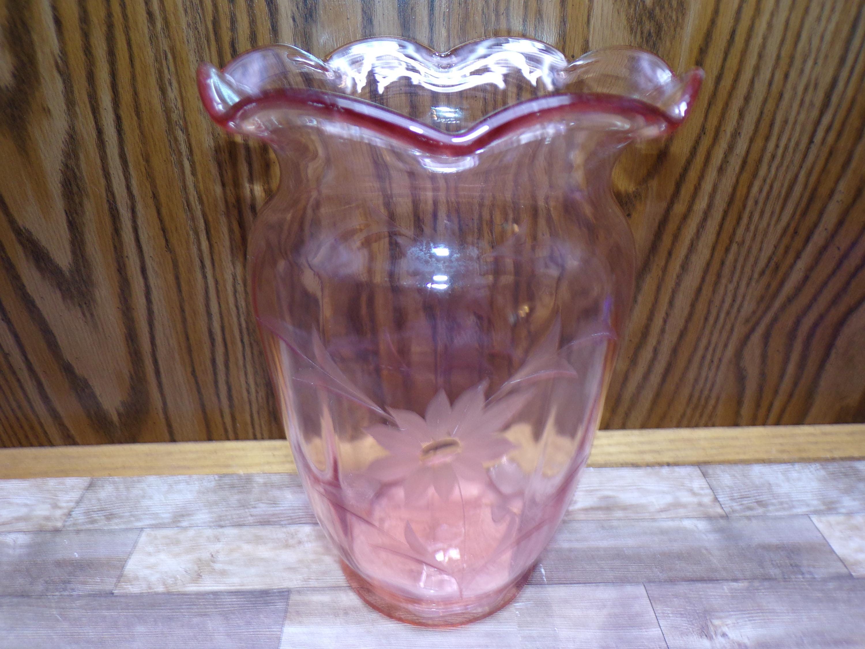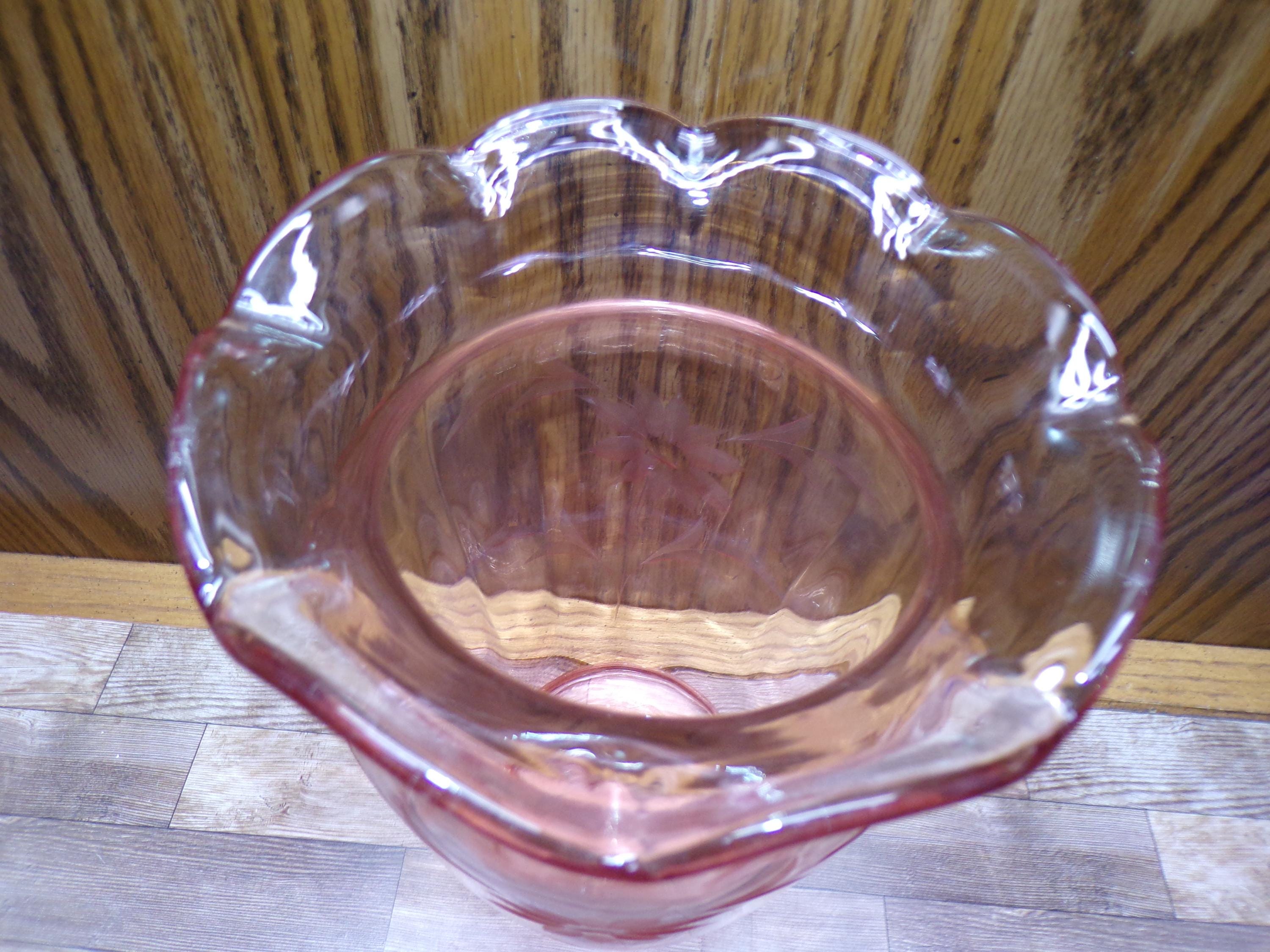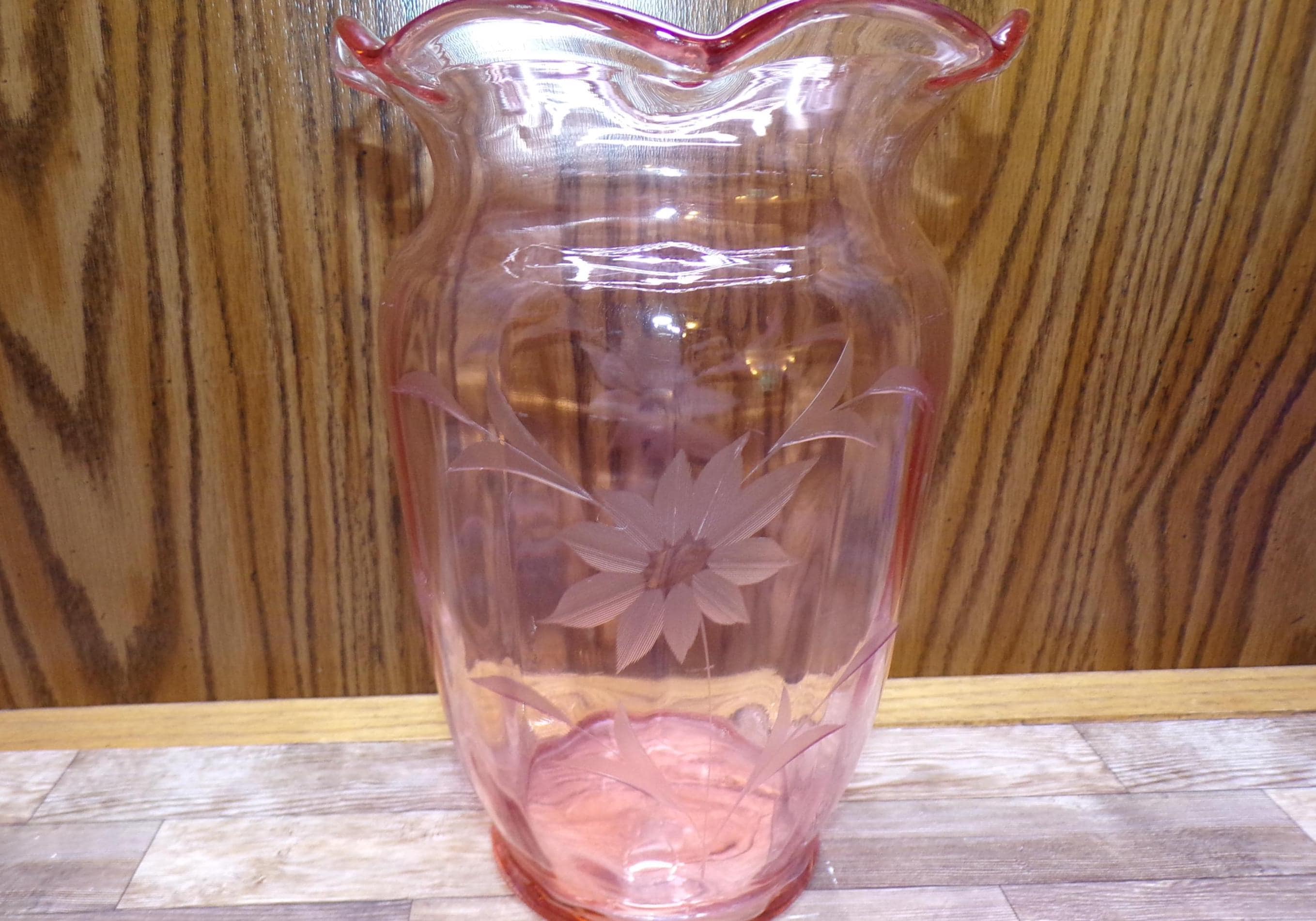 2510 Pink Glass 9" Vintage Vase Etched Flower Ruffled Rim - Good Condition