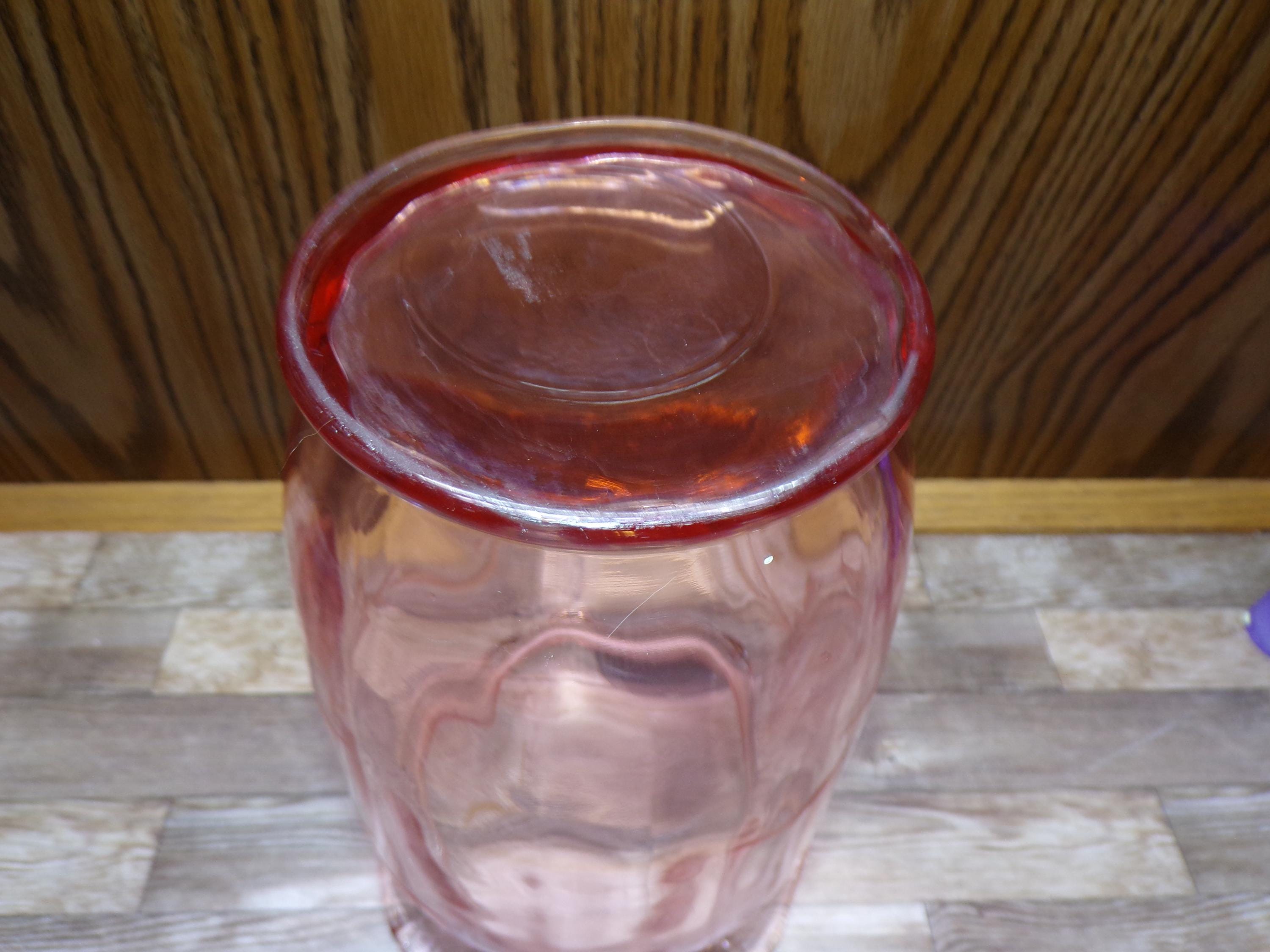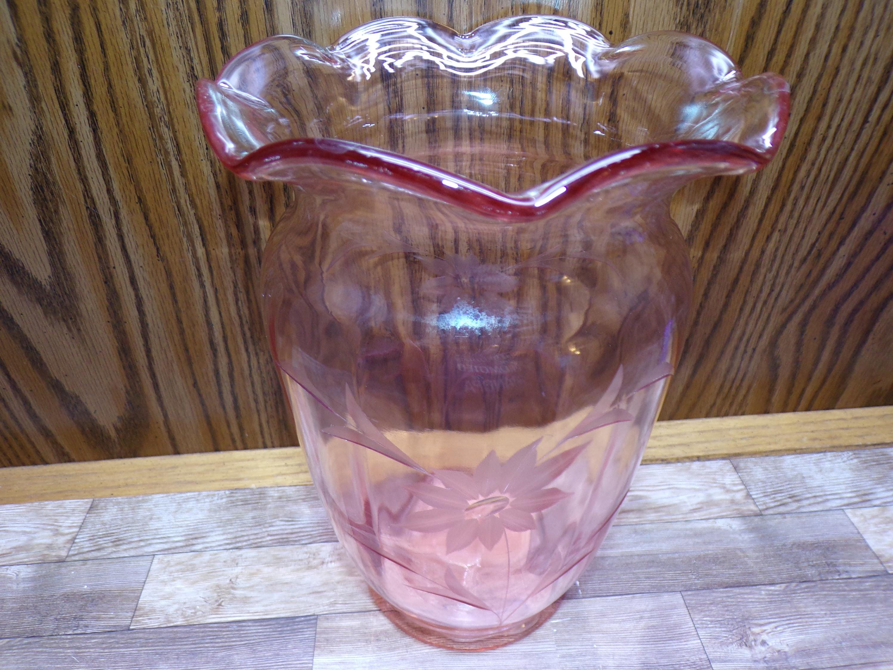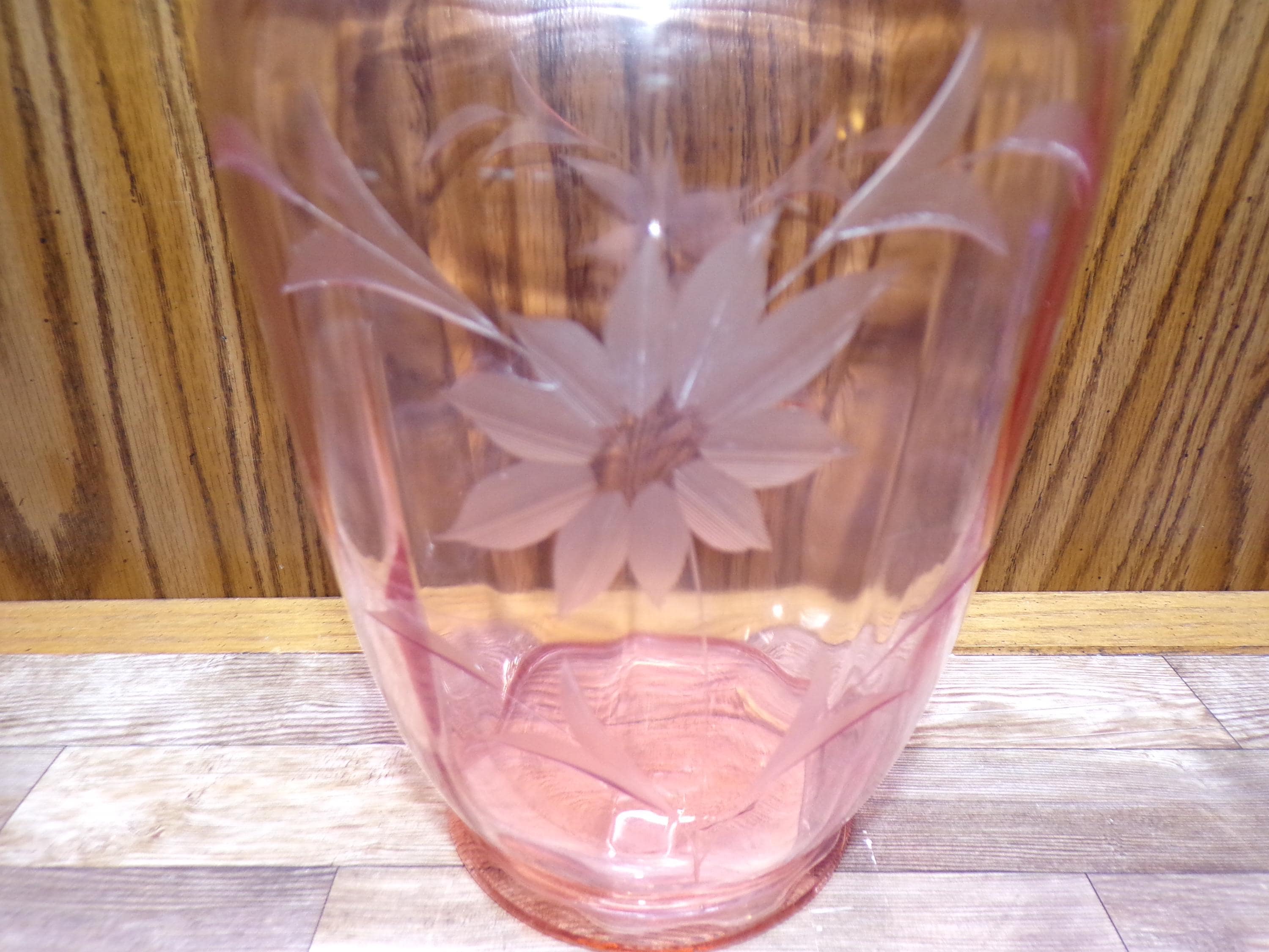 2510 Pink Glass 9" Vintage Vase Etched Flower Ruffled Rim - Good Condition