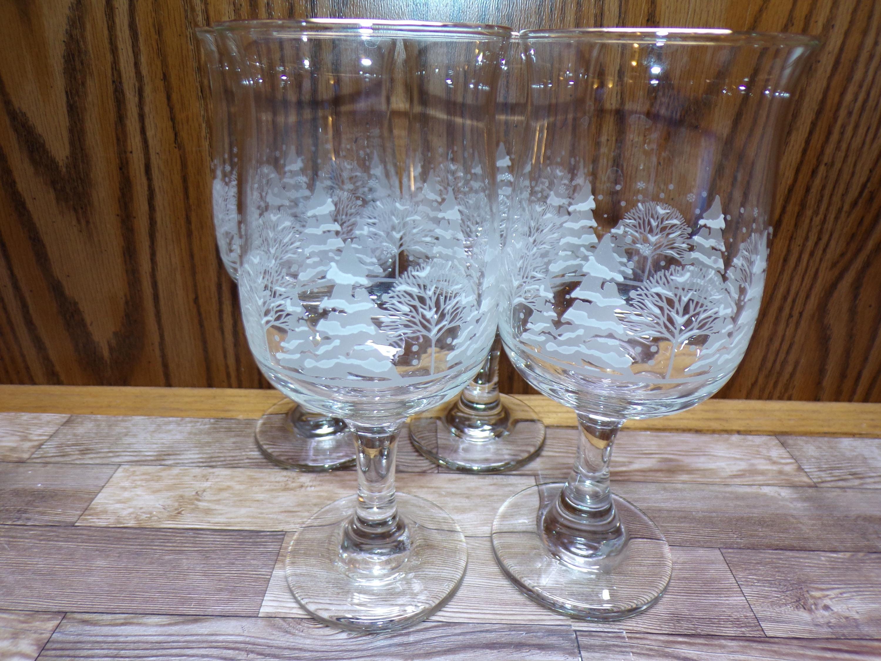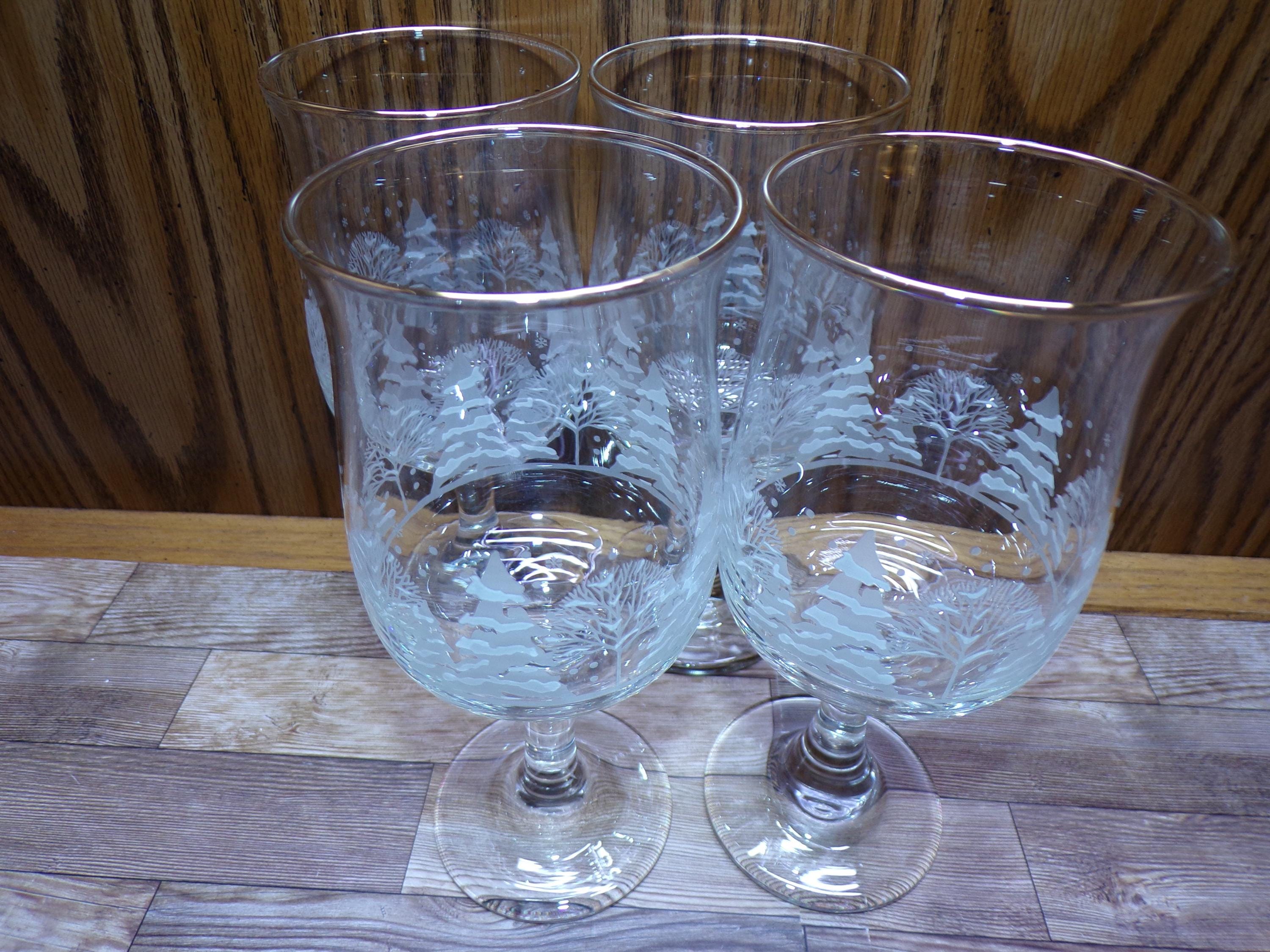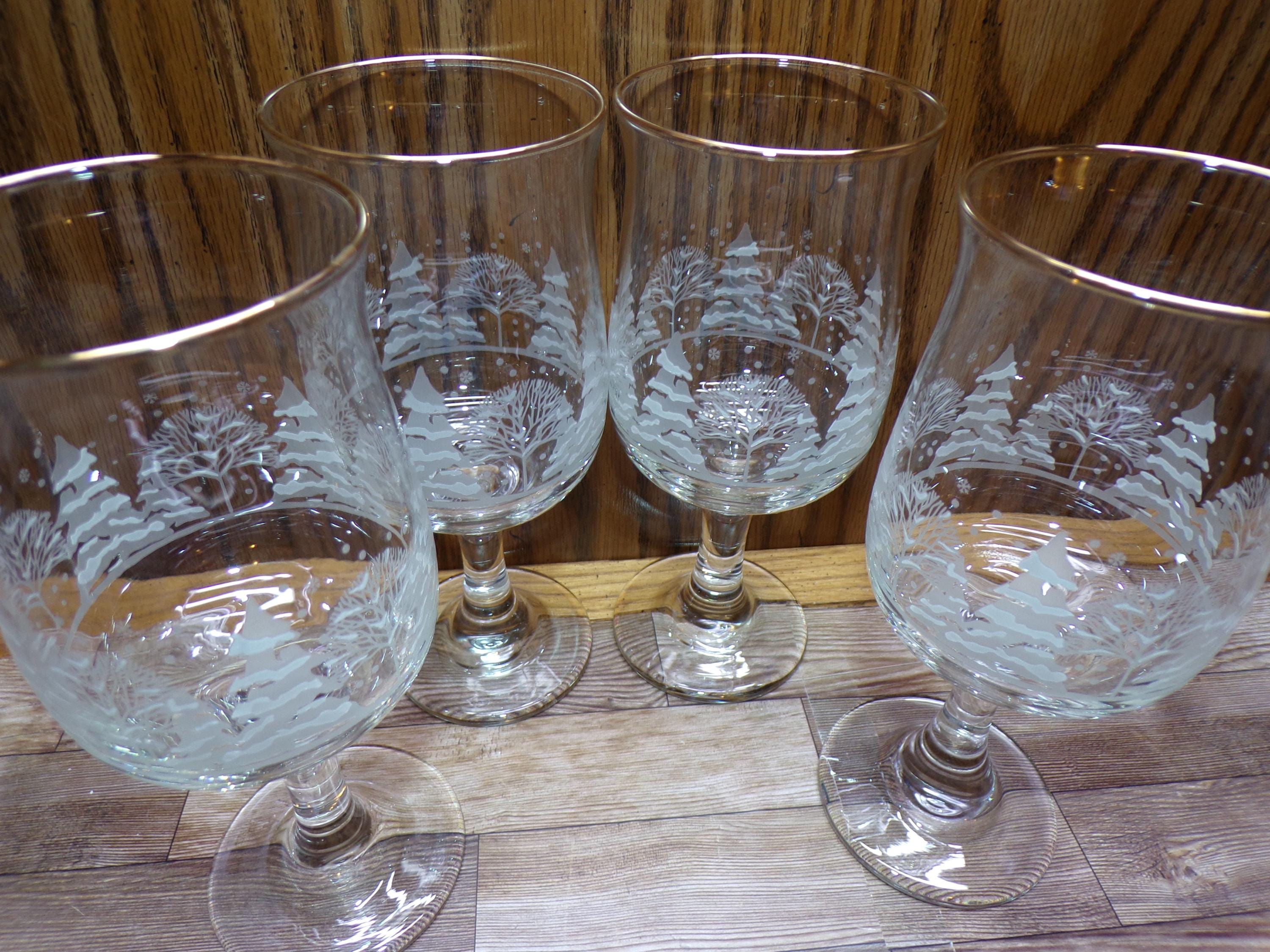2510 Libbey Glass Arby's Christmas Frosted Pine Trees Vintage 7" Stemmed Tulip Glasses with Gold Rim Set of 4 - Great Condition