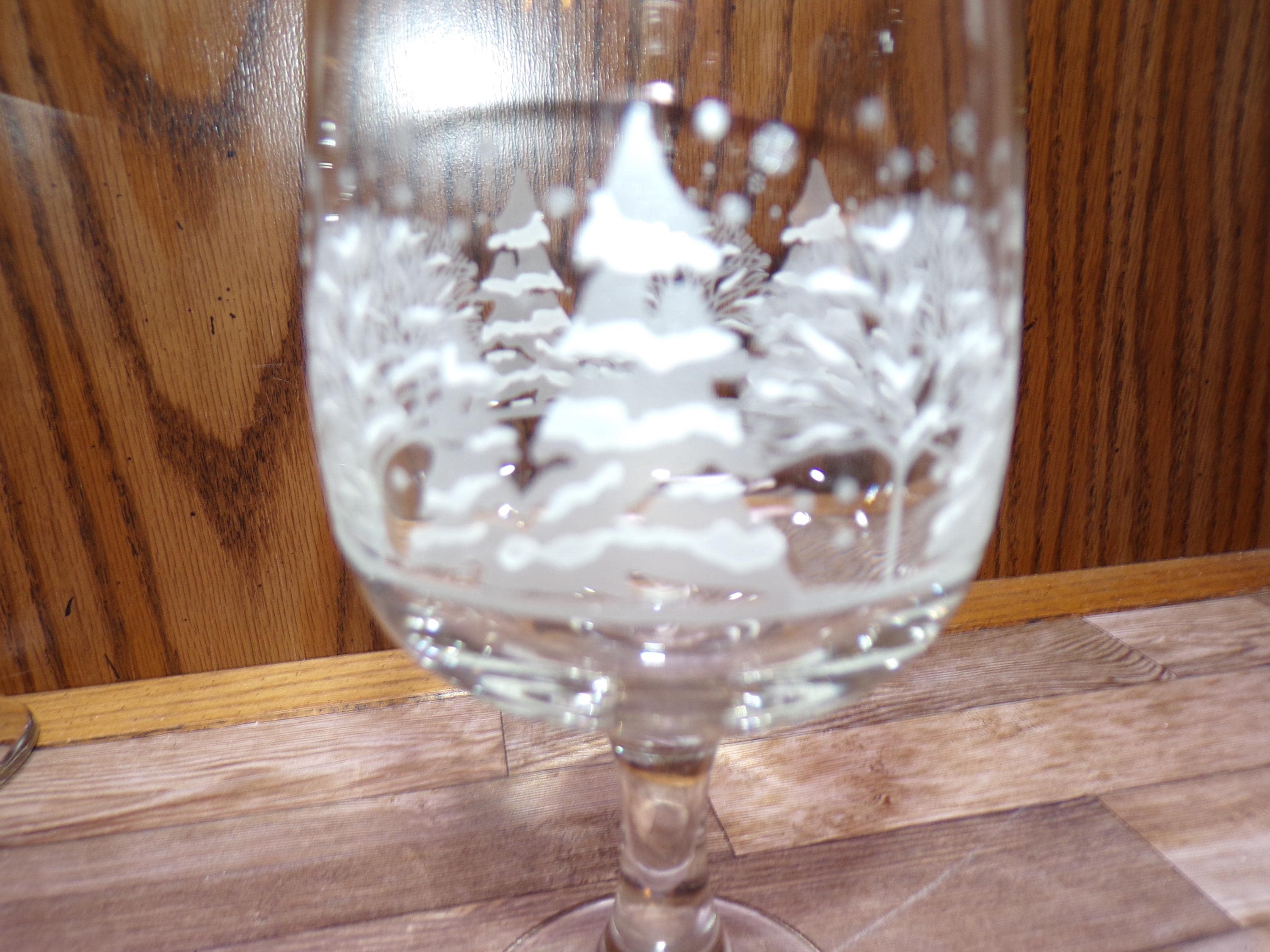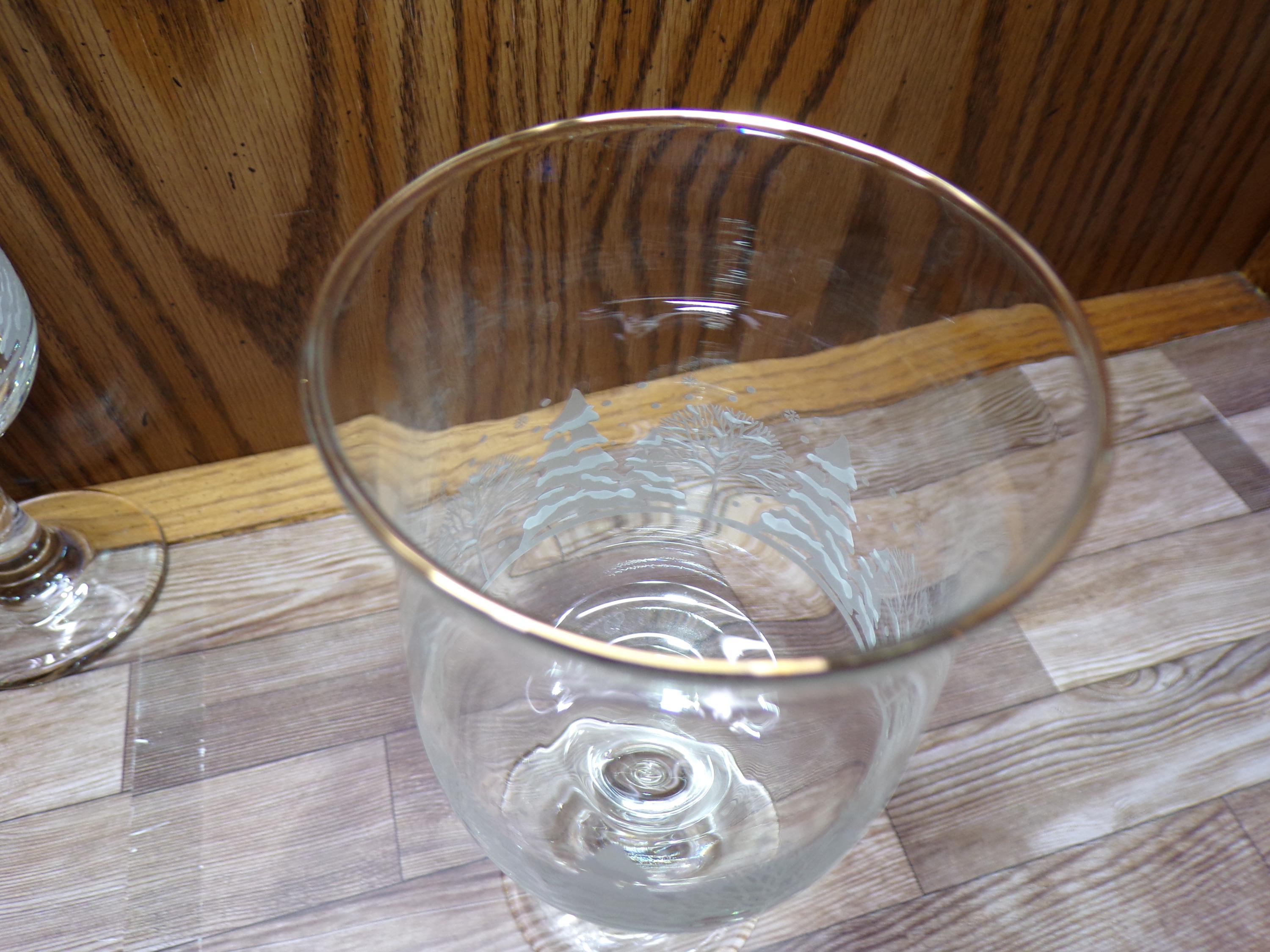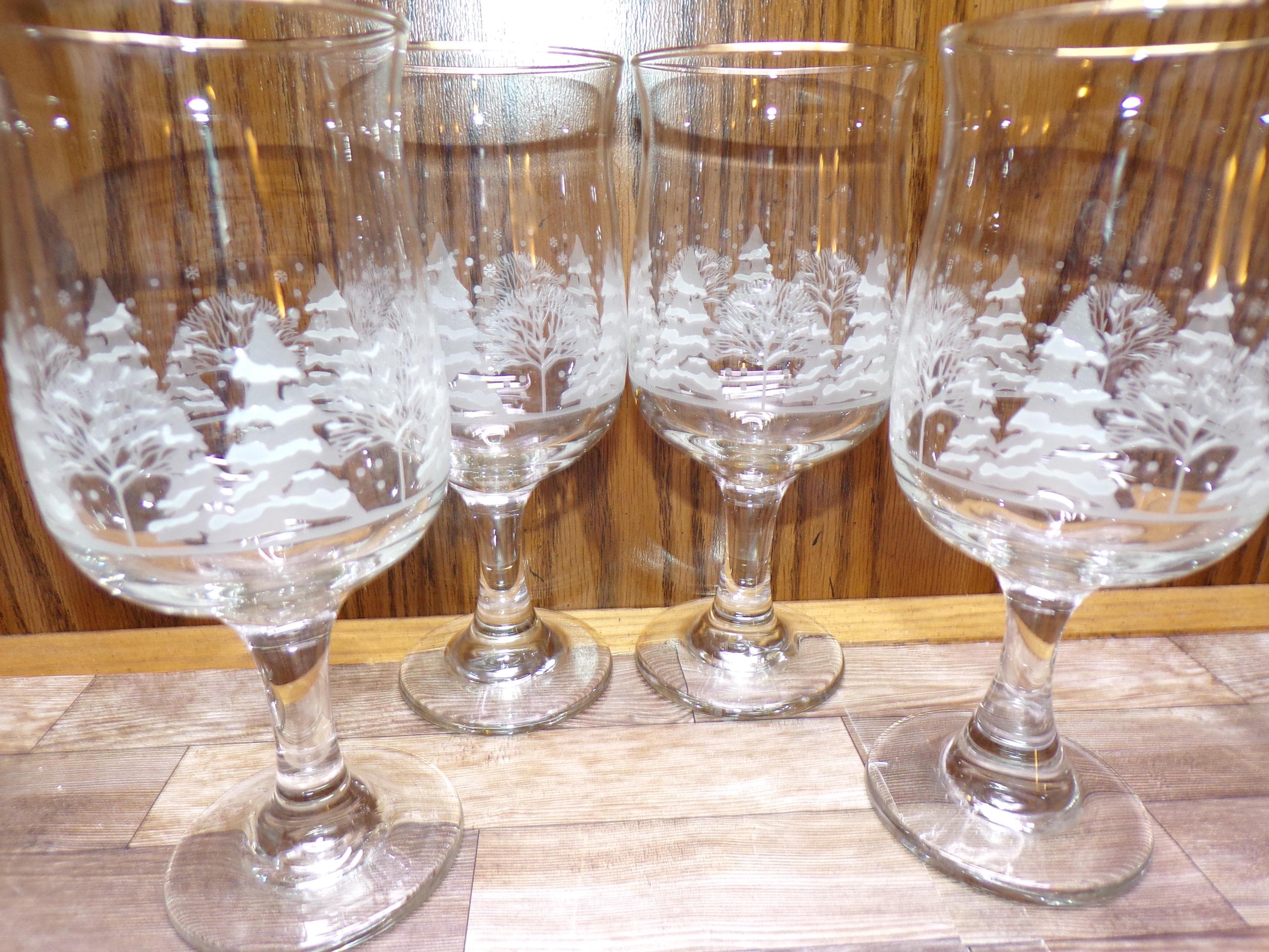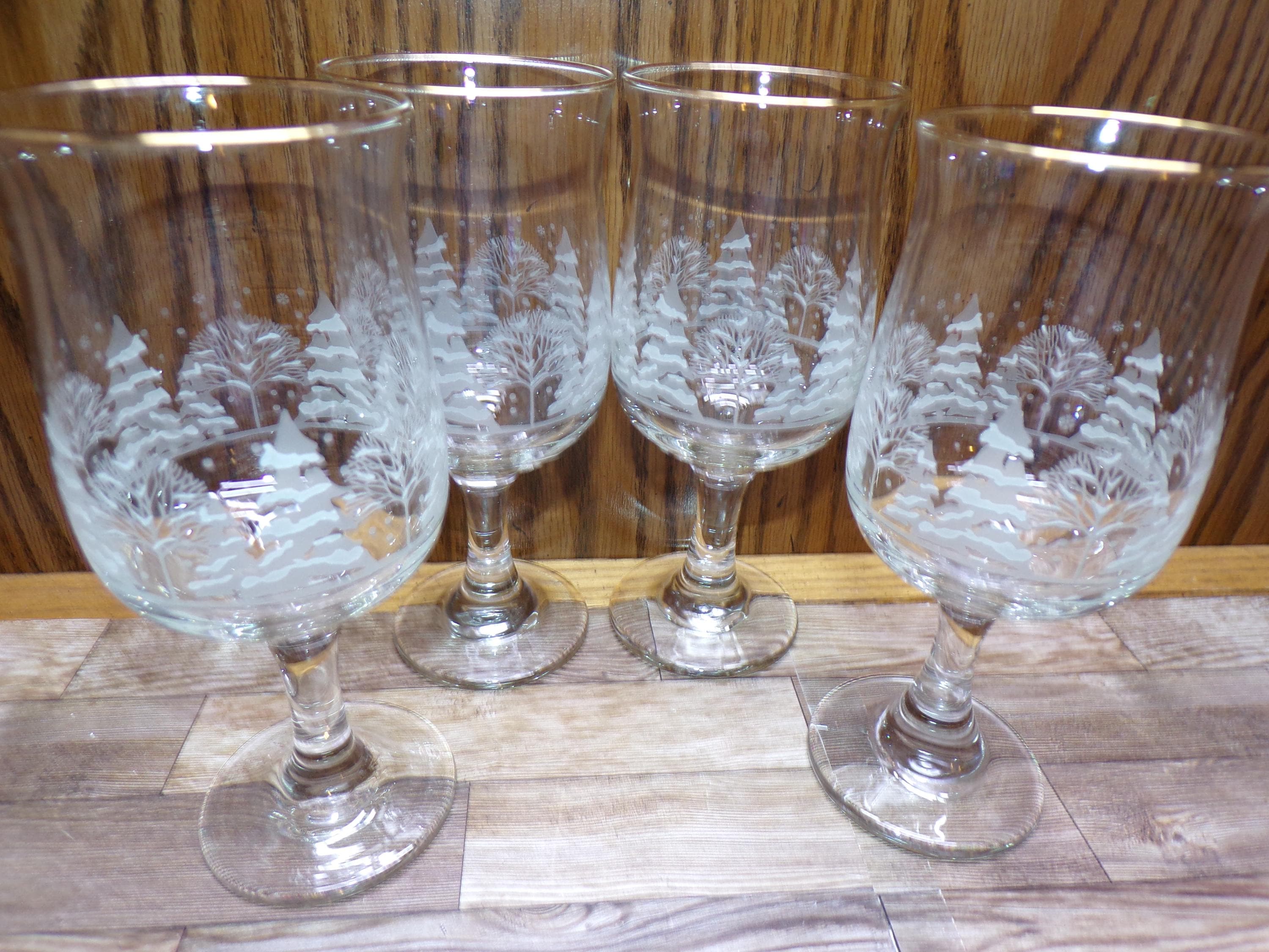 2510 Libbey Glass Arby's Christmas Frosted Pine Trees Vintage 7" Stemmed Tulip Glasses with Gold Rim Set of 4 - Great Condition