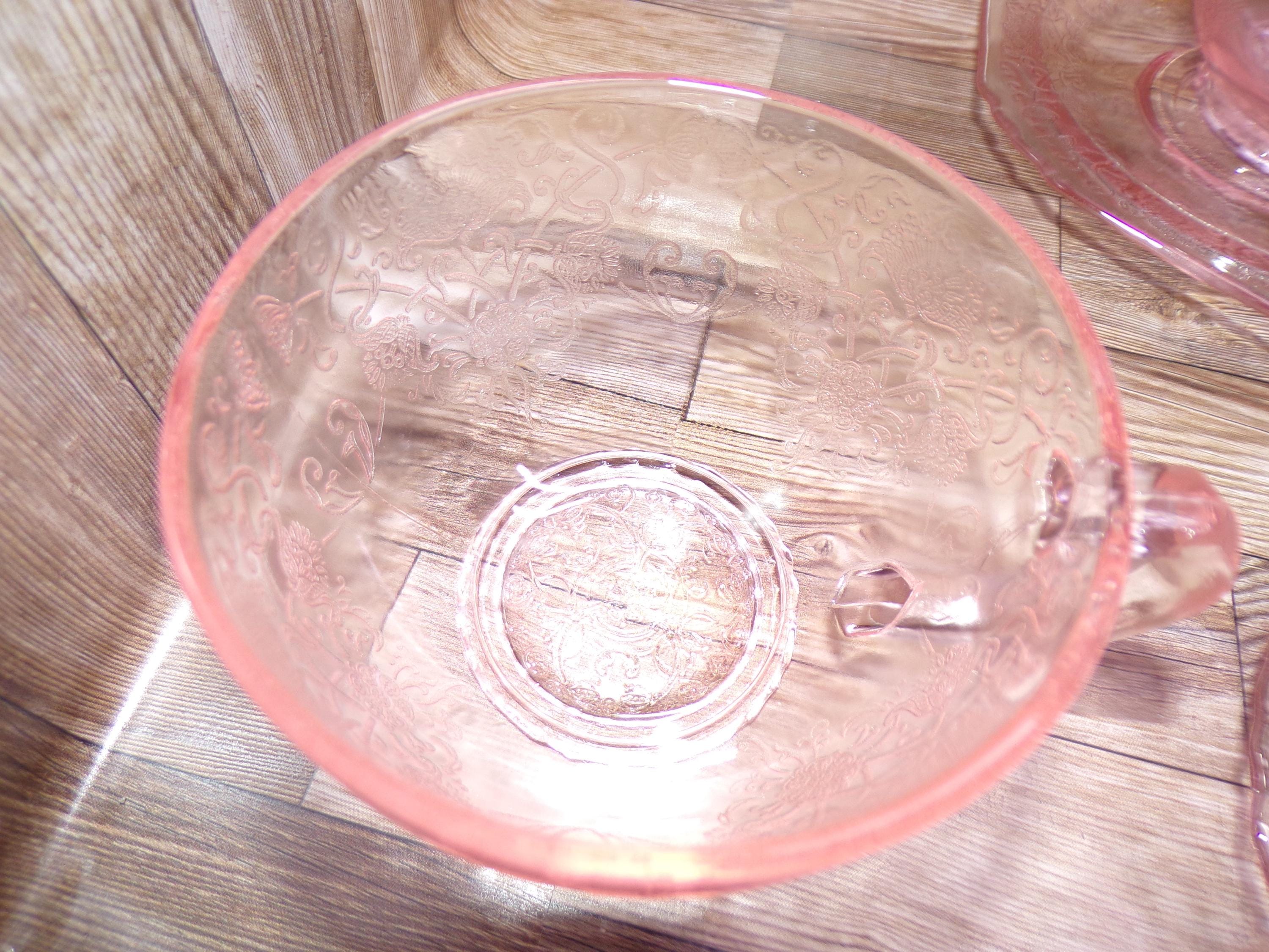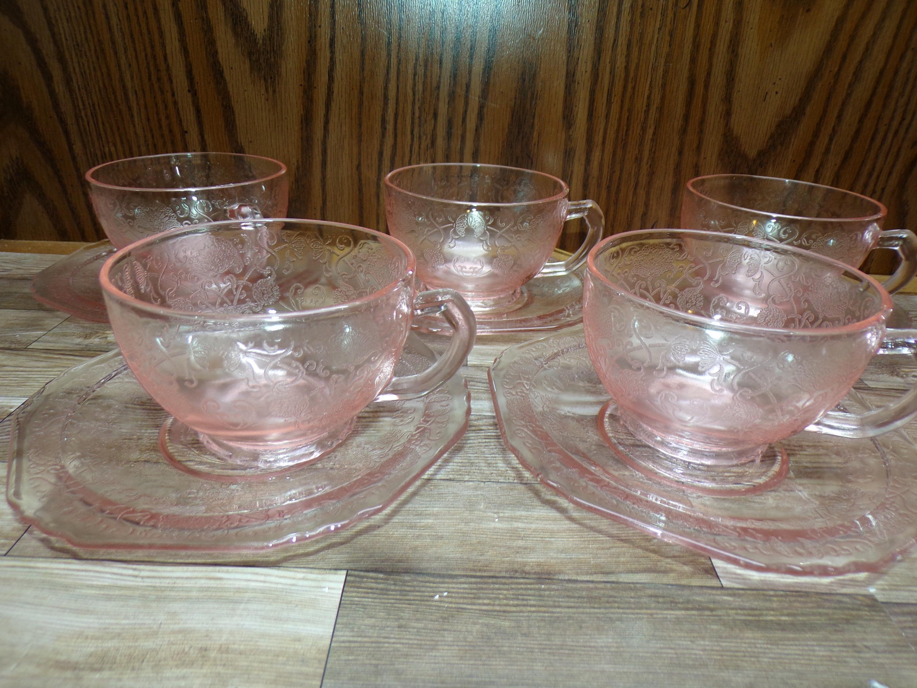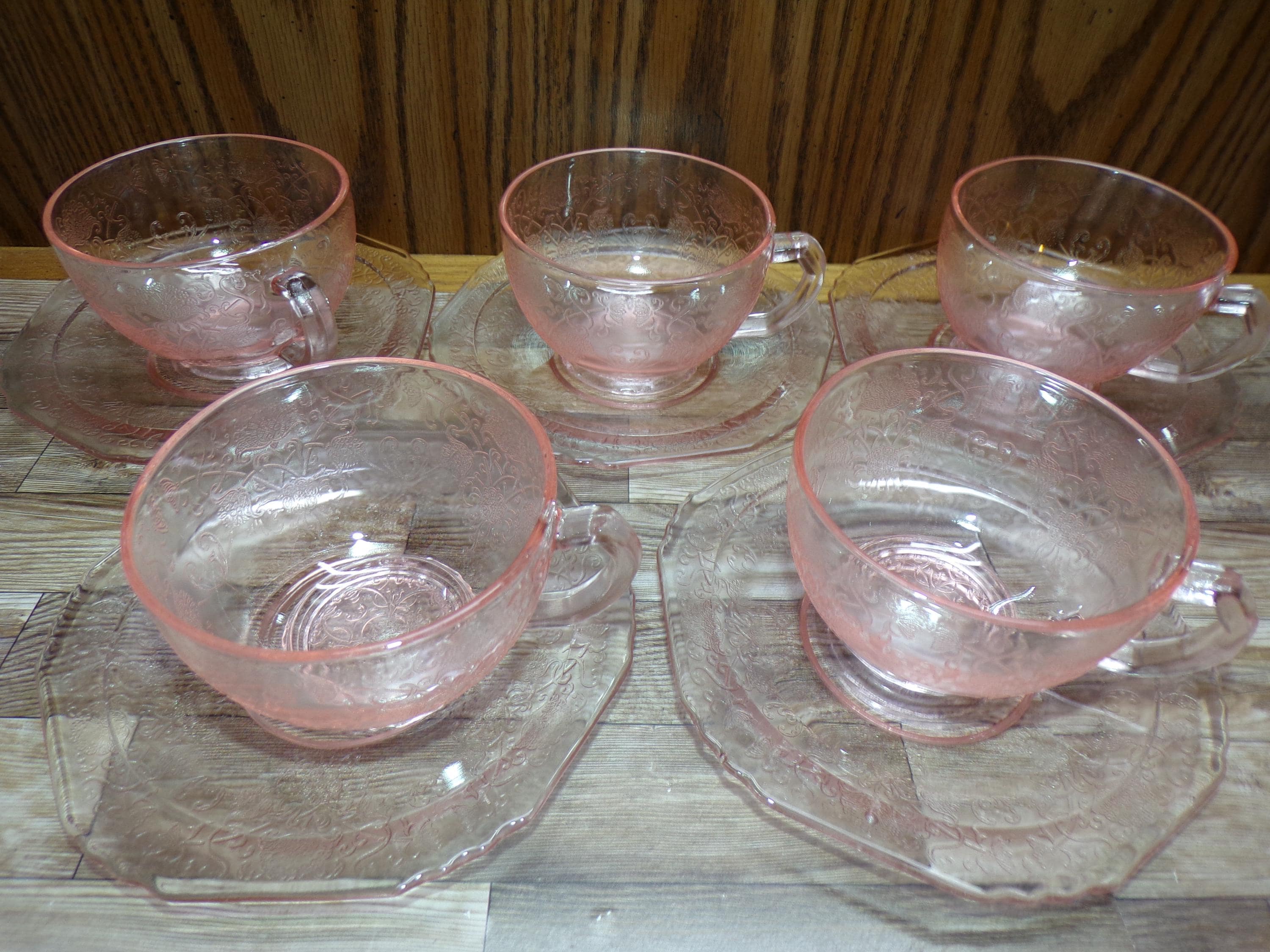 2510 Vintage Pink Glass Floral 10 pc Set 5 Cups & 5 Saucers - Great Condition
