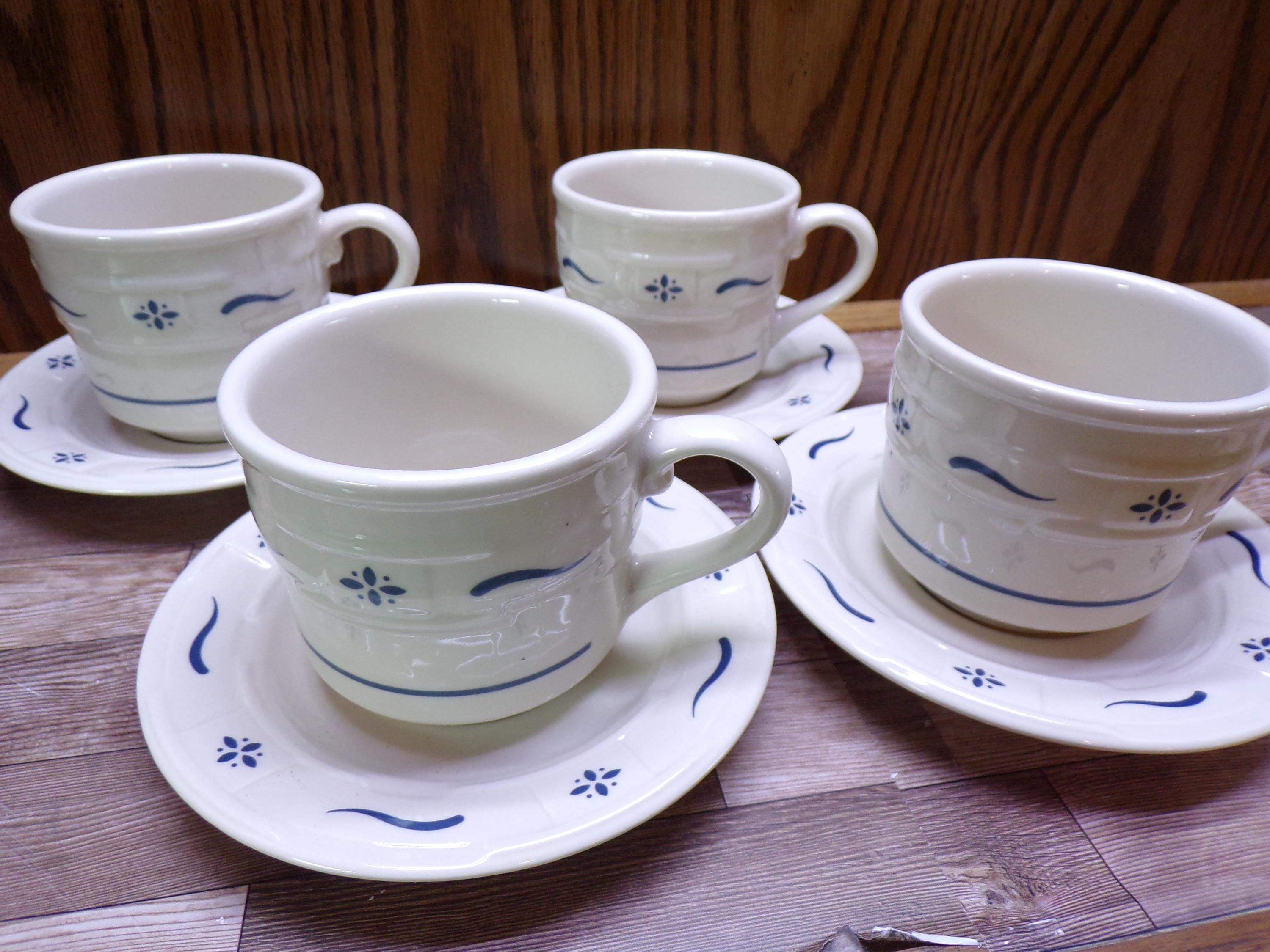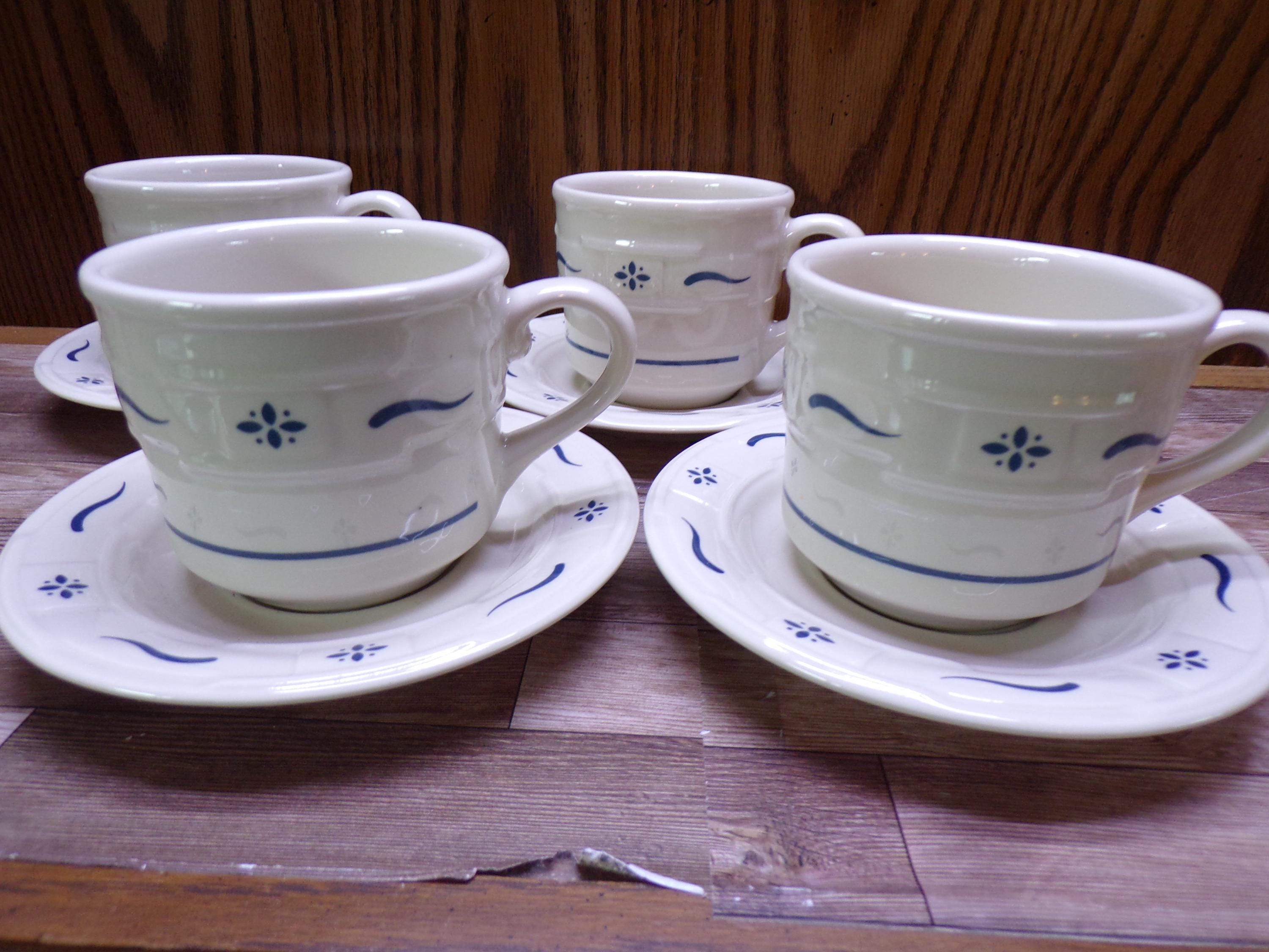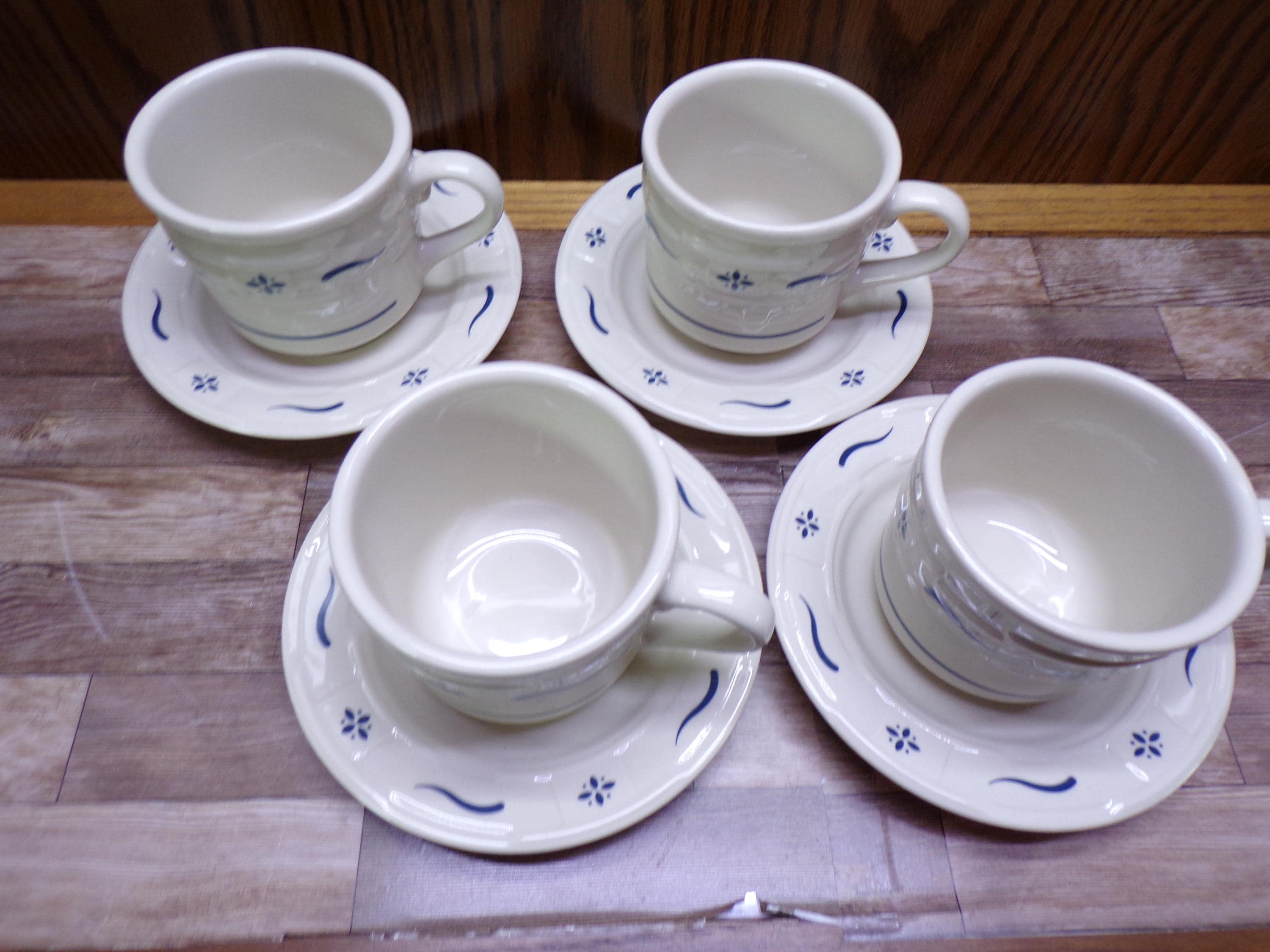 2510 Vintage Longaberger Pottery USA 8 pc Set Woven Traditions 4 Cups & 4 Saucers Blue on Ivory Oven, Micro, Dish Safe- Great Condition