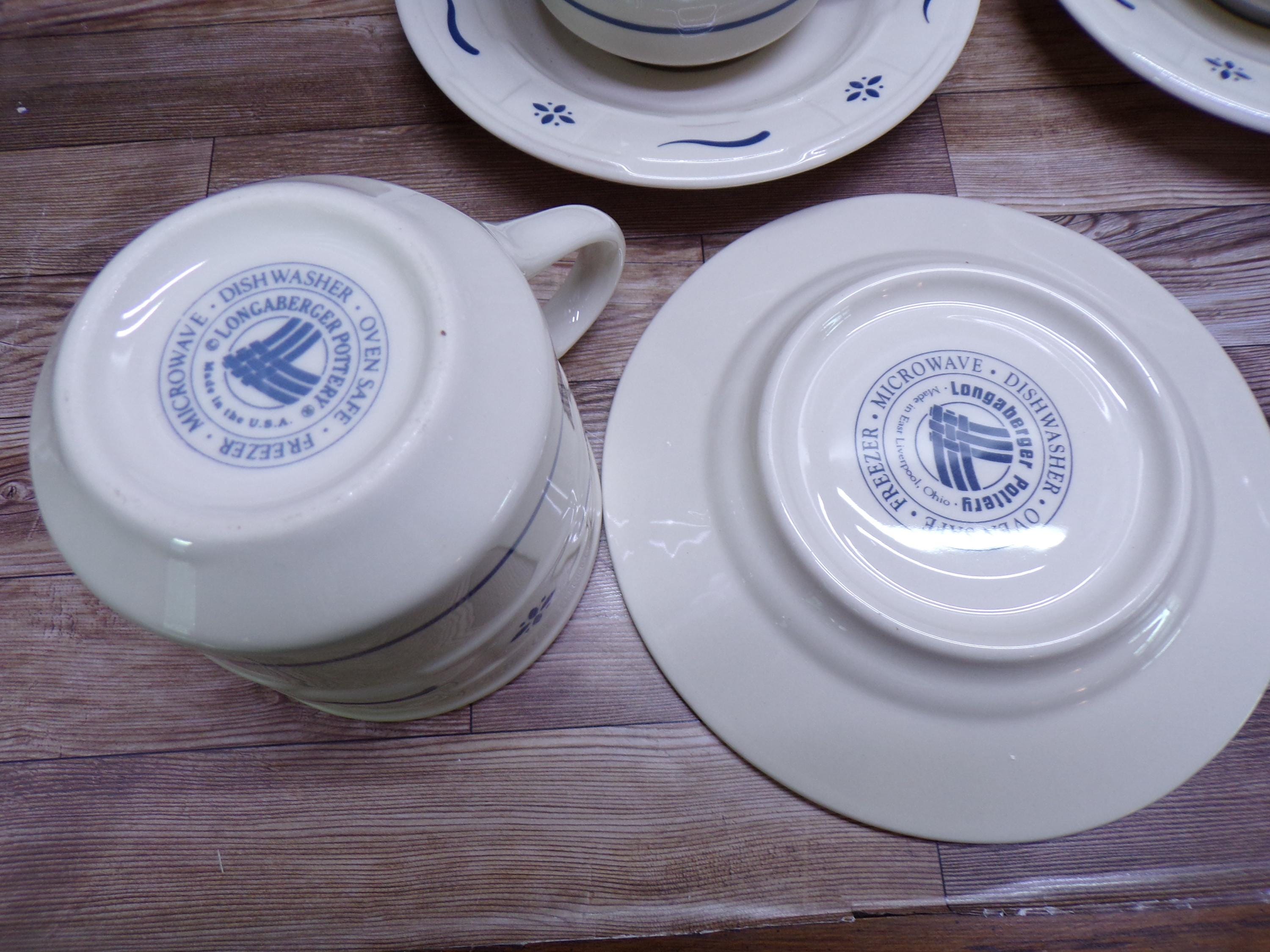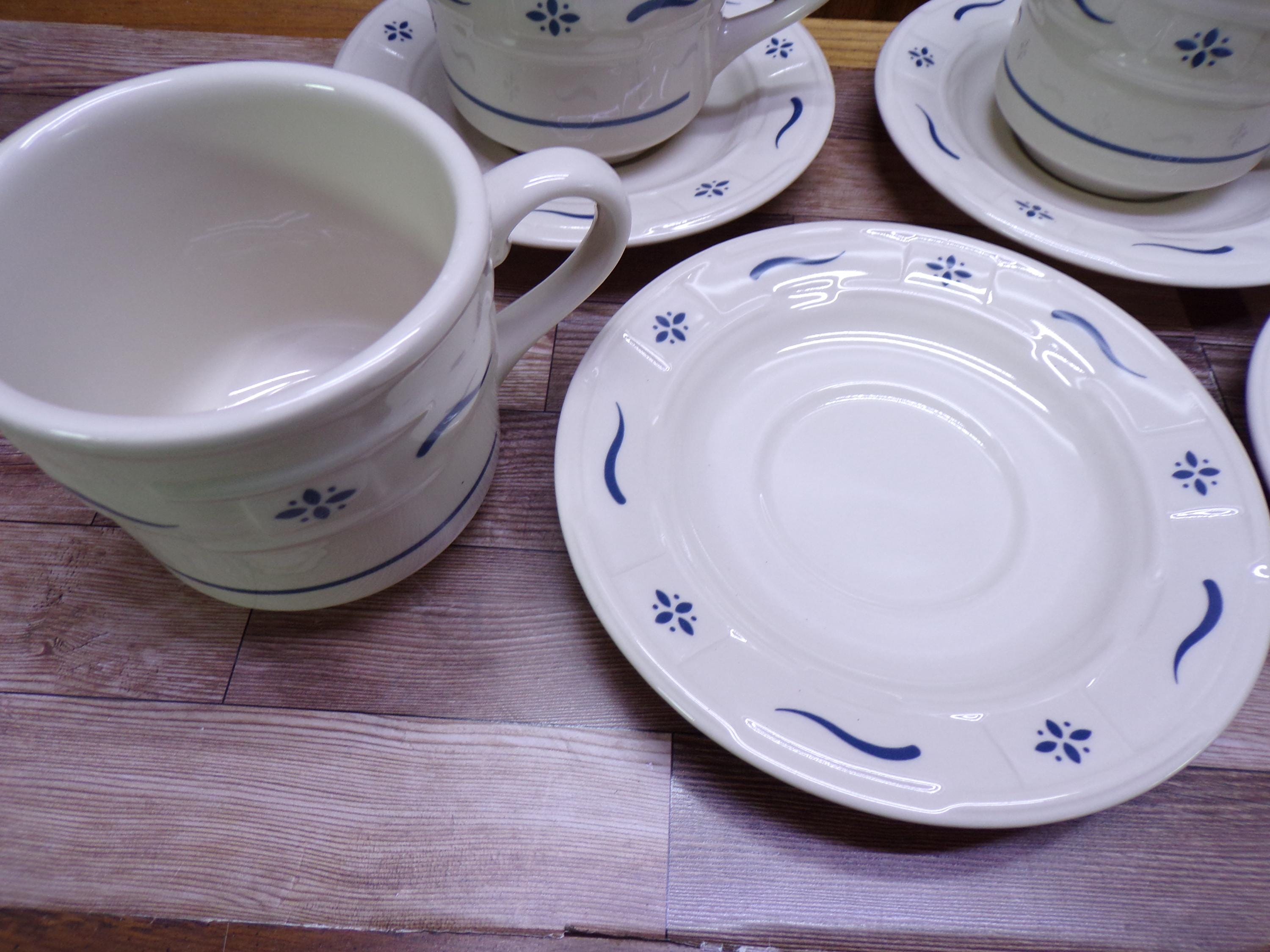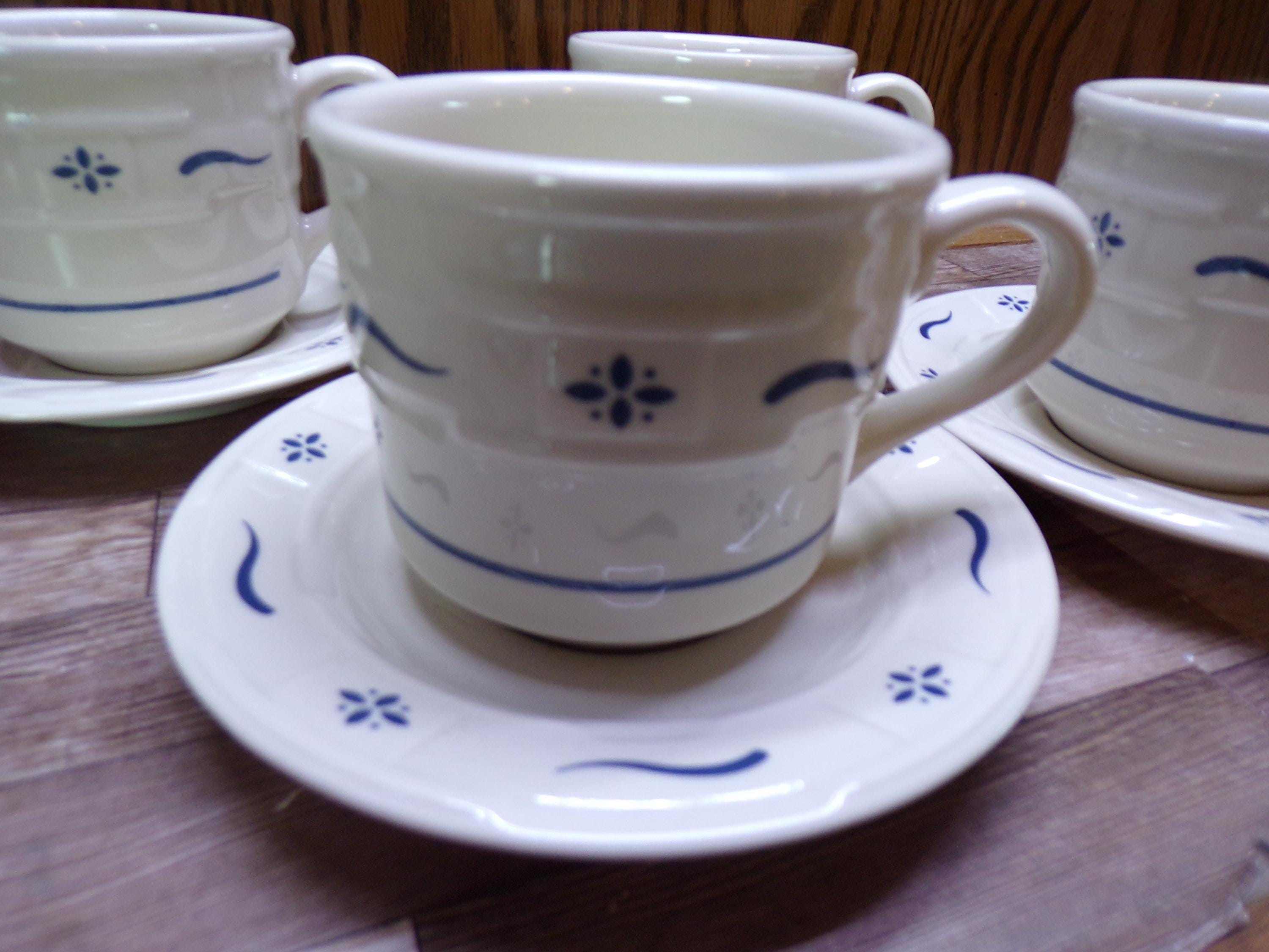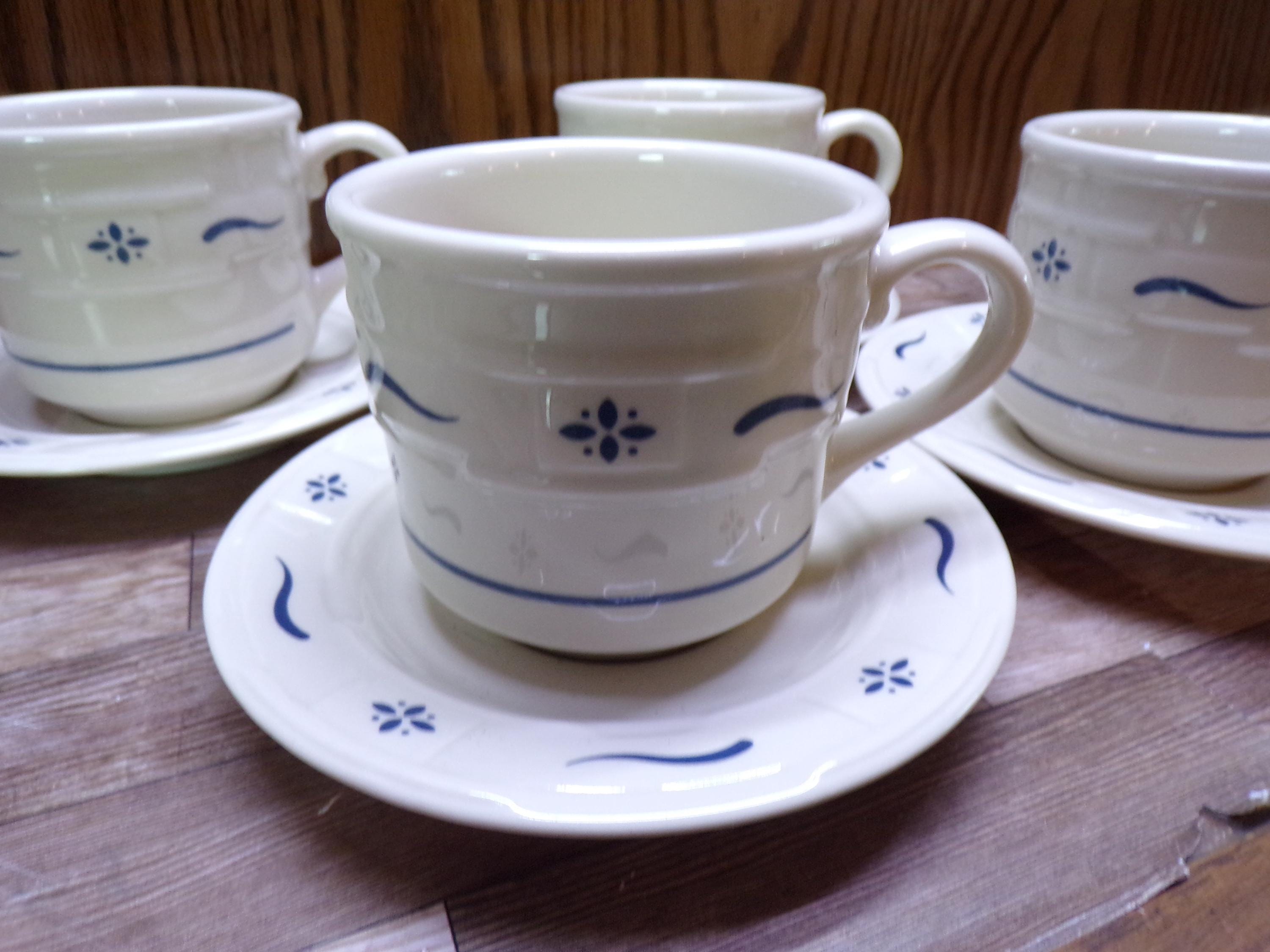 2510 Vintage Longaberger Pottery USA 8 pc Set Woven Traditions 4 Cups & 4 Saucers Blue on Ivory Oven, Micro, Dish Safe- Great Condition