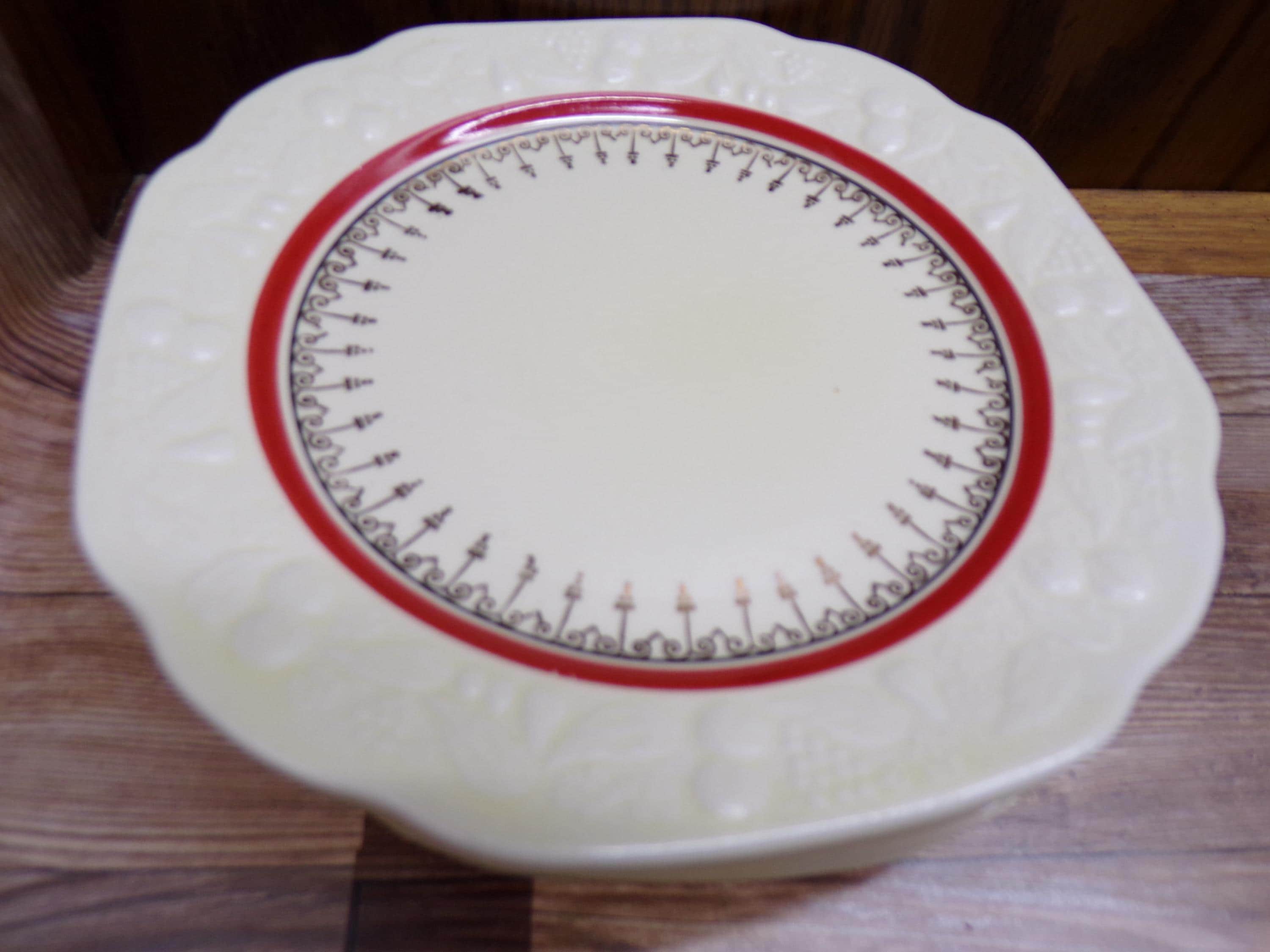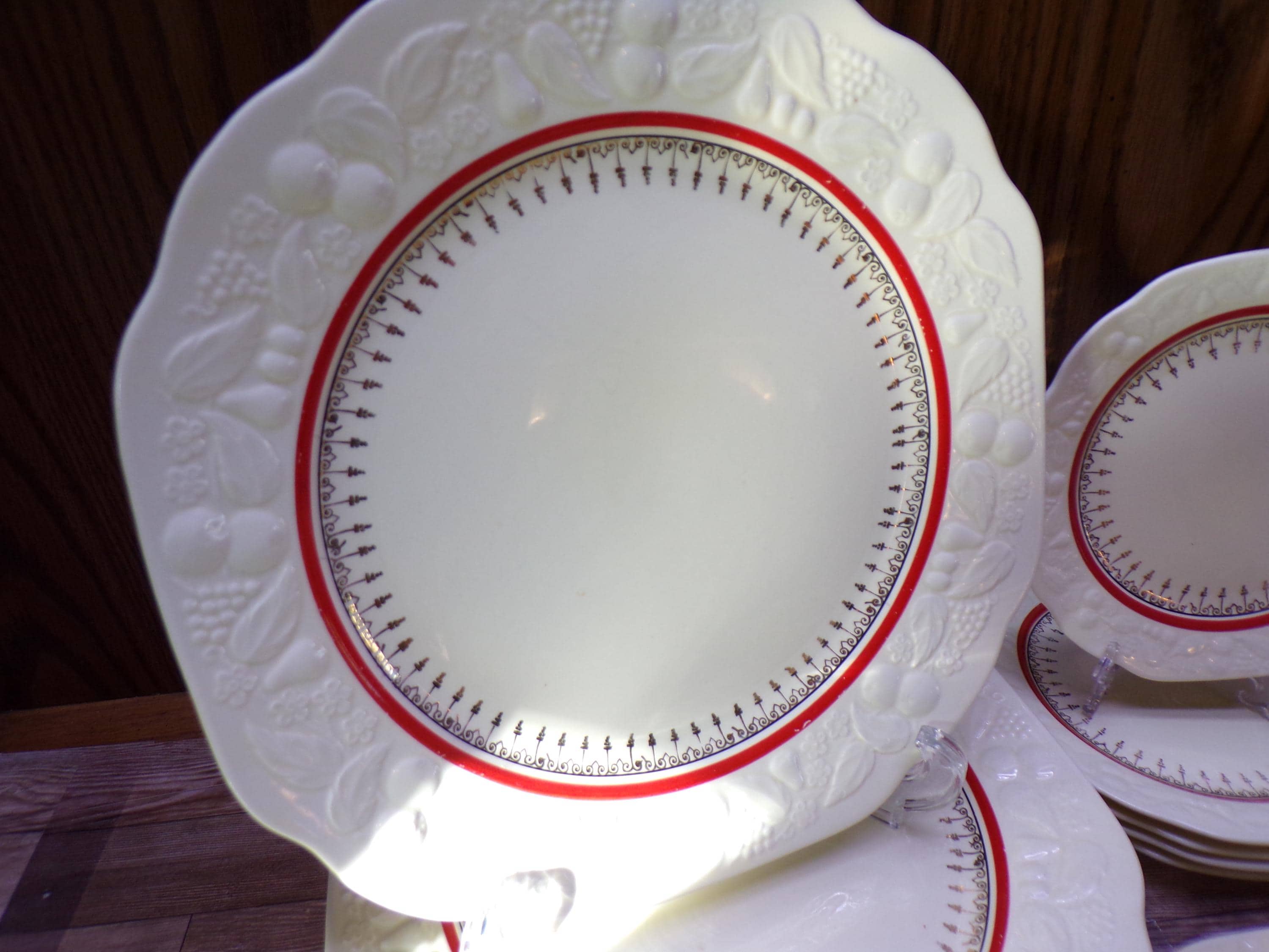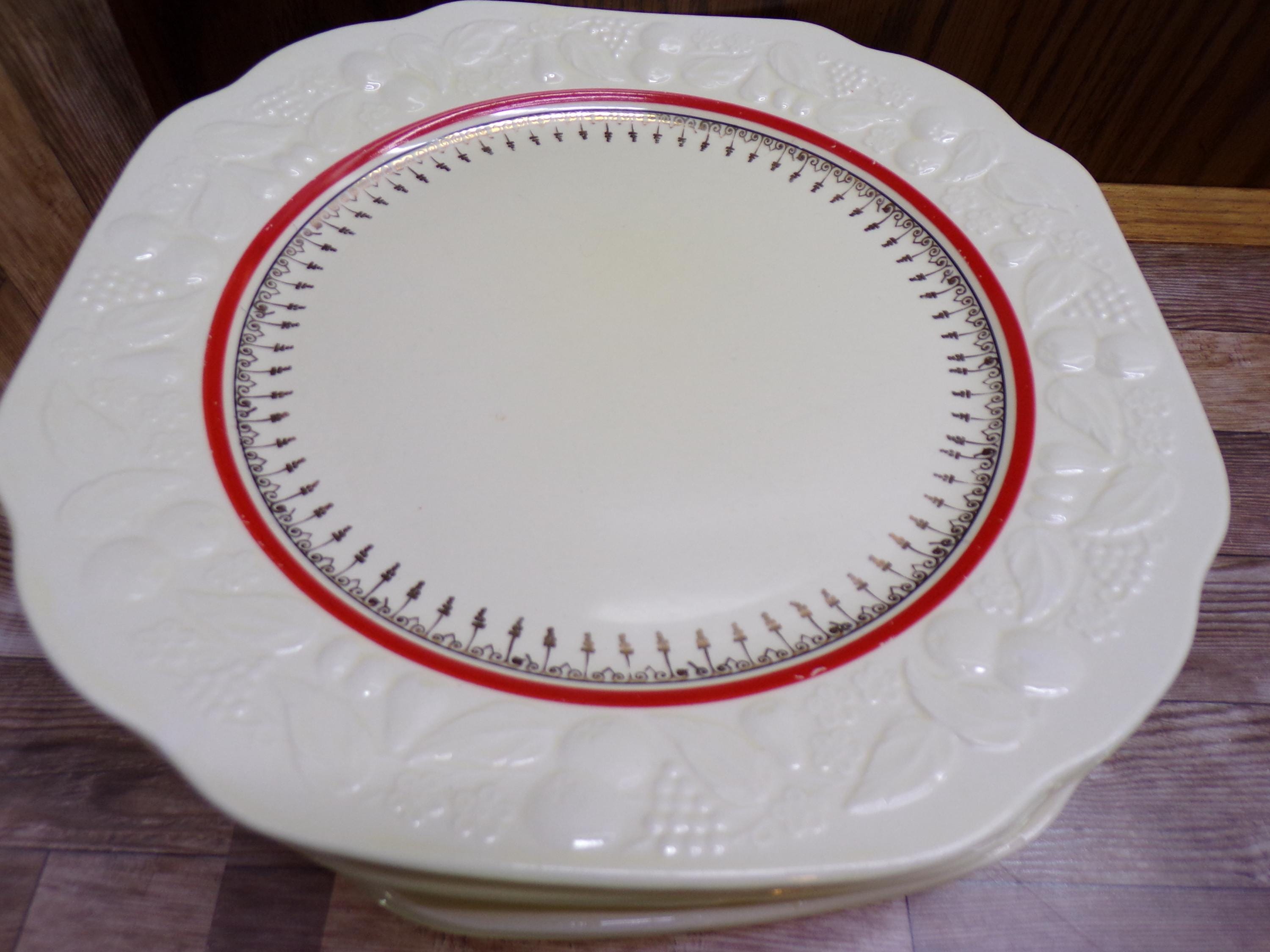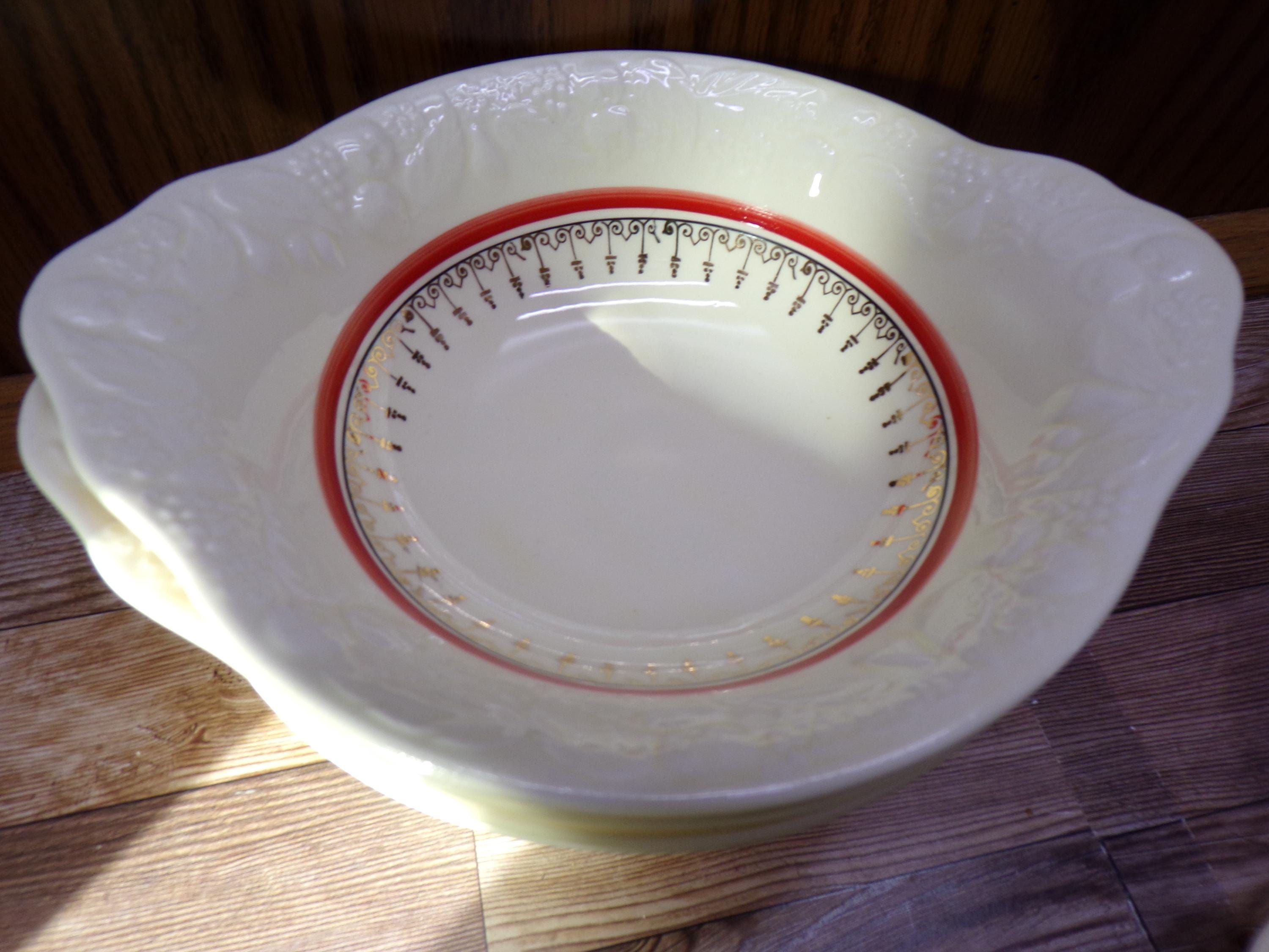 2511 Crocksville China #535 Vintage 1940's Dinnerware Yellow Cream with Fruit Border Red Band & Gold Accents Made in USA - Good Condition Some Wear