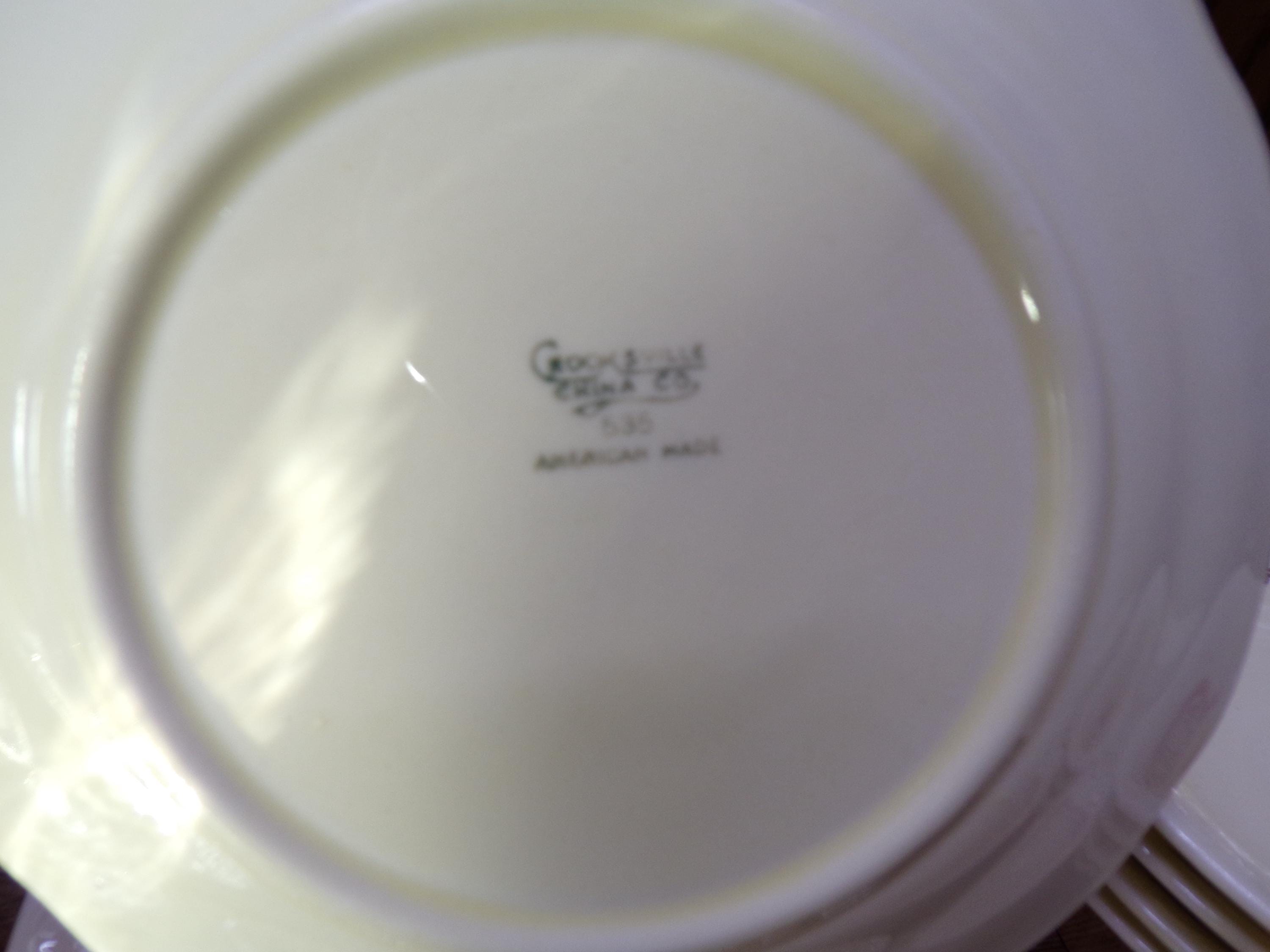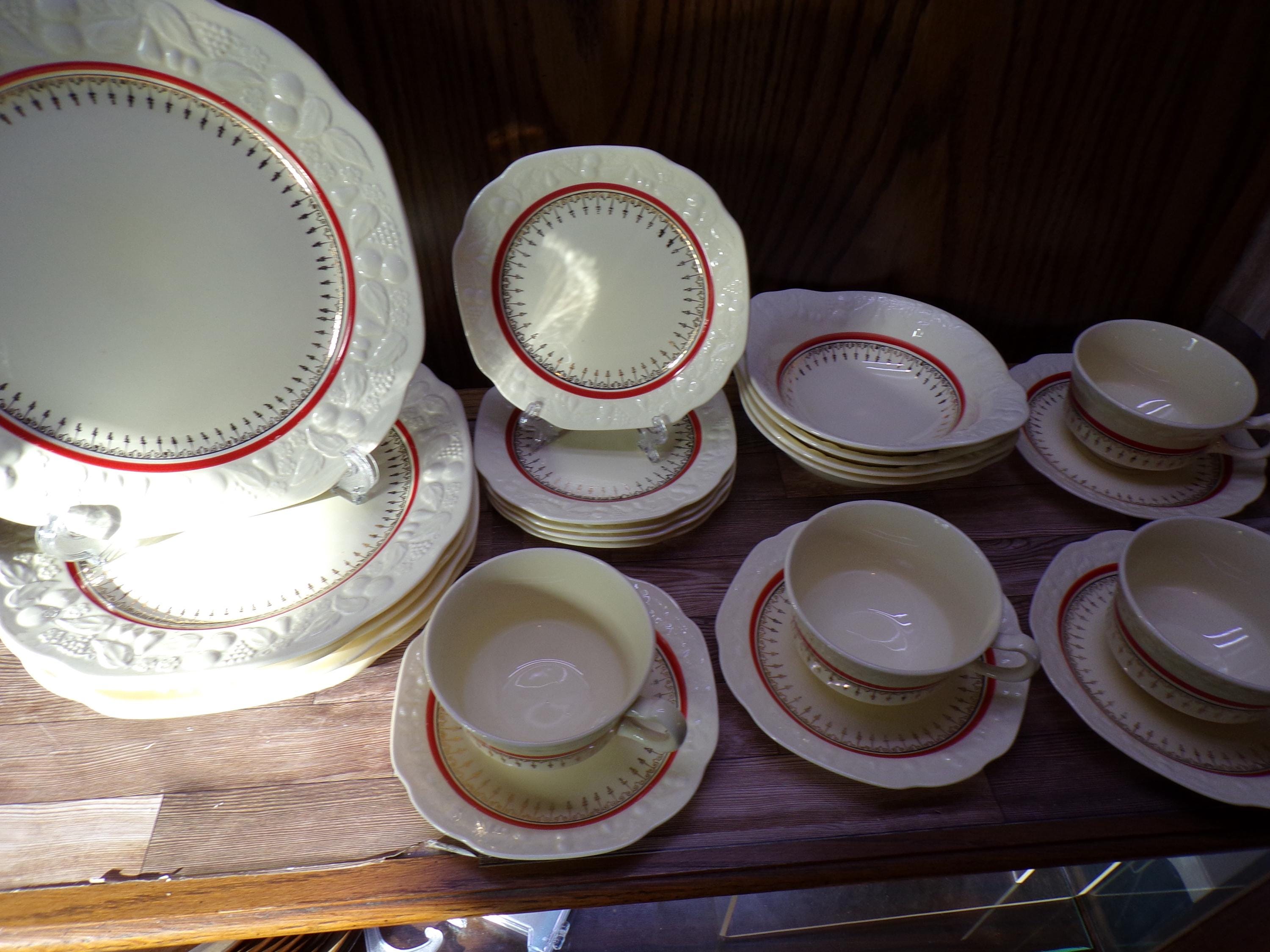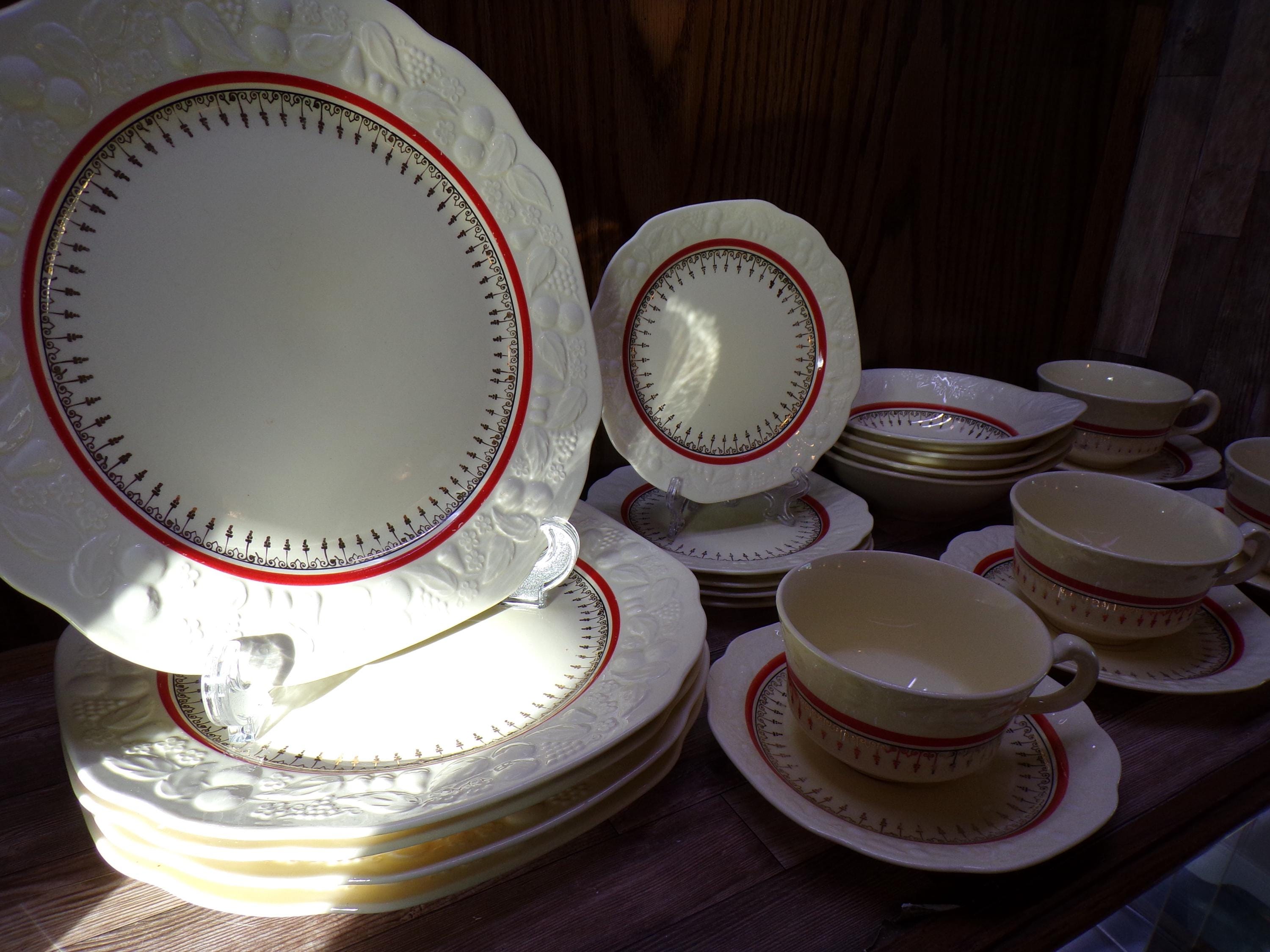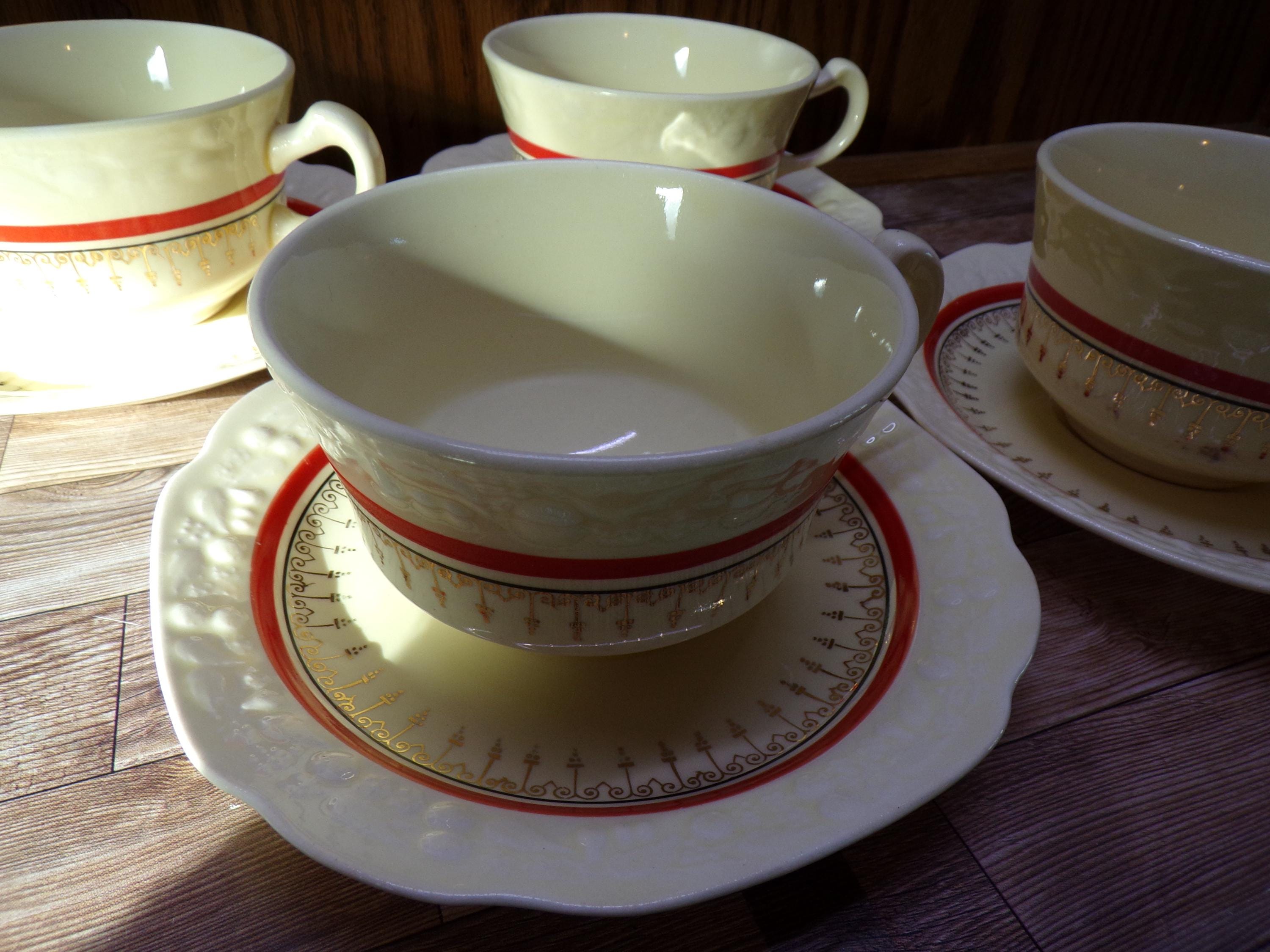 2511 Crocksville China #535 Vintage 1940's Dinnerware Yellow Cream with Fruit Border Red Band & Gold Accents Made in USA - Good Condition Some Wear