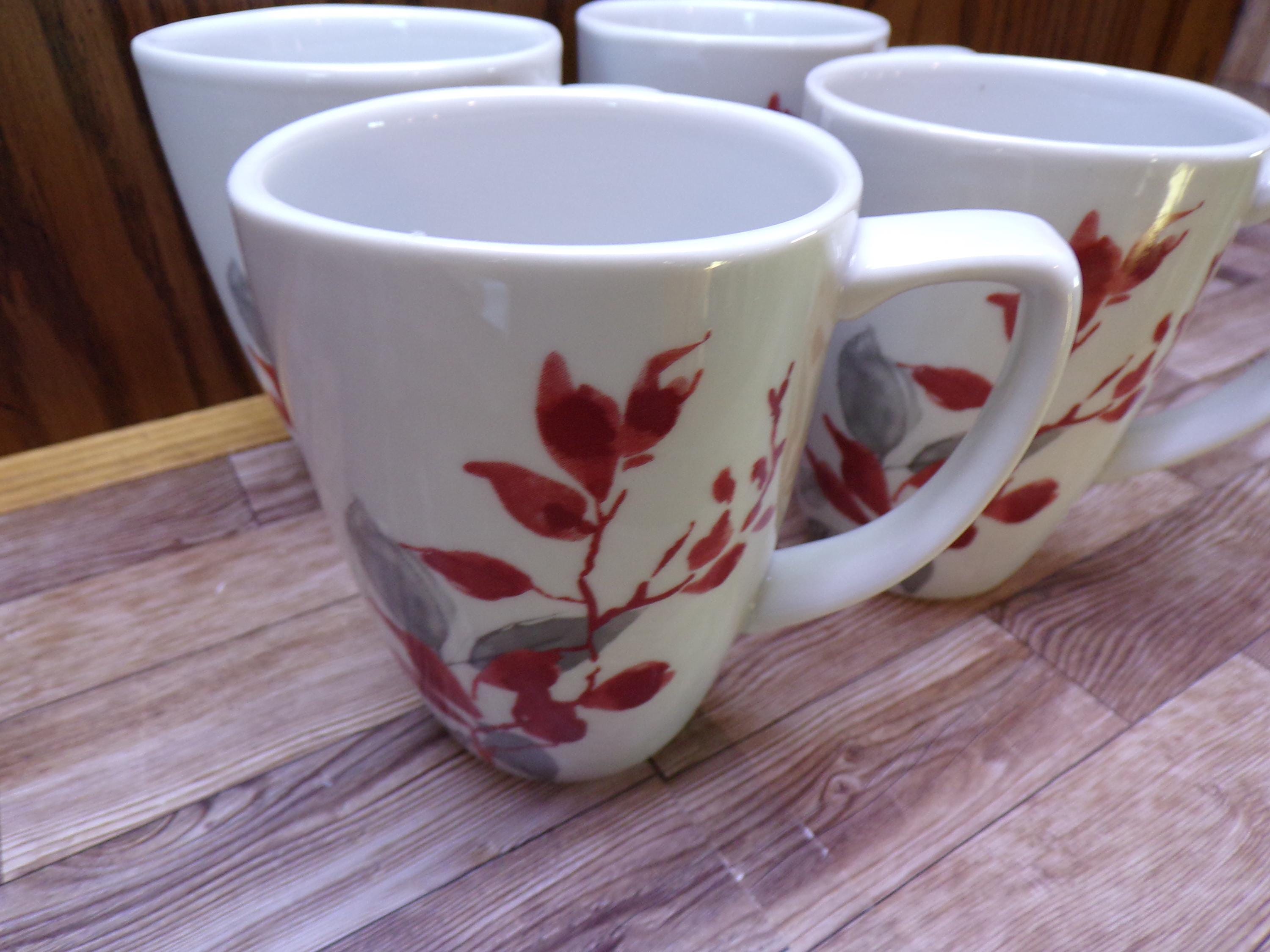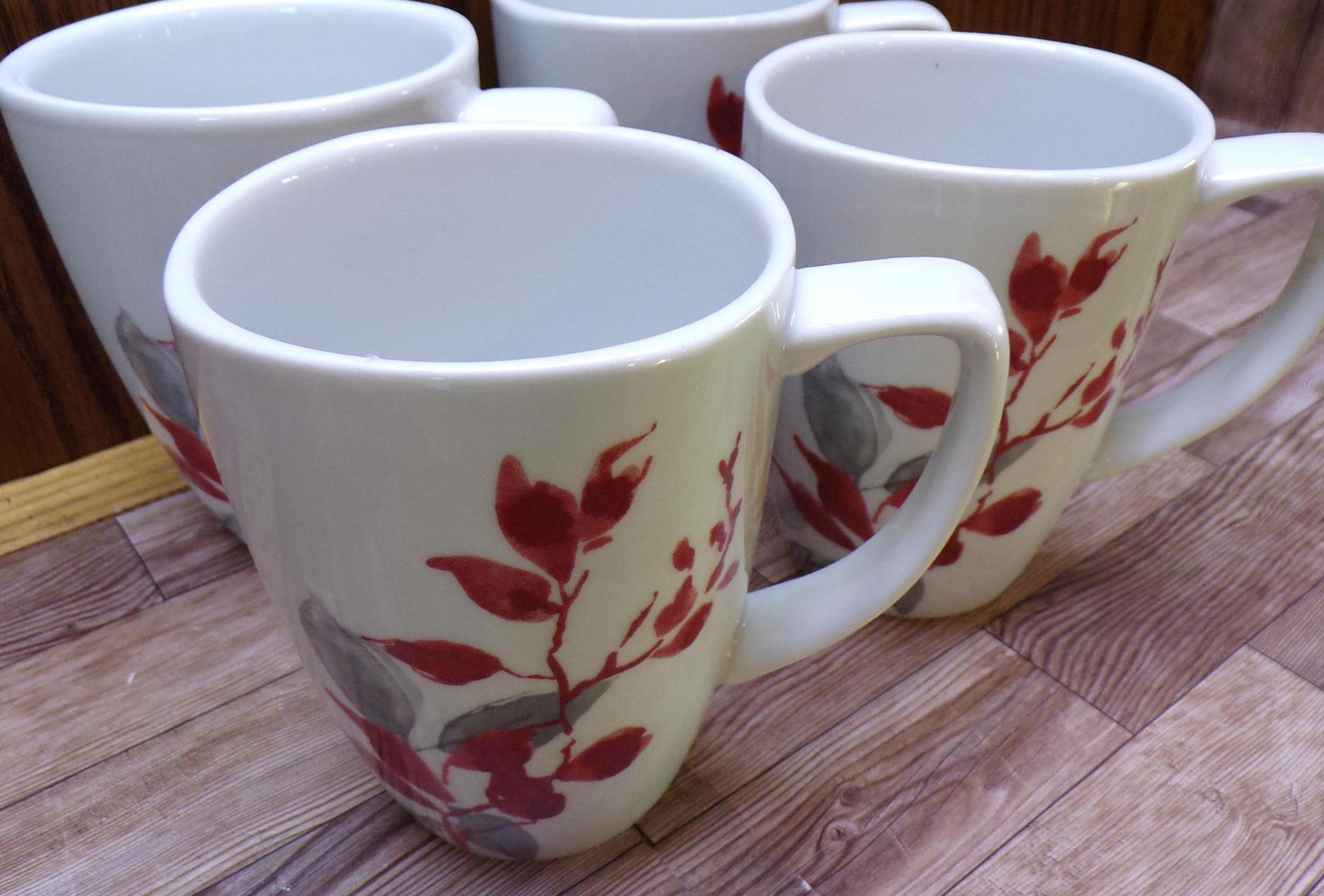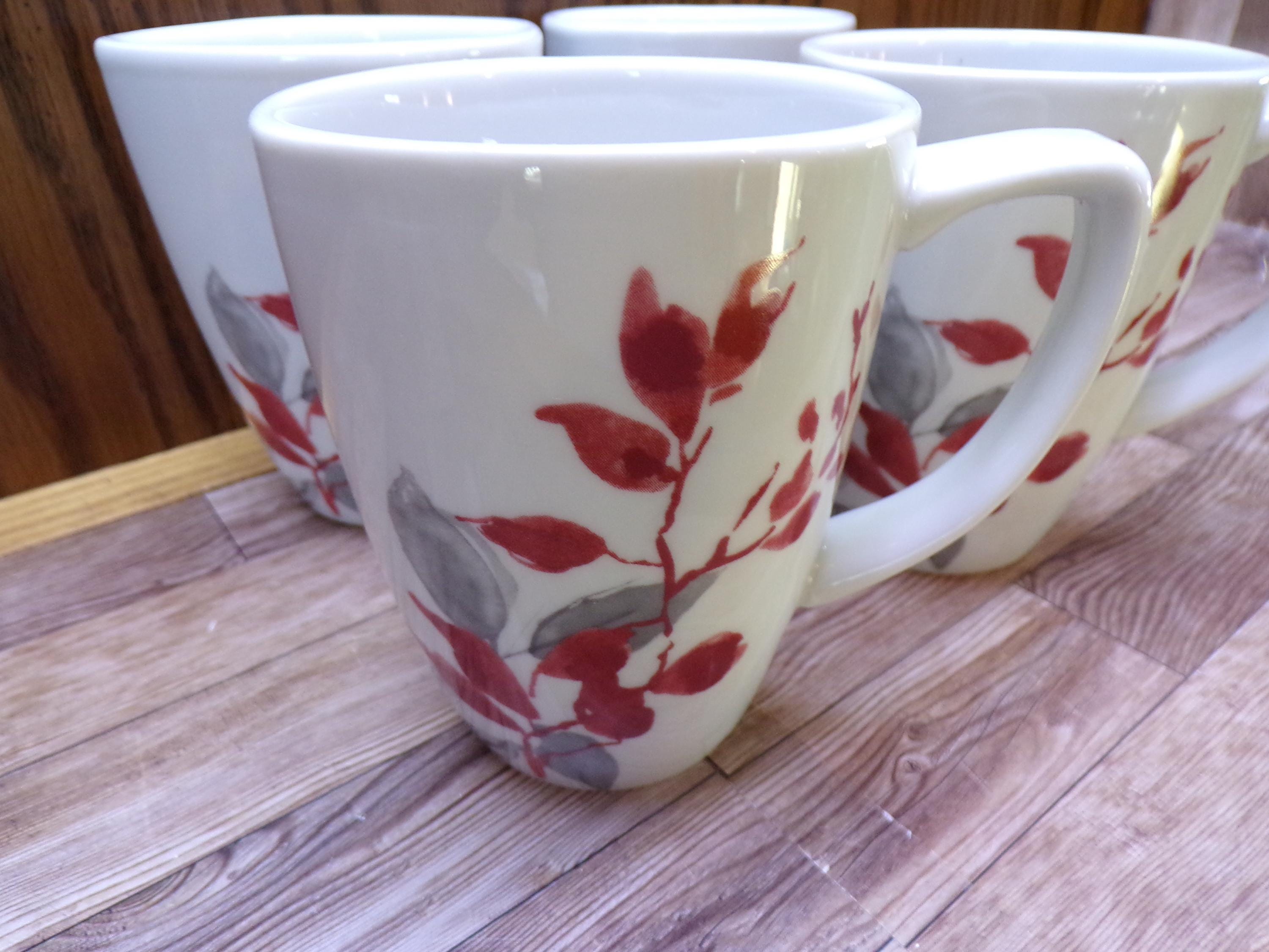 2511 Corelle Coordinates Kyoto Leaves Red & Gray 12 oz Porcelain Square Rim Coffee Mug Cup 4" Set of 4 - Great Condition