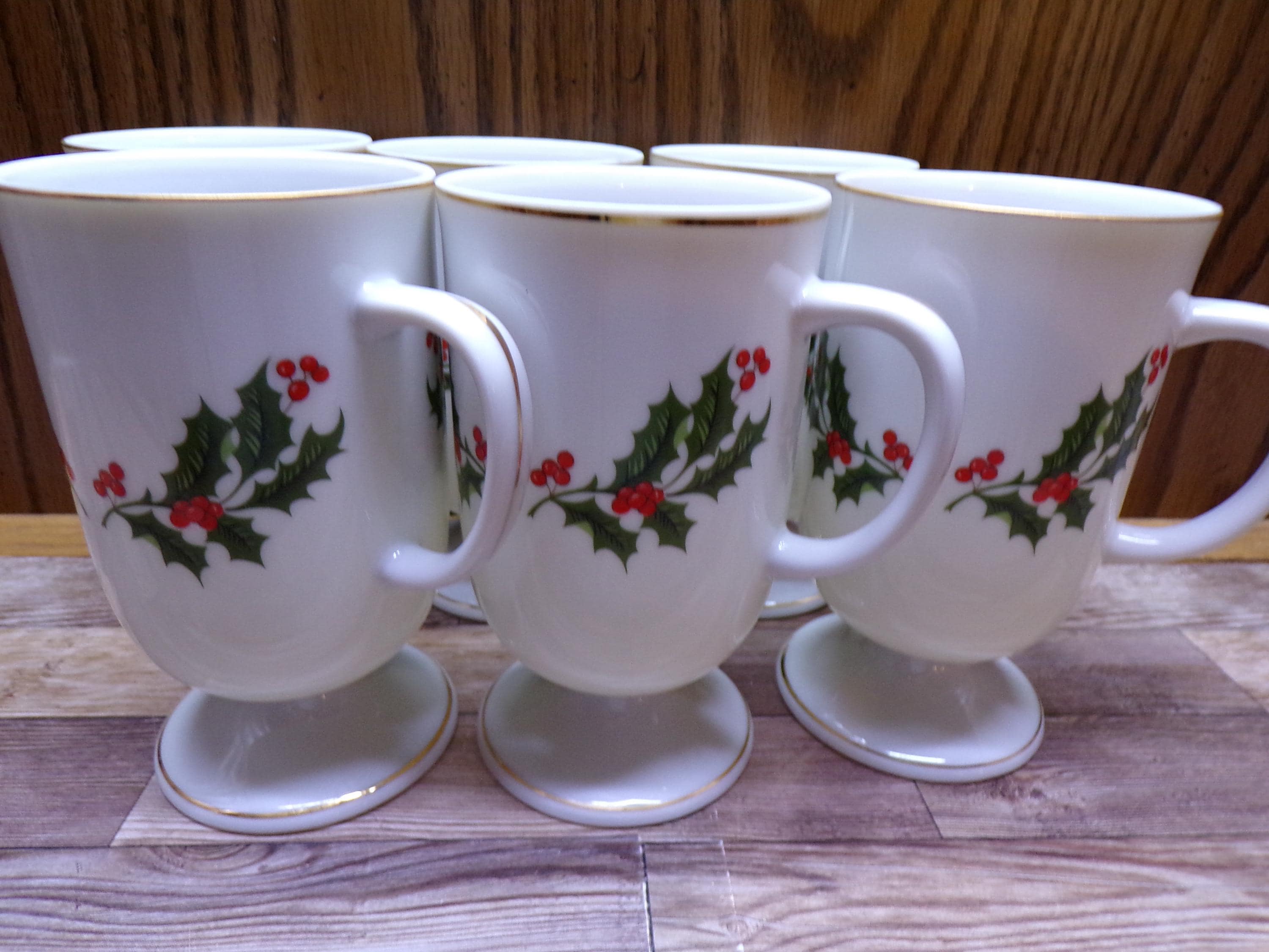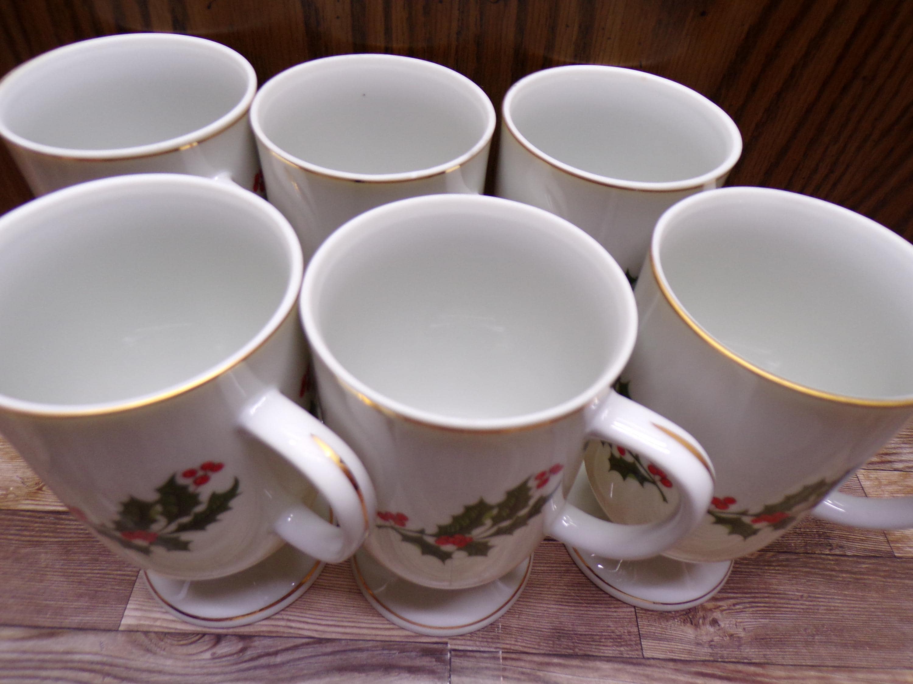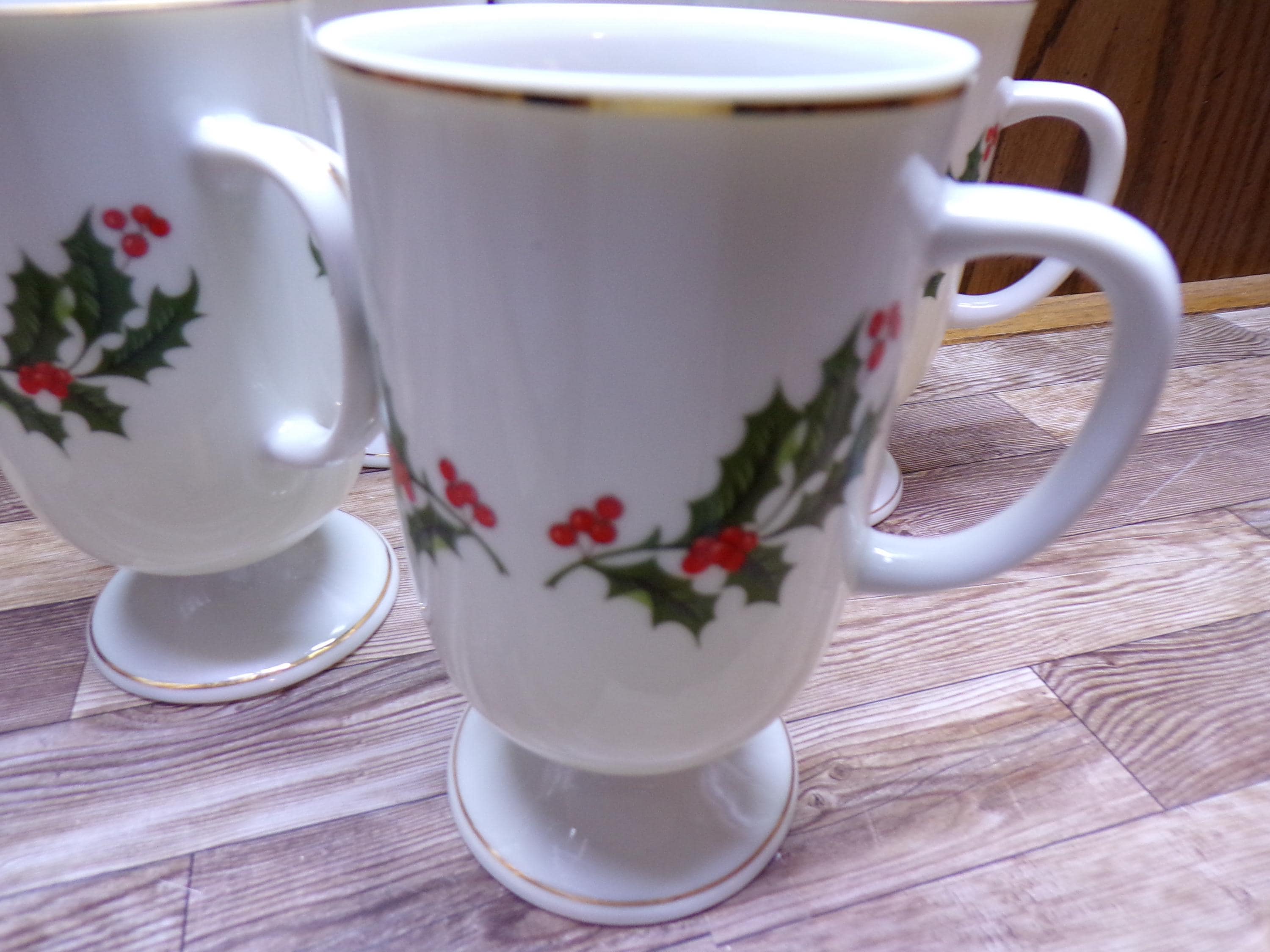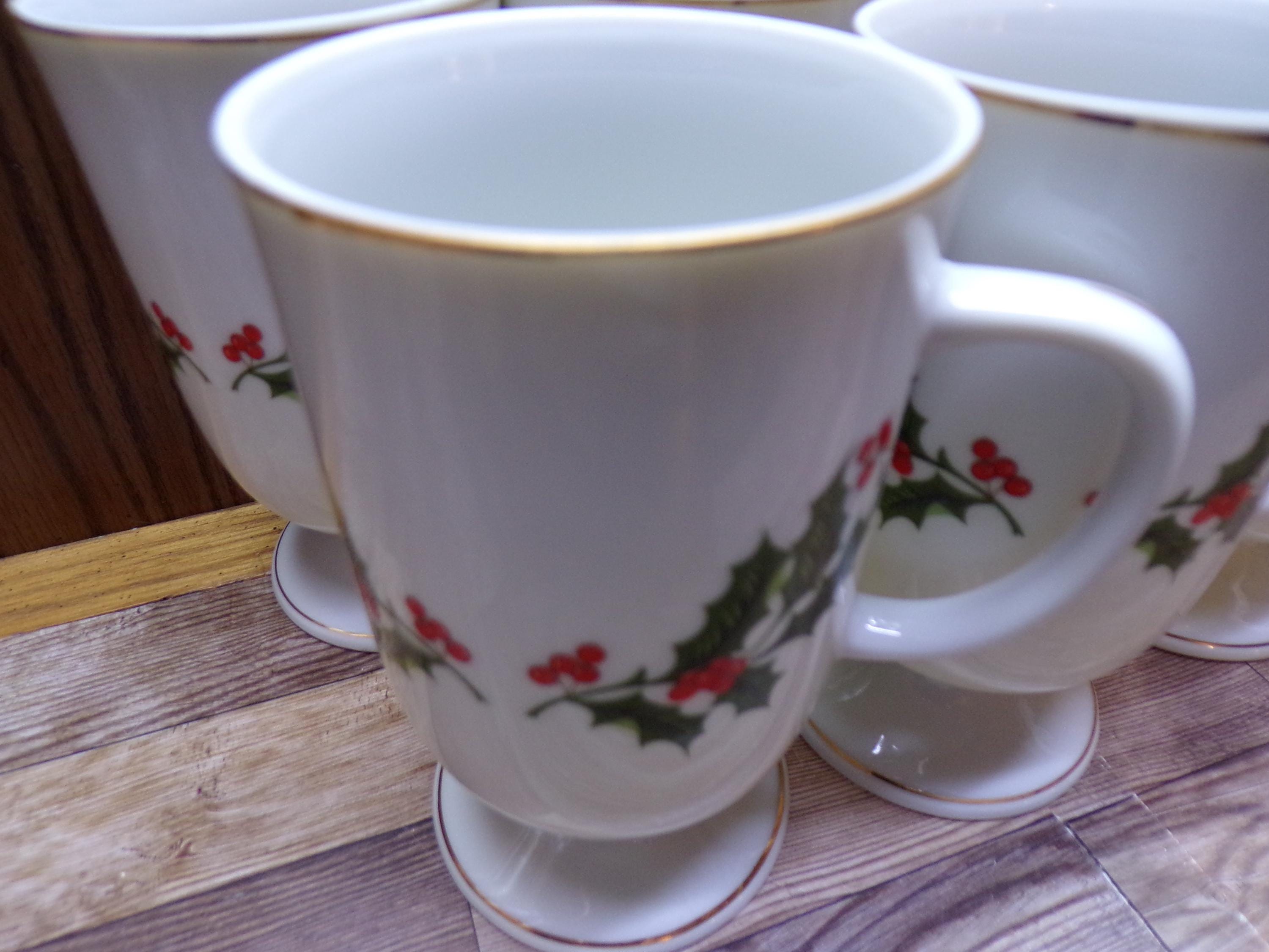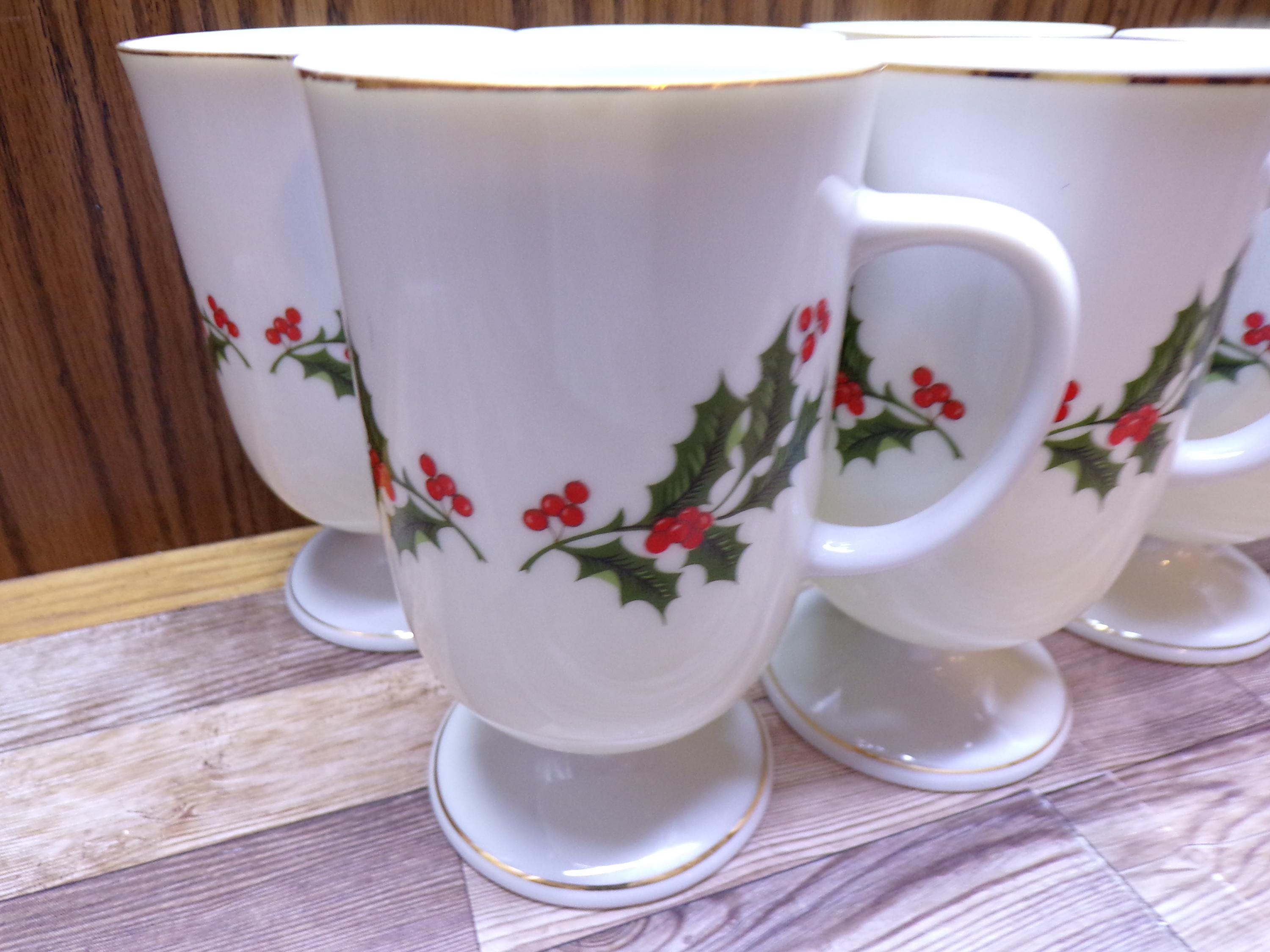 2511 Kashima Christmas Holly Fine Porcelain 5" 9 oz Vintage Footed Irish Coffee Mugs Set of 6 - Great Condition