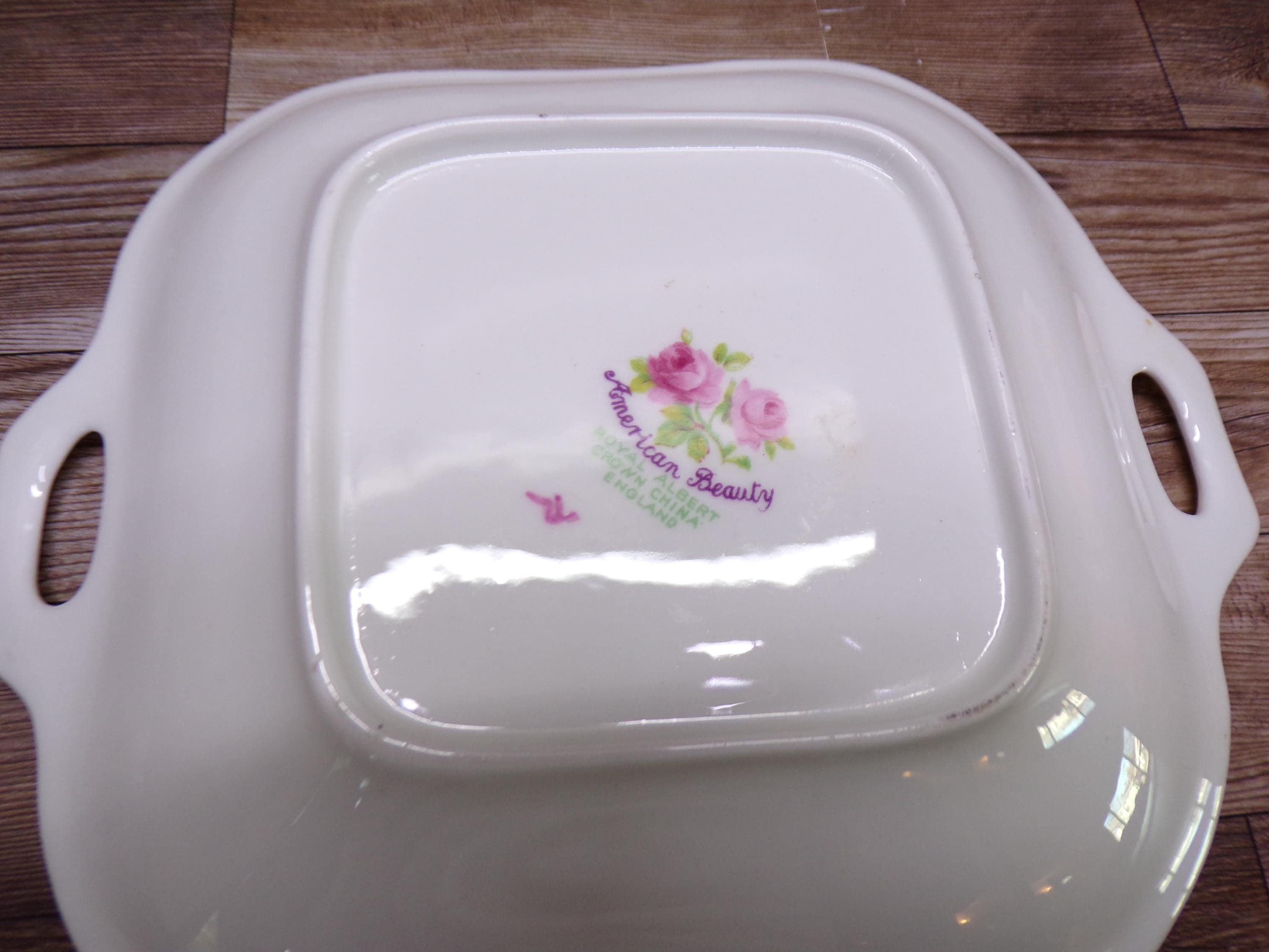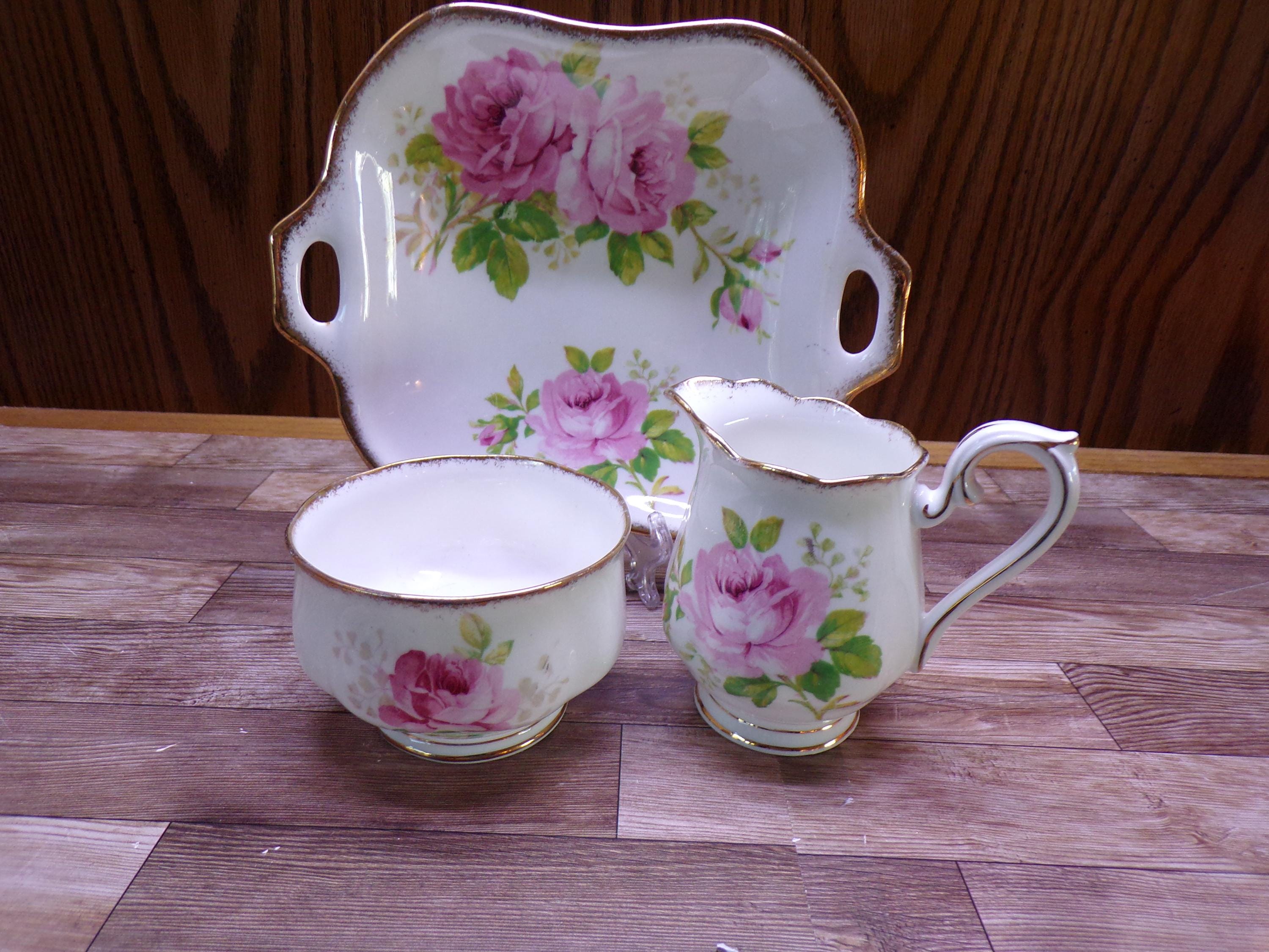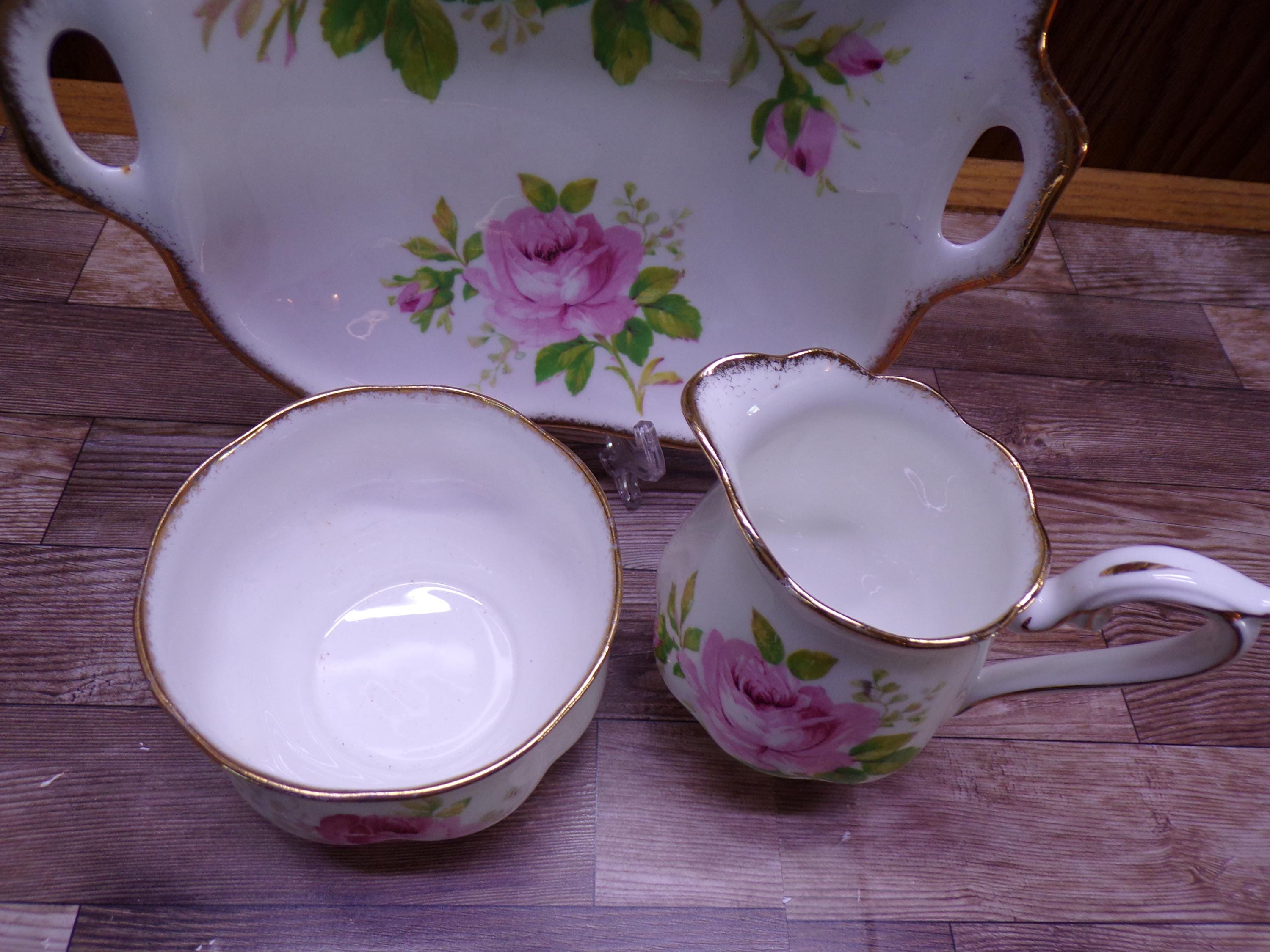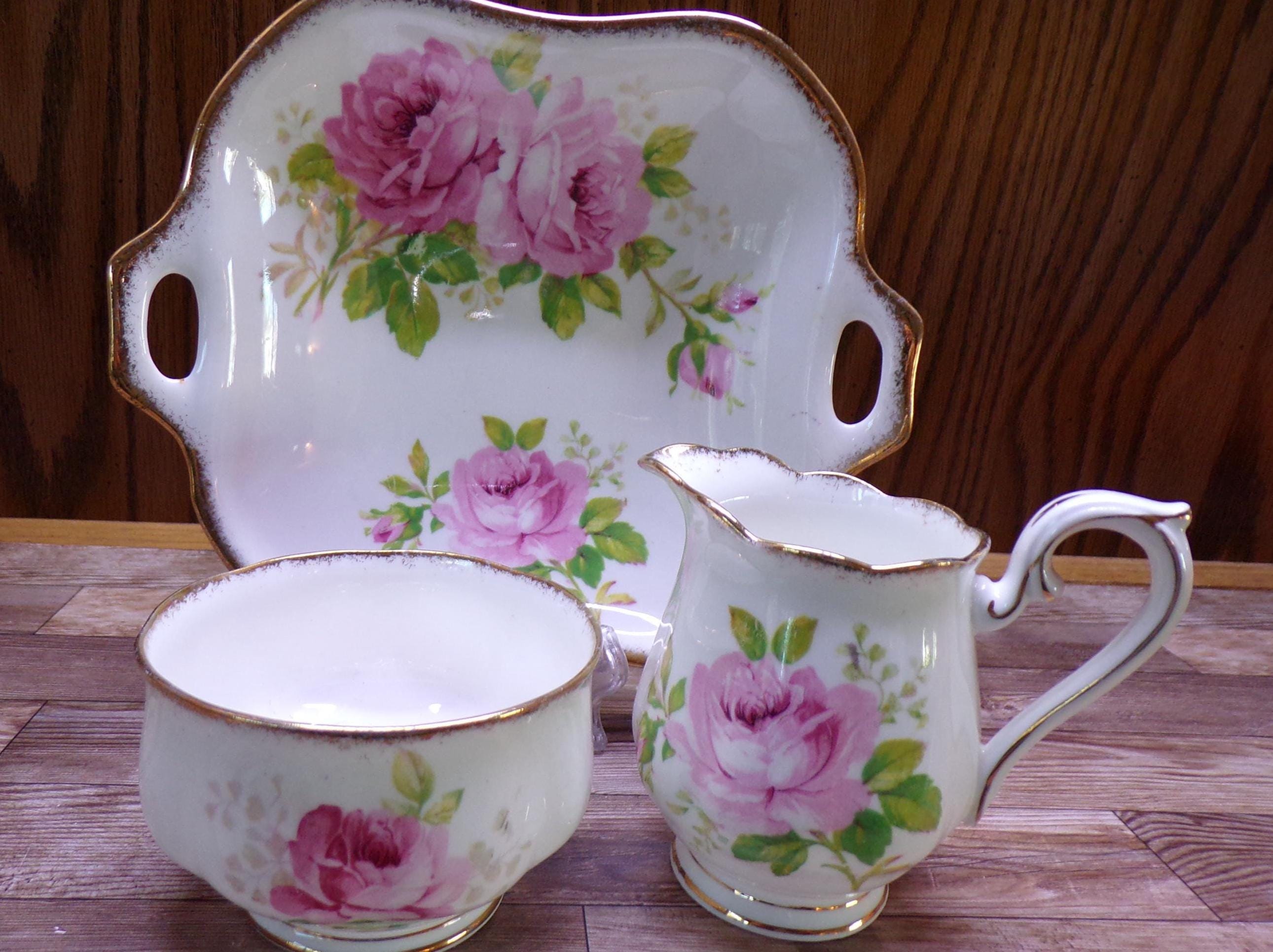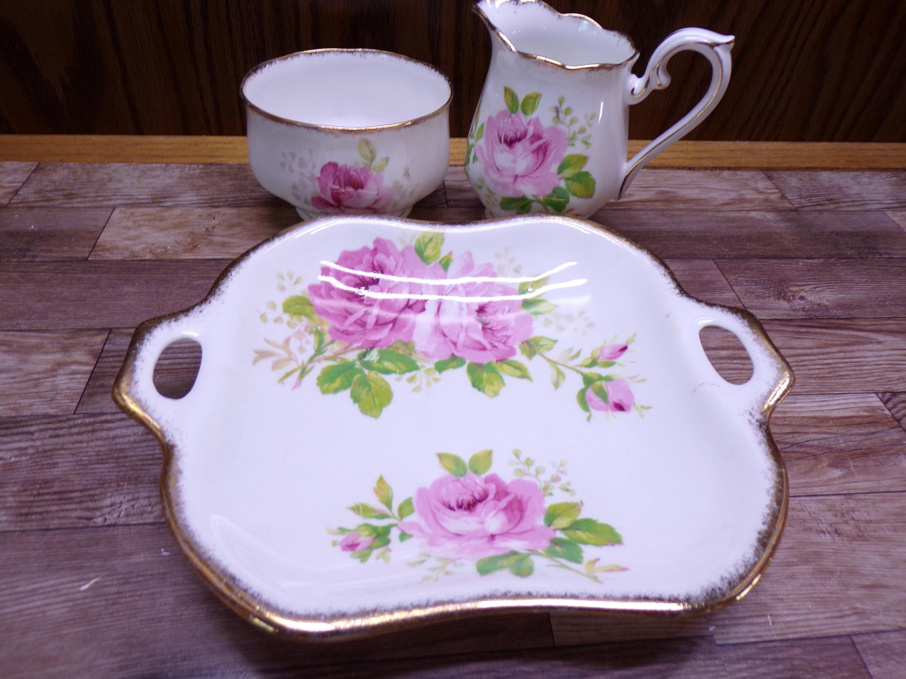 2511 Royal Albert American Beauty Crown China Vintage 3 pc Set Cream, Sugar & 6" Tray Made in England - Great Condition