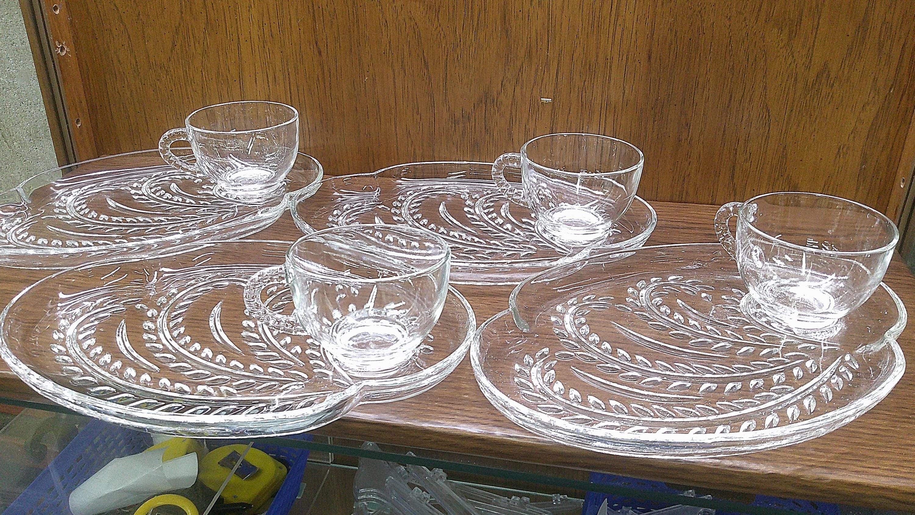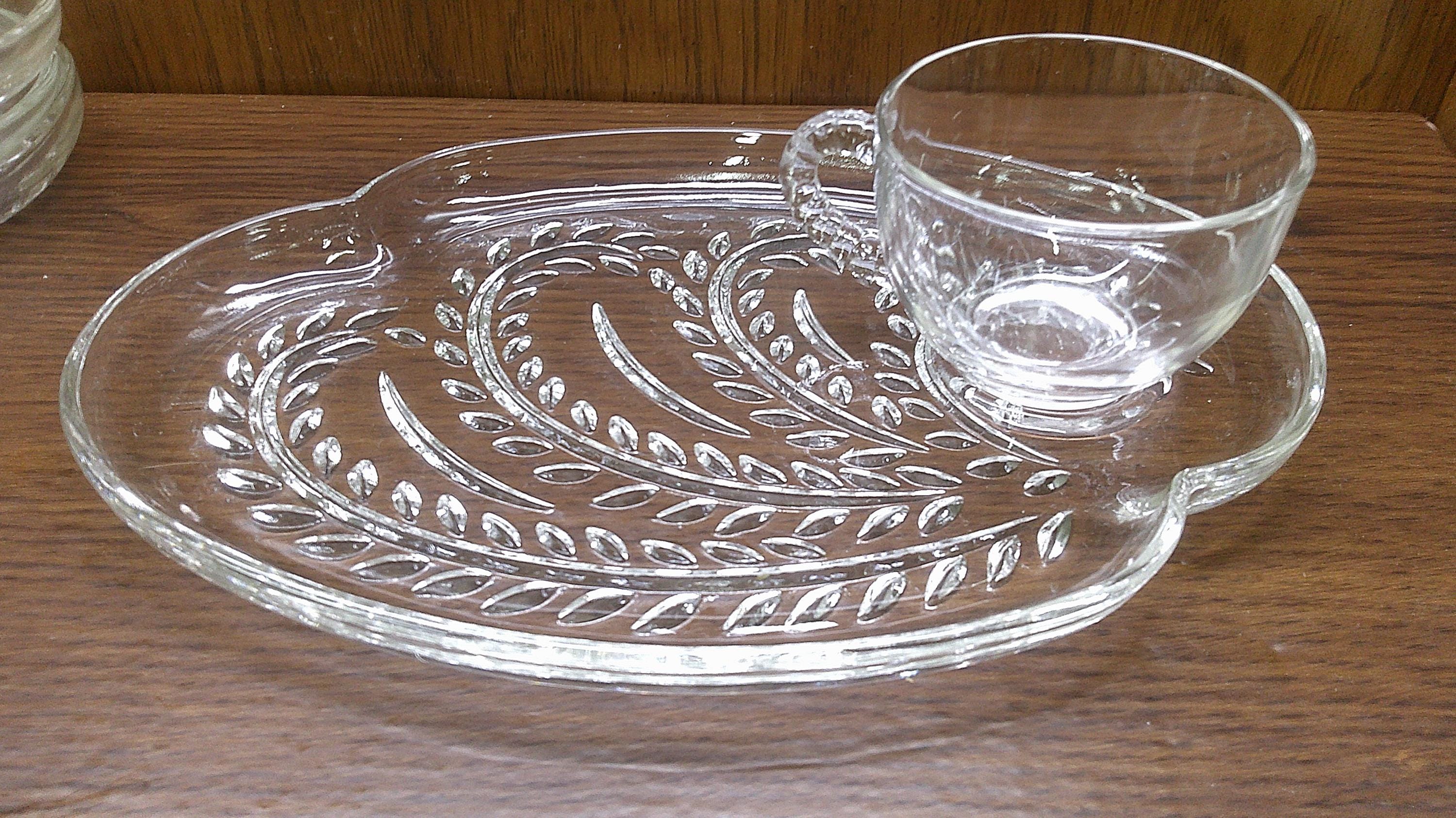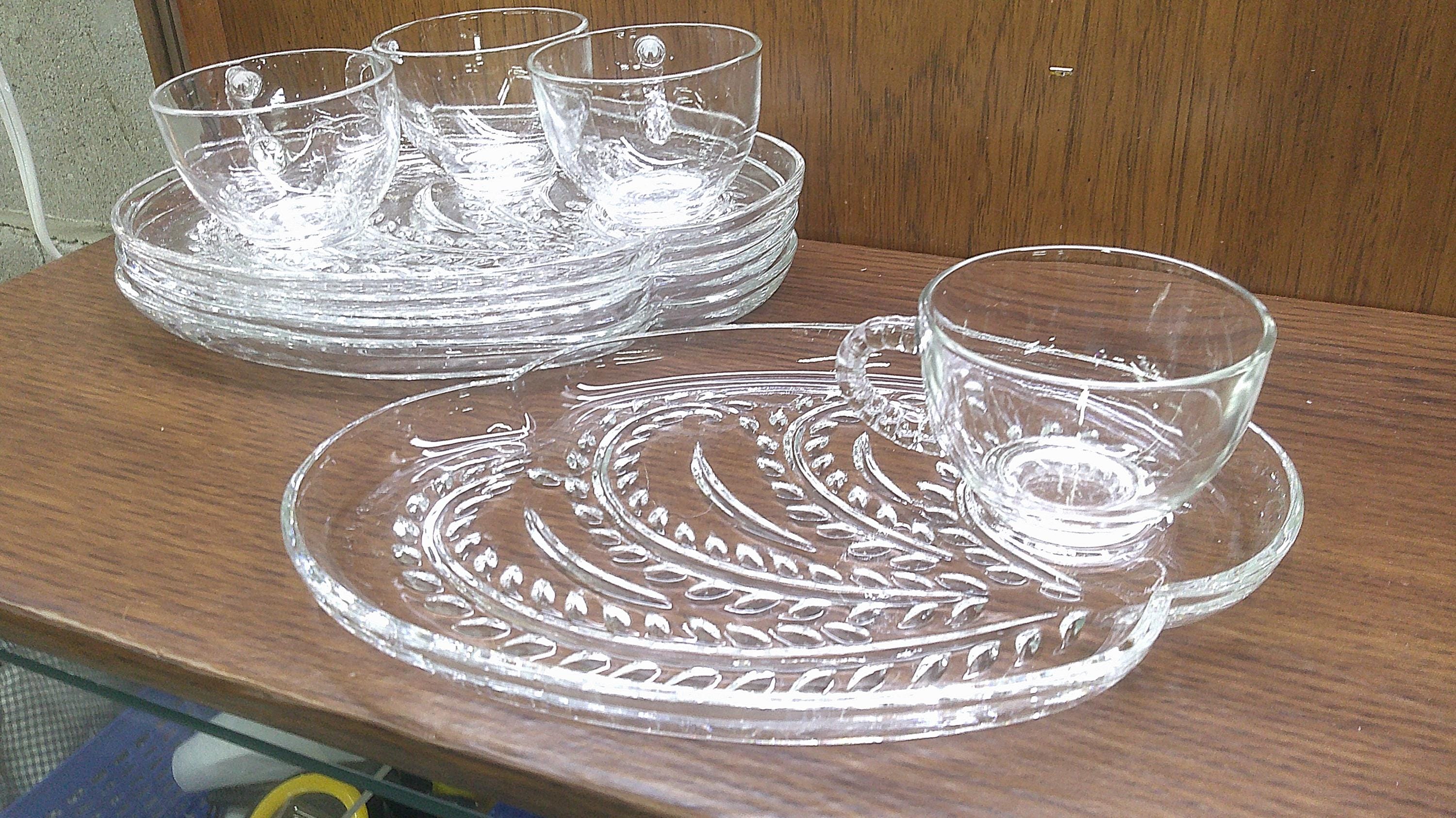 2511 Federal Glass Hospitality 8 pc Glass Snack Tray Set Vintage 1950's Homestead Wheat A-16 (4) Plates & (4) Cups - Great Condition