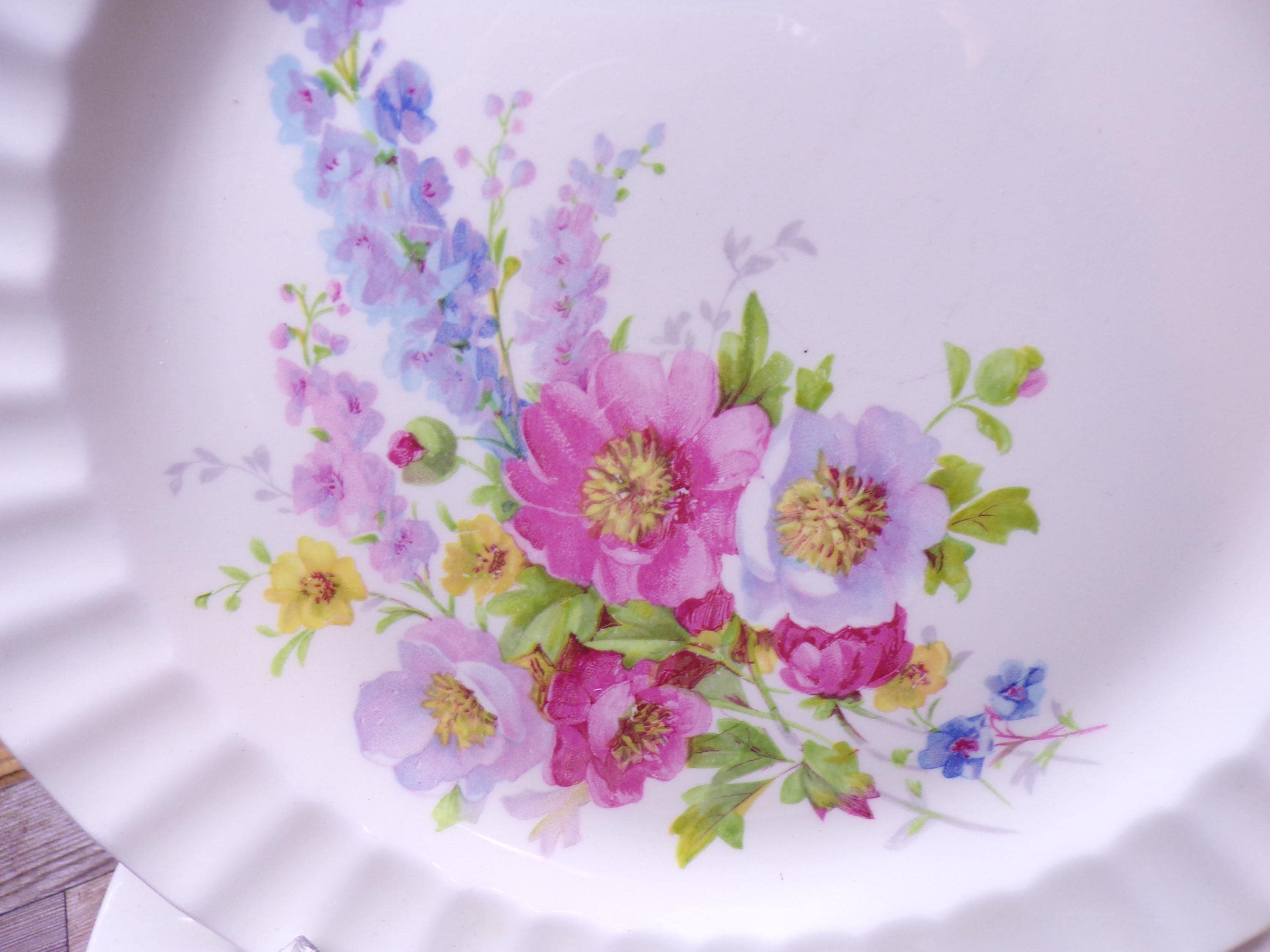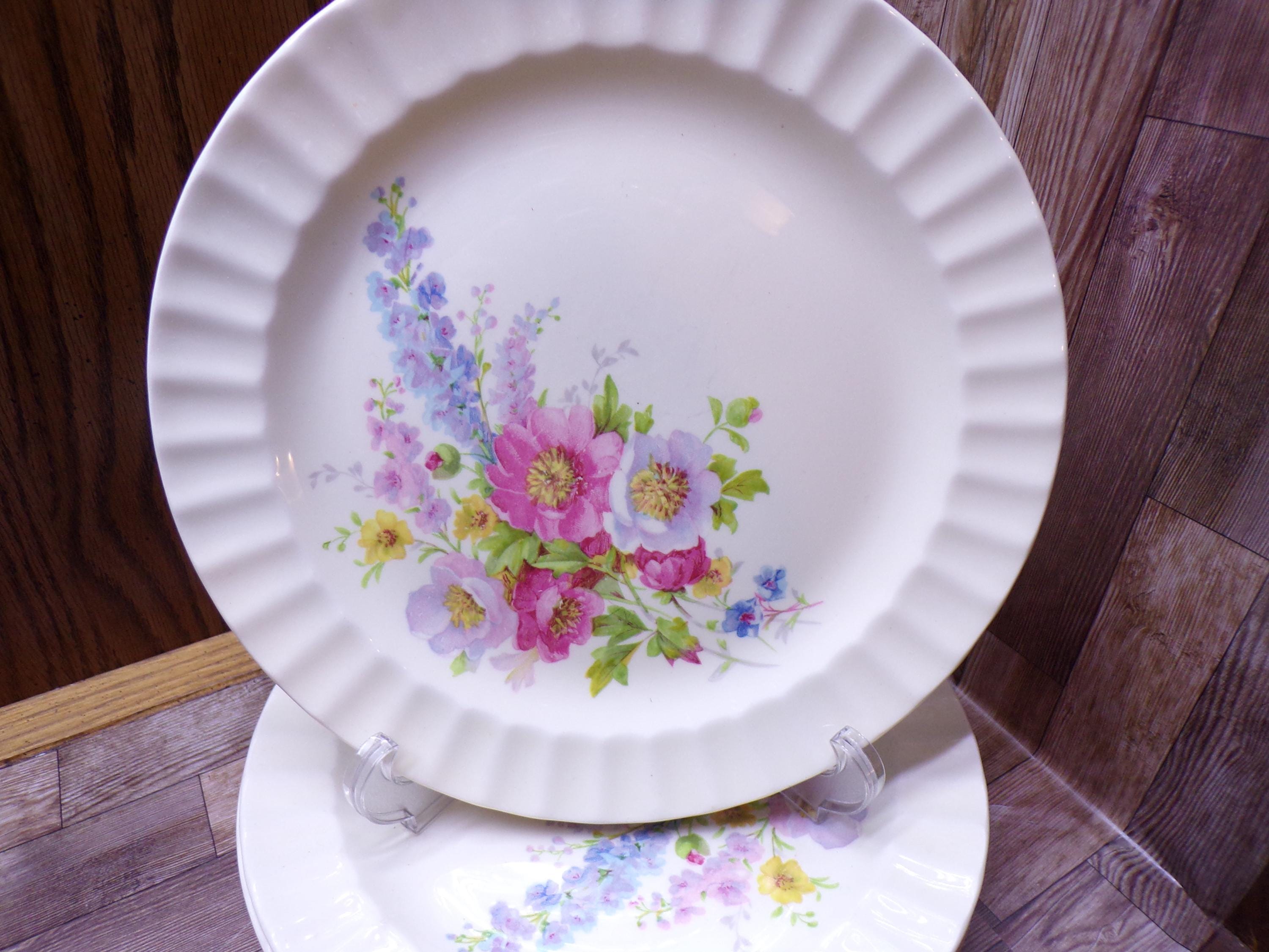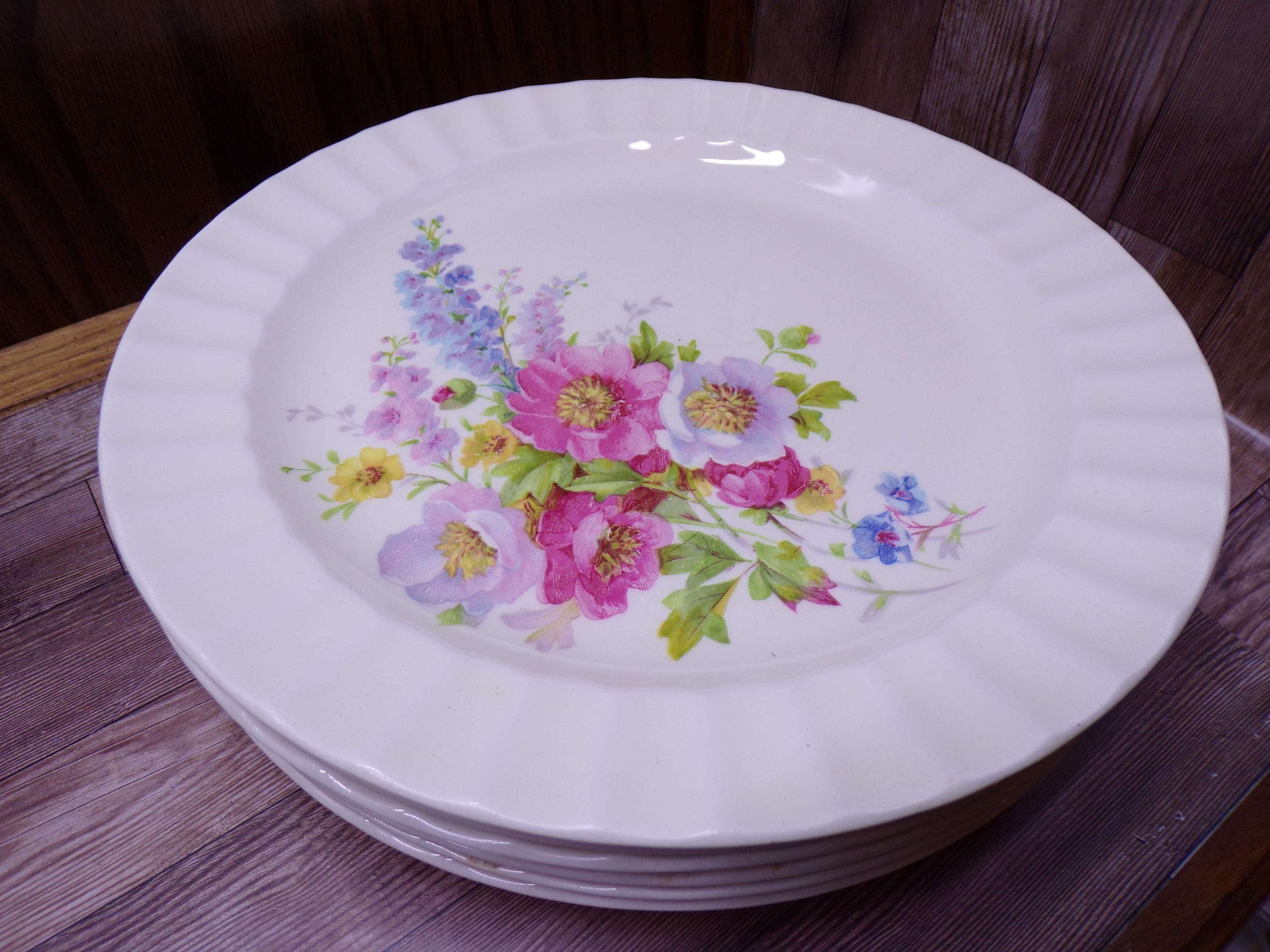 2511 Edwin Knowles China Co. 38-10 Spring Bouquet 9.25" Semi-vitreous Vintage 1940's Fluted Lunch / Snack Plates Set of 6 Dinnerware Made in the USA - Great Condition