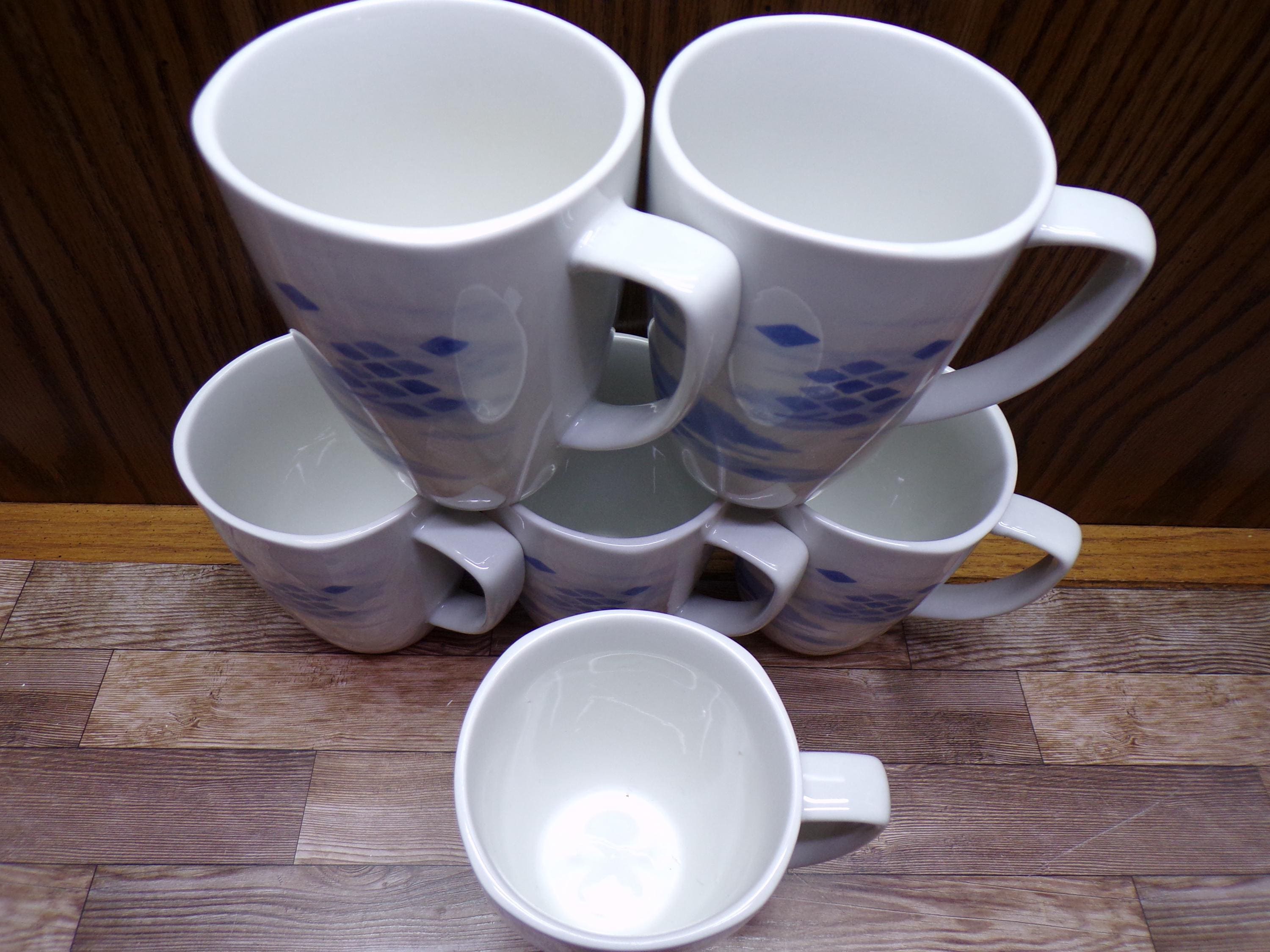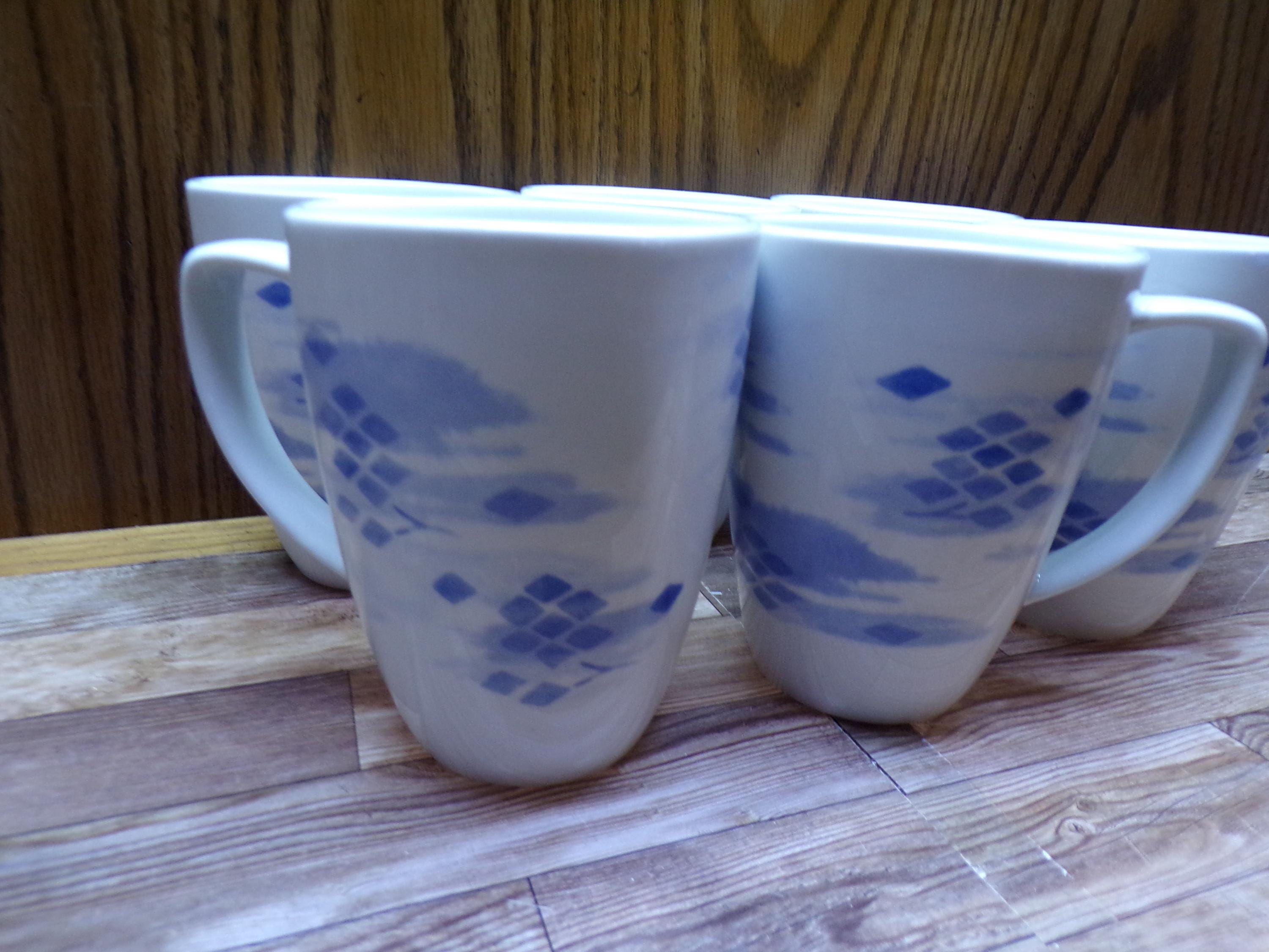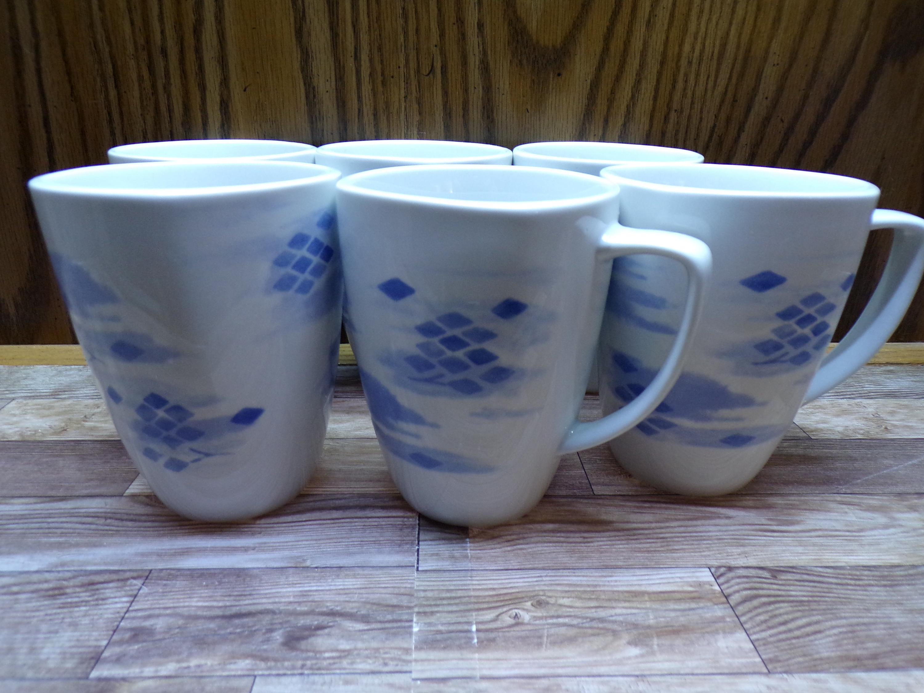 2511 Corelle Coordinates Blue Diamonds Vintage 4" 12 oz Porcelain Square Rim Coffee Mug Set of 6 - Great Condition