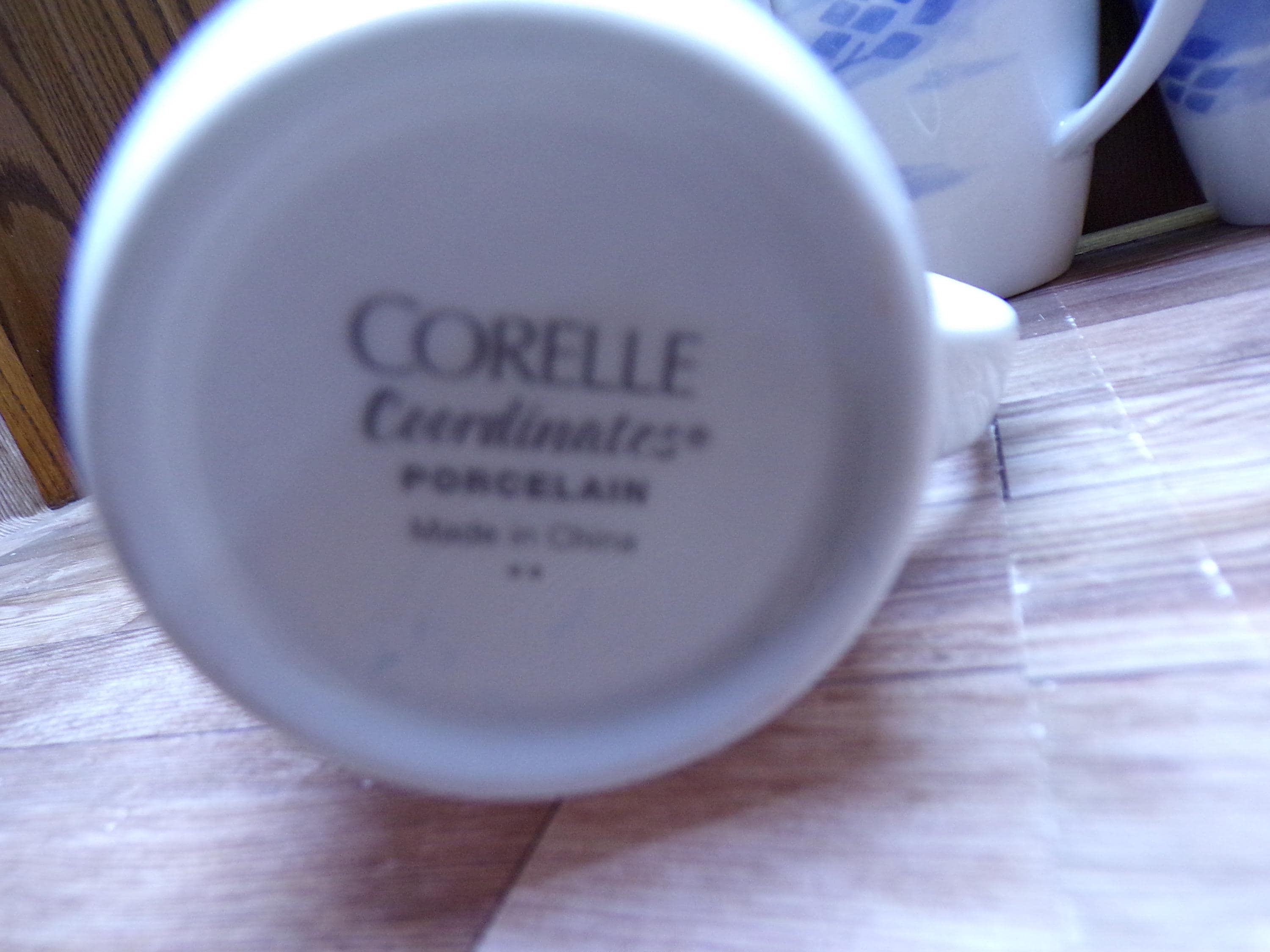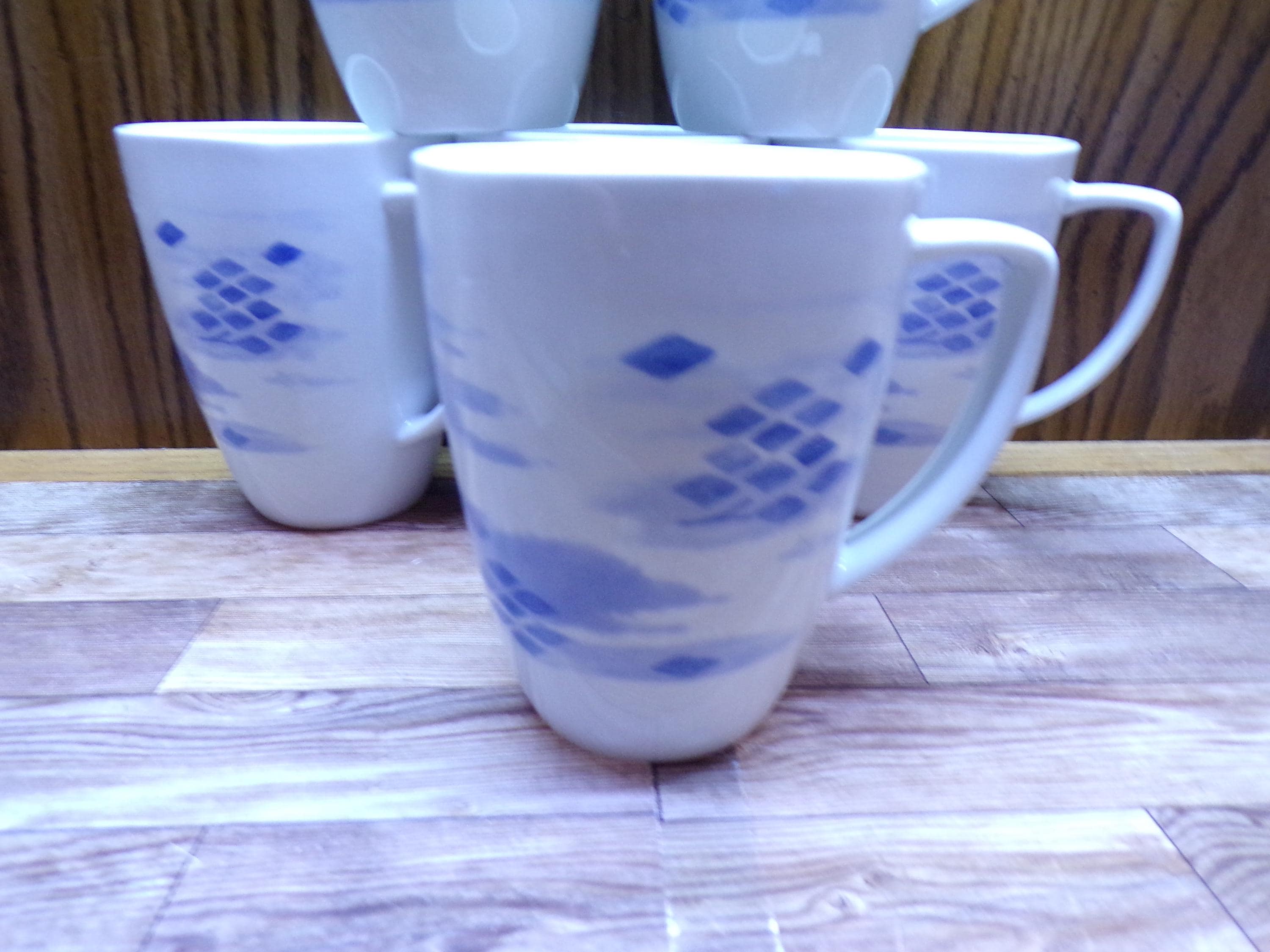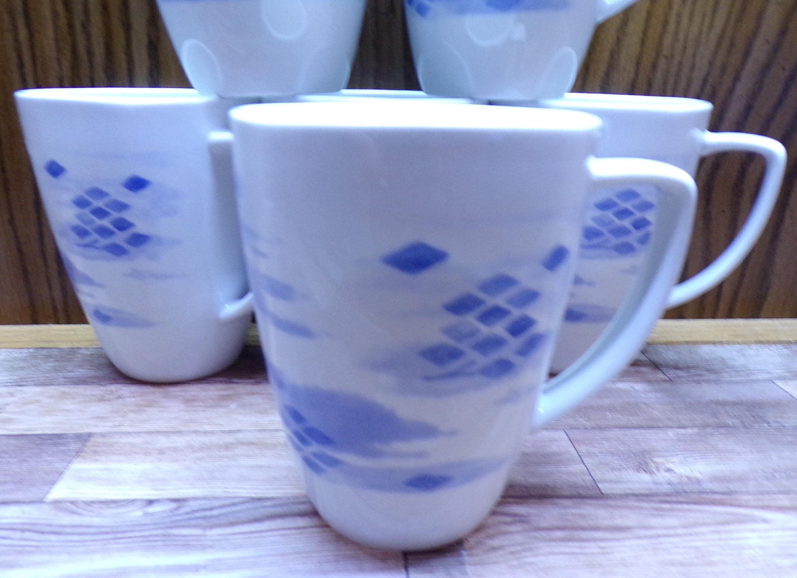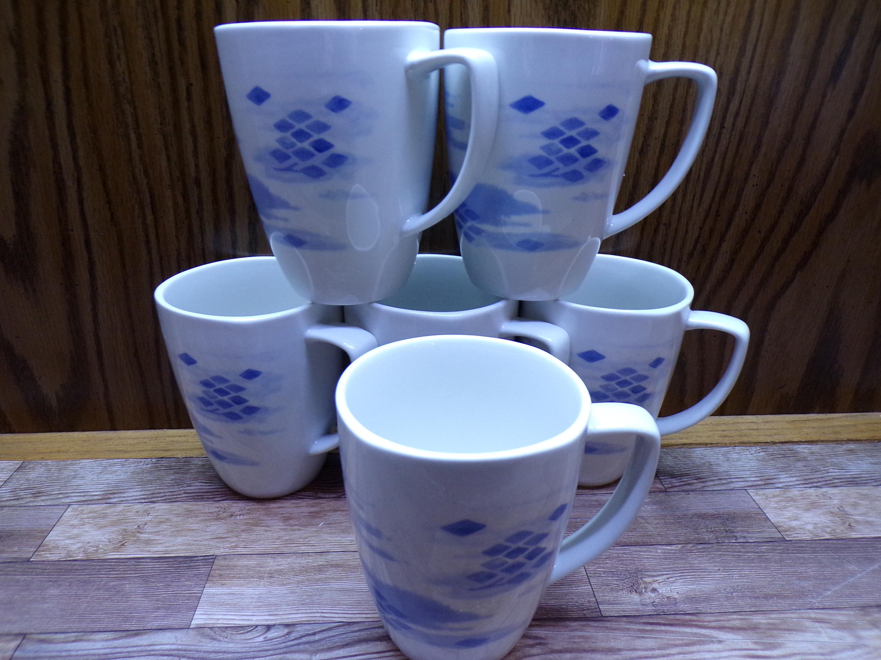 2511 Corelle Coordinates Blue Diamonds Vintage 4" 12 oz Porcelain Square Rim Coffee Mug Set of 6 - Great Condition