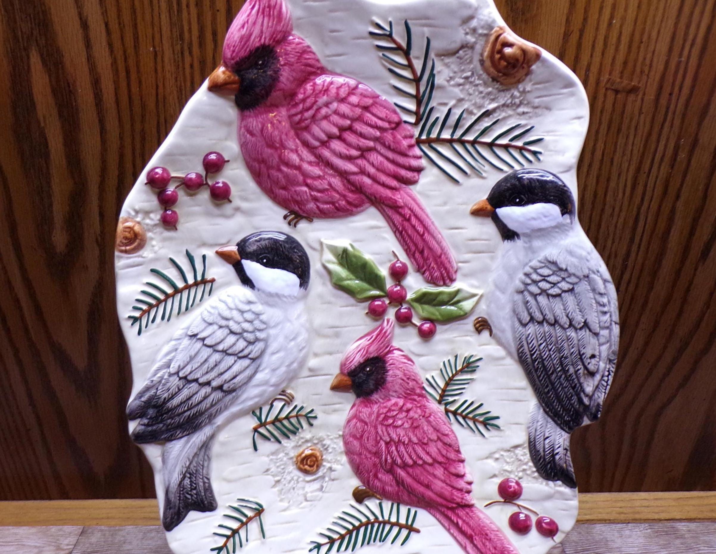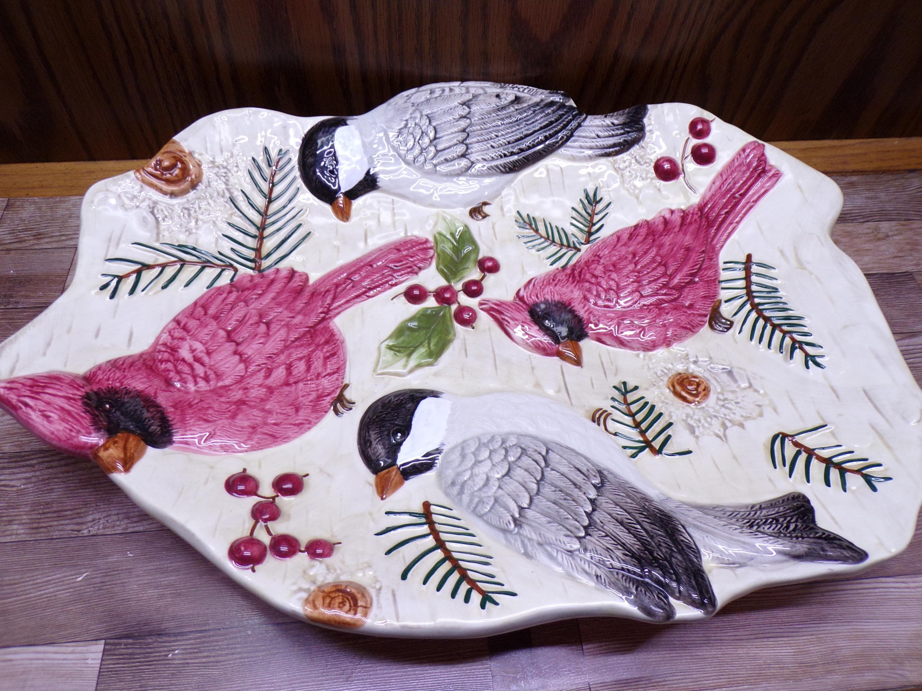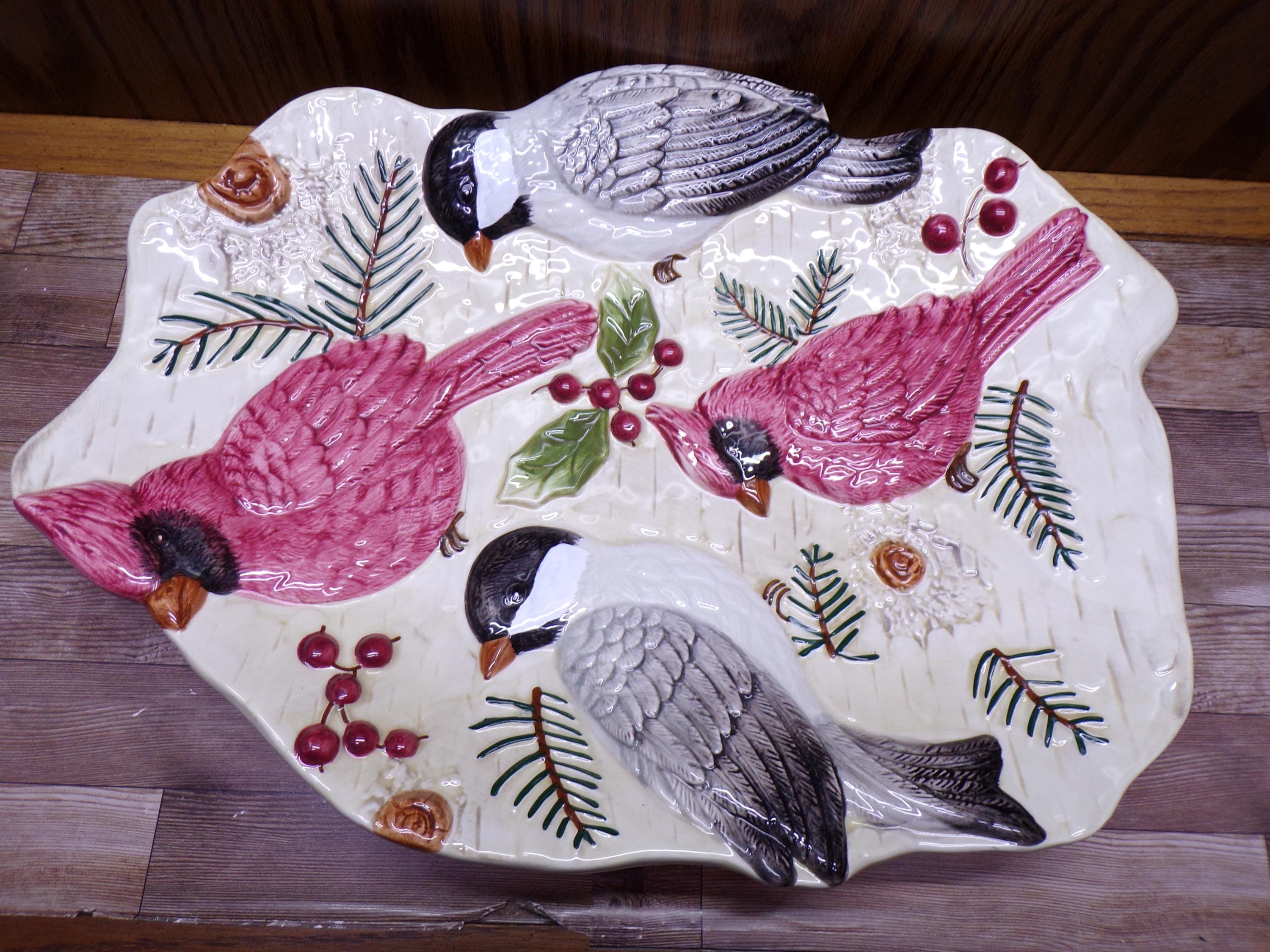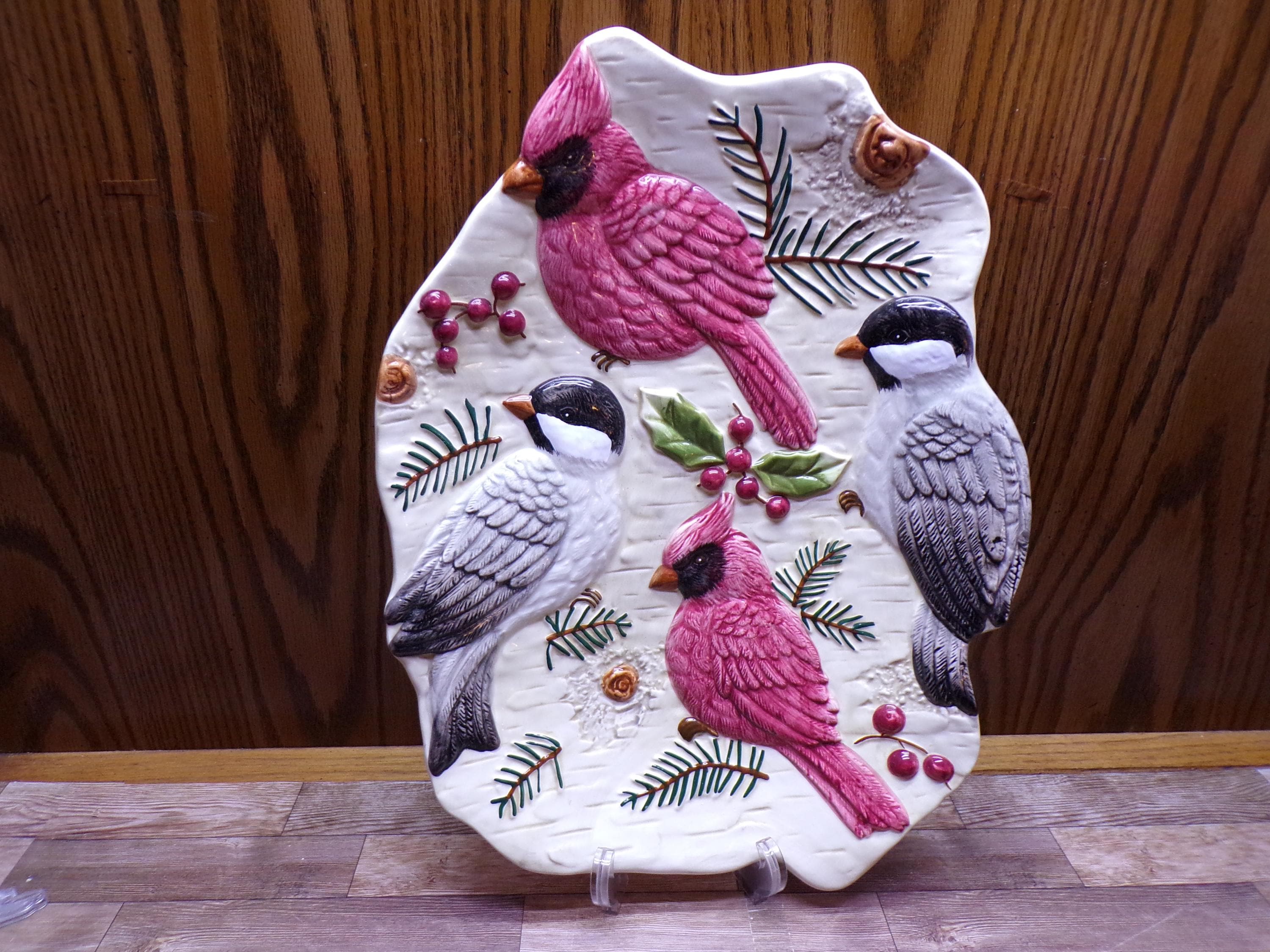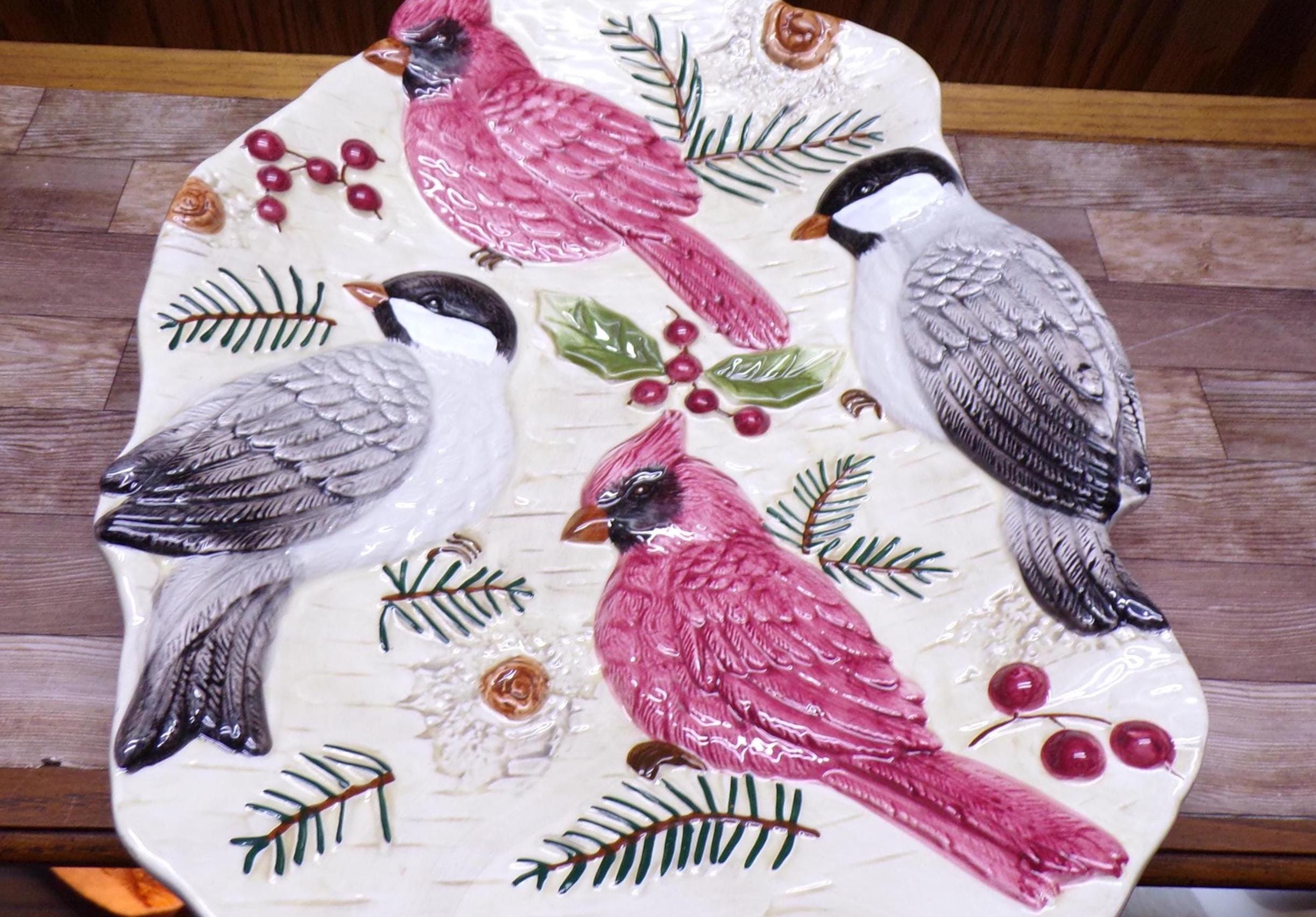 This platter is made of ceramic and features a 3D design of cardinals and chickadees on a winter-themed background with pine branches and berries.
