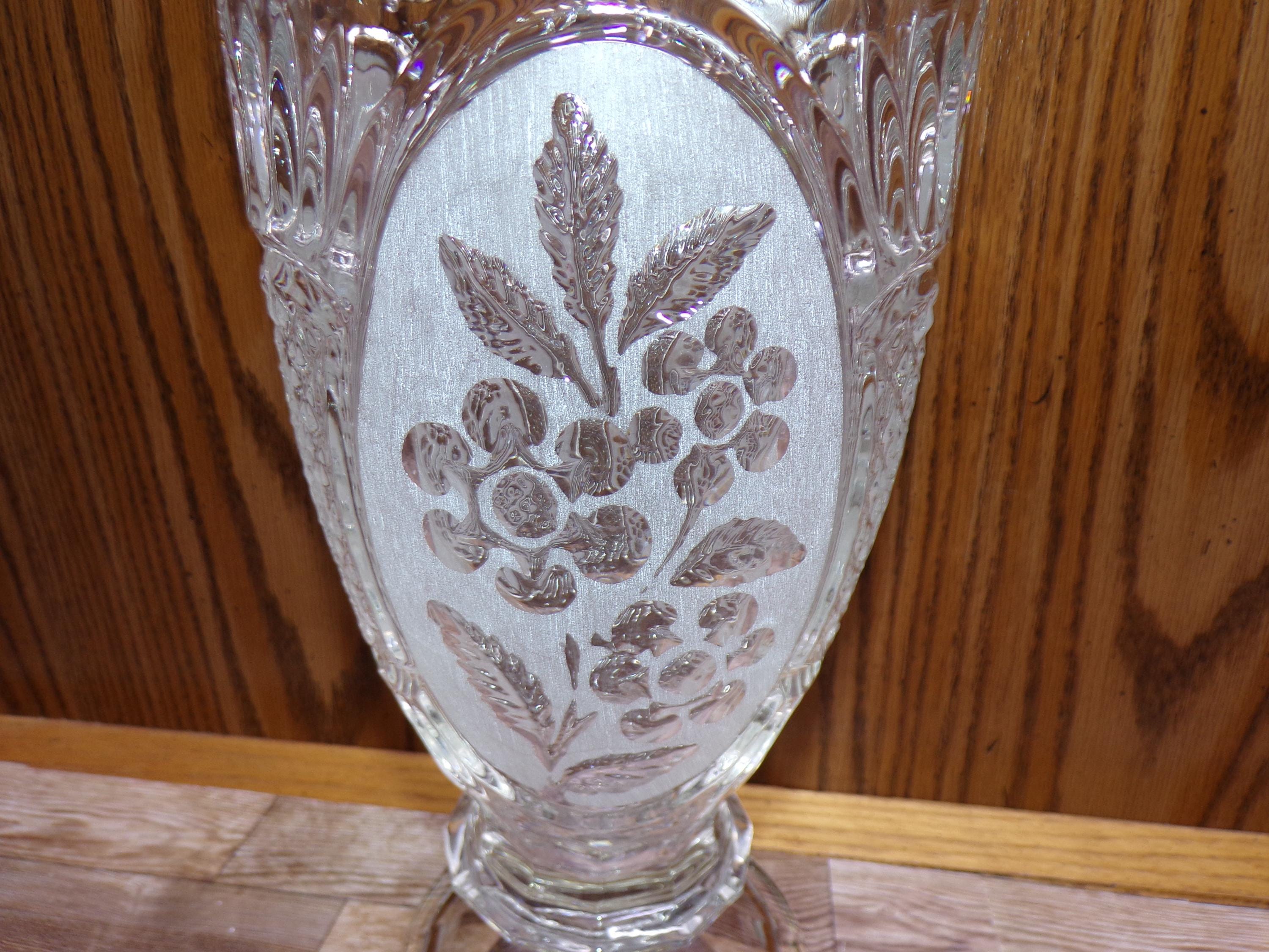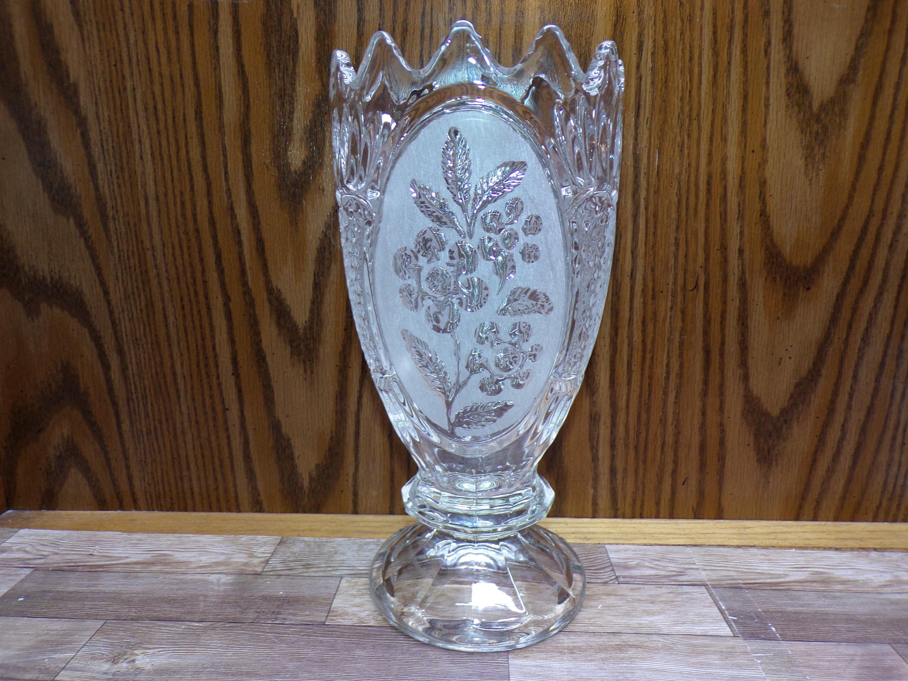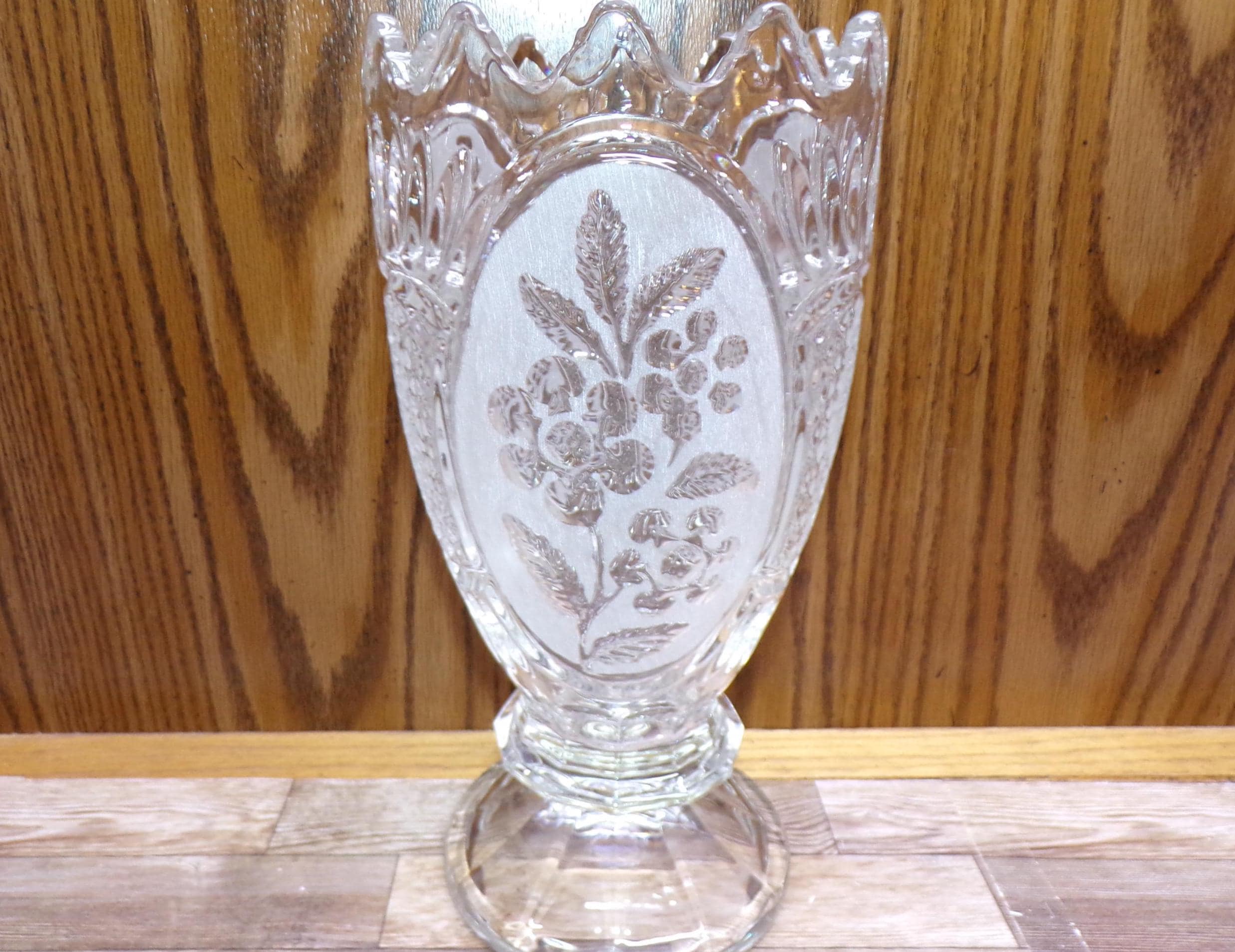 2511 Zajecar 24% Lead Crystal 10" Footed Vase Authentic Yugoslavian Crystal 5" Wide Frosted Floral Panels Sawtooth Rim - No Chips, Cracks, Excessive Scratches, Films, Stains Overall Great Condition Very Beautiful