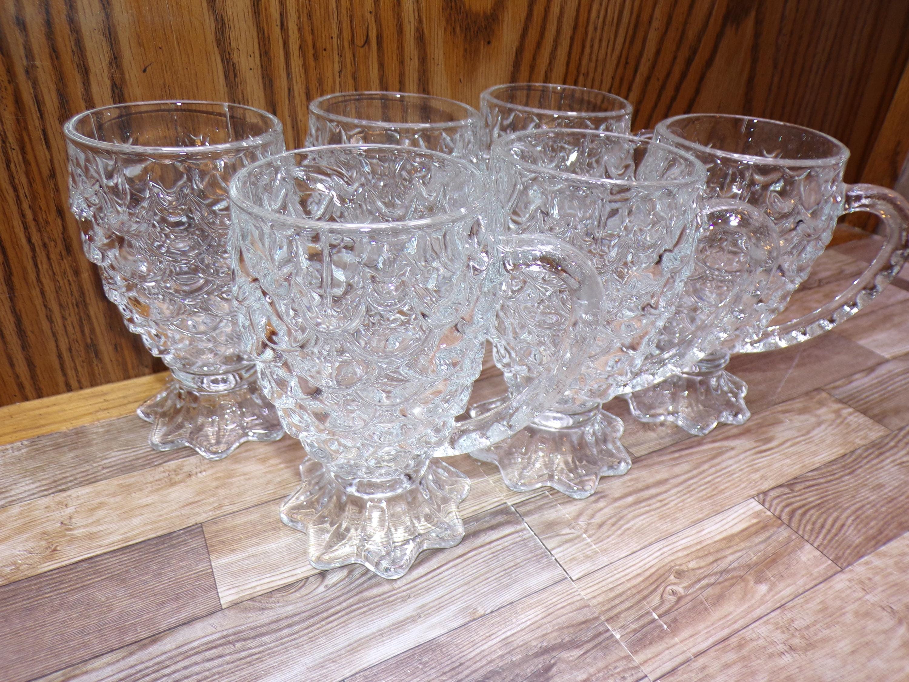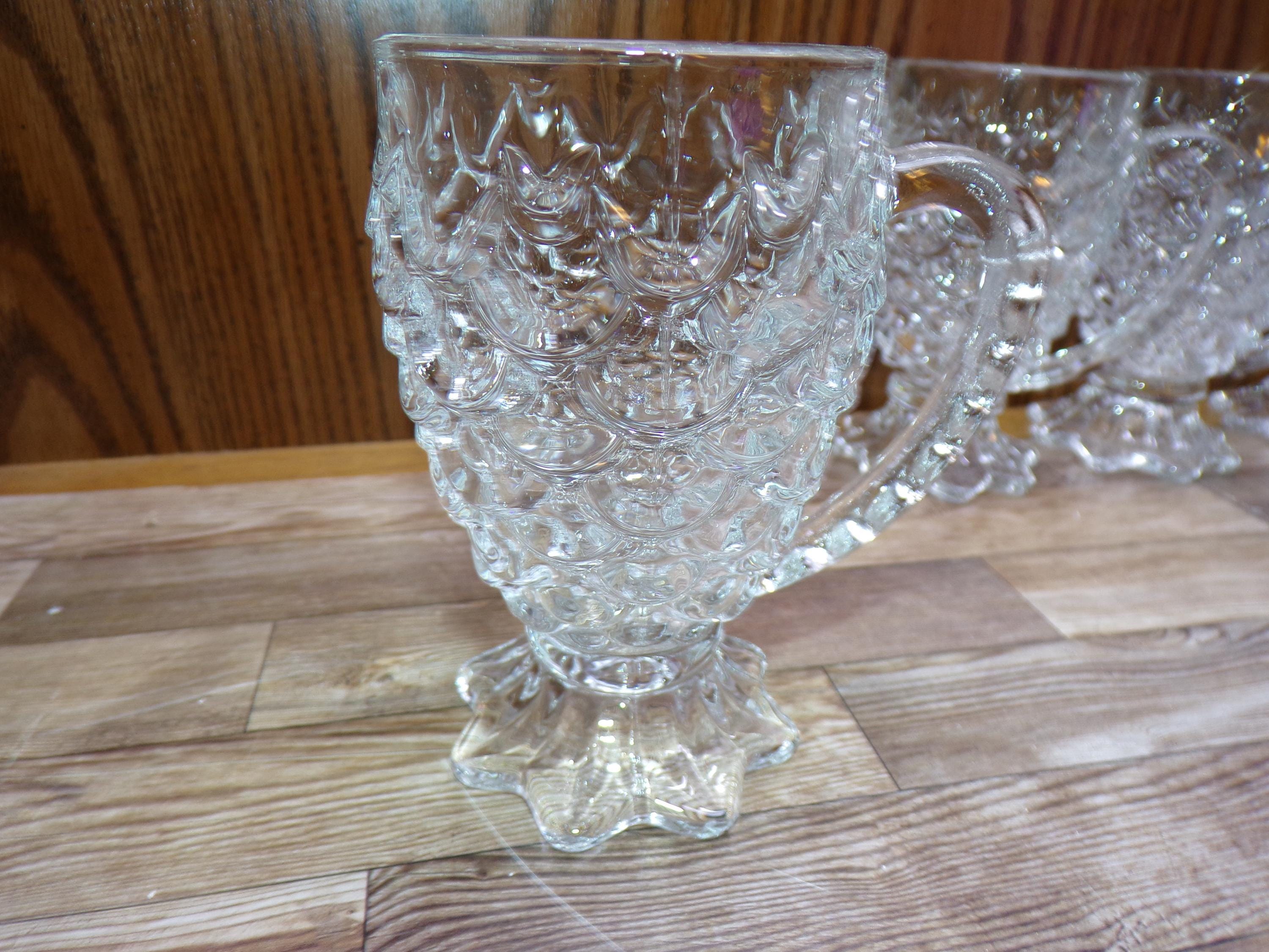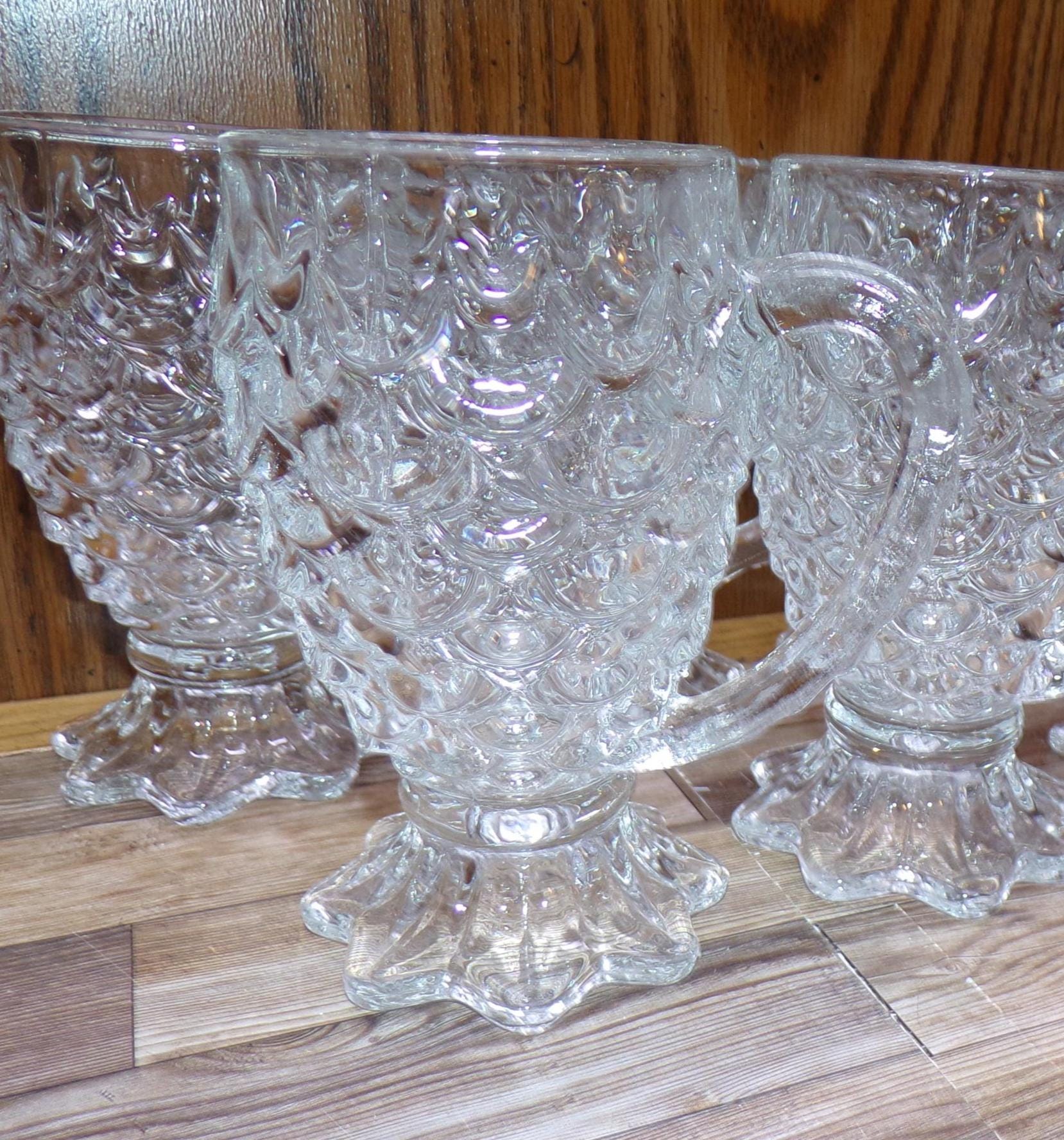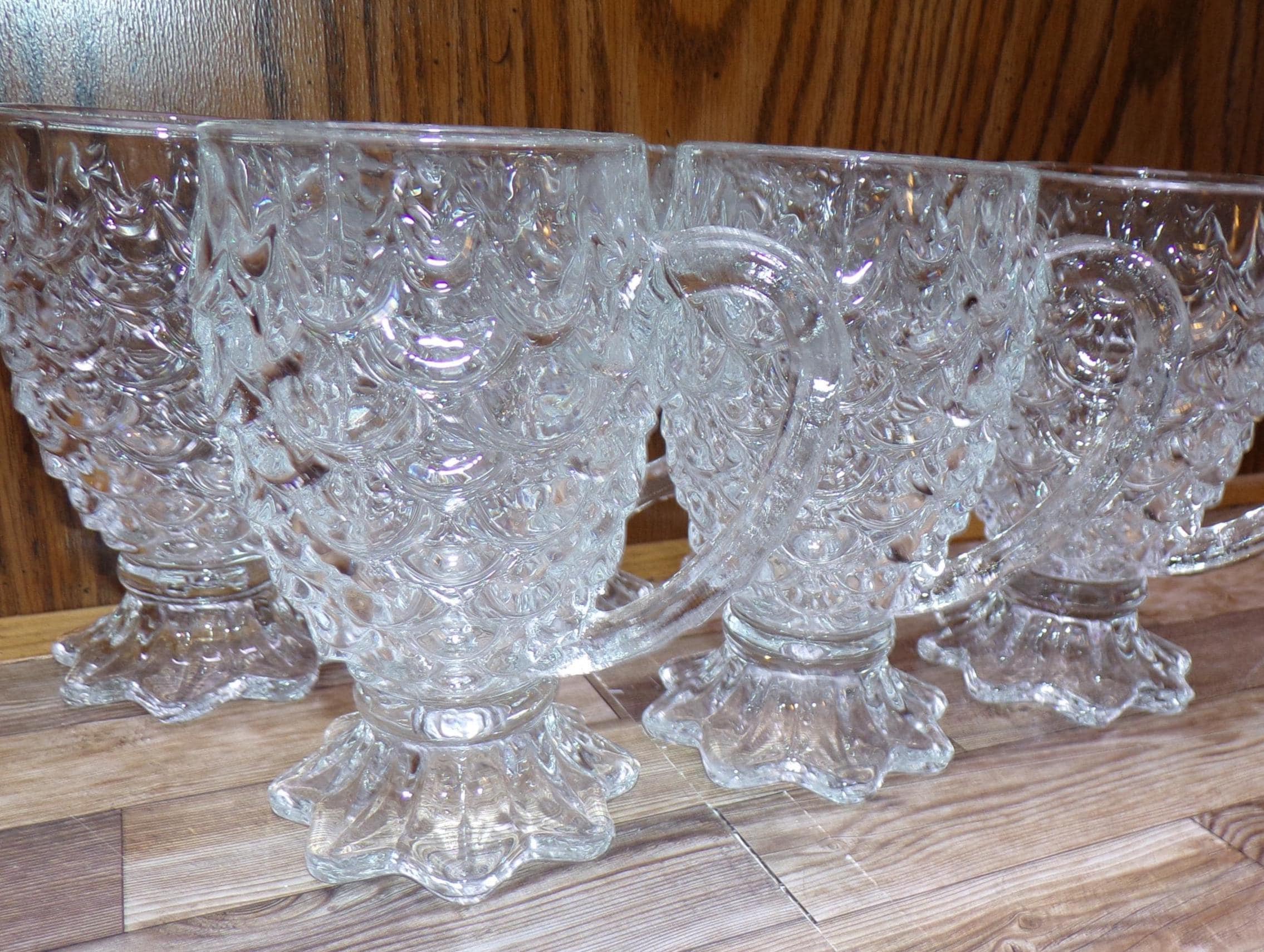 2511 Unique Fish Scale Pattern Clear Glass Footed Mugs 5" Set of 6 - No Chips, Cracks, Excessive Scratches, Films or Stains Excellent Condition