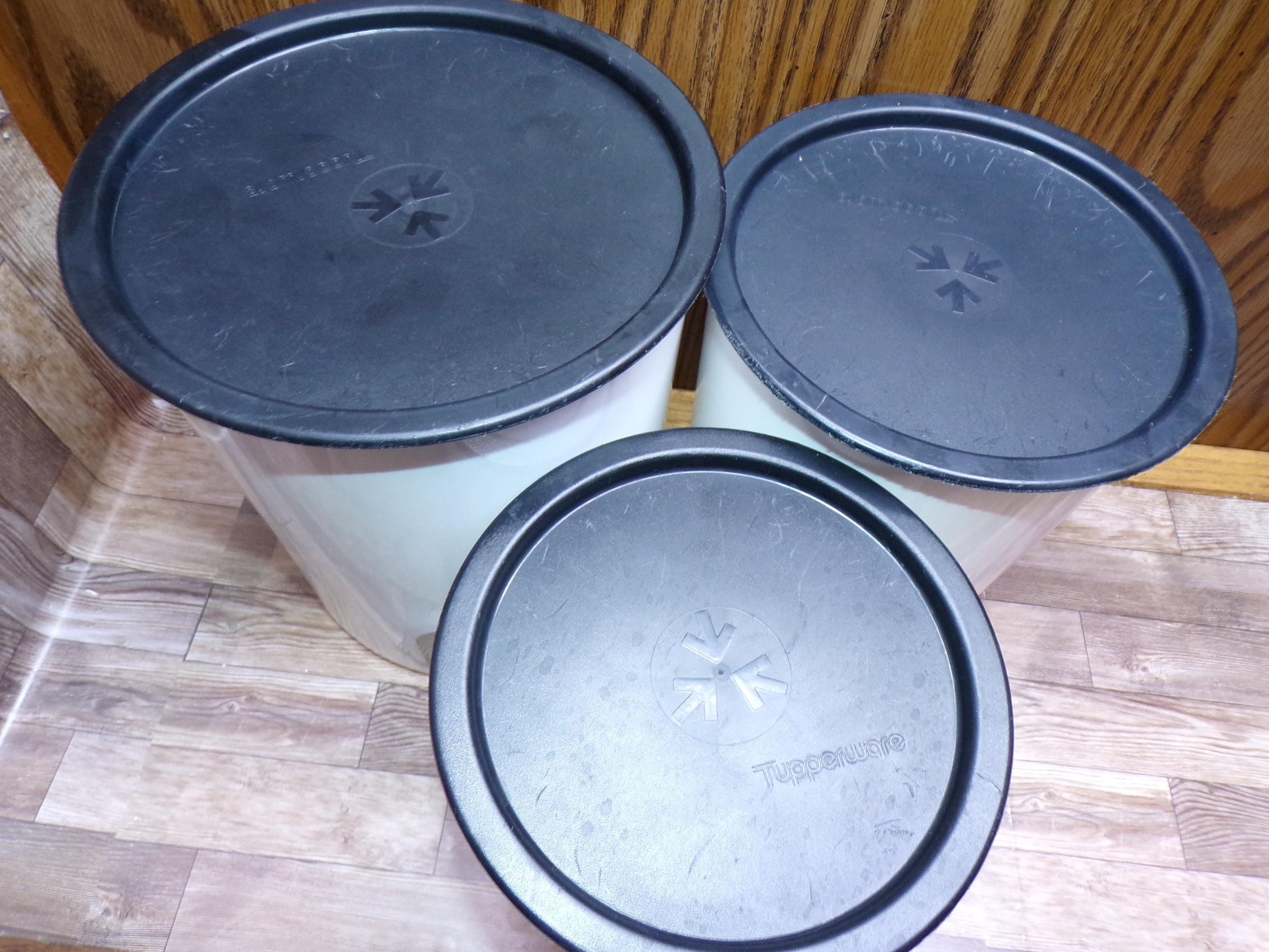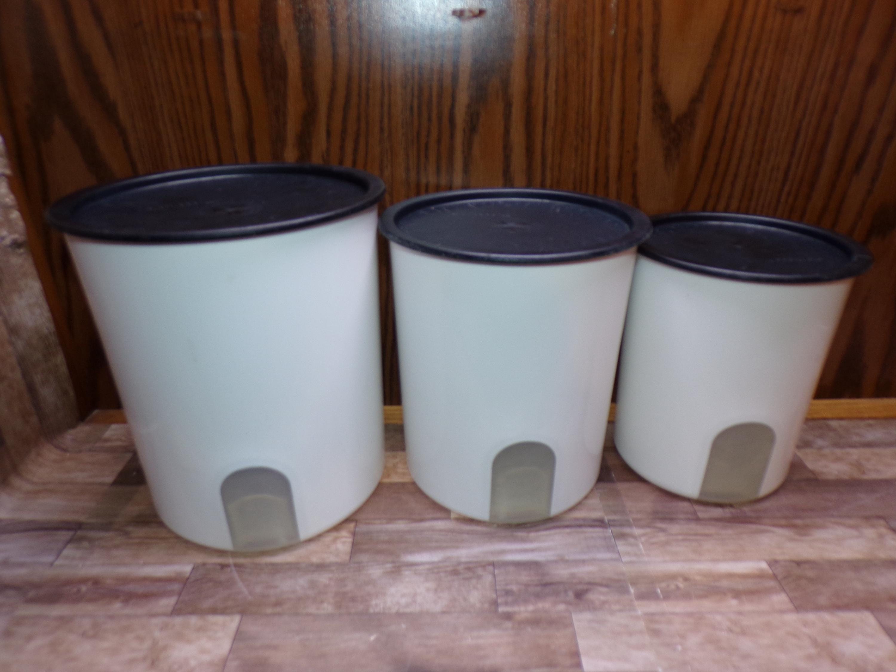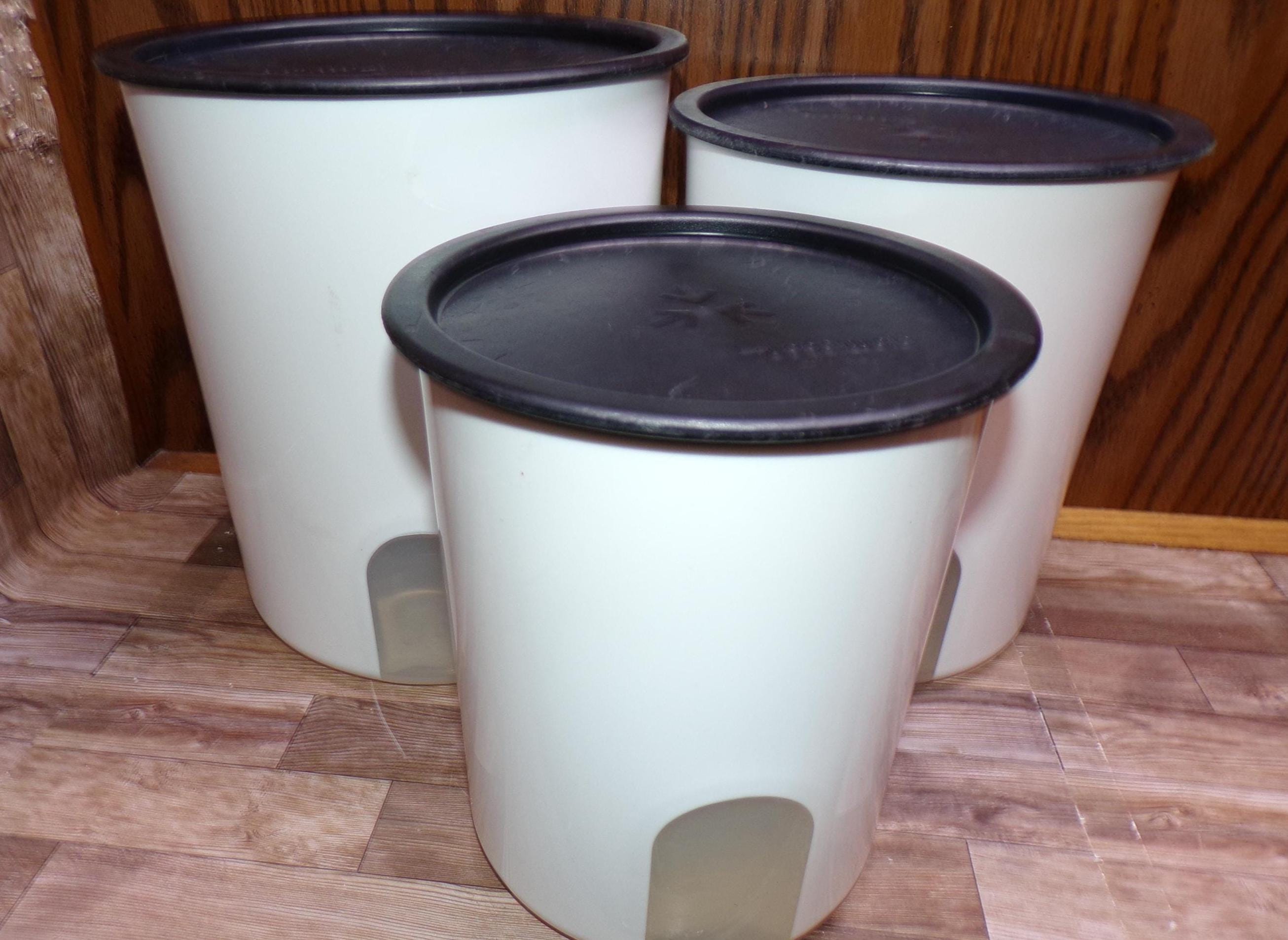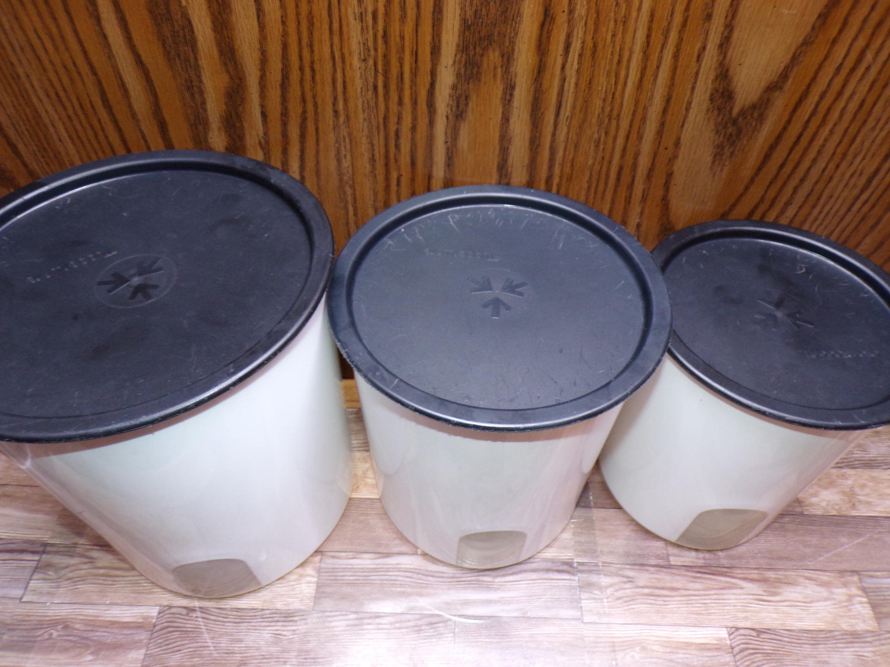 2511 Tupperware One Touch Canisters Set of 3 Solid White w/ Black Lids 6 Piece Set USA - Some Scratches Good Condition Tight Seals. All Containers & Lids Nest Together.