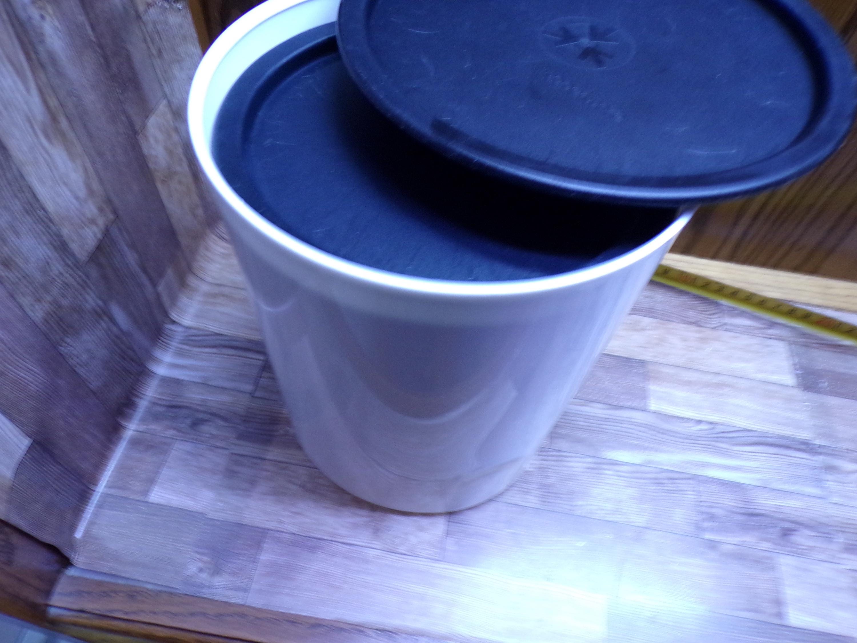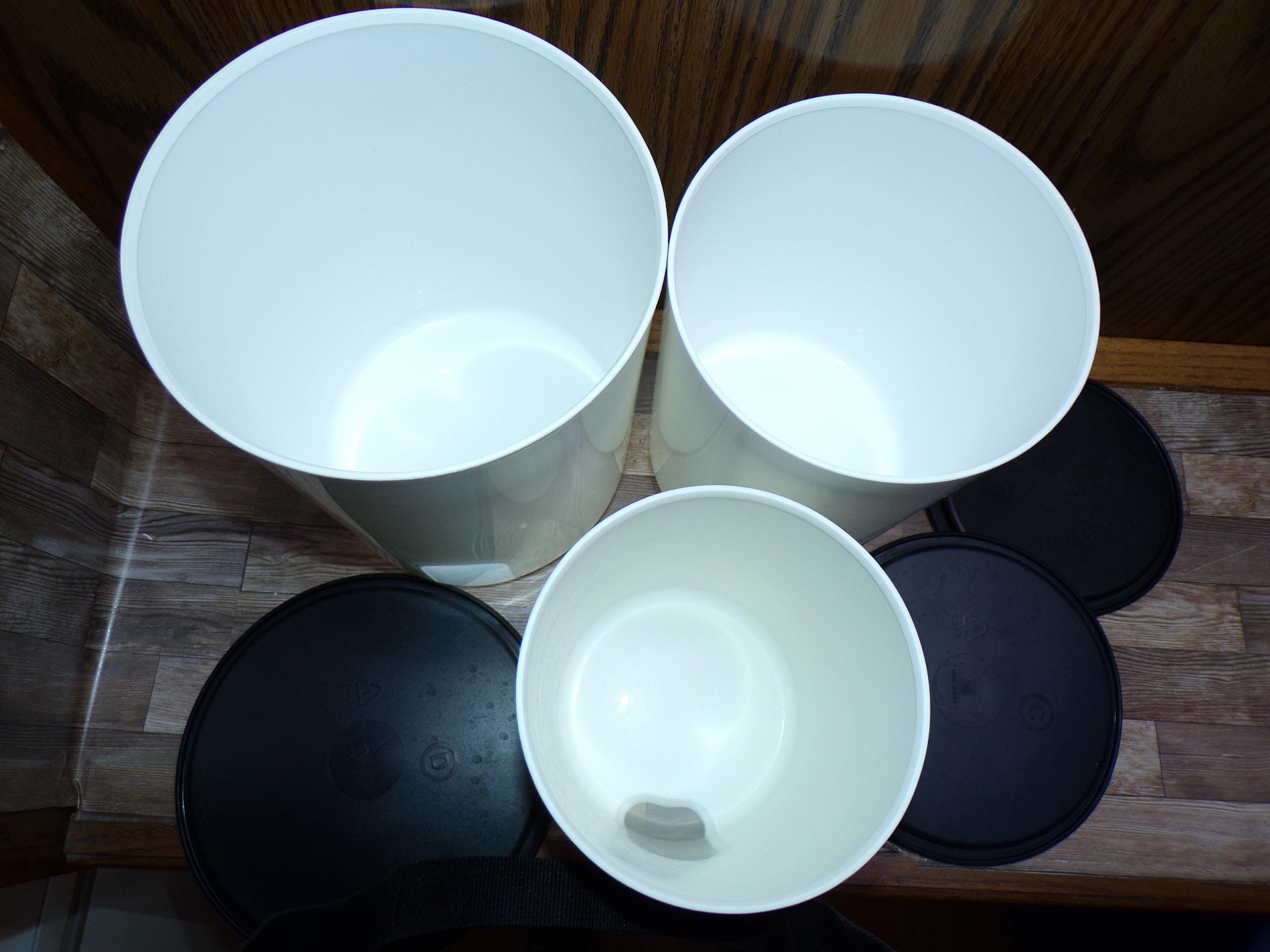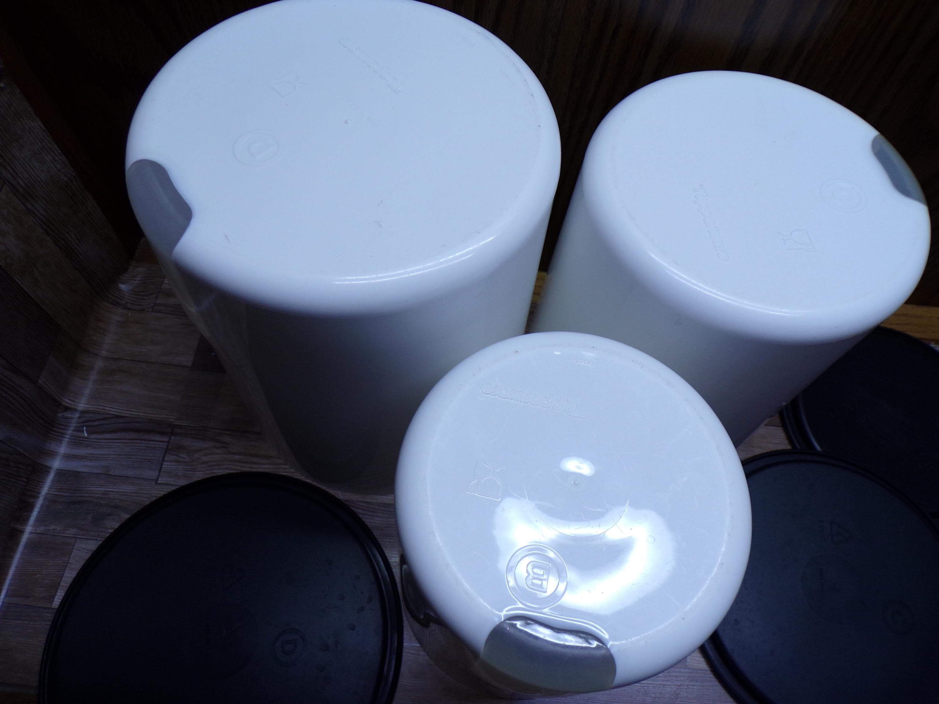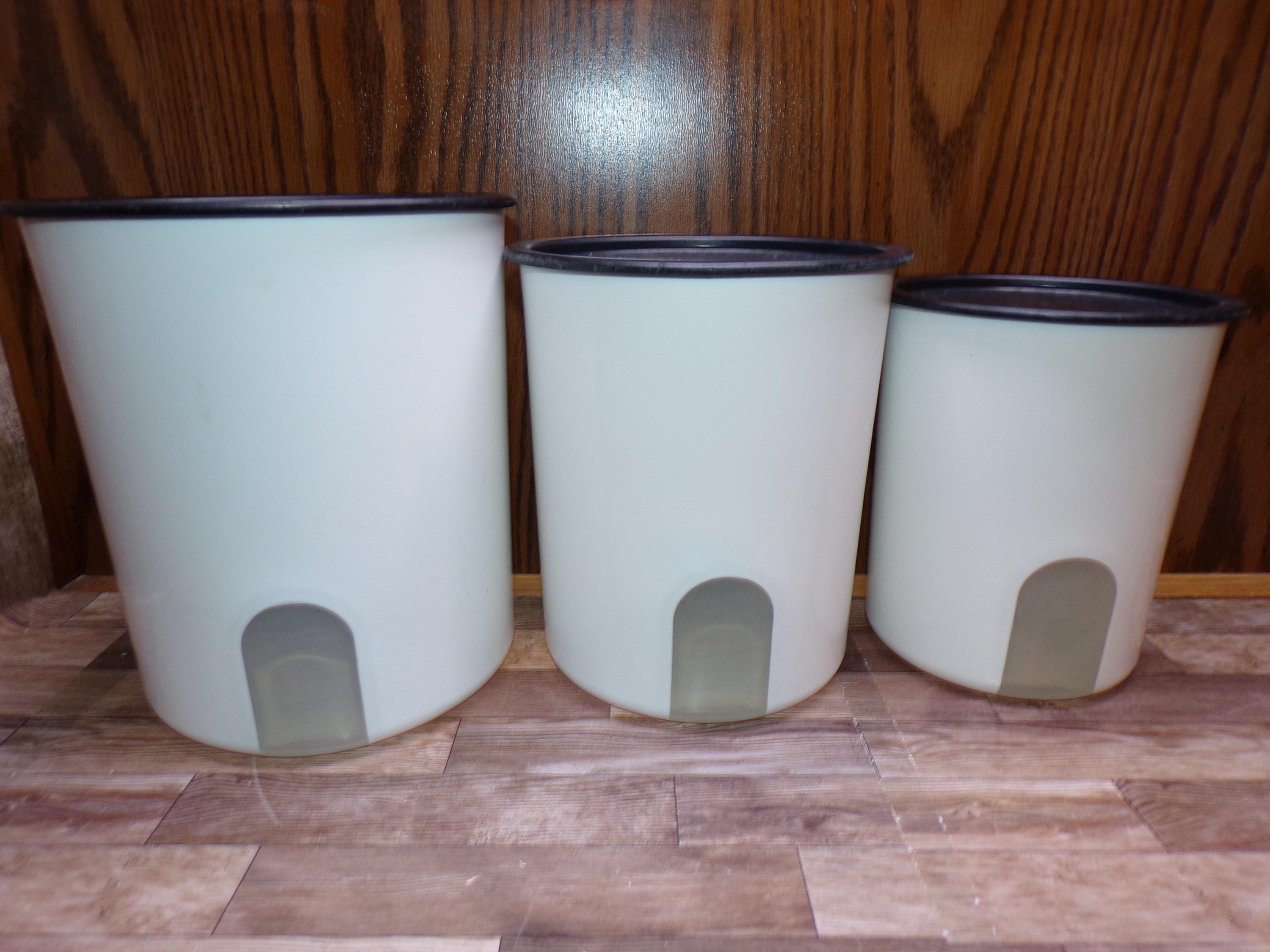 2511 Tupperware One Touch Canisters Set of 3 Solid White w/ Black Lids 6 Piece Set USA - Some Scratches Good Condition Tight Seals. All Containers & Lids Nest Together.