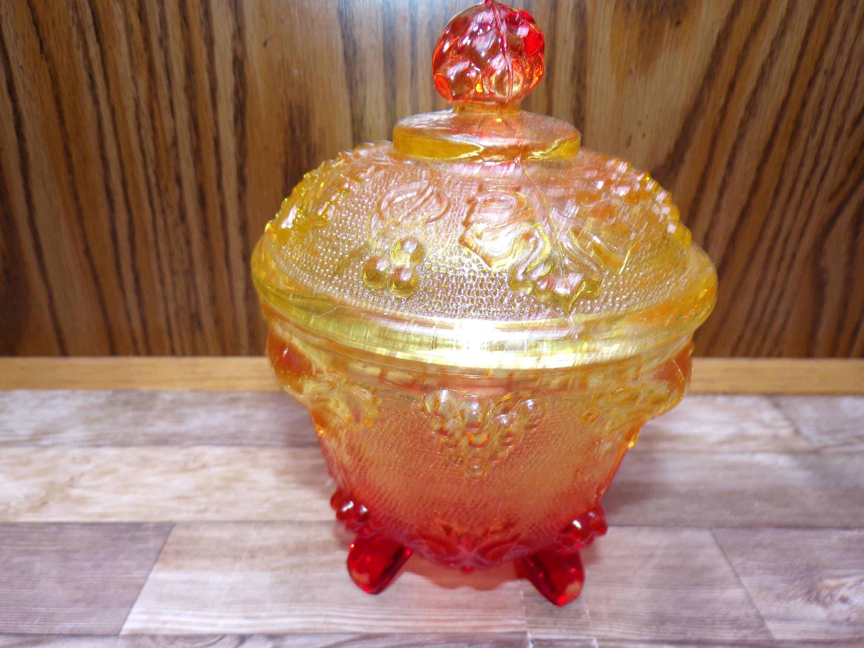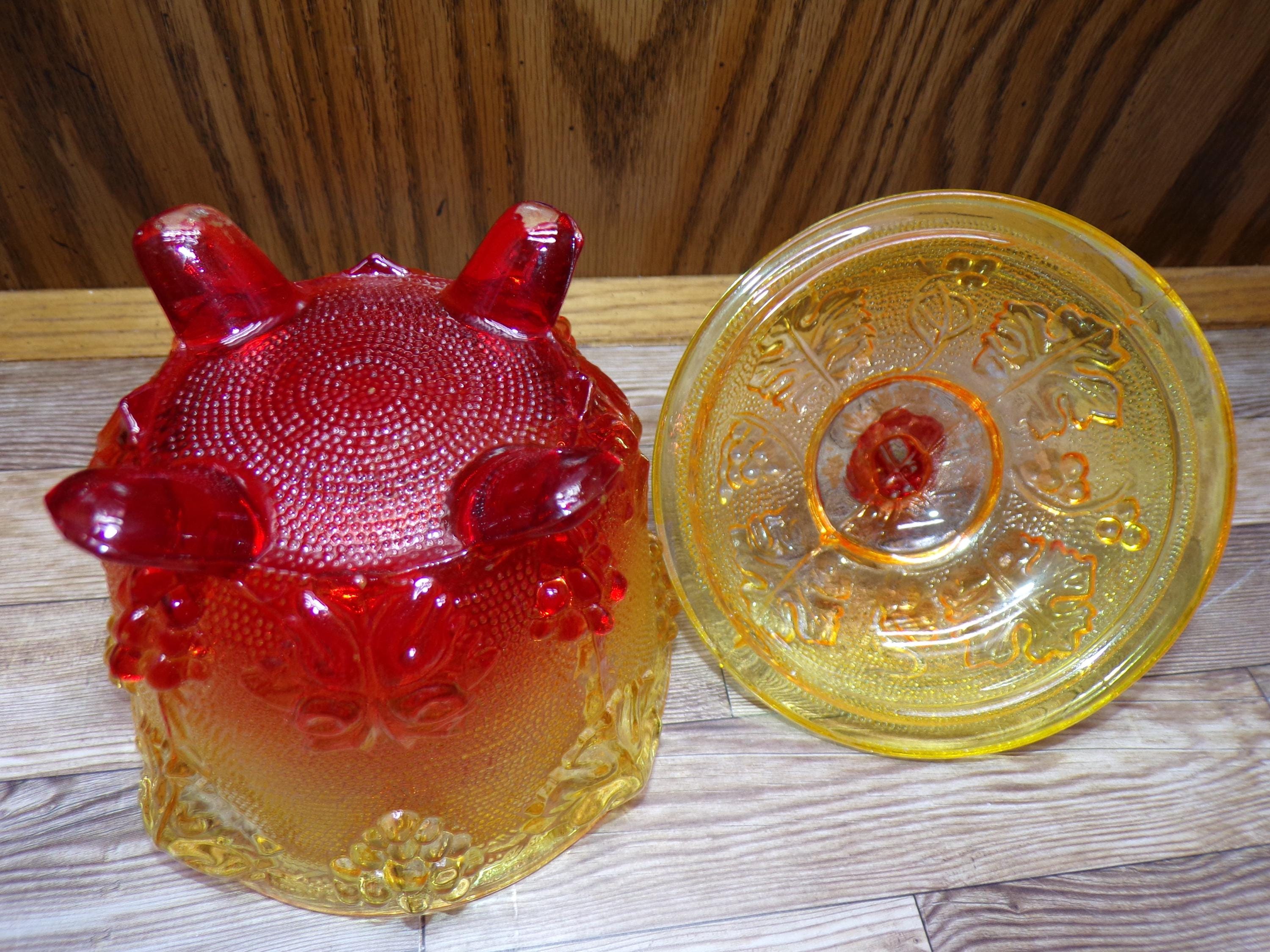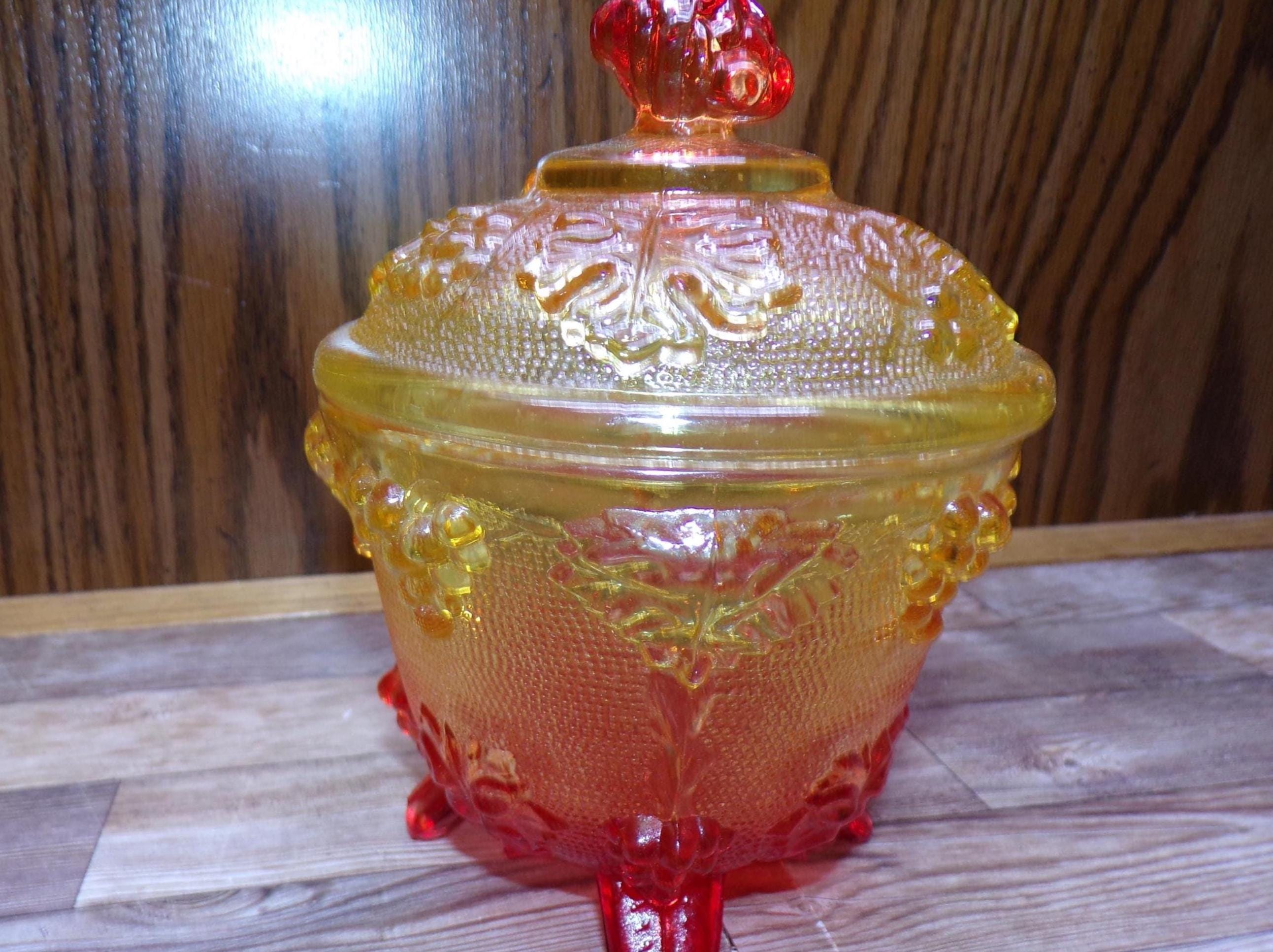 2511 Jeanette Glass Grape & Cable Amberina Fire Vintage Footed 5.5" x 4.5" Candy Jar w/ Lid - Great Condition Very Little Signs of Wear
