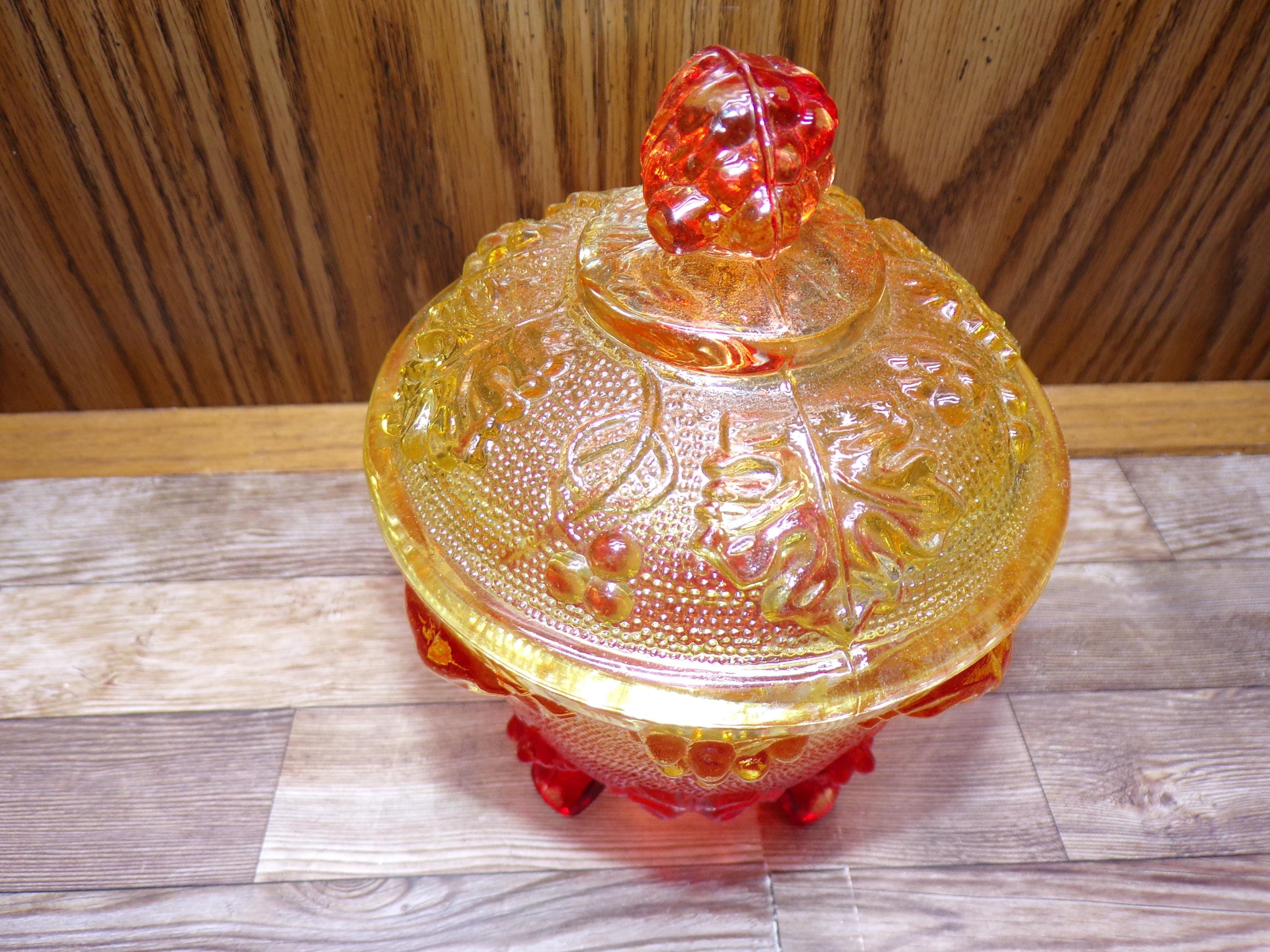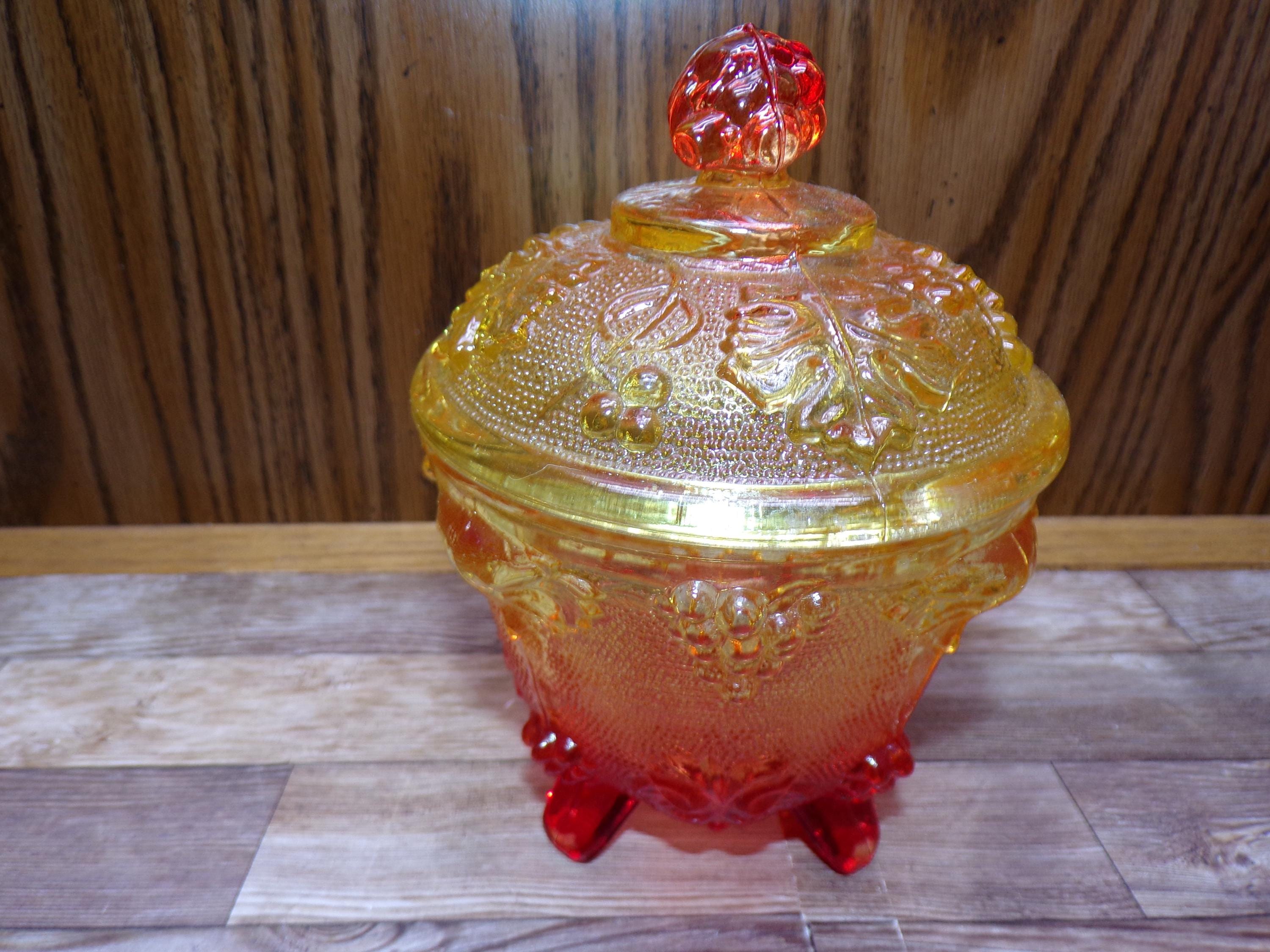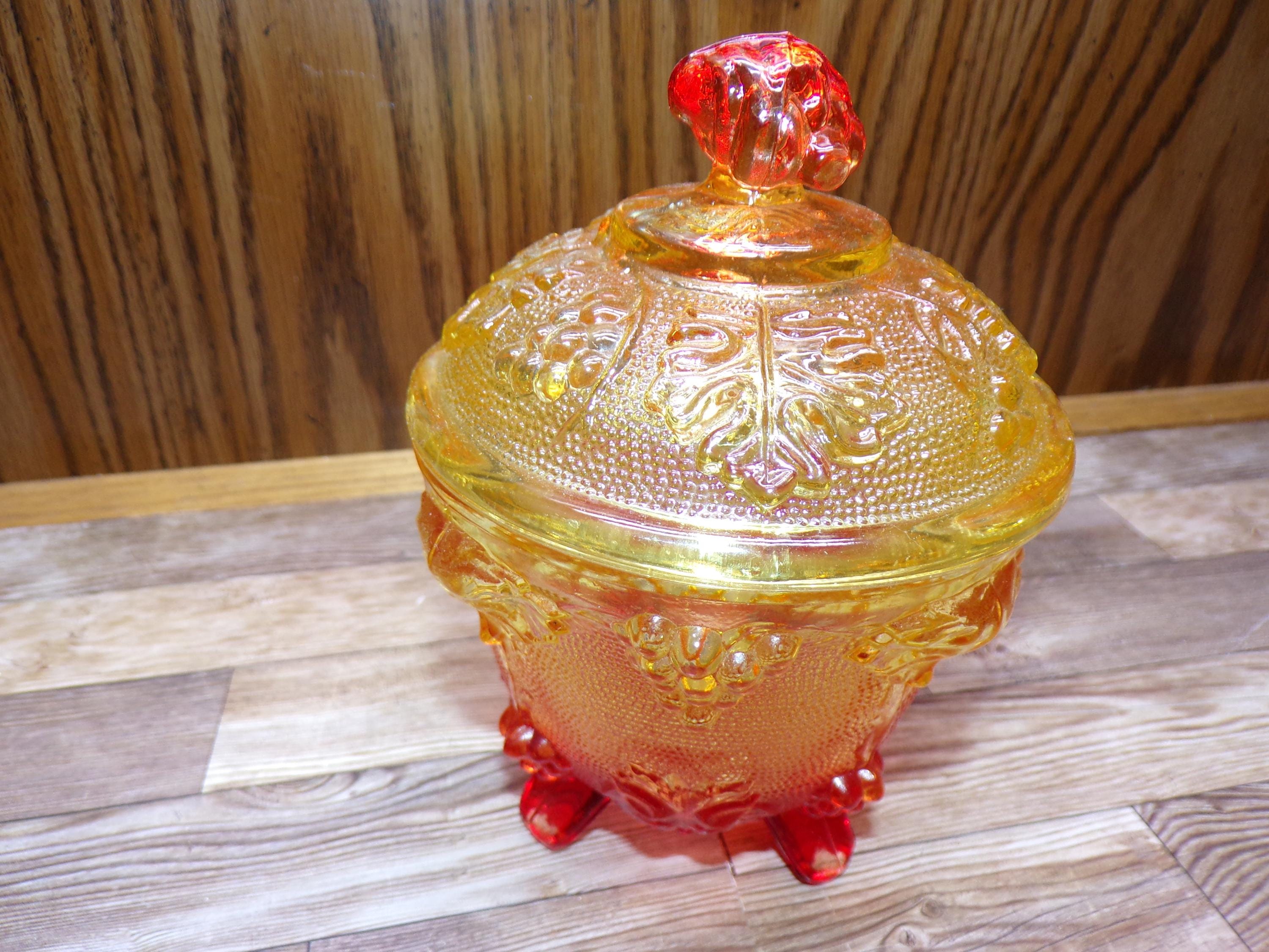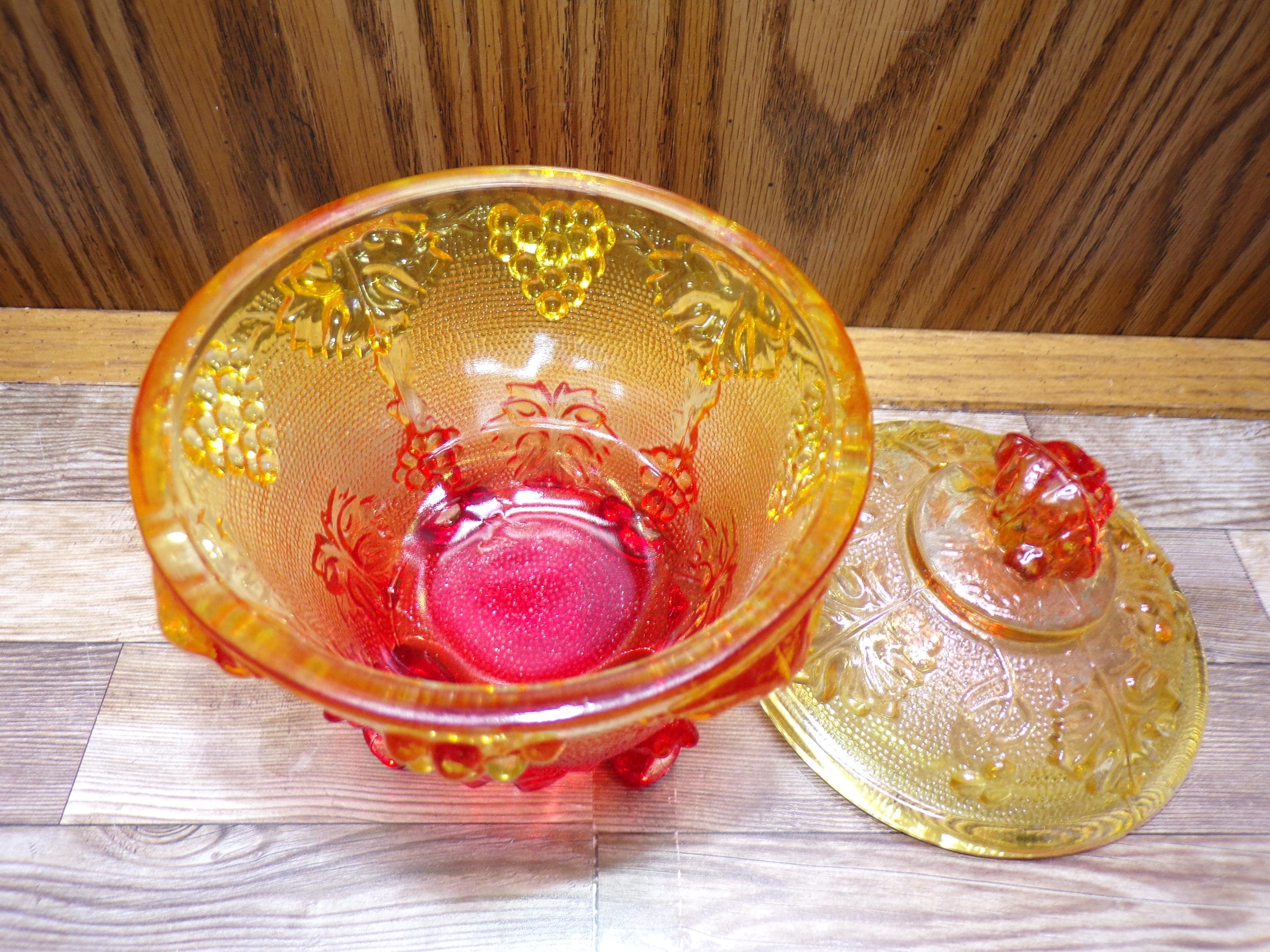 2511 Jeanette Glass Grape & Cable Amberina Fire Vintage Footed 5.5" x 4.5" Candy Jar w/ Lid - Great Condition Very Little Signs of Wear