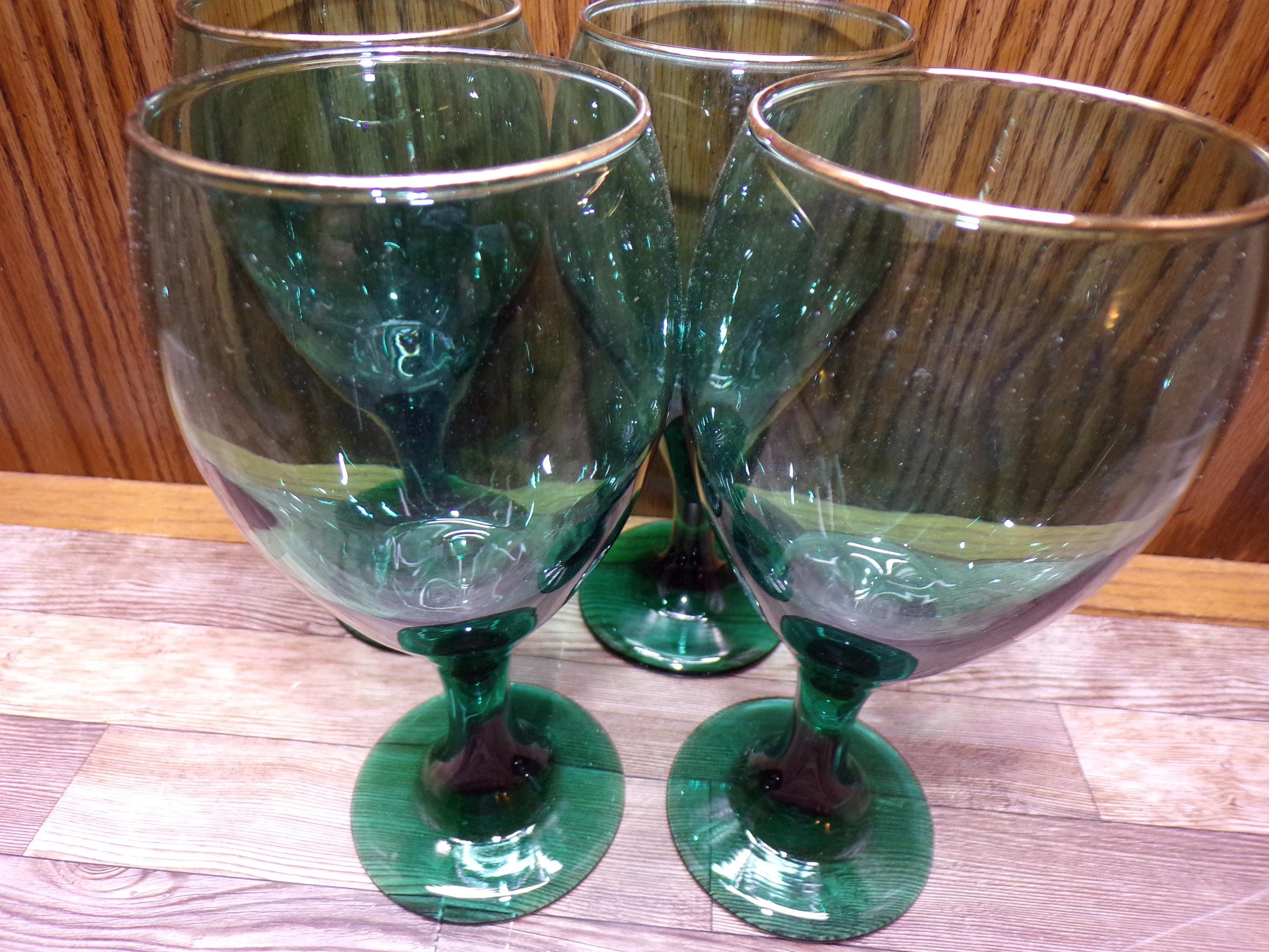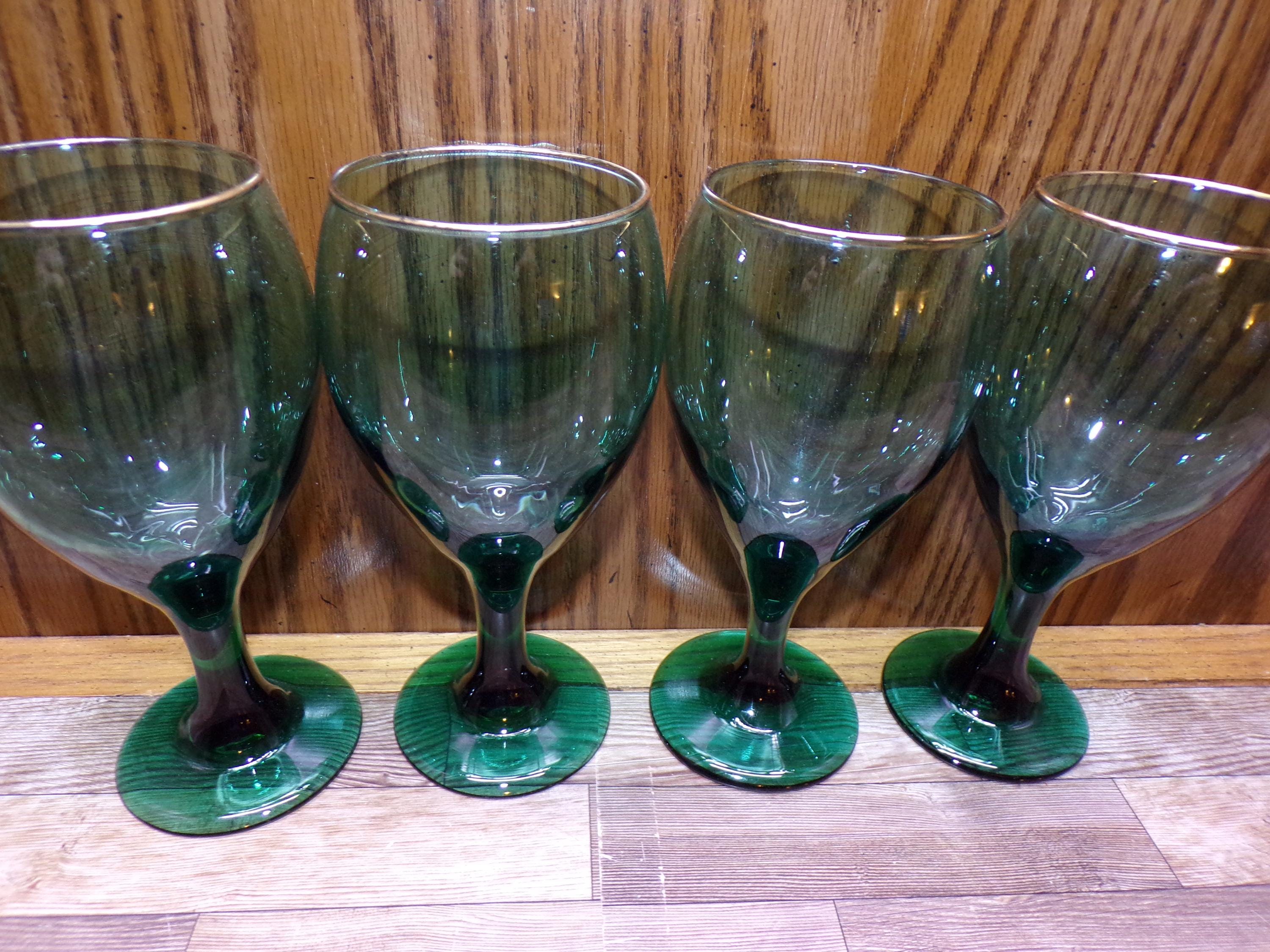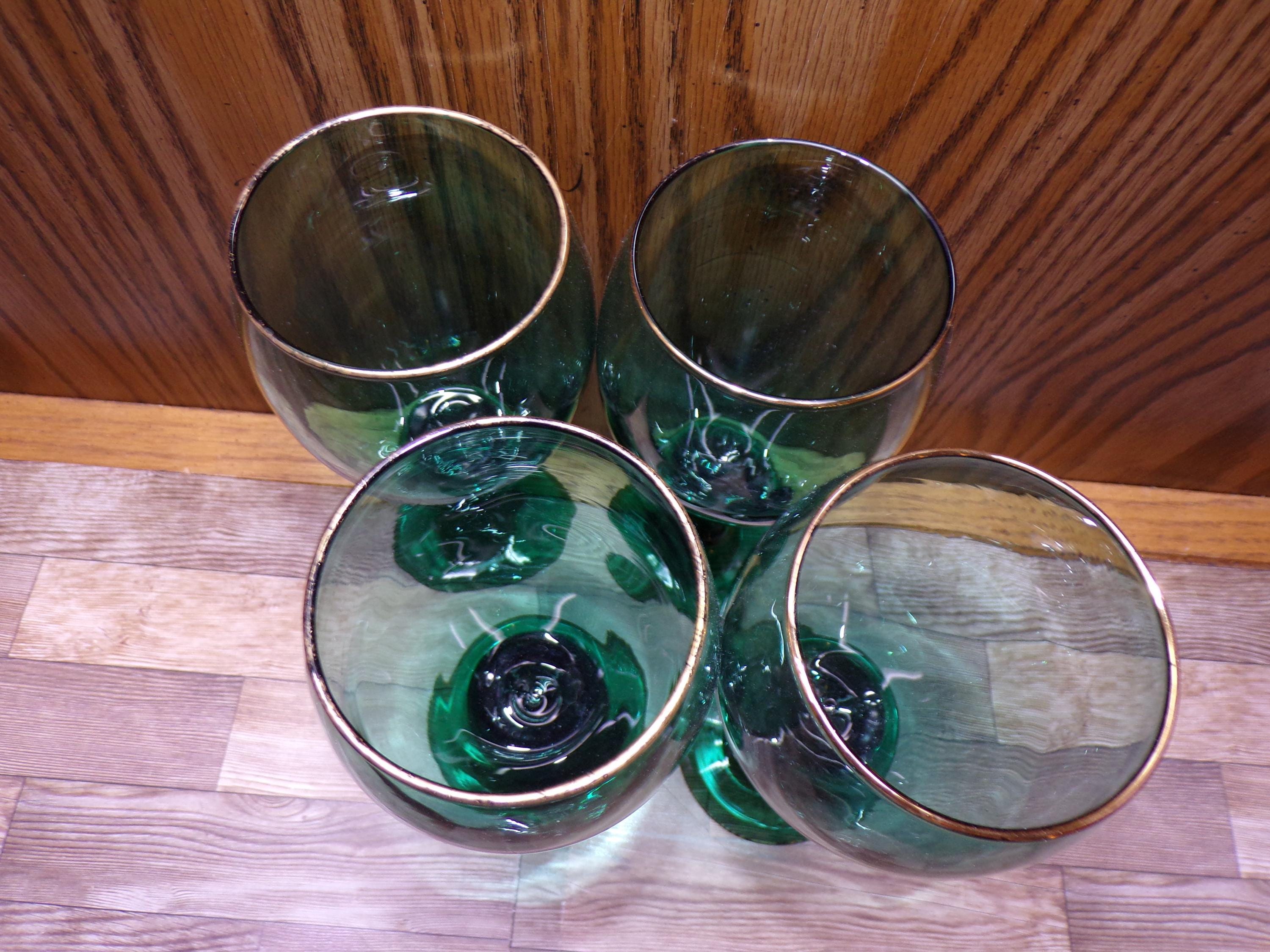 2511 Libbey Glass 7" Vintage Juniper Green Teardrop Set of 4 Stemmed Footed Glasses with Gold Rim - Good Condition Some Wear on Gold Rim