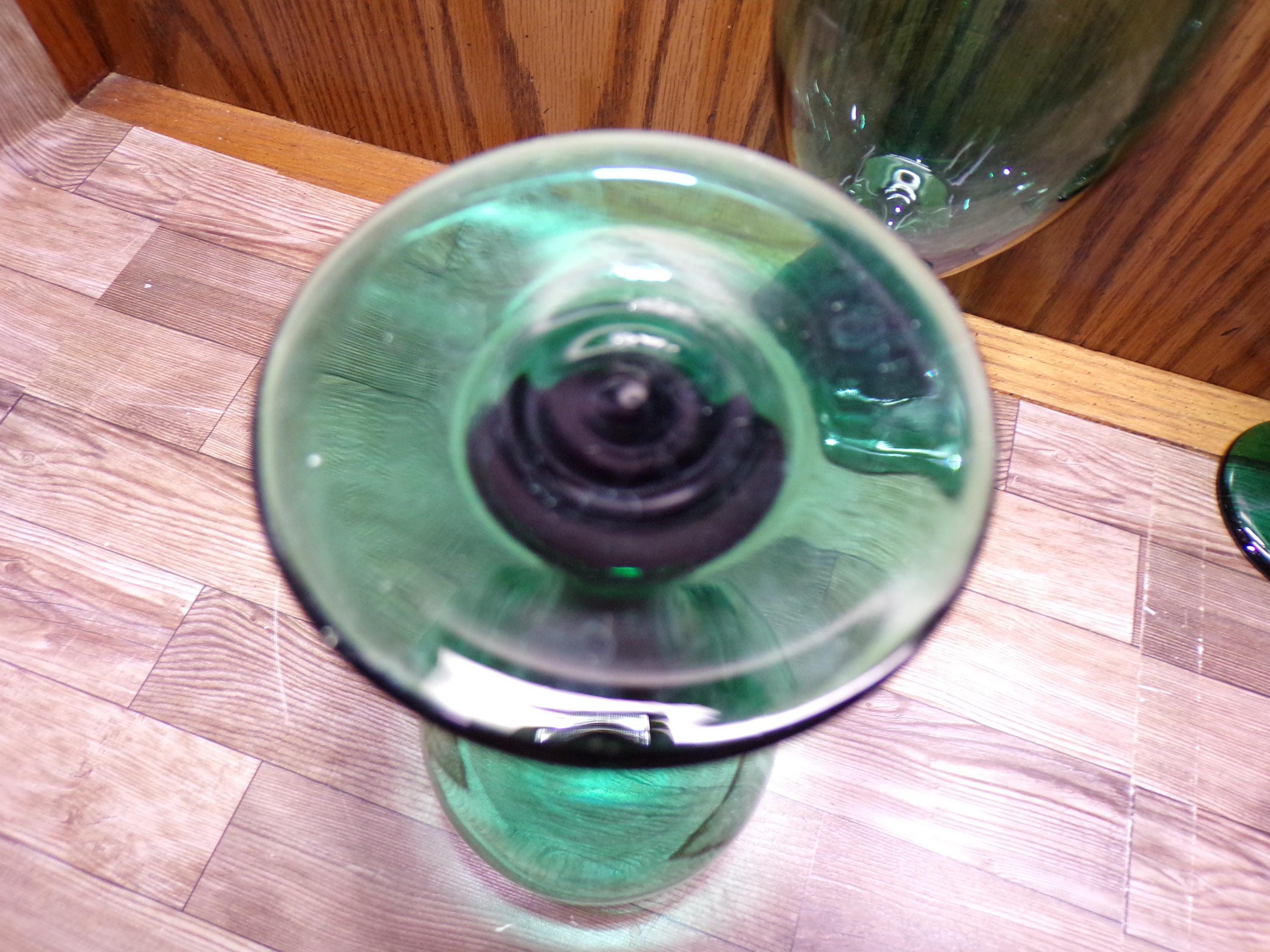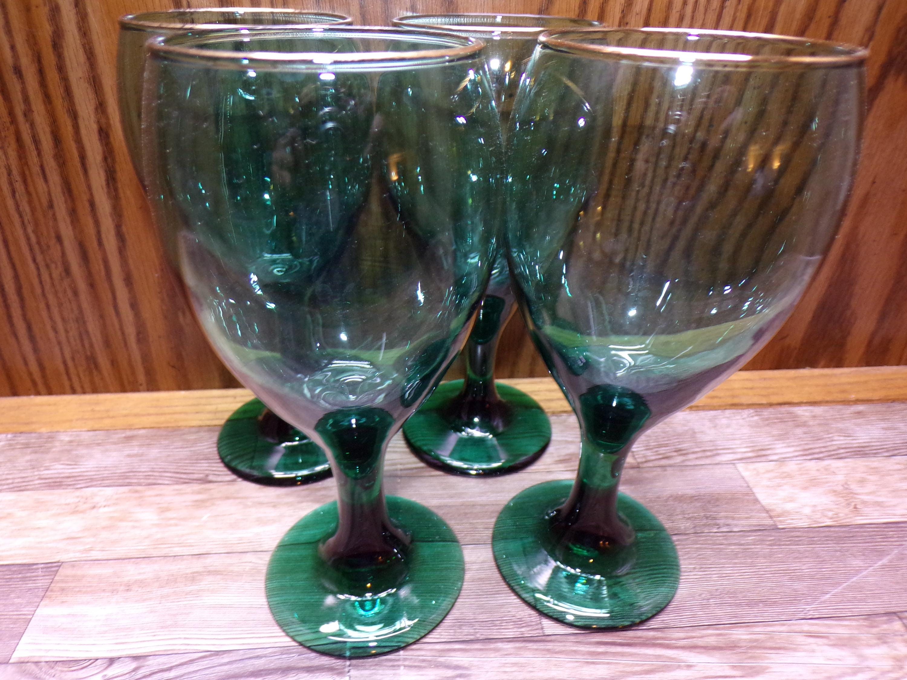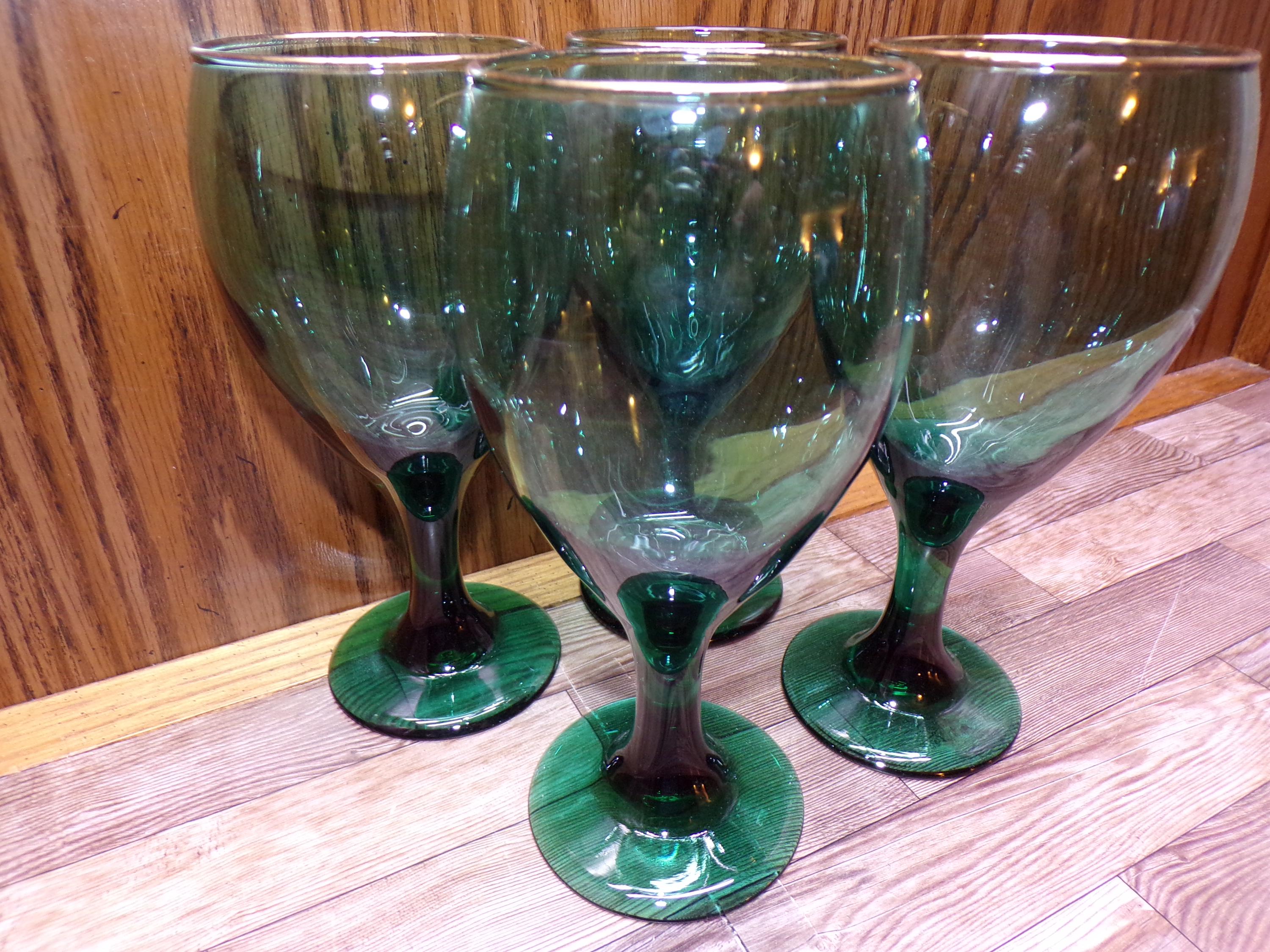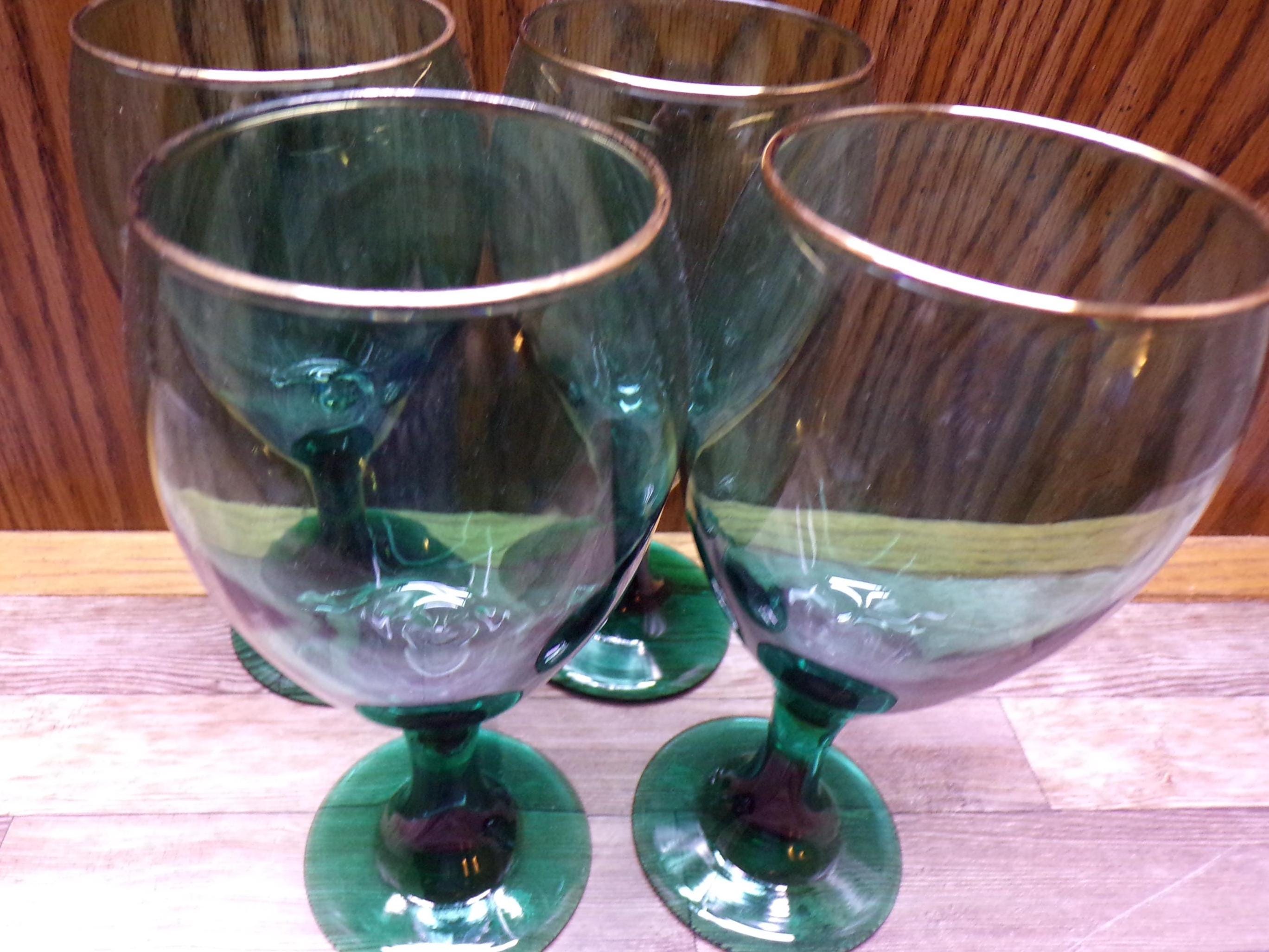 2511 Libbey Glass 7" Vintage Juniper Green Teardrop Set of 4 Stemmed Footed Glasses with Gold Rim - Good Condition Some Wear on Gold Rim