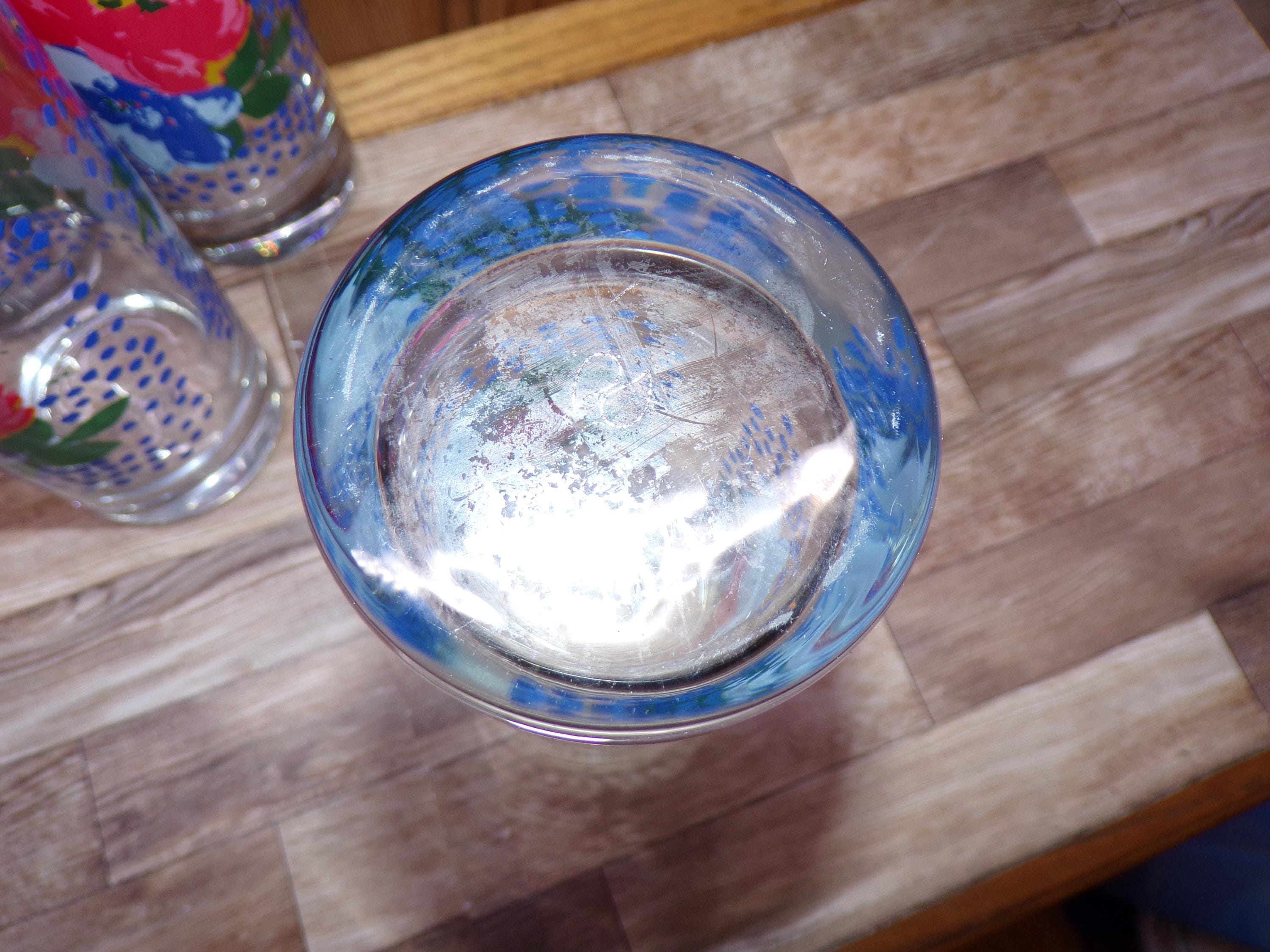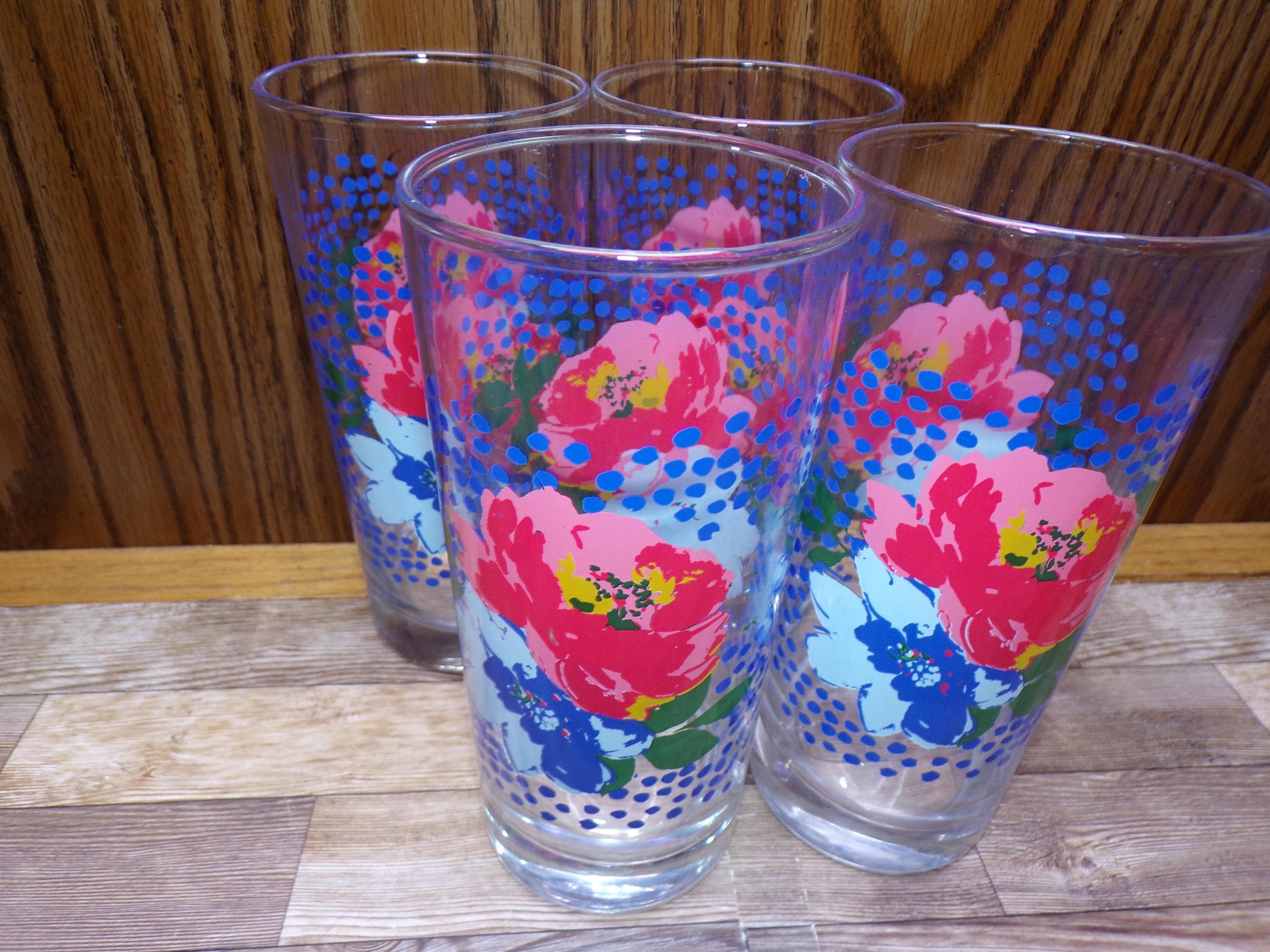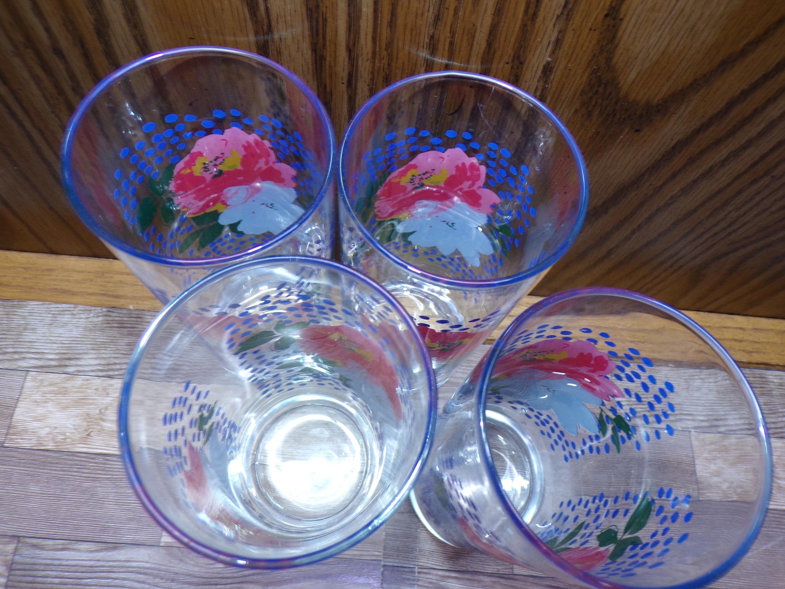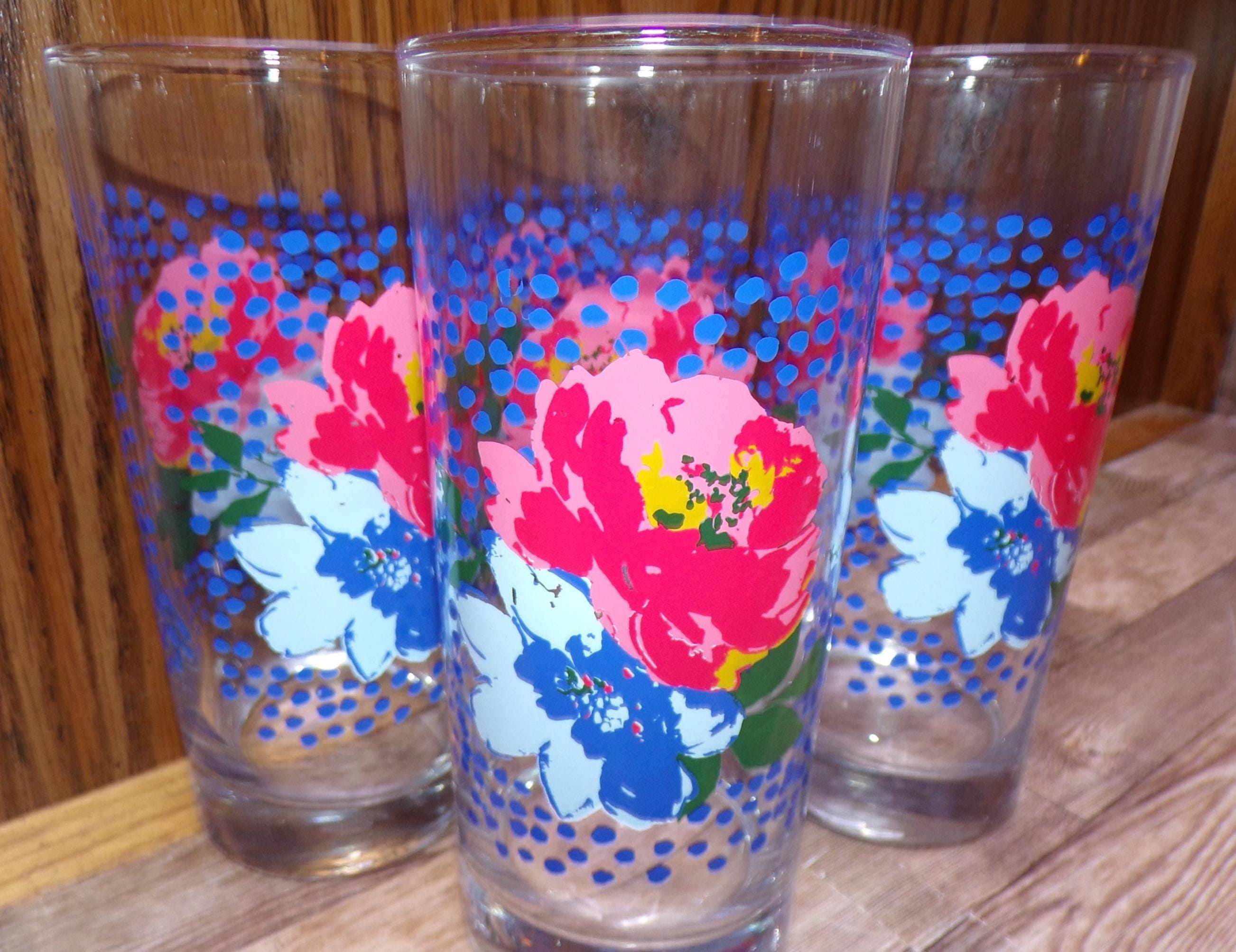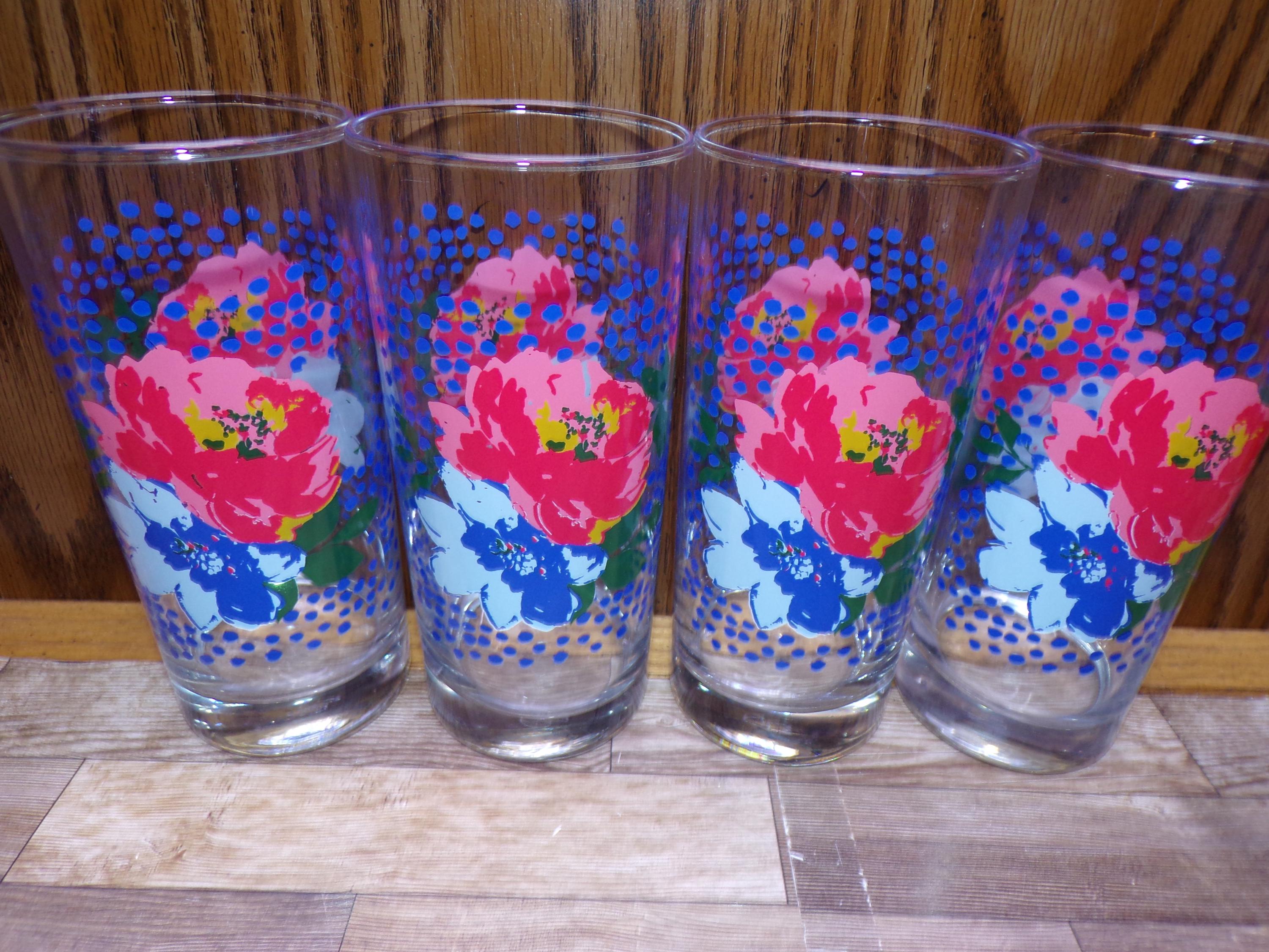 2511 Pioneer Woman Dazzling Dahlias Pink & Blue Floral 6.5" 16 oz Drinking Glass Tumblers Set of 4 - Great Condition
