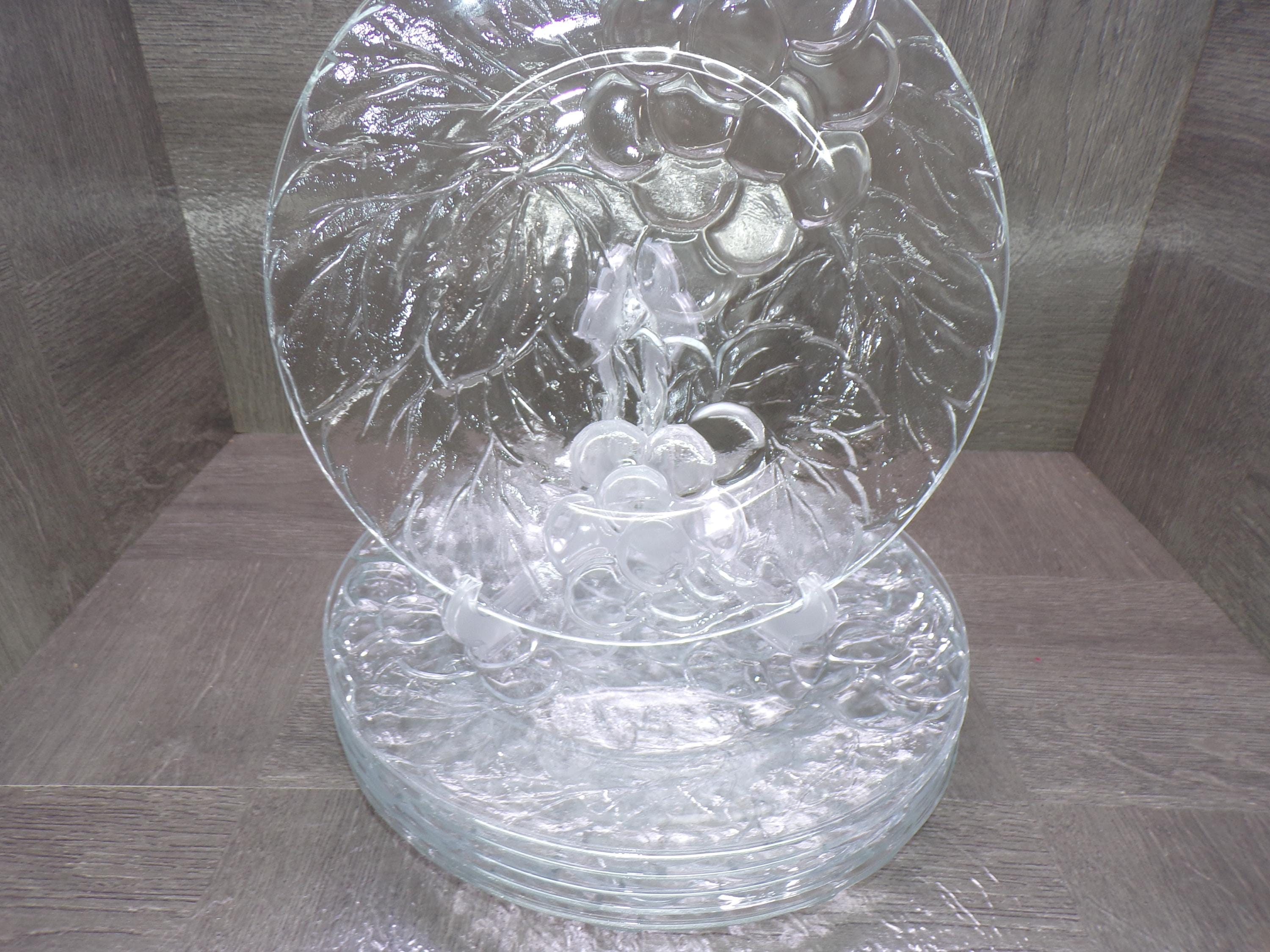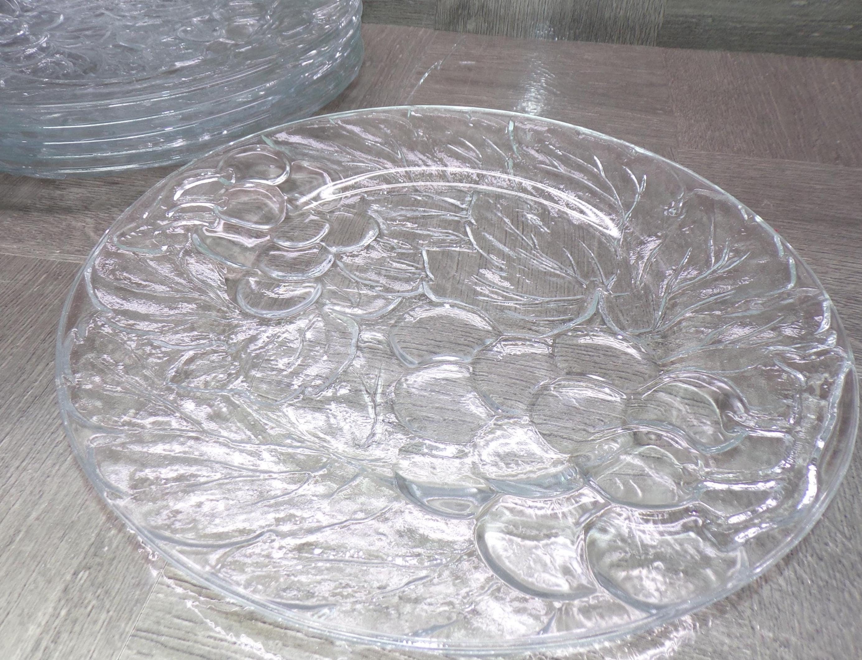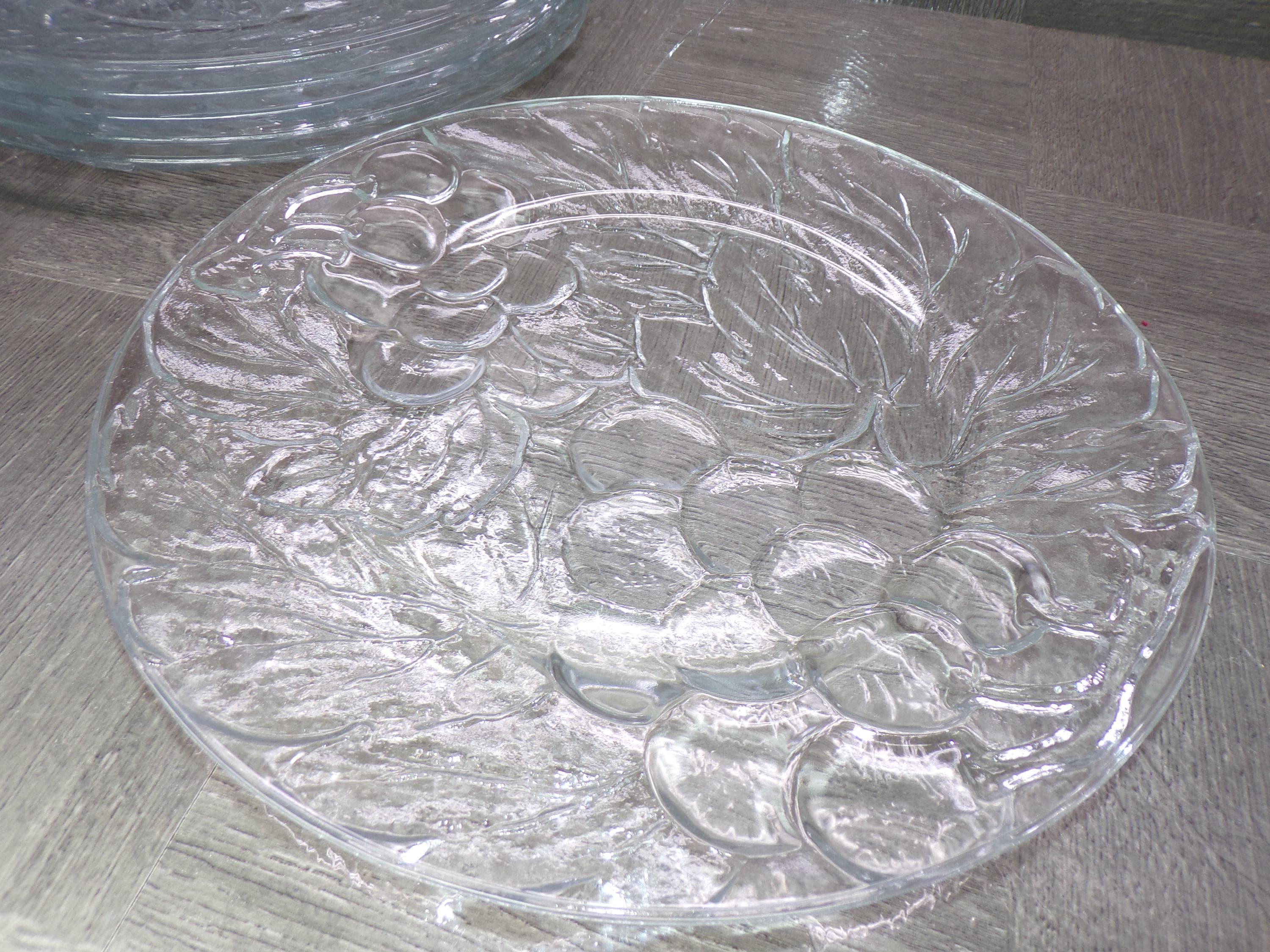 2602 KIG Glass Embossed Grapes & Leaves Thick Clear Glass 10.25" Dinner Plates Set of 6 Made in Indonesia - Great Condition