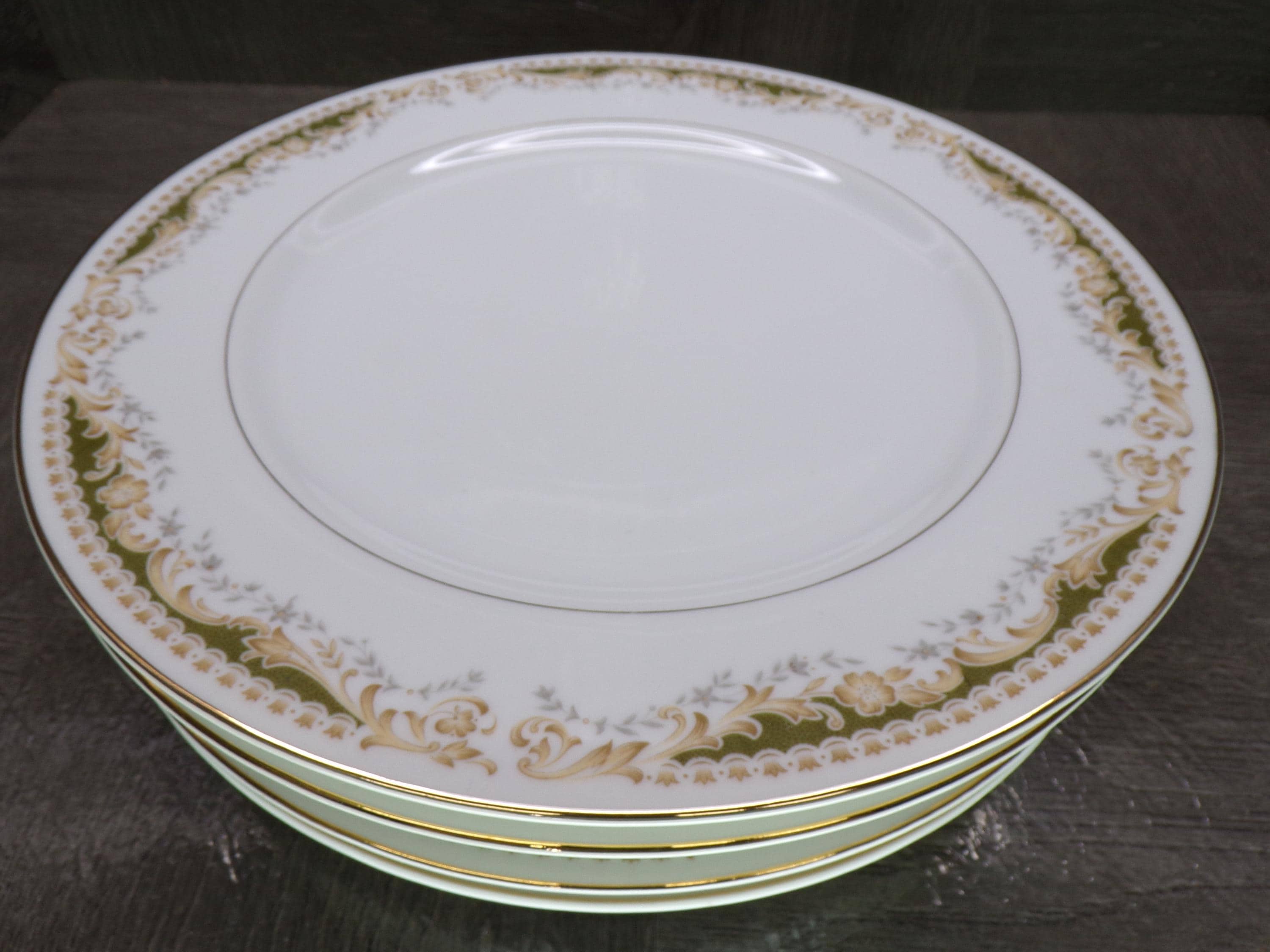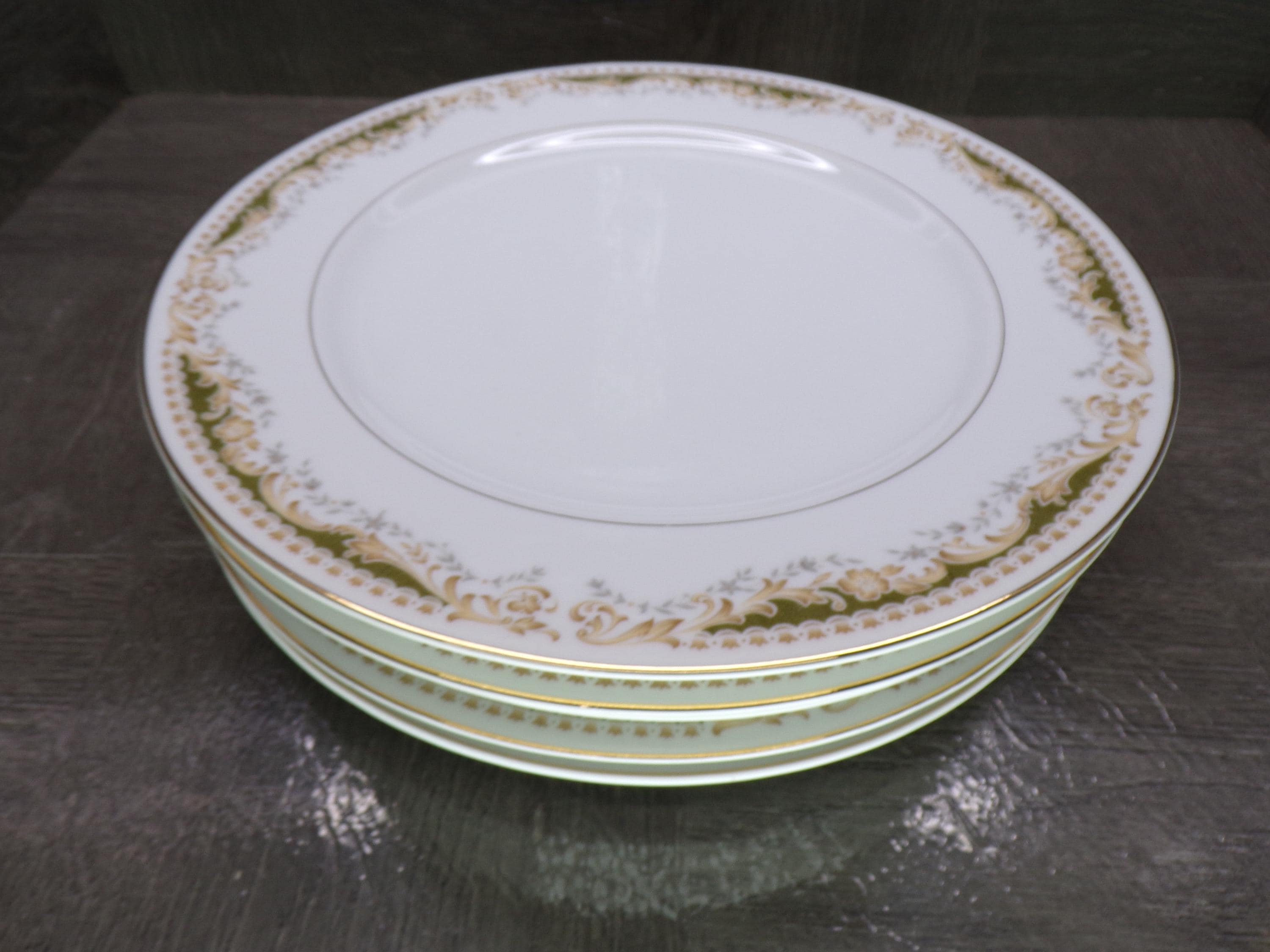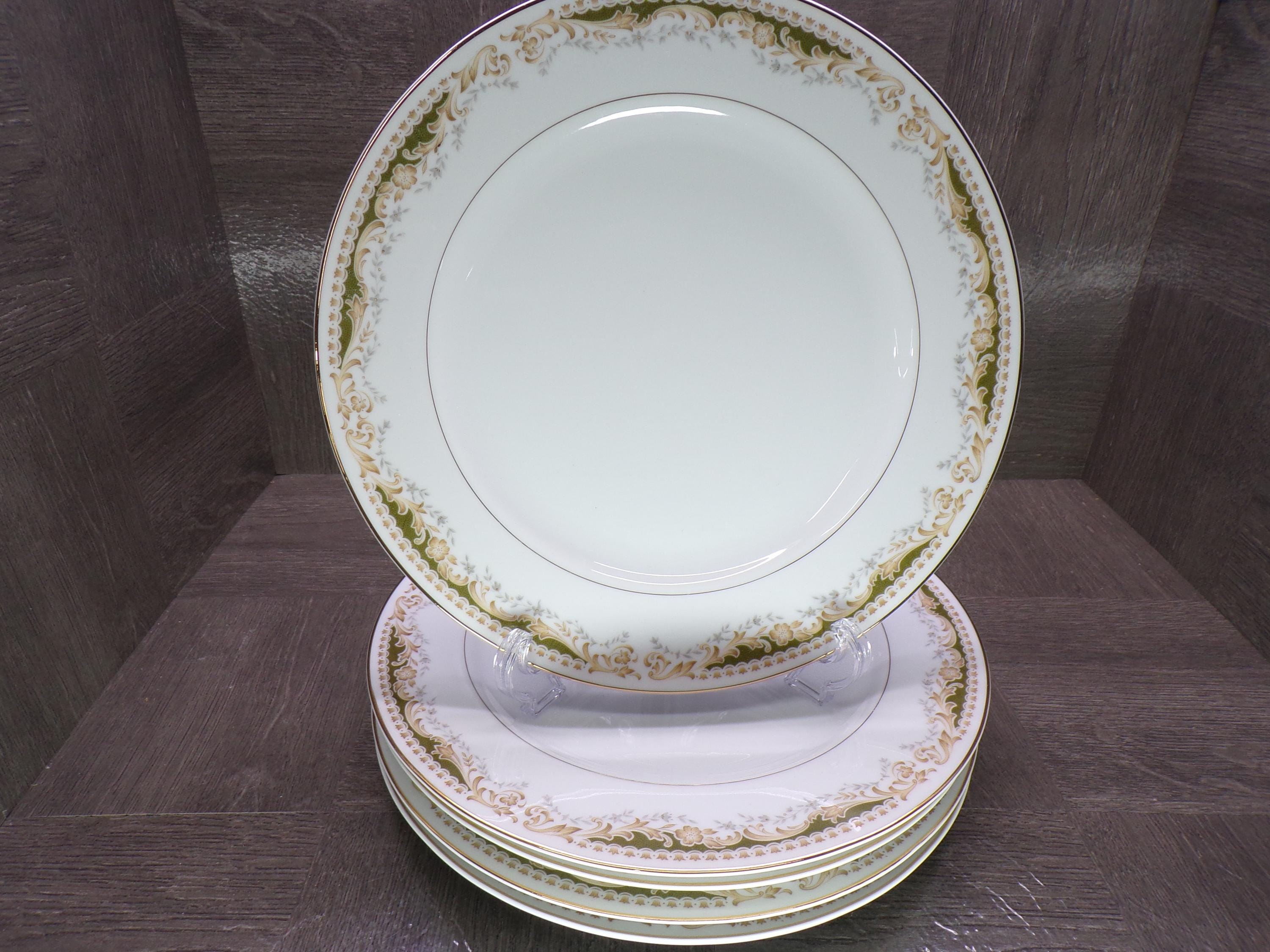 2602 Queen Anne MS Vintage #113 Signature Collection Fine China 10.25" Dinner Plates Set of 5 Green & Gold Floral - Japan - Great Condition