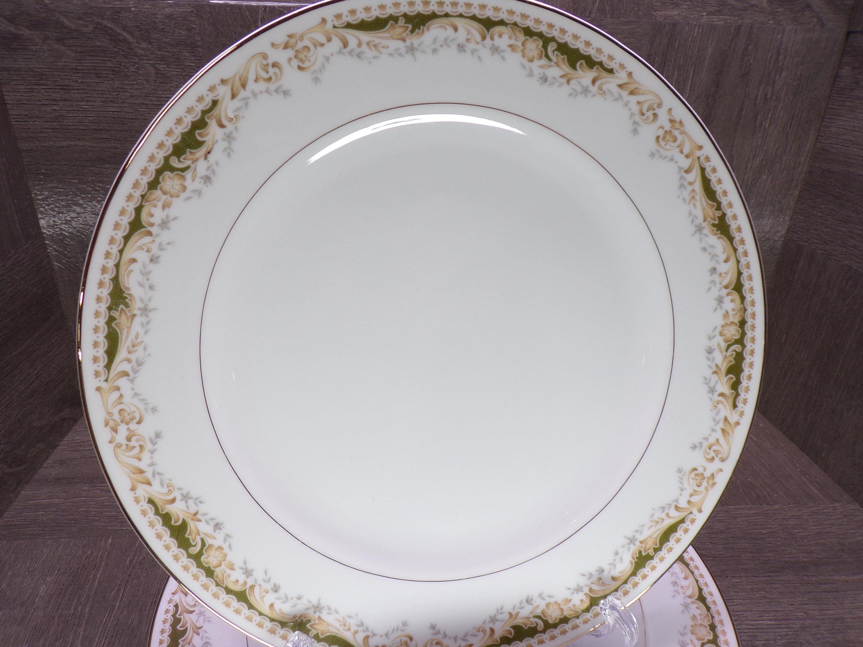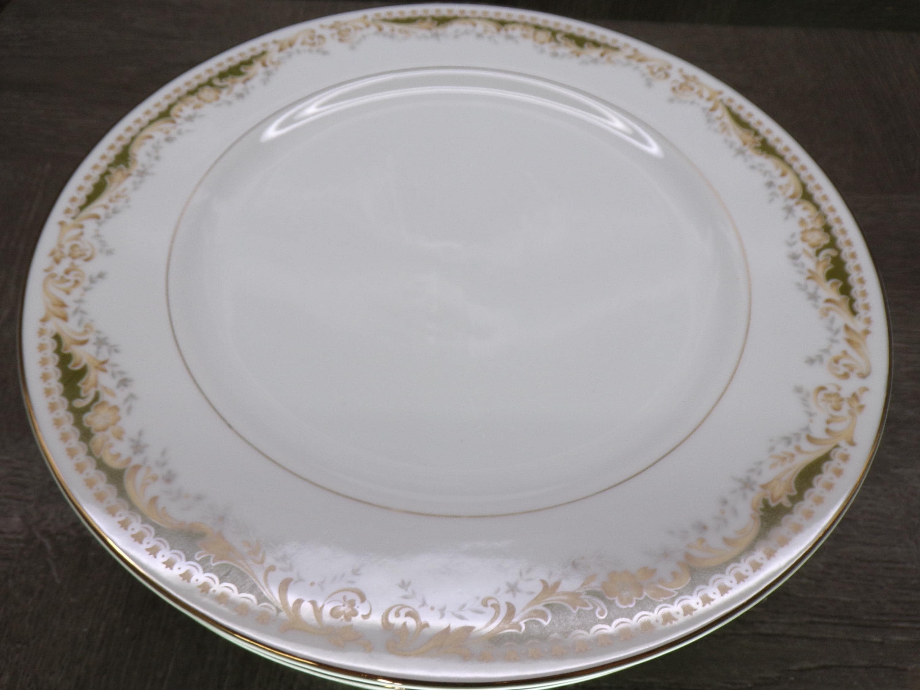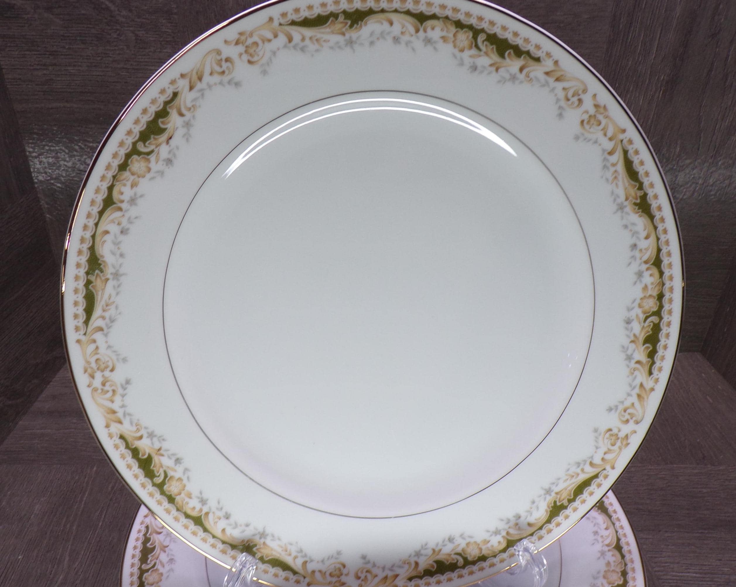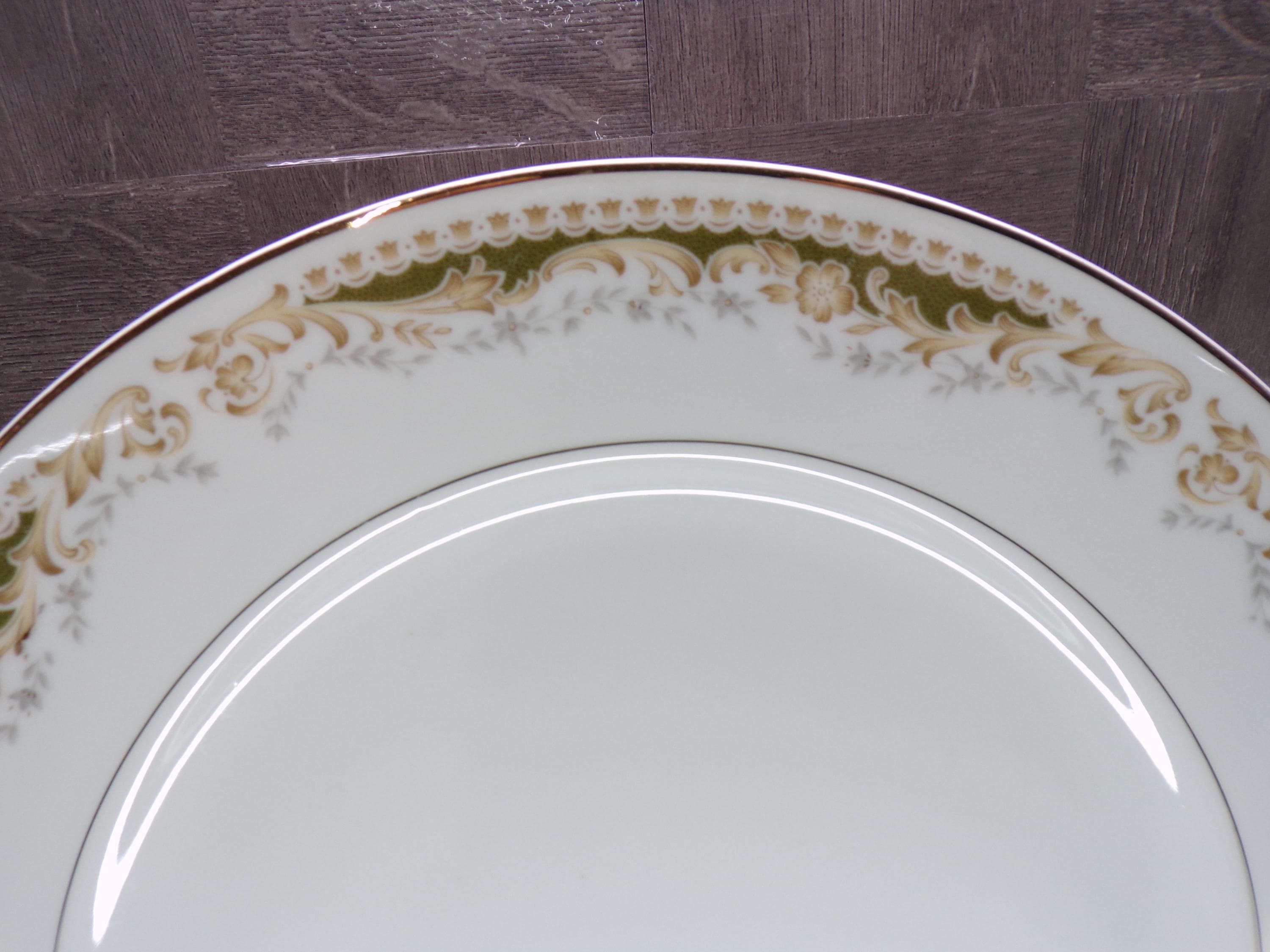 2602 Queen Anne MS Vintage #113 Signature Collection Fine China 10.25" Dinner Plates Set of 5 Green & Gold Floral - Japan - Great Condition