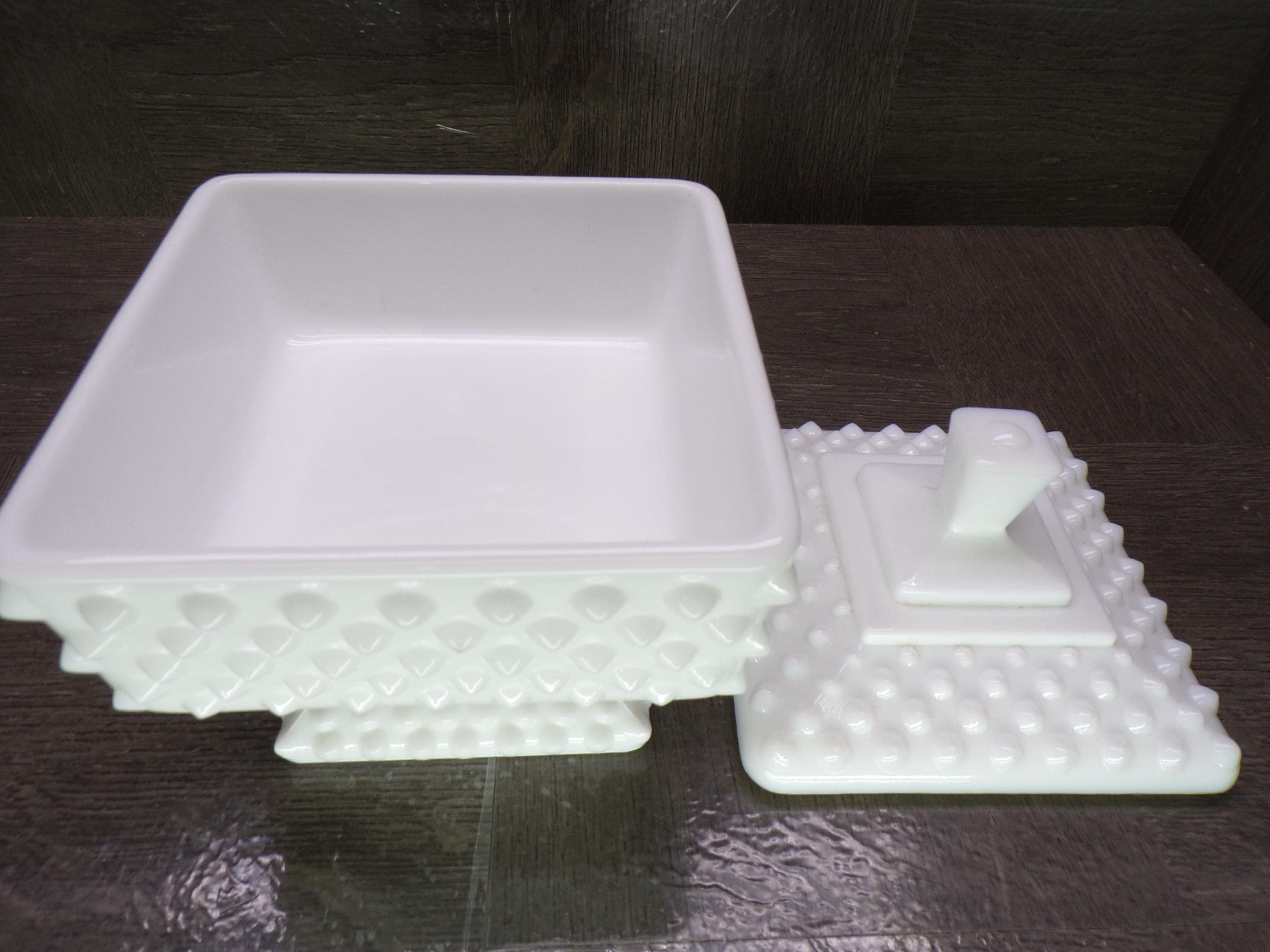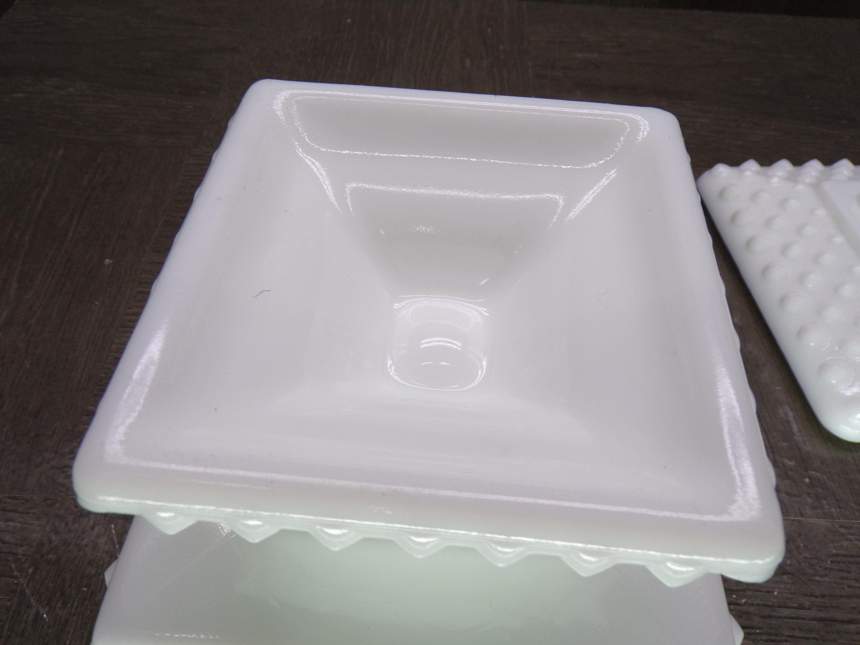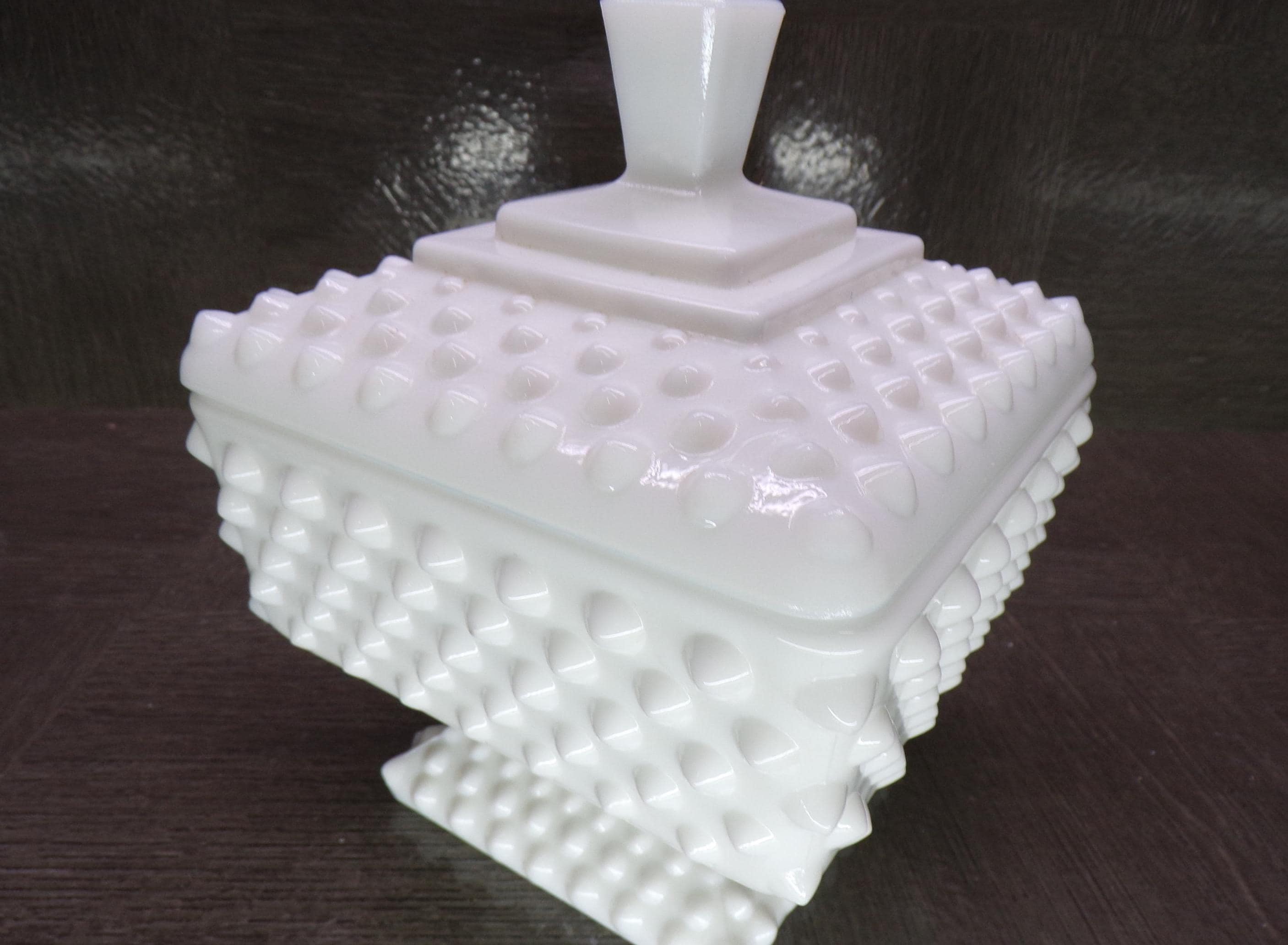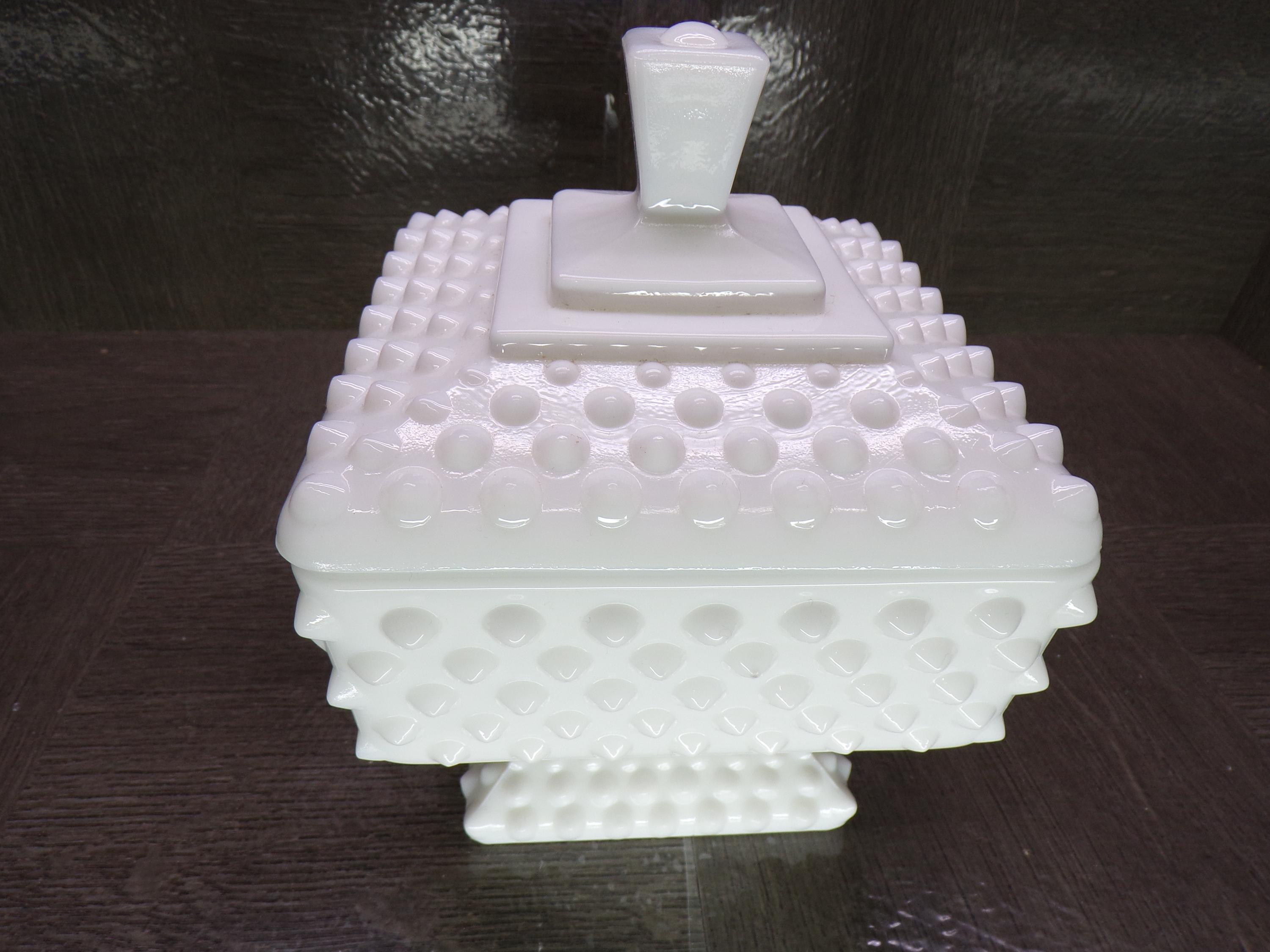 2602 Vintage White Milk Glass Hobnail 5" Tall Footed Square Compote Candy Dish - Great Condition