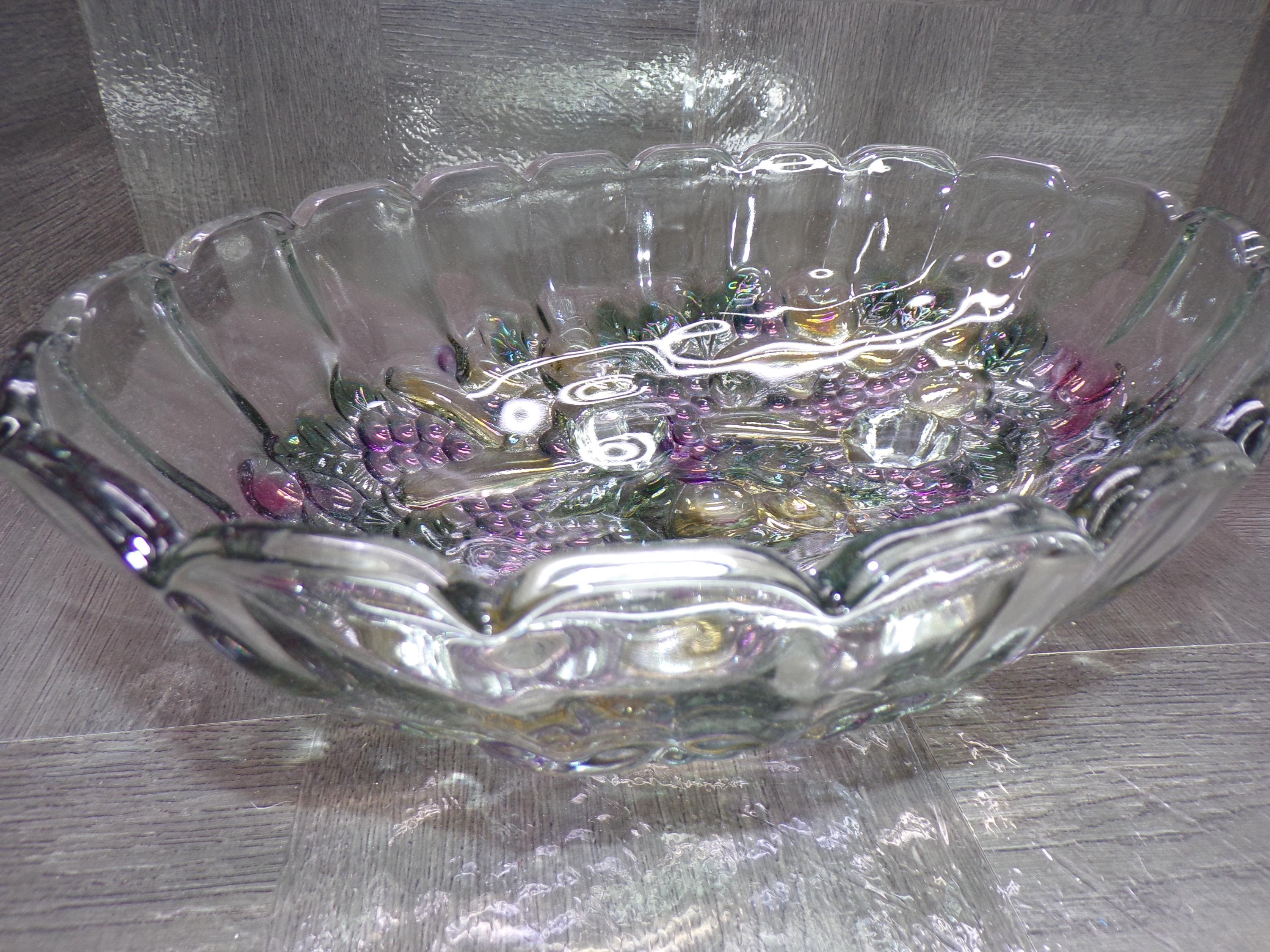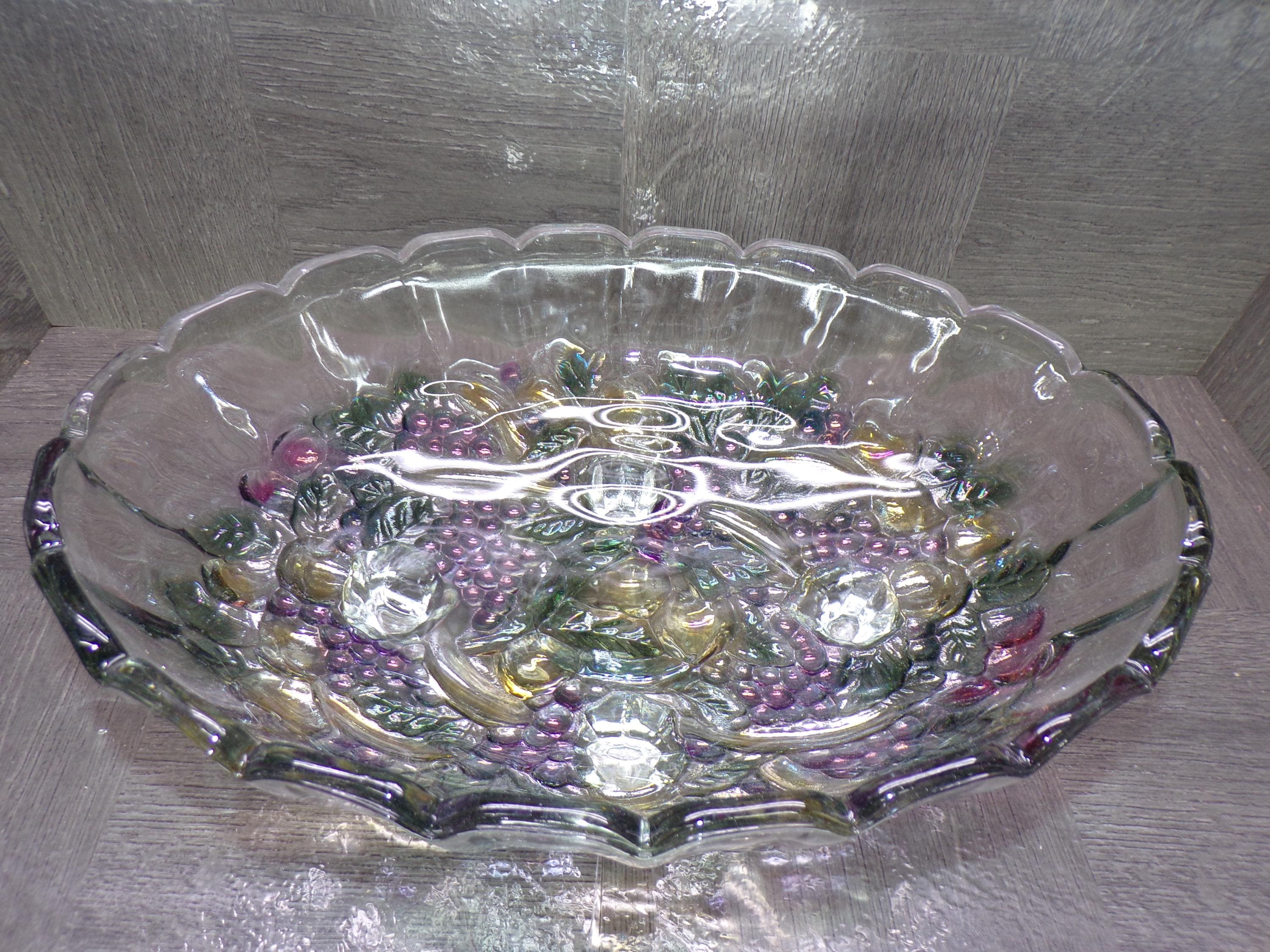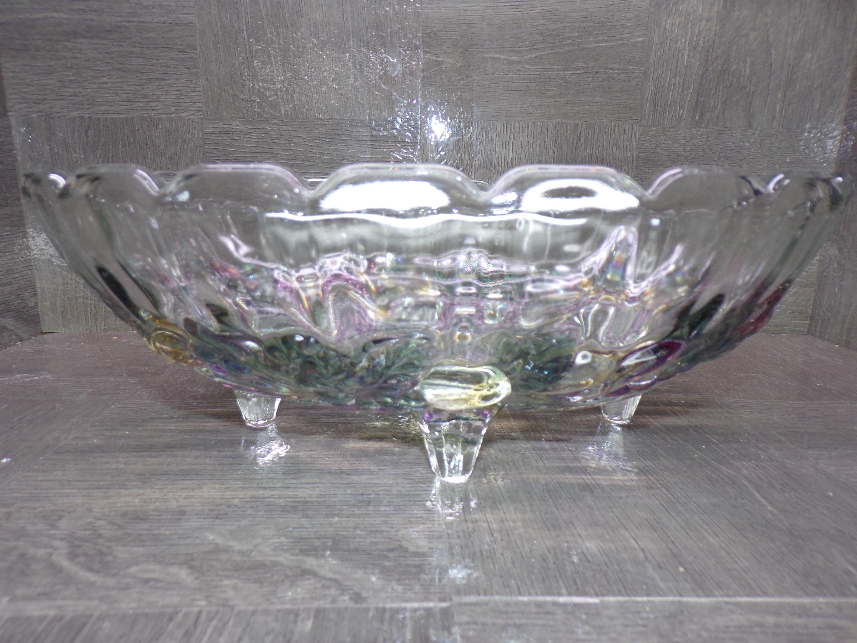 2602 Beautiful Vintage Indiana Glass Footed 8" x 12" Clear / Colored Embossed Oval Panel Glass Fruit Bowl - Great Condition