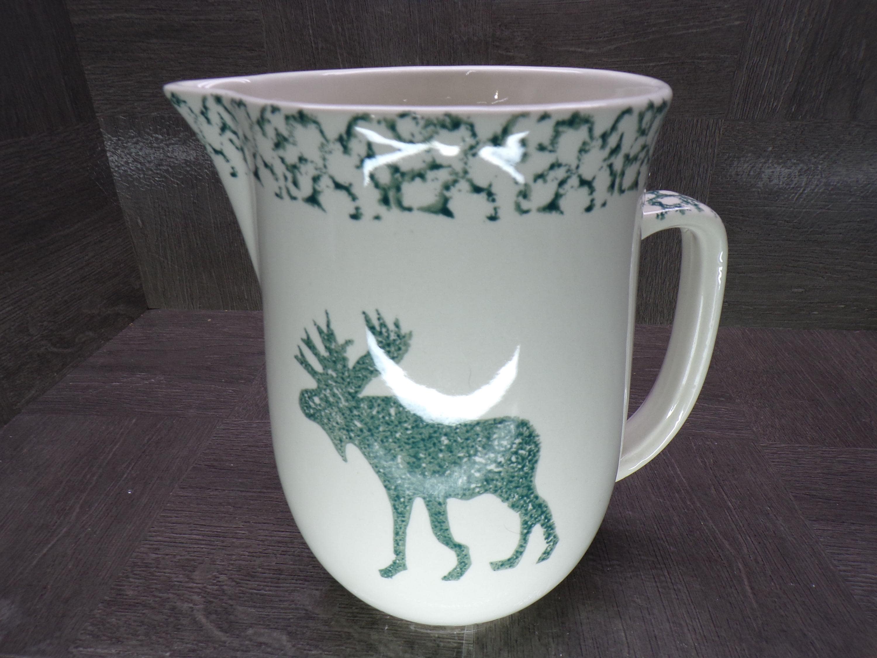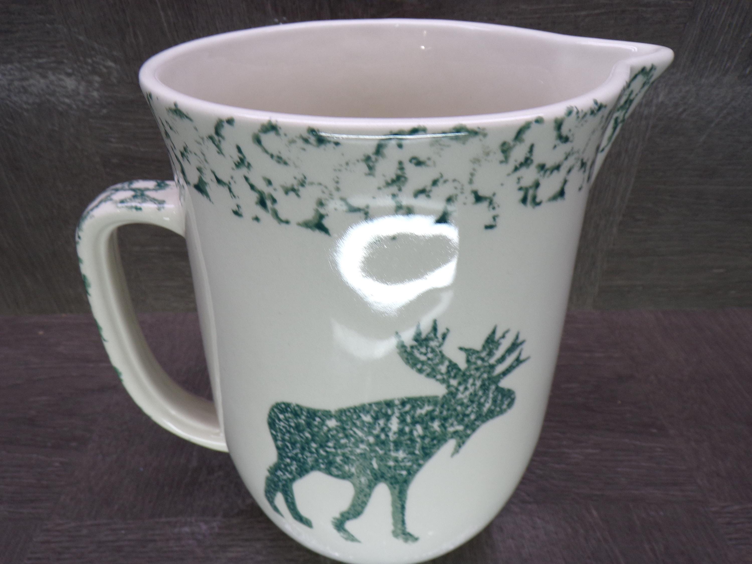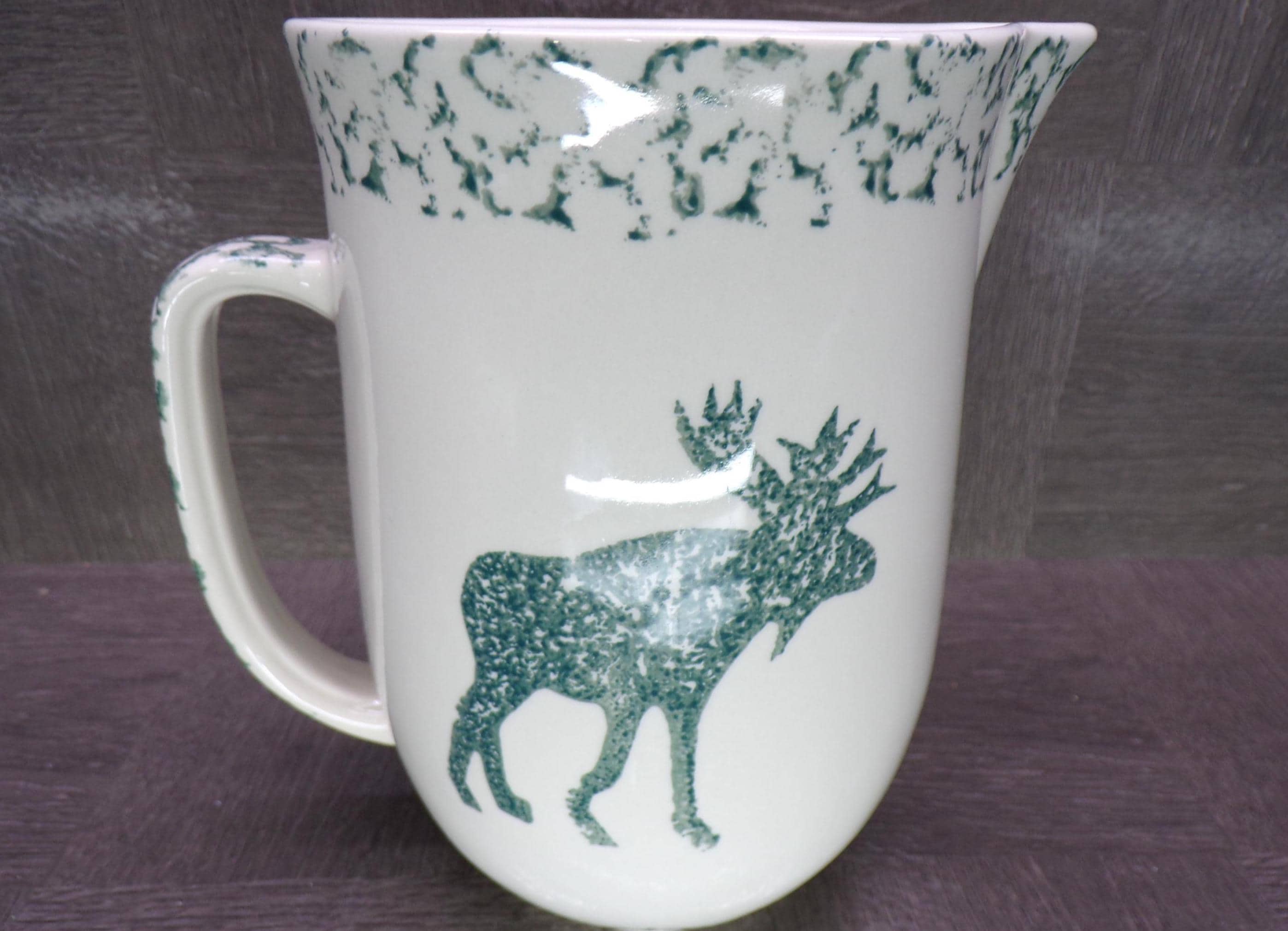 2602 Folk Craft Moose Country, Pinecone, Green Sponge Vintage 7.5" Tall x 5" Wide 48 oz Stoneware Pitcher by Tienshan - Great Condition