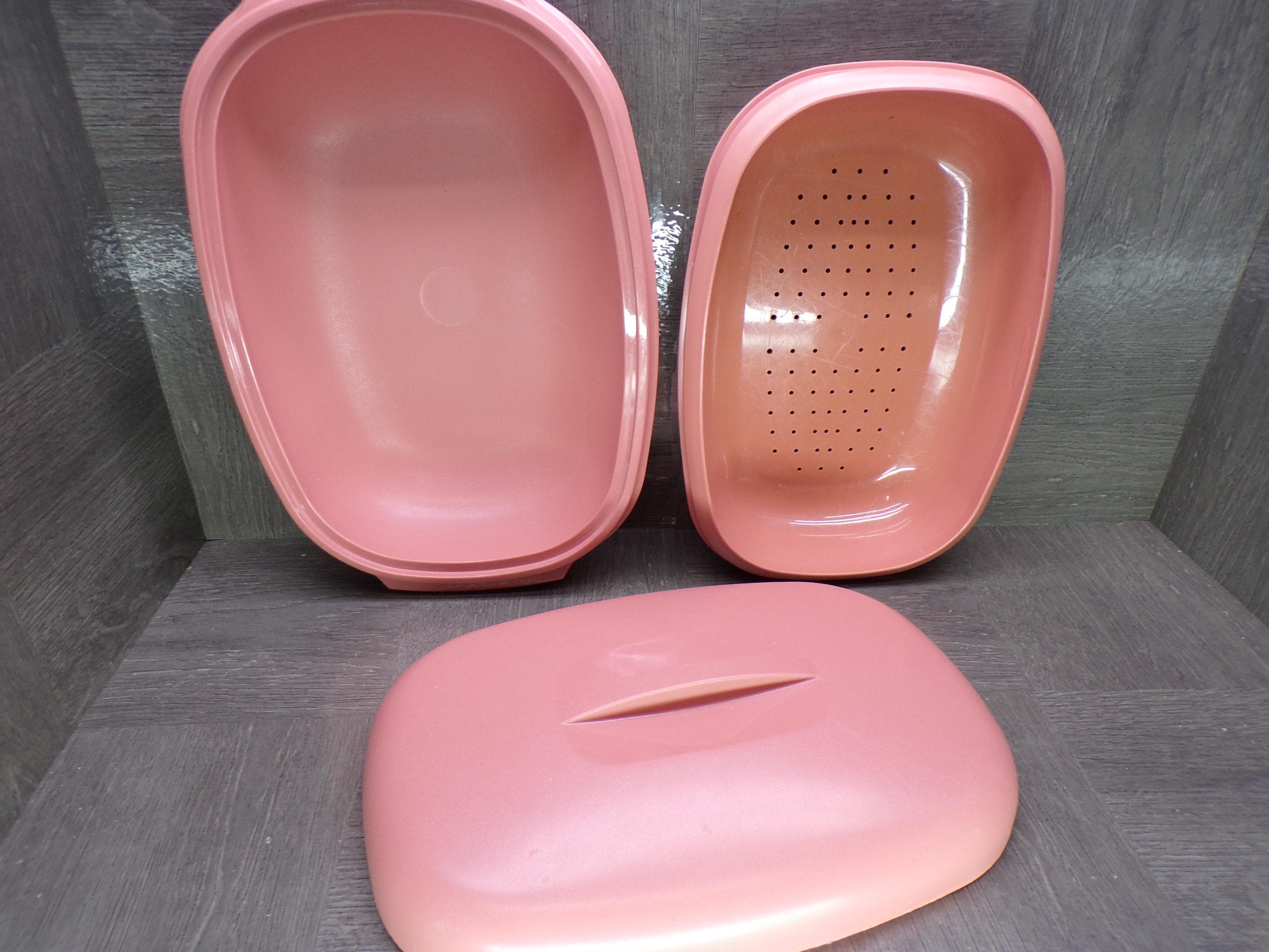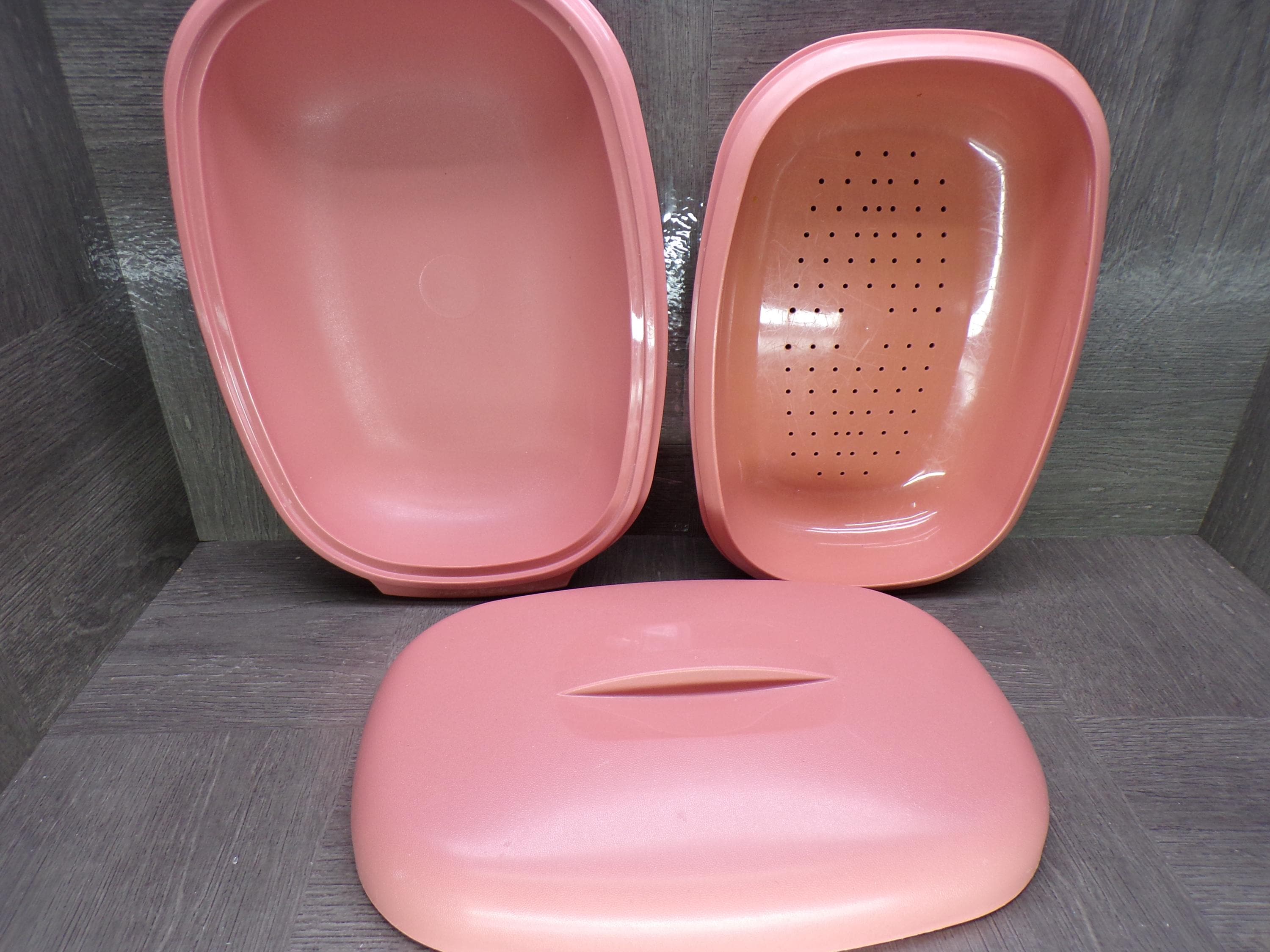 2602 Tupperware Vintage 11.5" x 8" Microwave Steamer Oval Serving Bowl 3 Pc Dusty Rose Pink 1275-3 - Great Condition