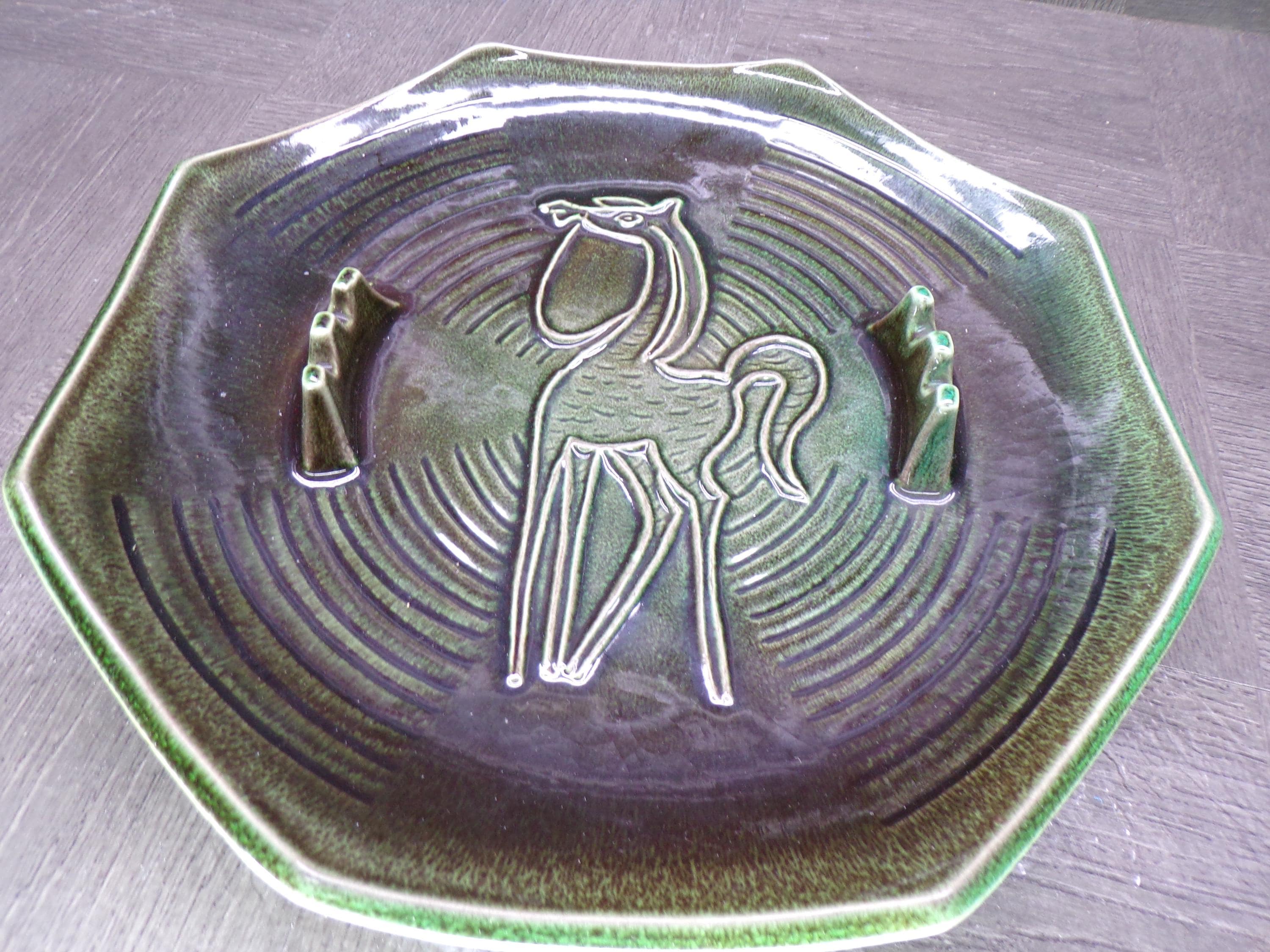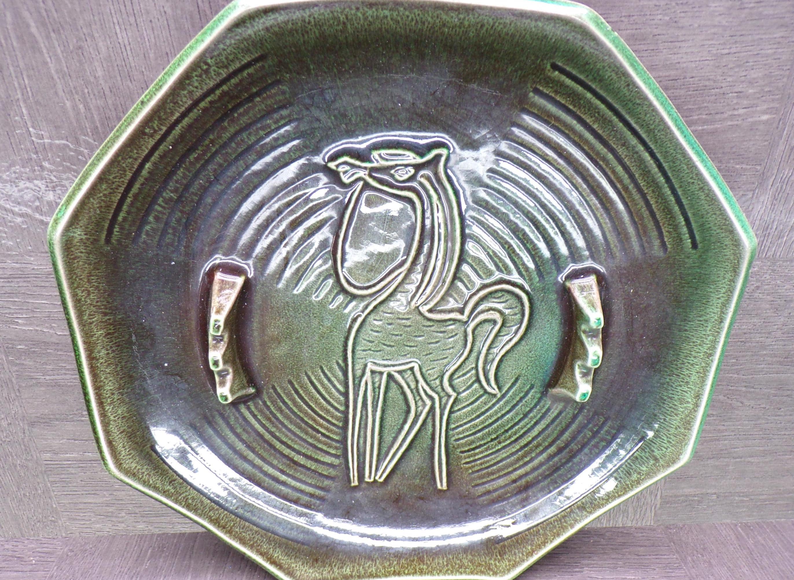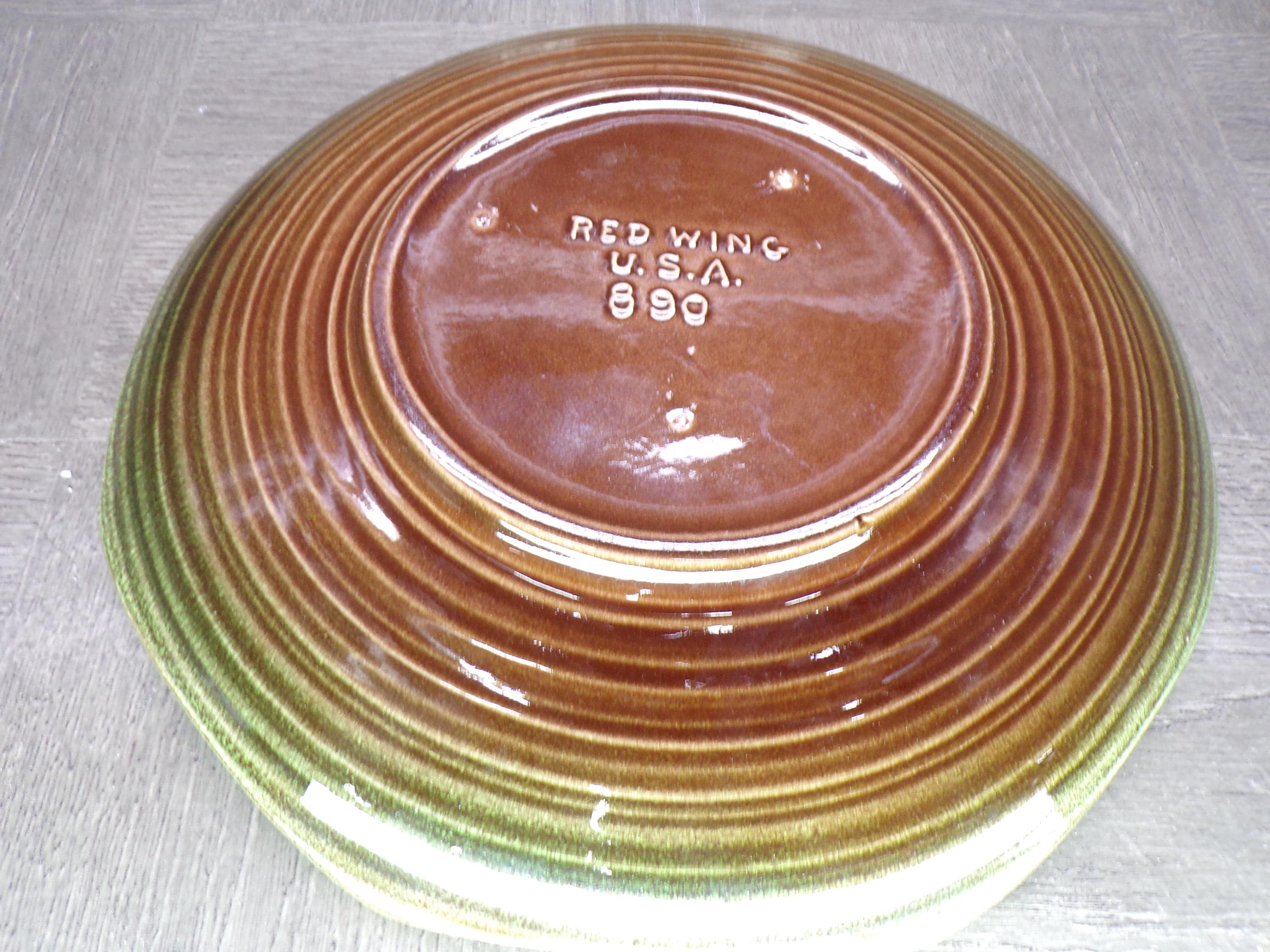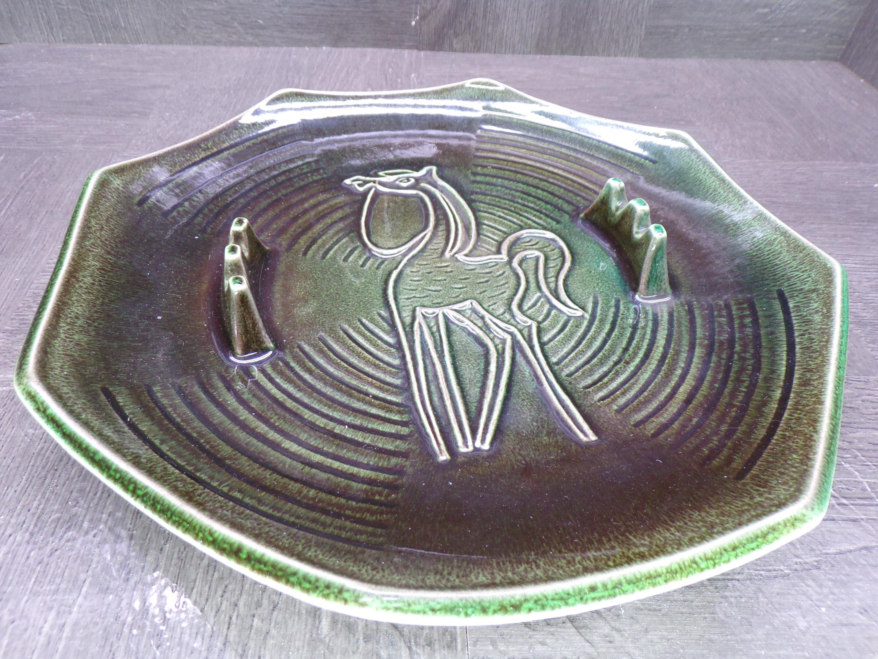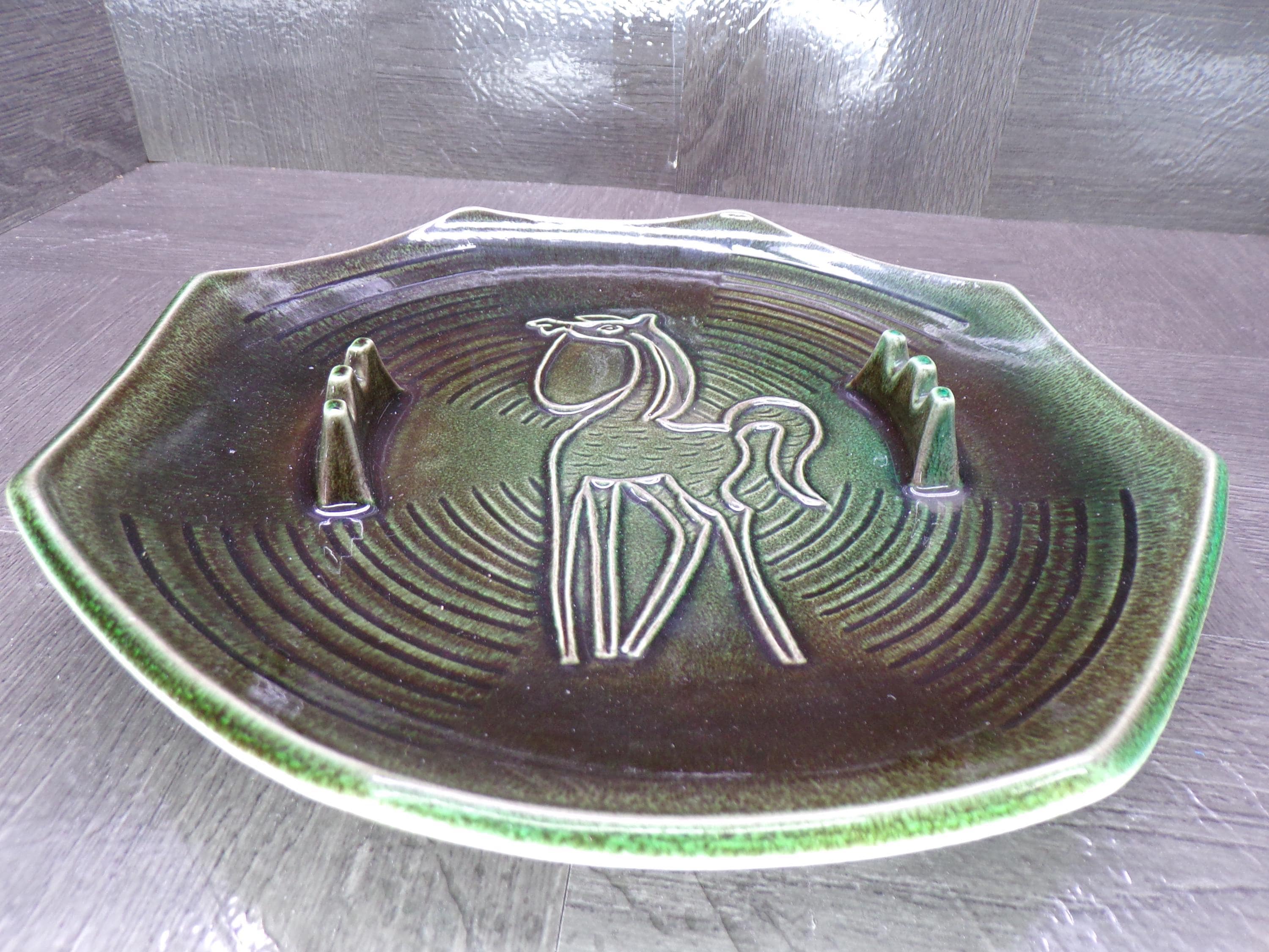 2602 Red Wing Pottery Vintage 1940's Pony Horse Ashtray 9.5" Green w/ Brown Fade & Brown Backside Made in the USA - Excellent Condition