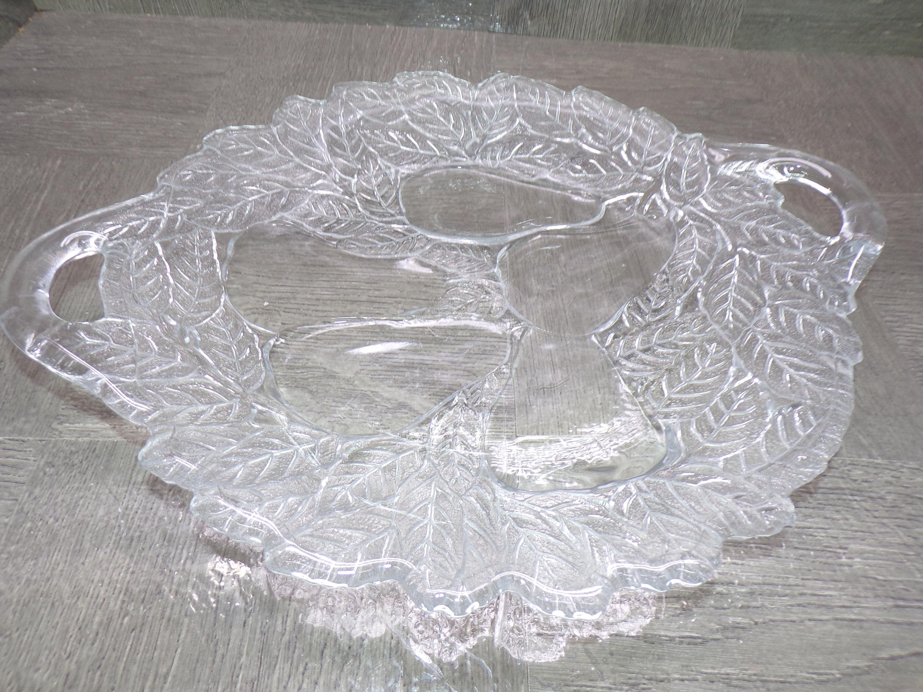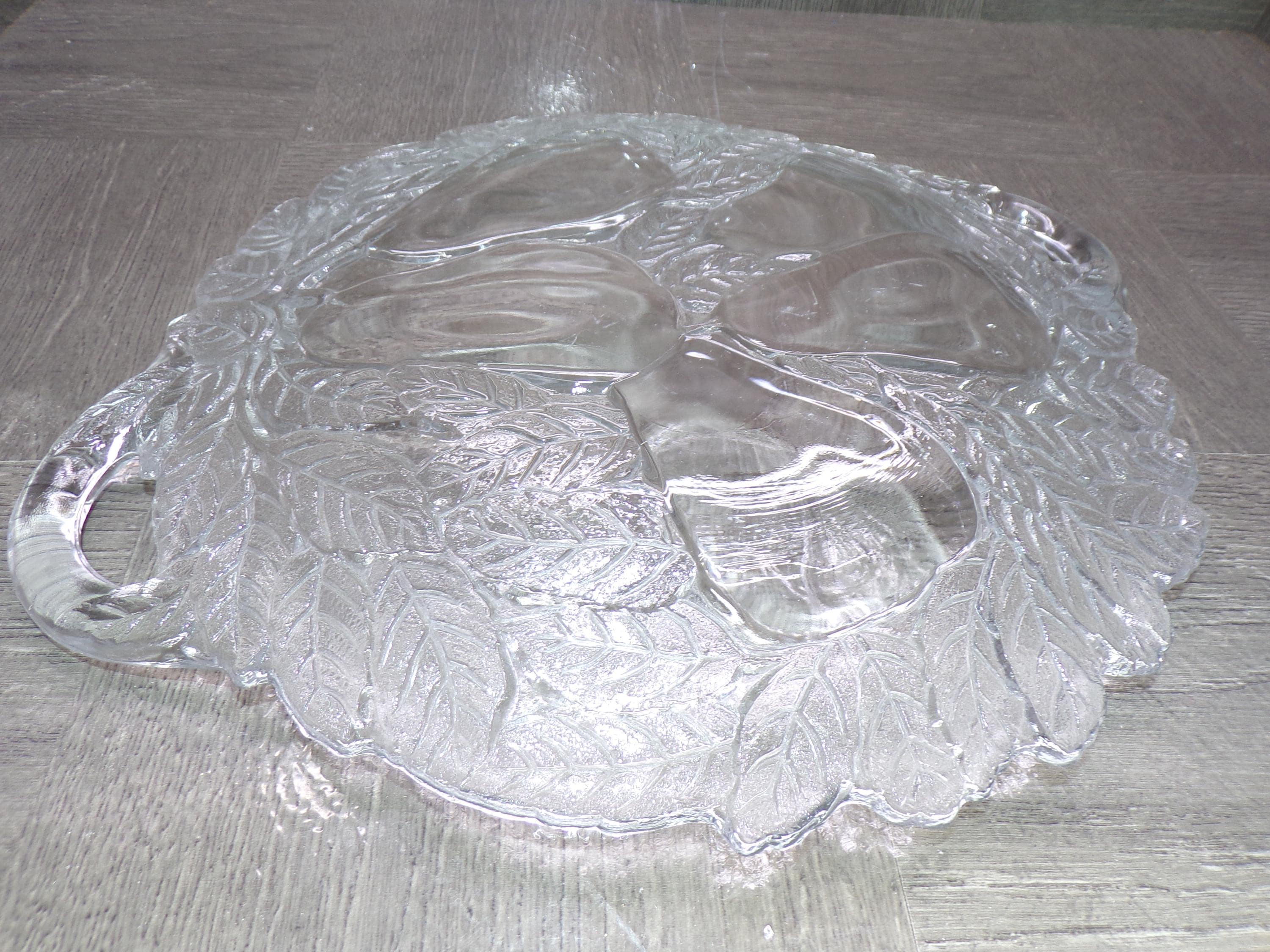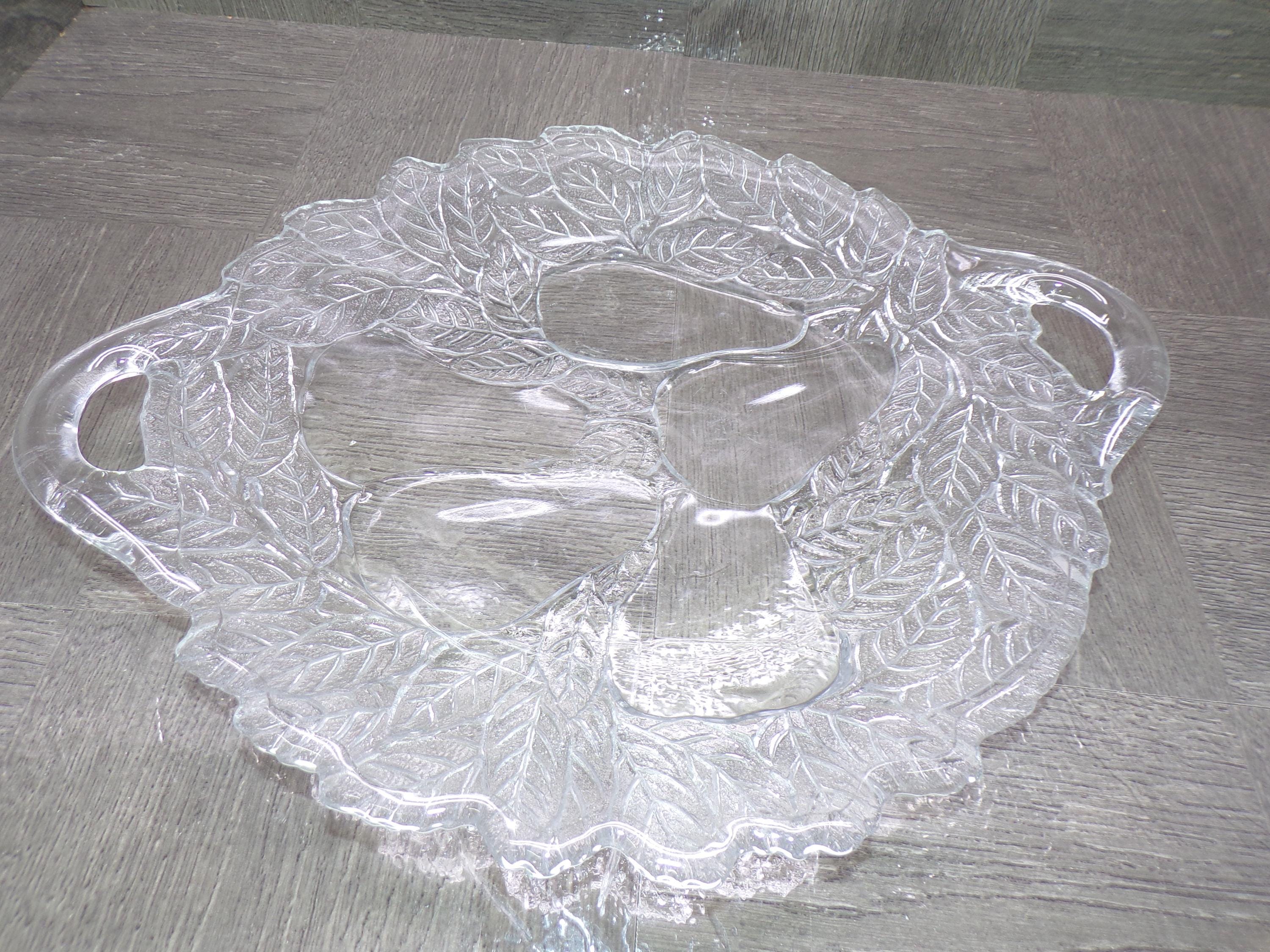 2602 Indiana Glass Vintage 12.5" x 10.25" Sweet Pear Avocado Pressed Glass Tray w/ Pressed Leaf Border - Good Condition Light Scratches