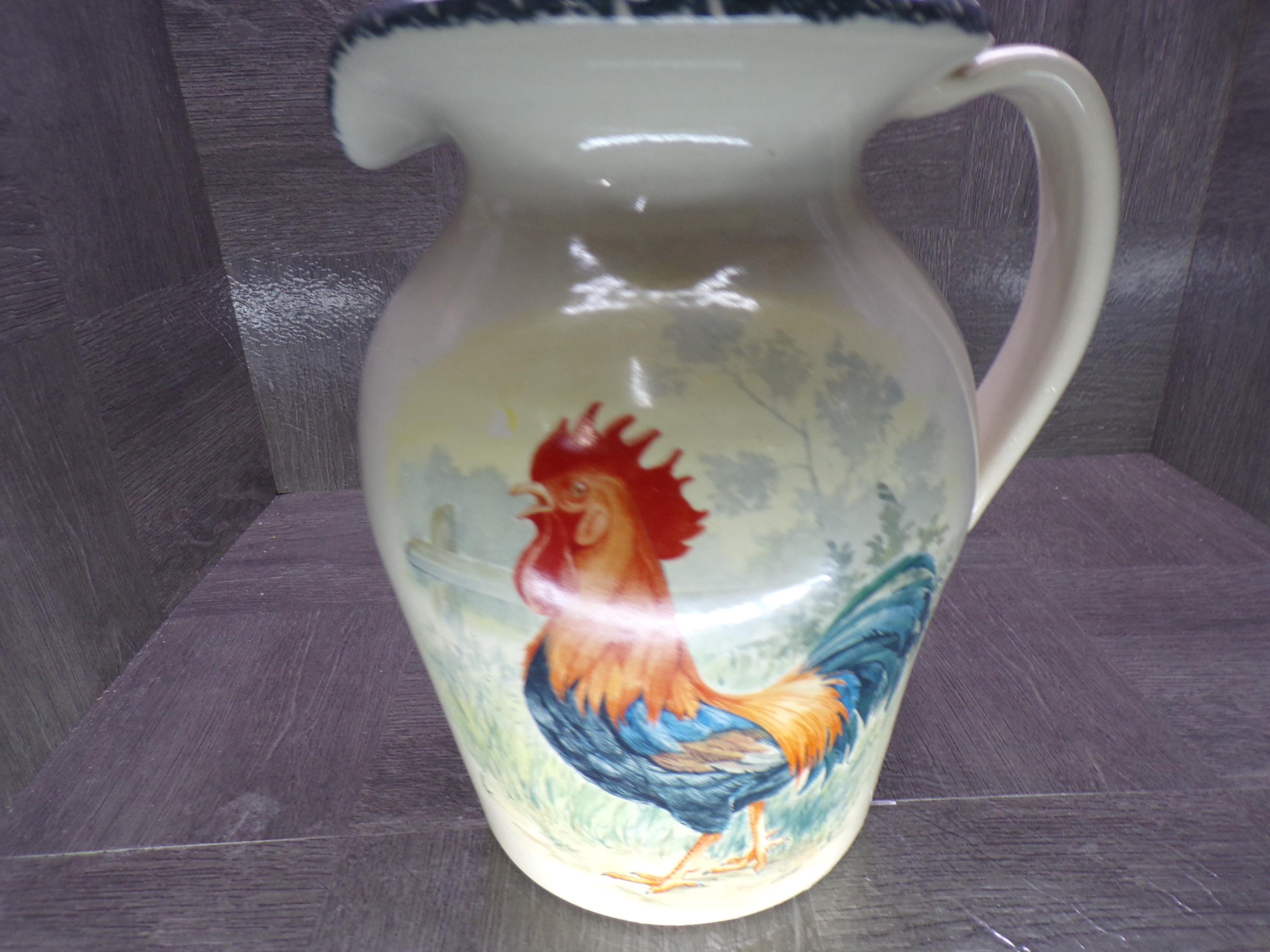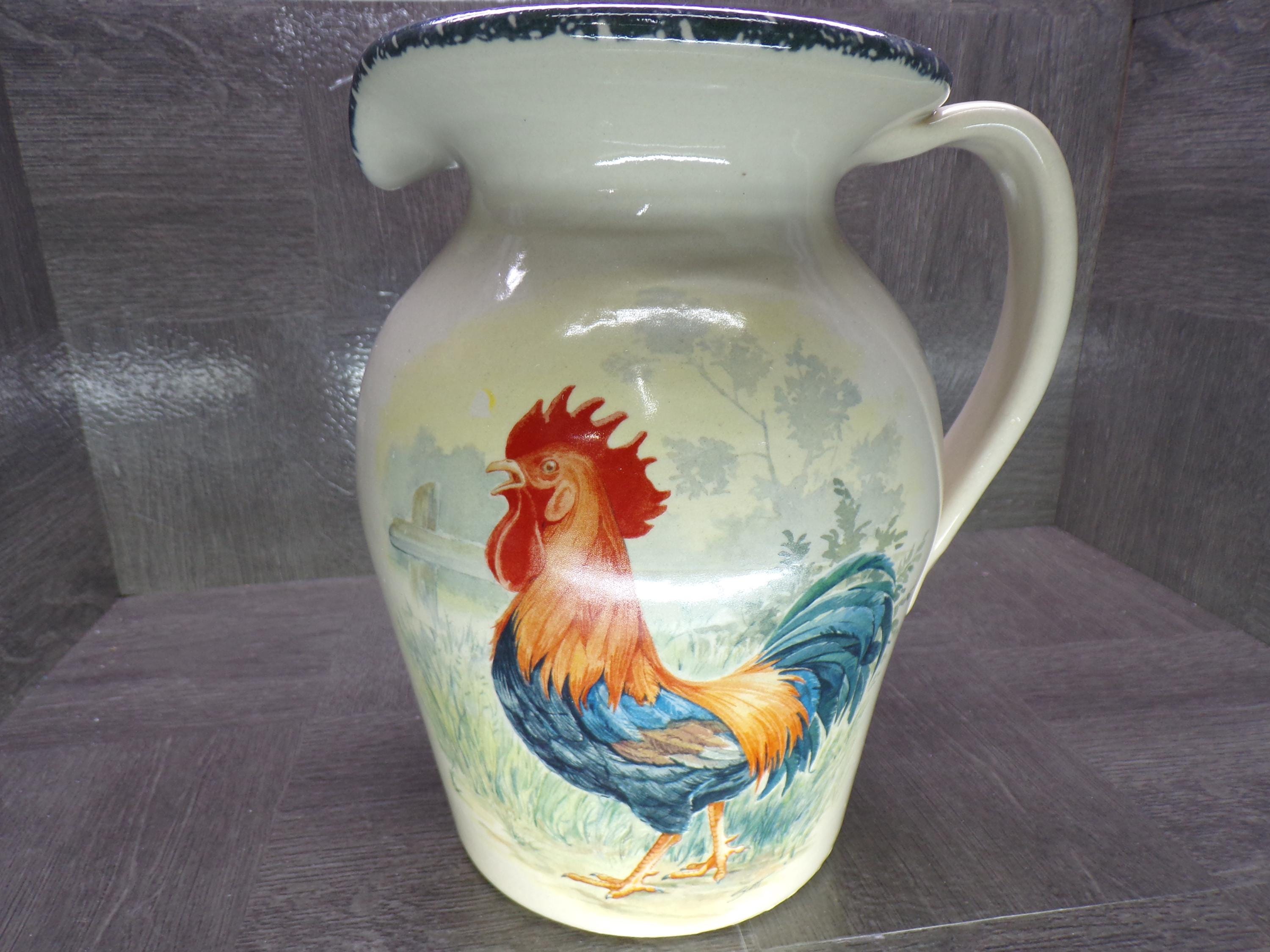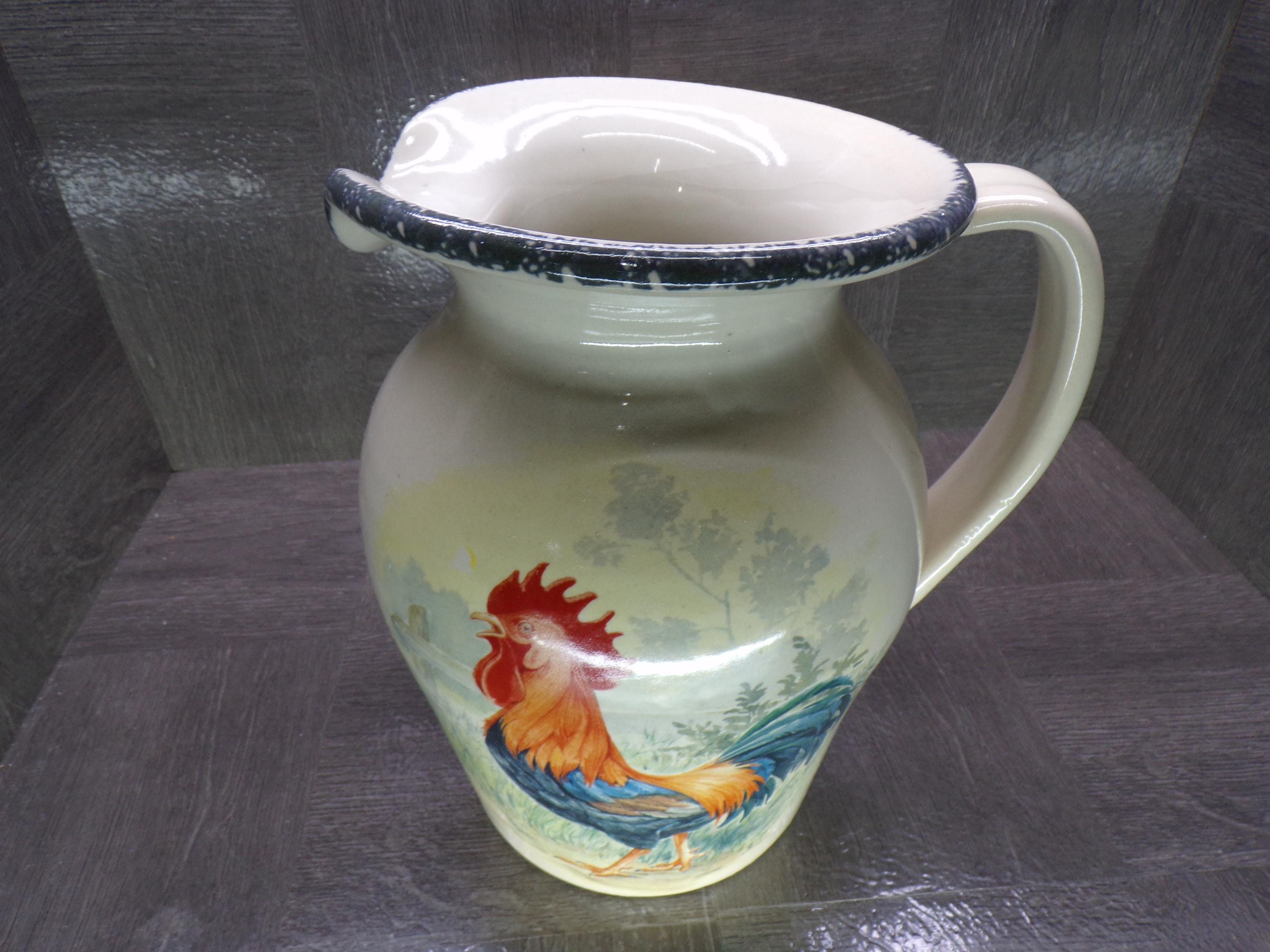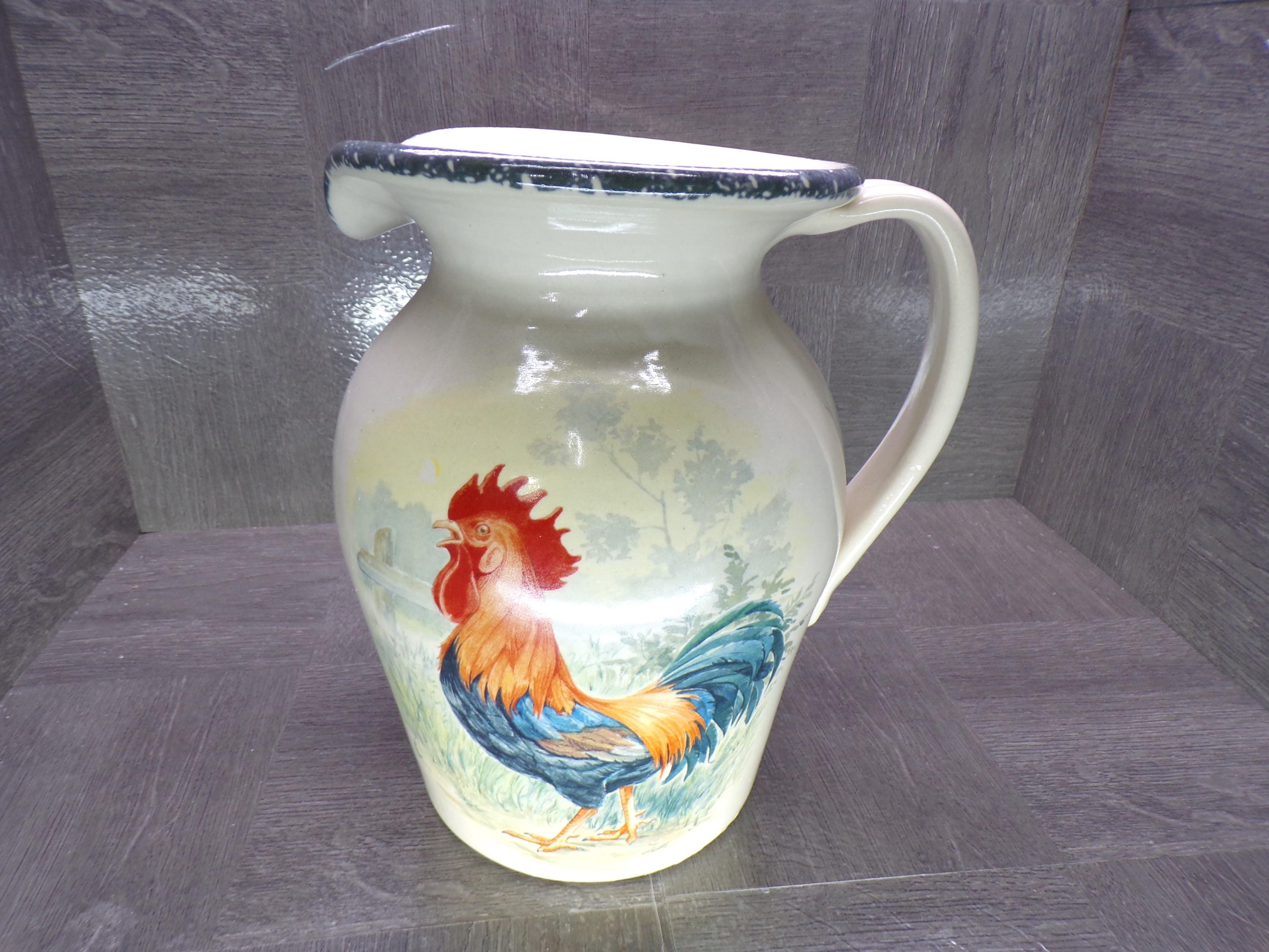 Home & Garden Party Rooster 9.5" Stoneware Pitcher Vintage 2001 - Great Condition Outside, Dirty Stained Inside
