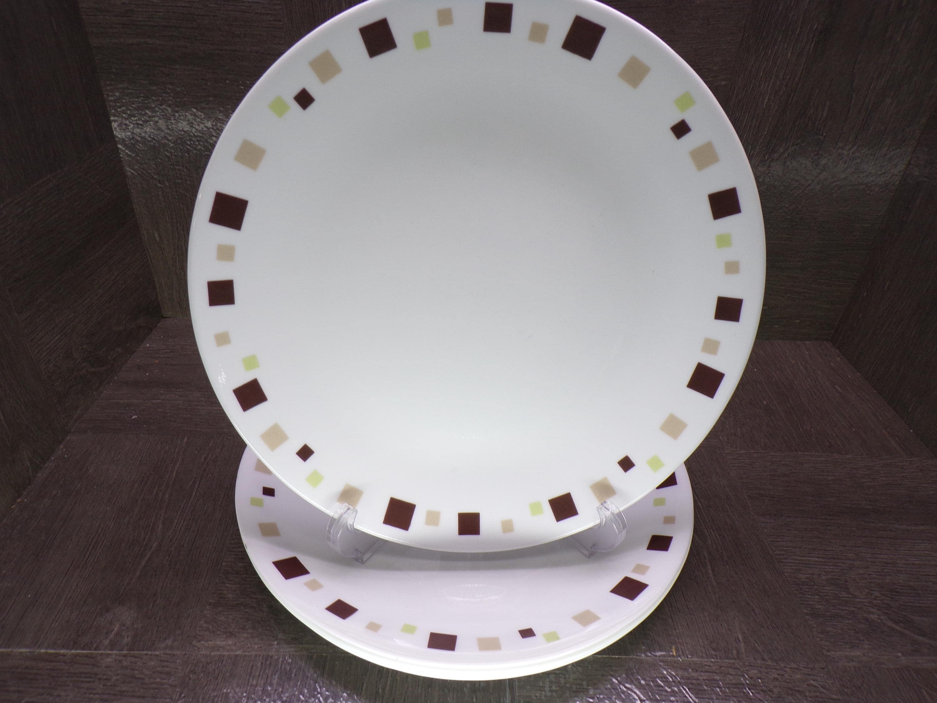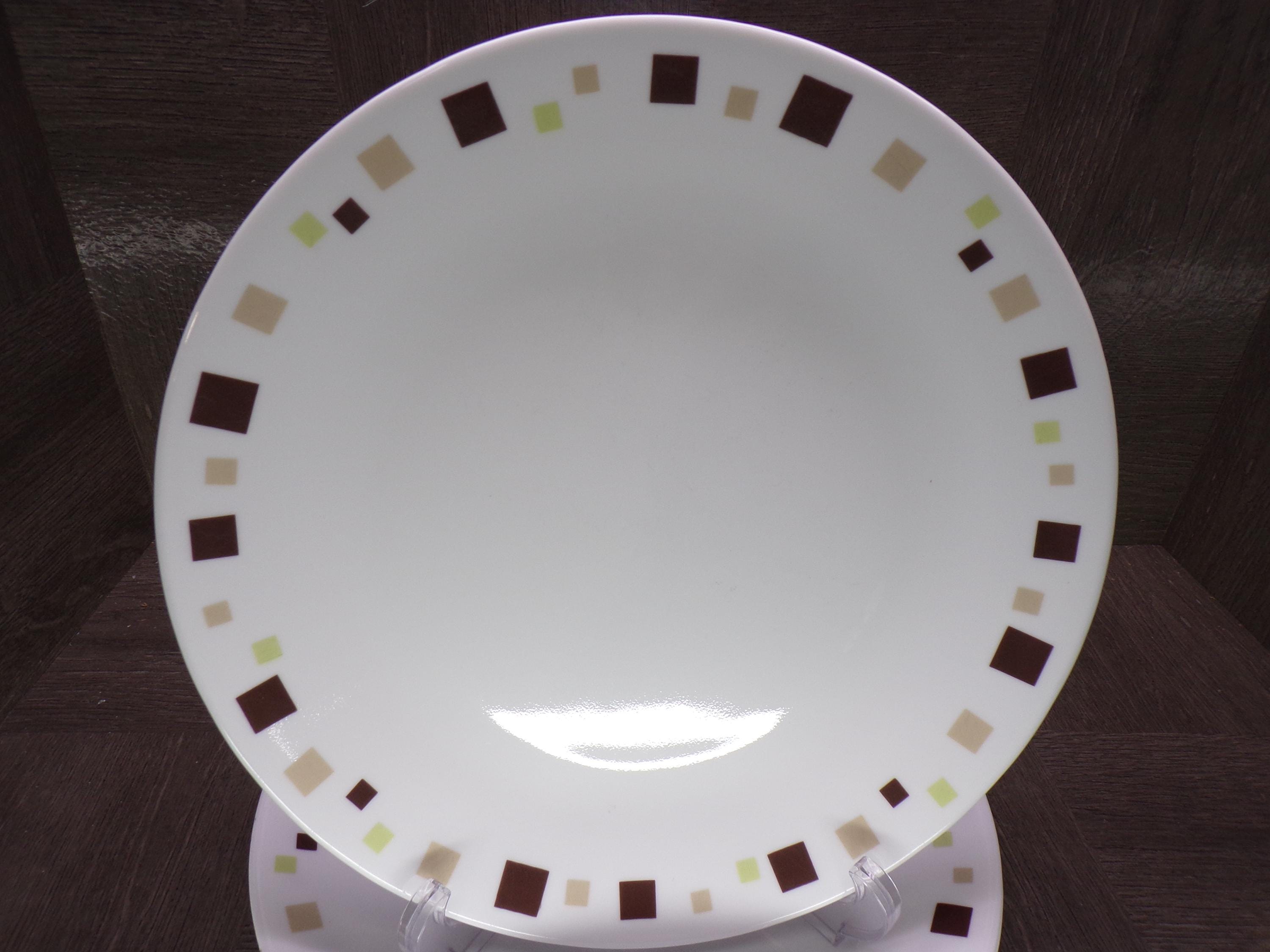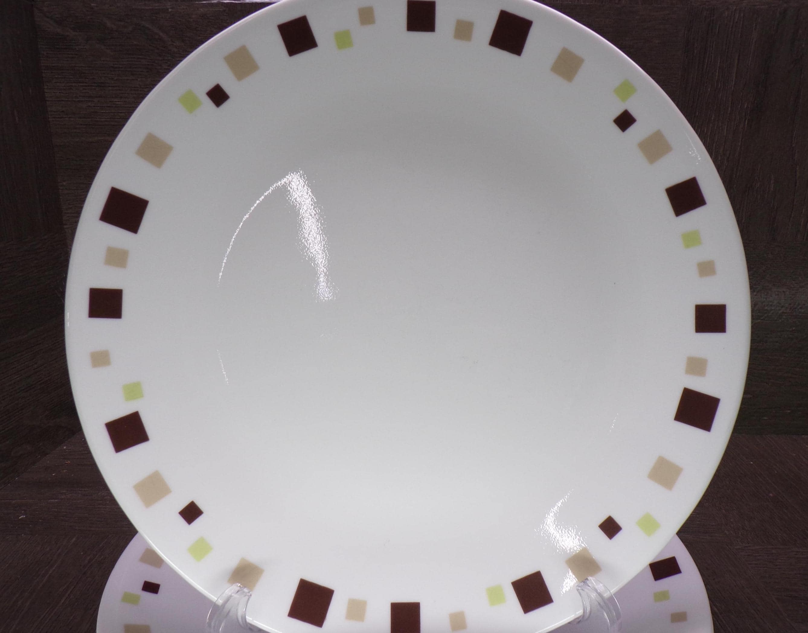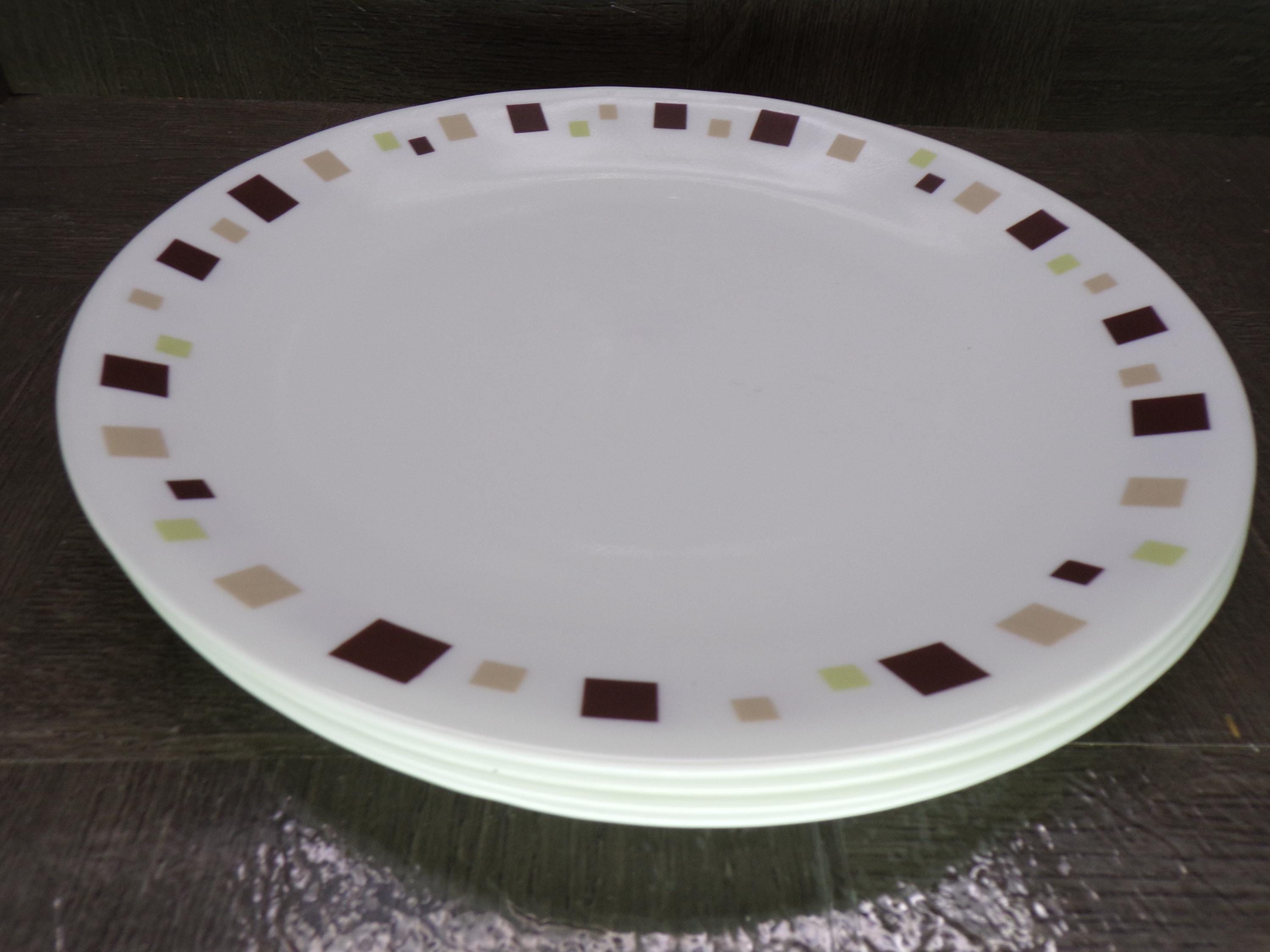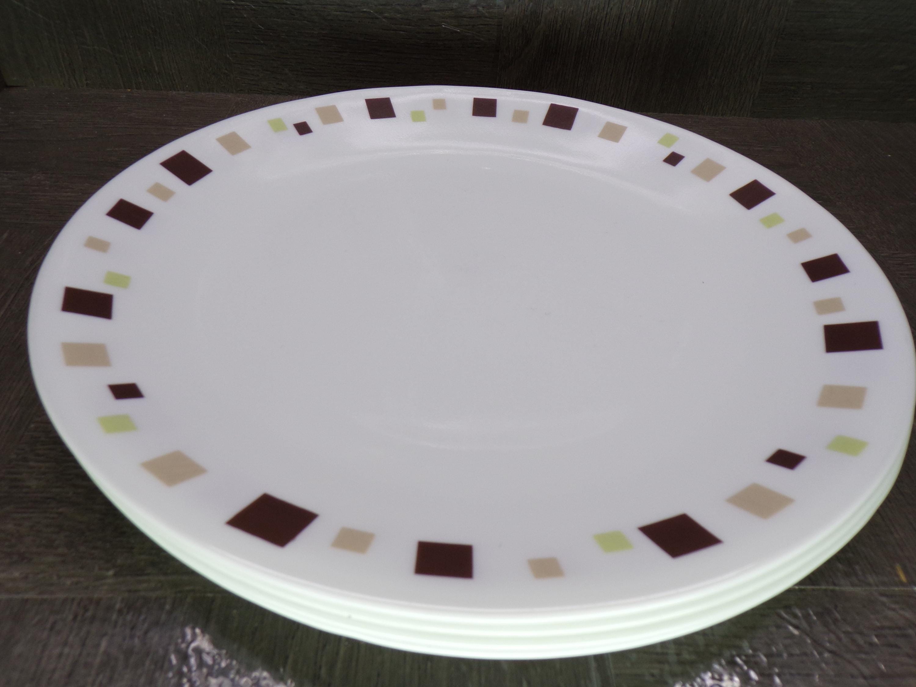 2602 Corelle Geometric Chocolate 10.25" Dinner Plates Set of 4 Vintage - Brown, Tan, Green Squares - Great Condition