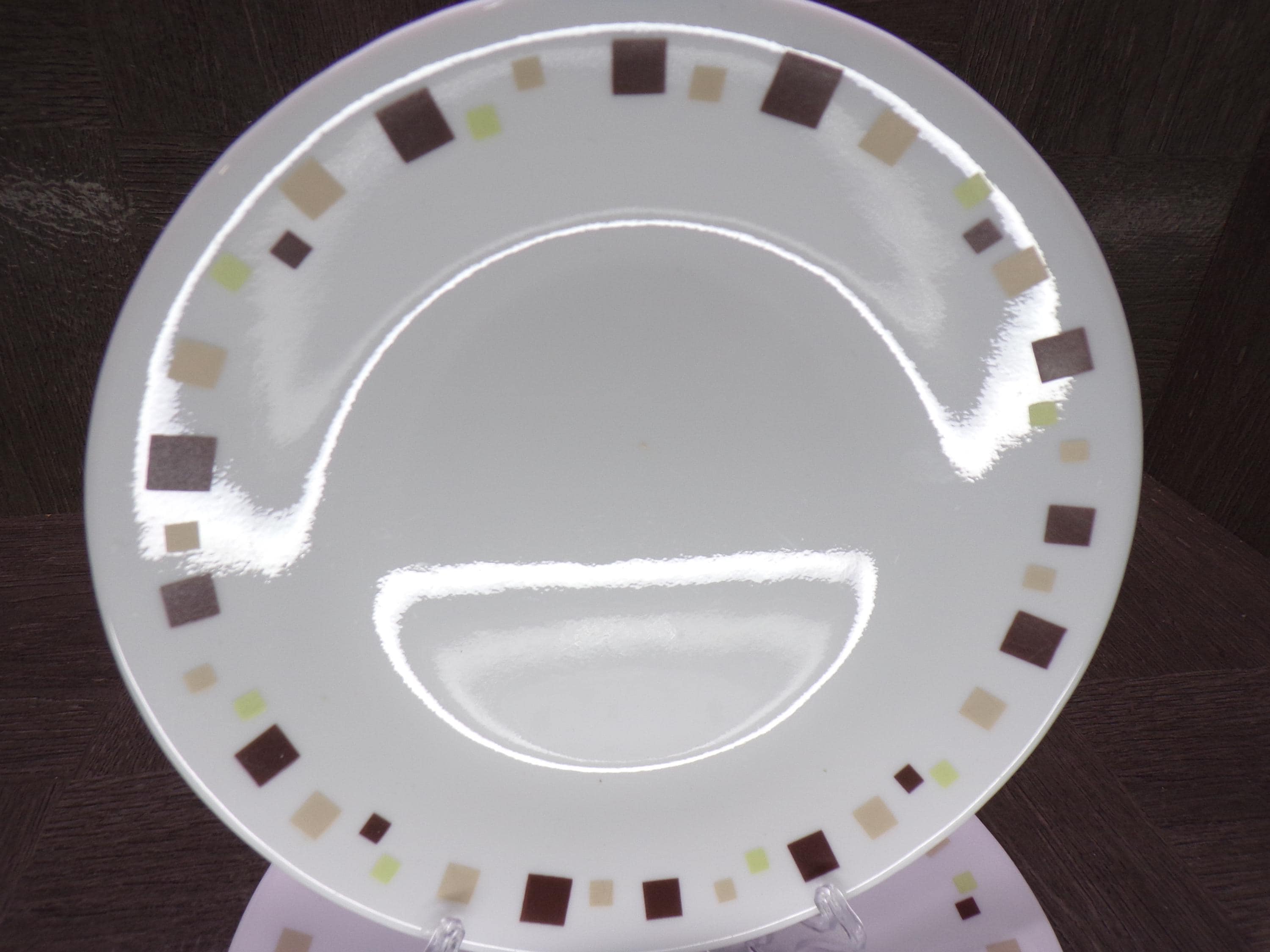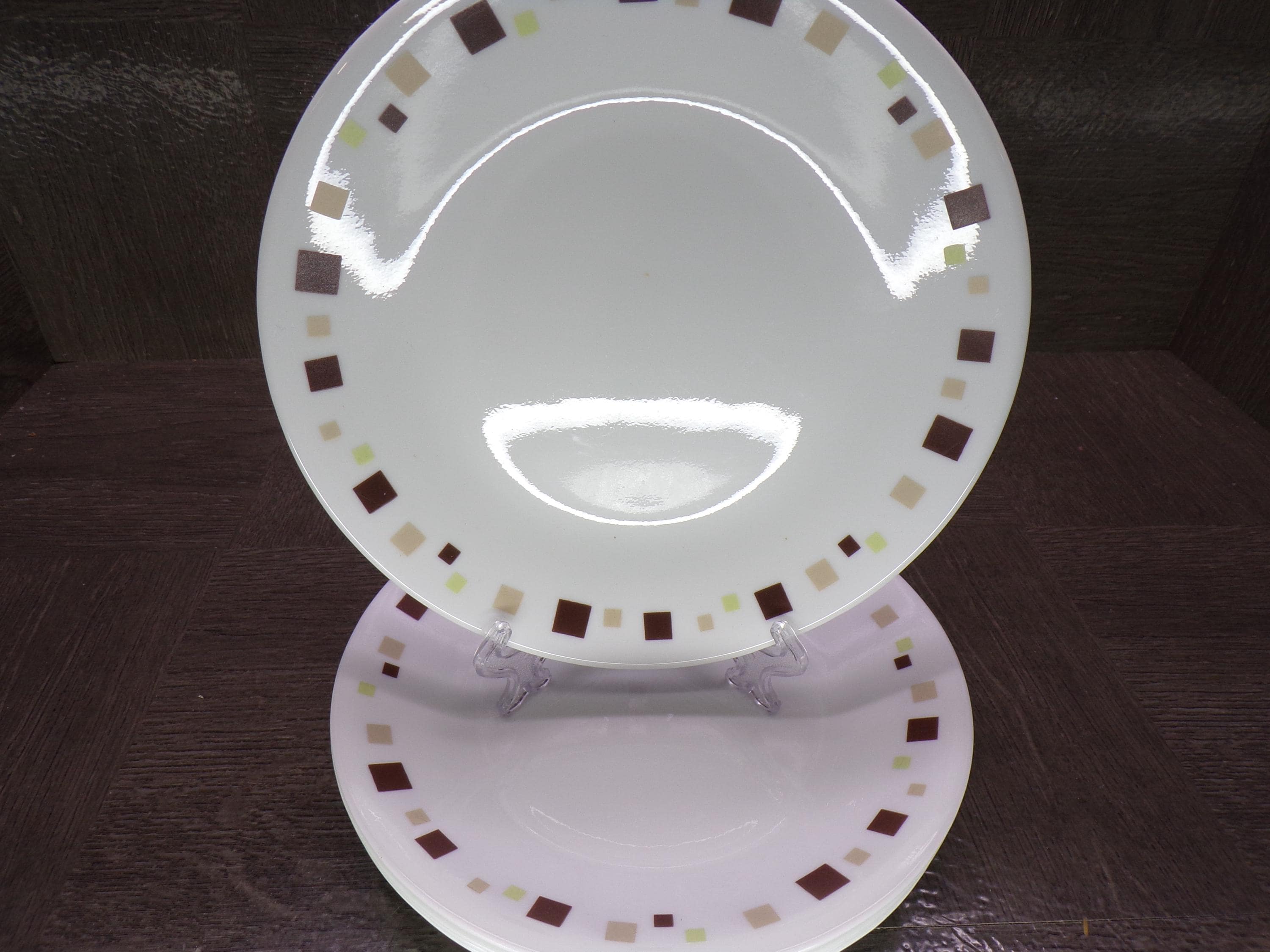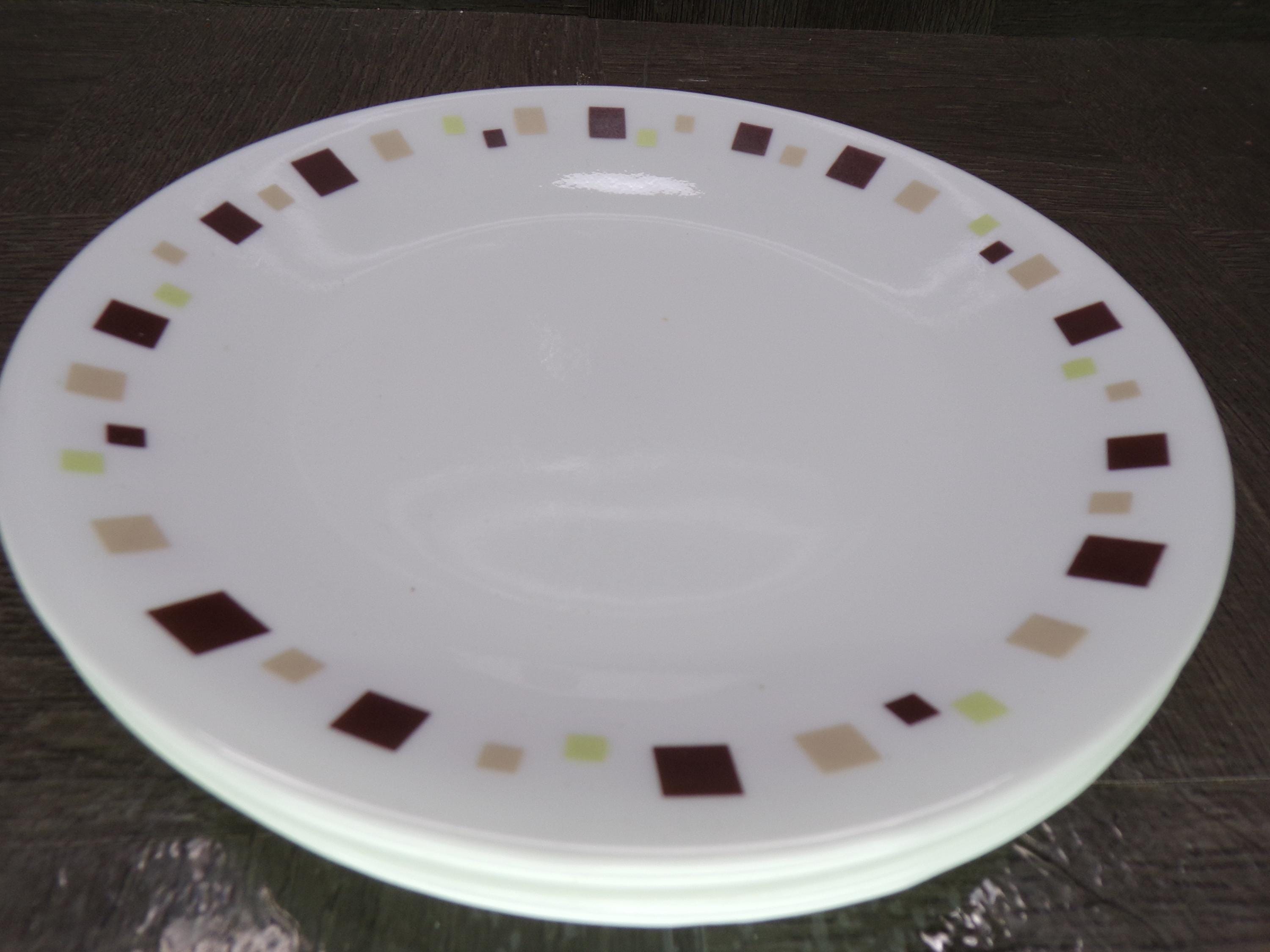 2602 Corelle Geometric Chocolate 6.75" Bread / Dessert Plates Set of 6 Vintage - Brown, Tan, Green Squares - Great Condition