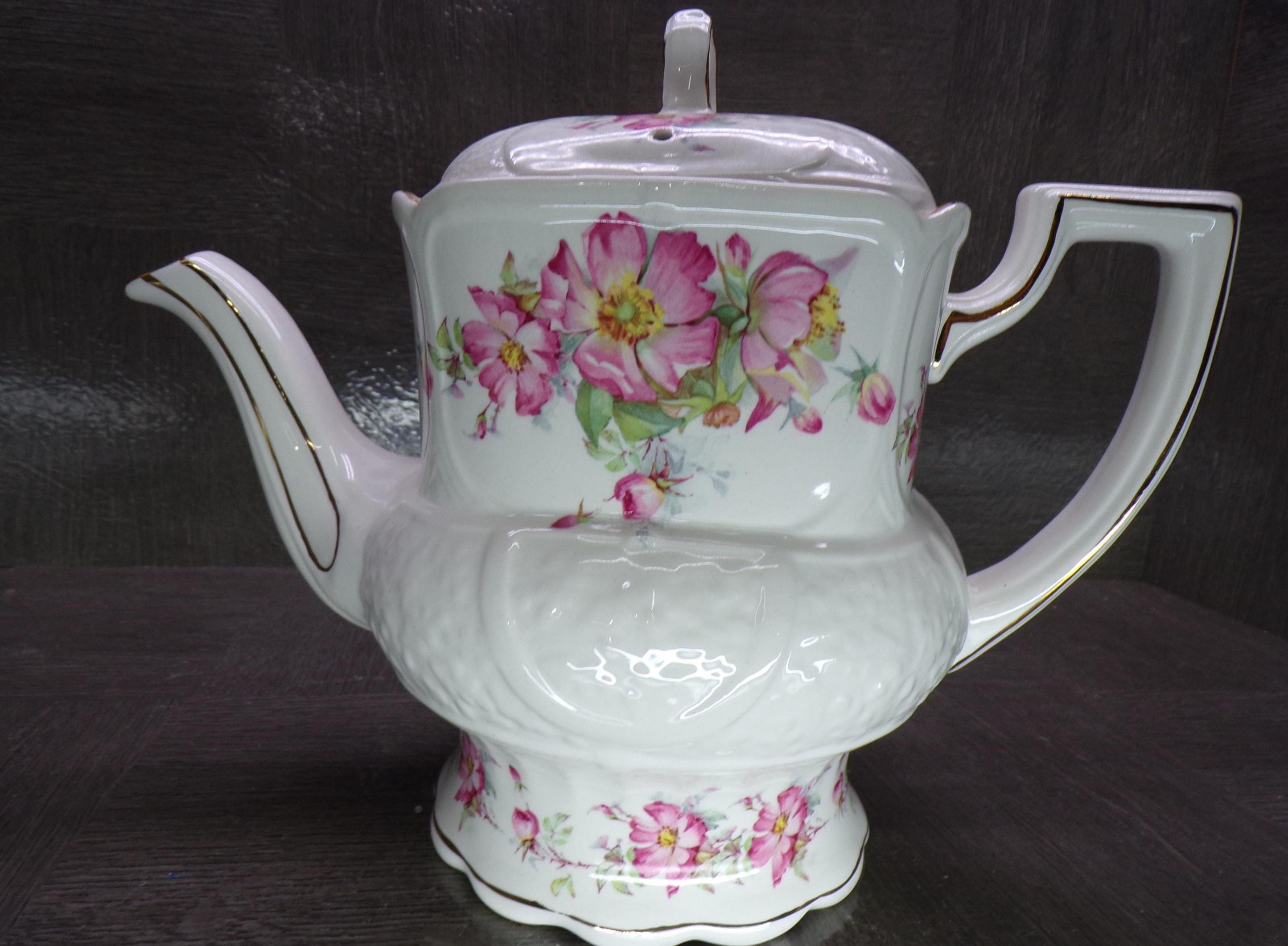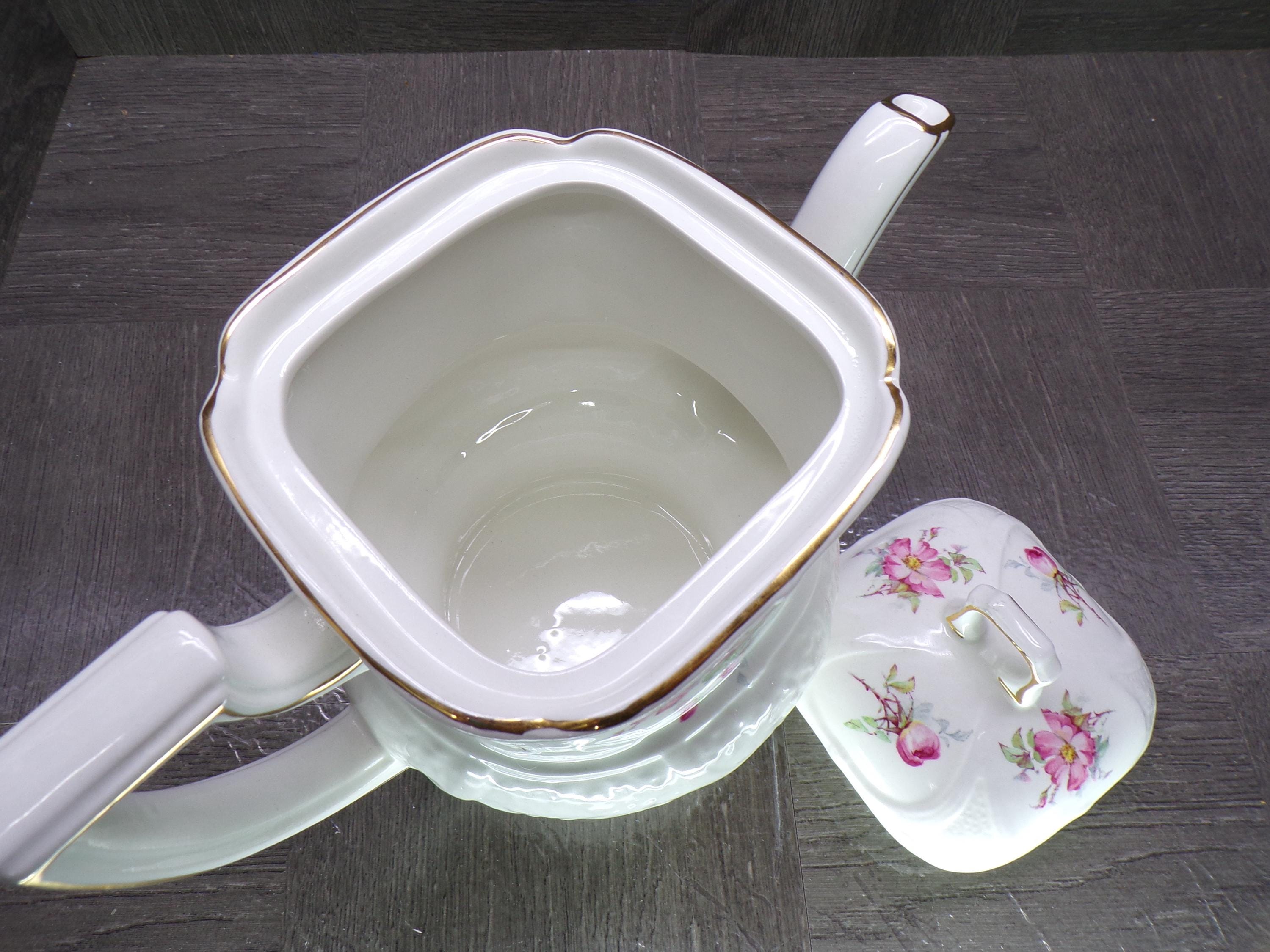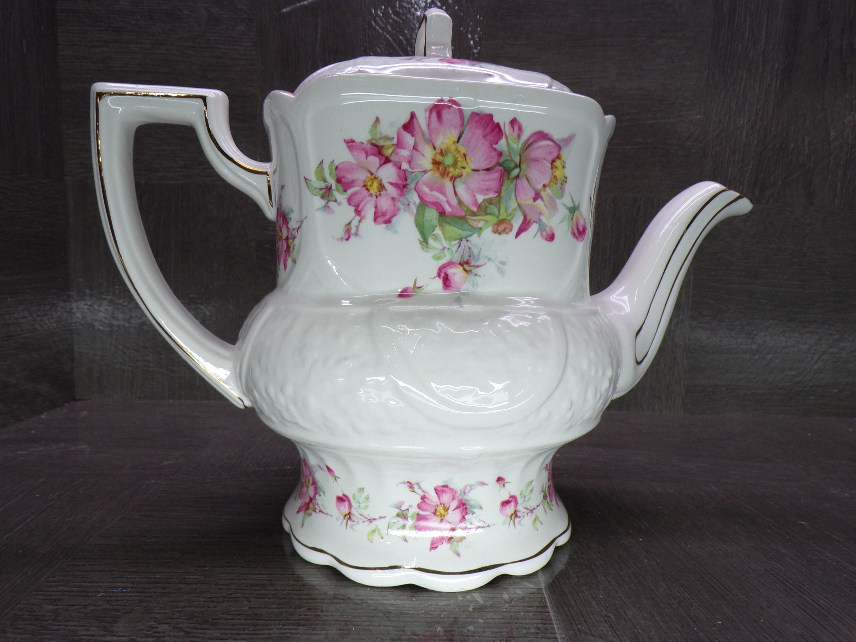 2602 Crown Dorset Staffordshire England Vintage 7" Teapot - Embossed Trellis with Pink Floral Motif & Gold Accents - Great Condition